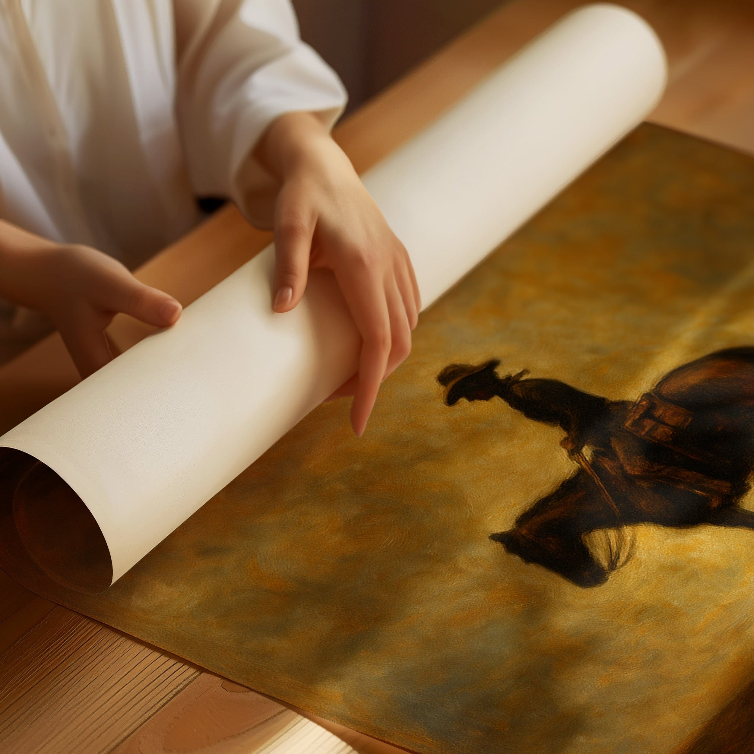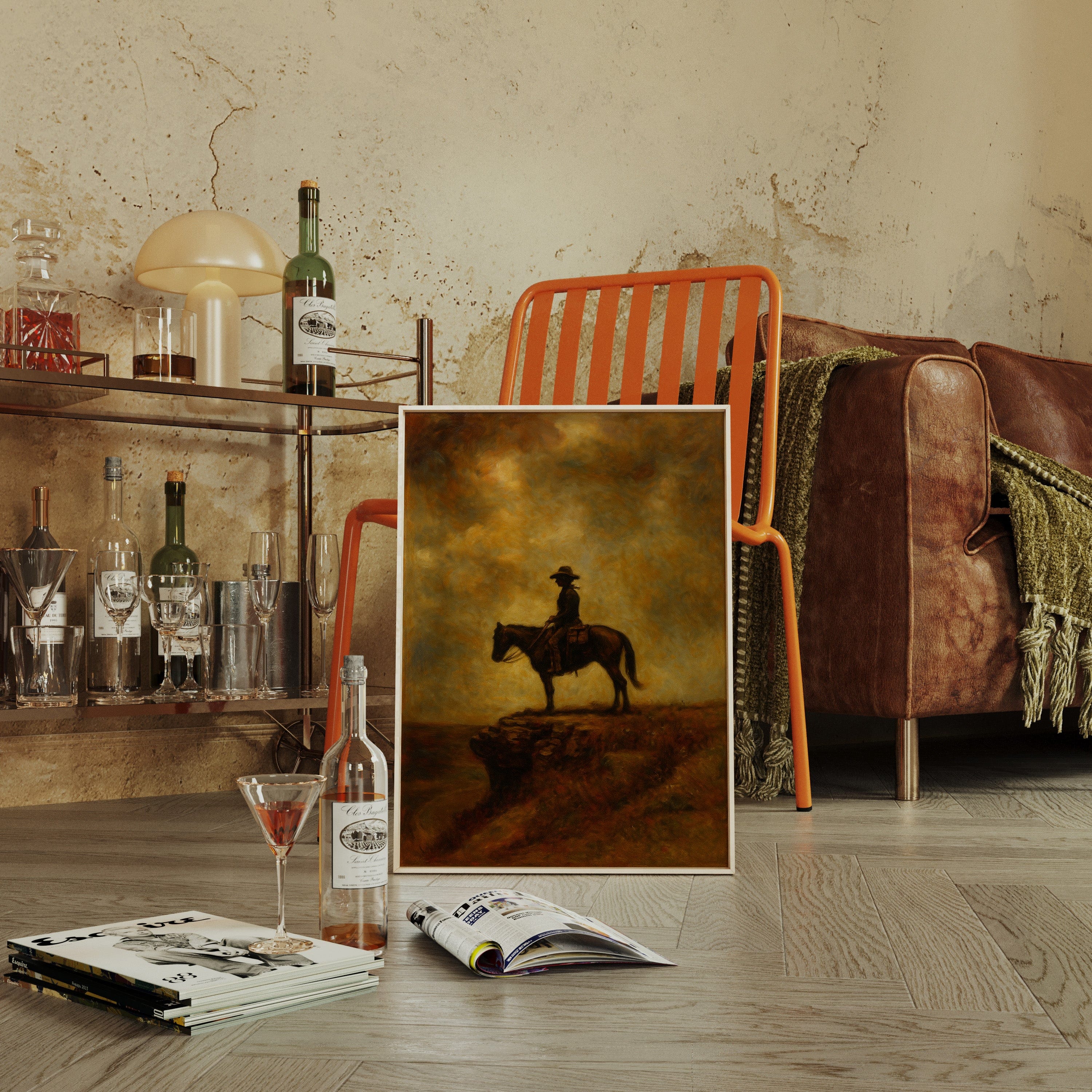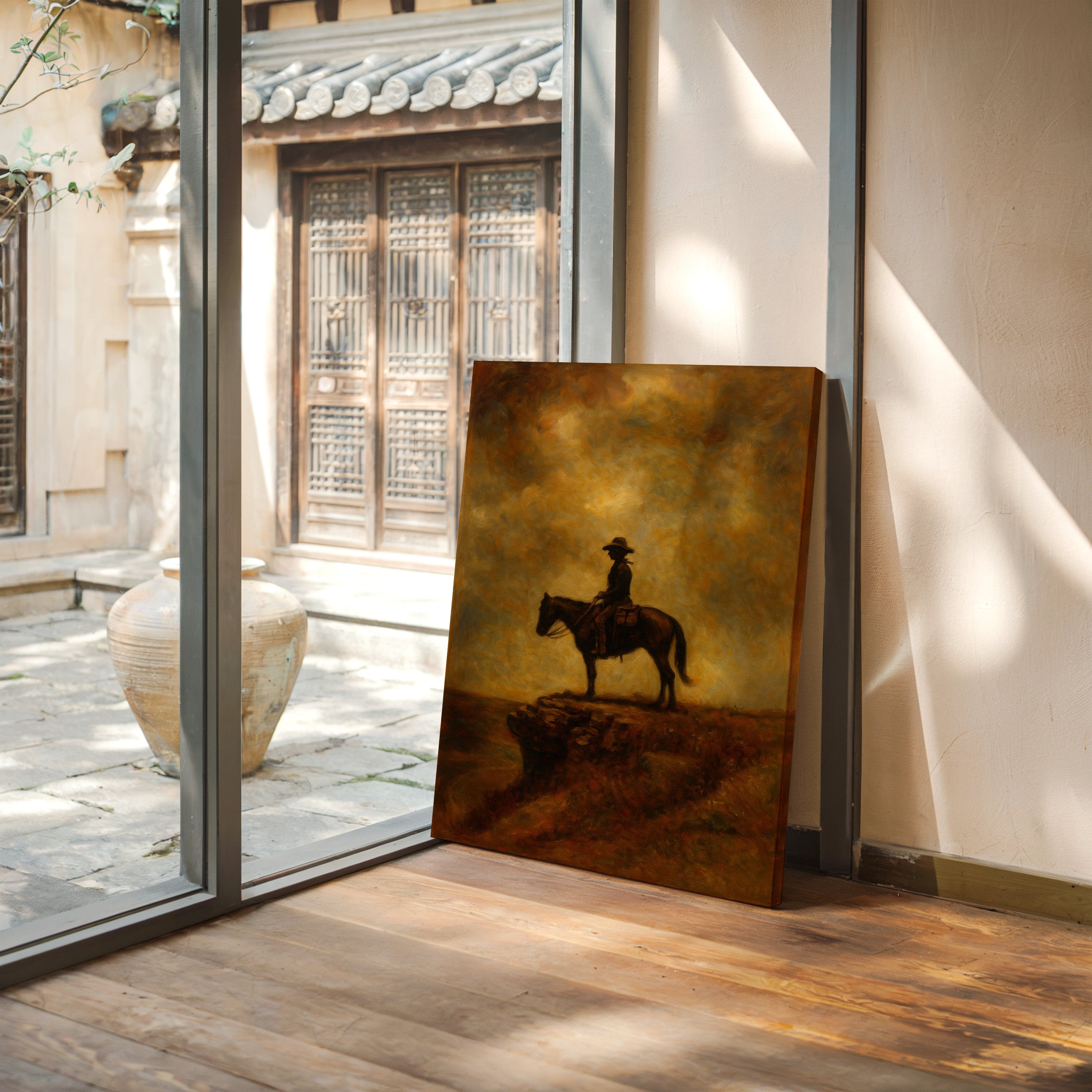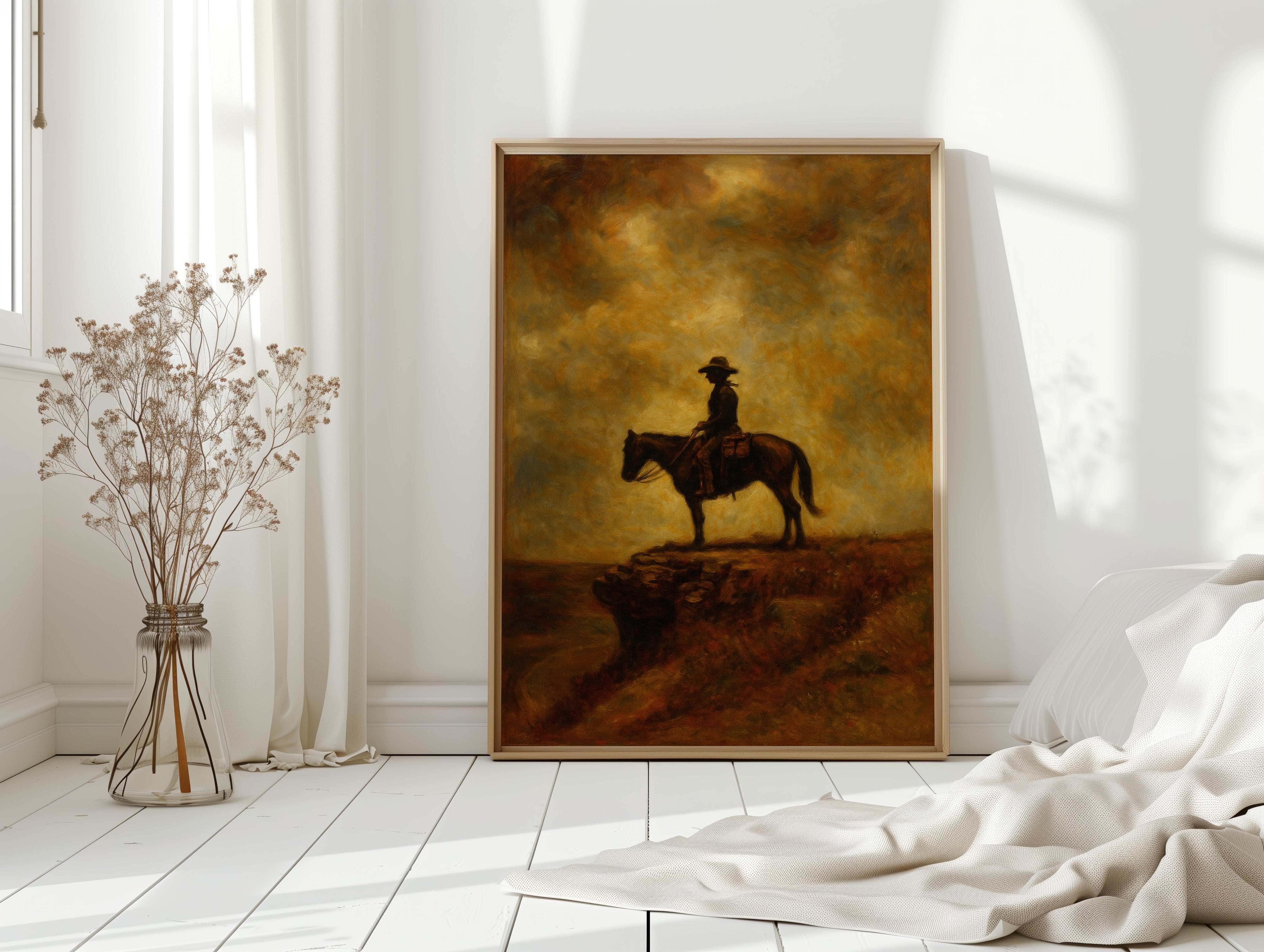 Lone Sentinel captures the quiet dignity of the frontier with a striking silhouette of a cowboy atop a horse, standing watch on a rugged cliff against a dramatic, painterly sky. This atmospheric piece radiates solitude, strength, and timeless Americana, making it an ideal addition to any Western-themed space, office, or gallery wall.