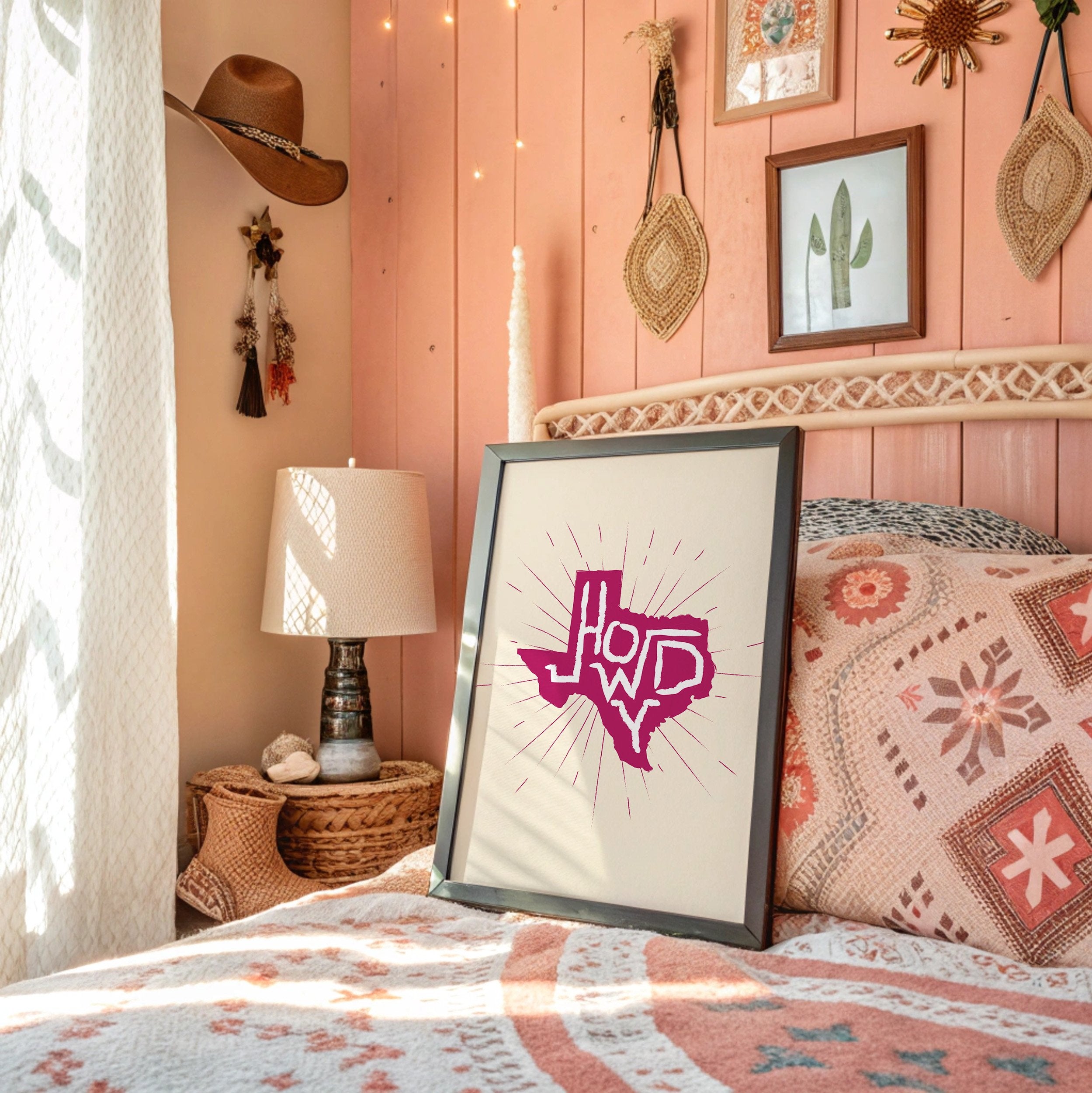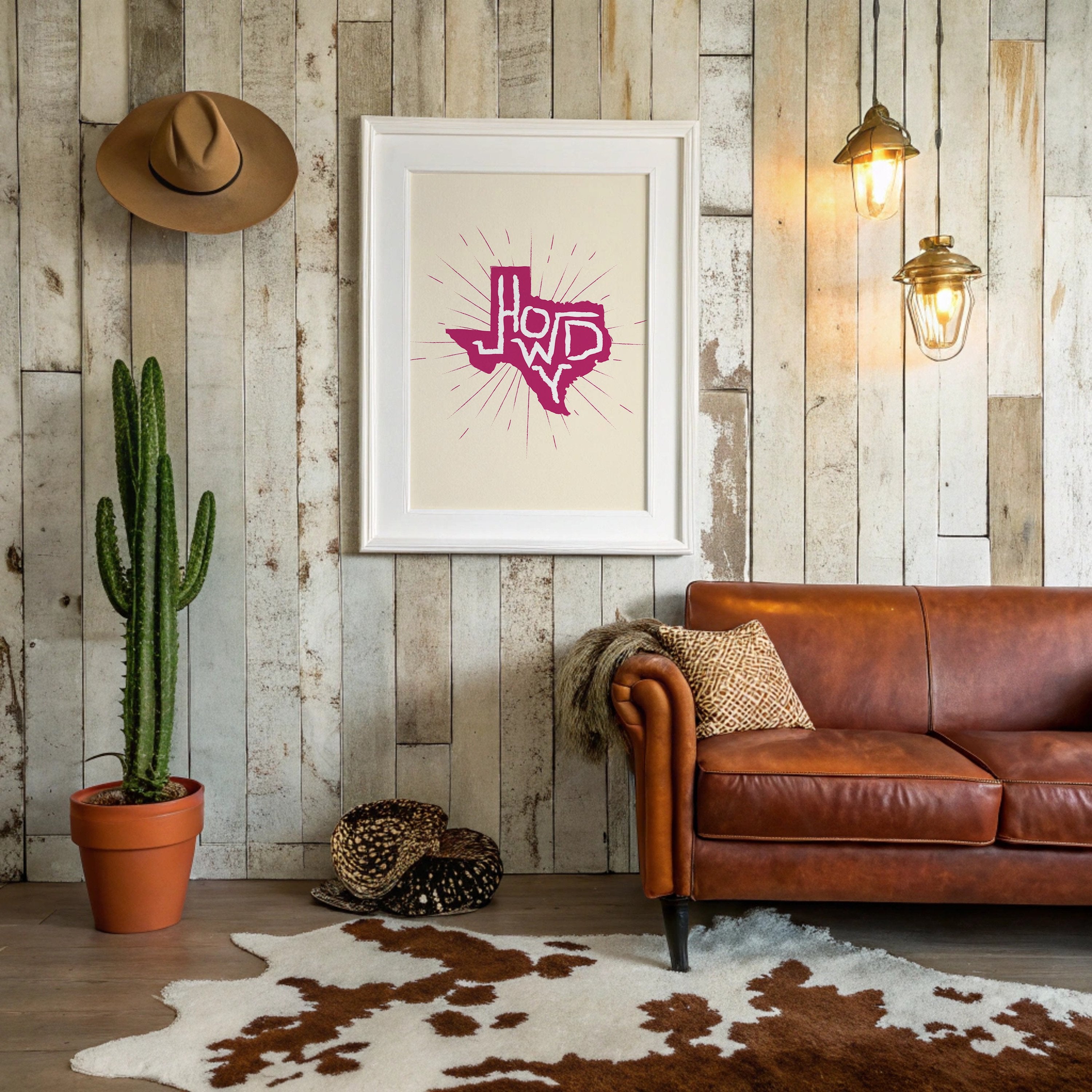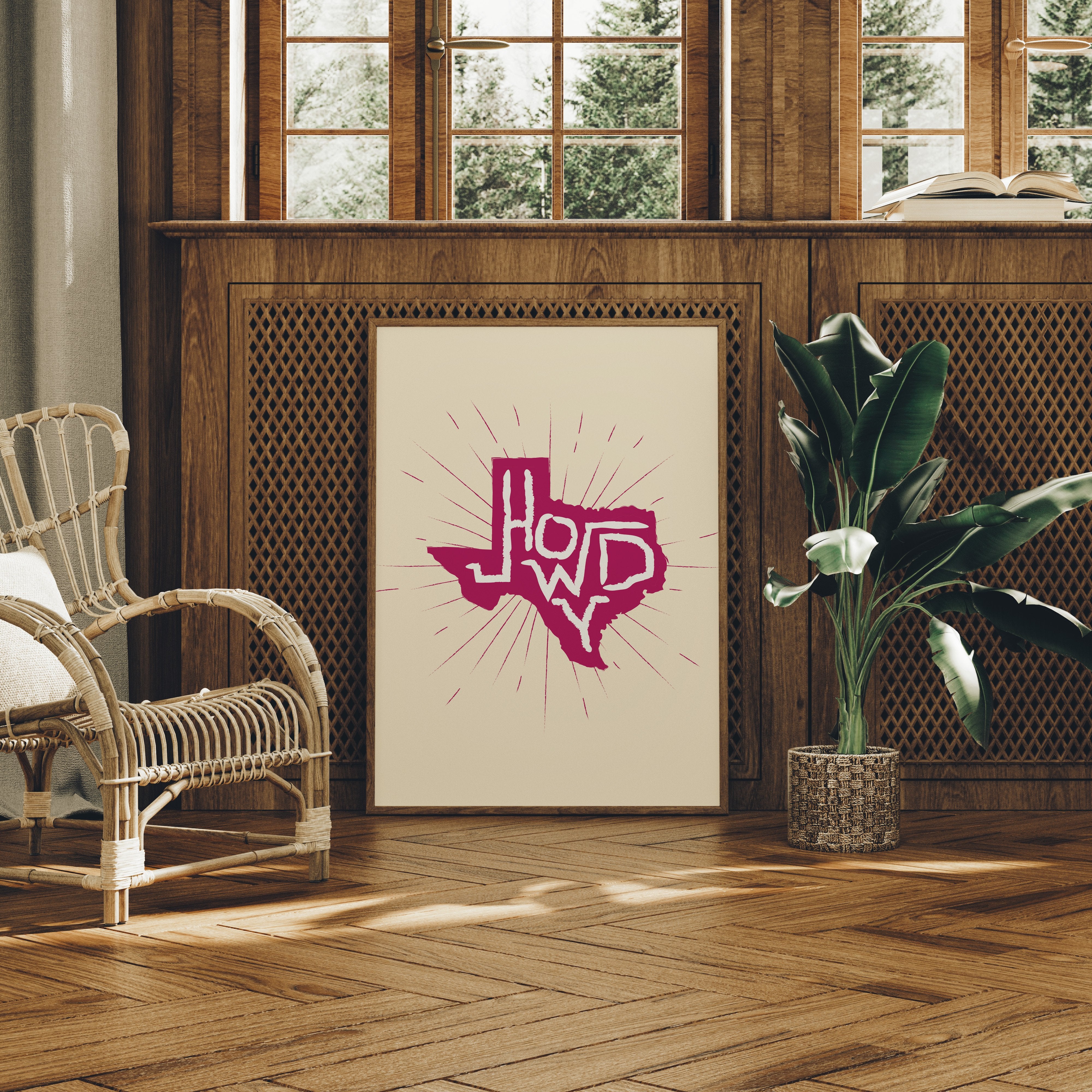 Pride radiates from this bold magenta silhouette of Texas, the word ""HOWDY"" hand-lettered across its iconic shape. Radiating lines burst outward against a soft cream background, creating a sense of energy and warmth that captures the state's legendary hospitality. The rough-edged typography gives it an authentic, handcrafted quality that feels both modern and timeless. This statement piece brings personality to entryways, home offices, or any space needing a touch of Southwestern charm with contemporary flair.