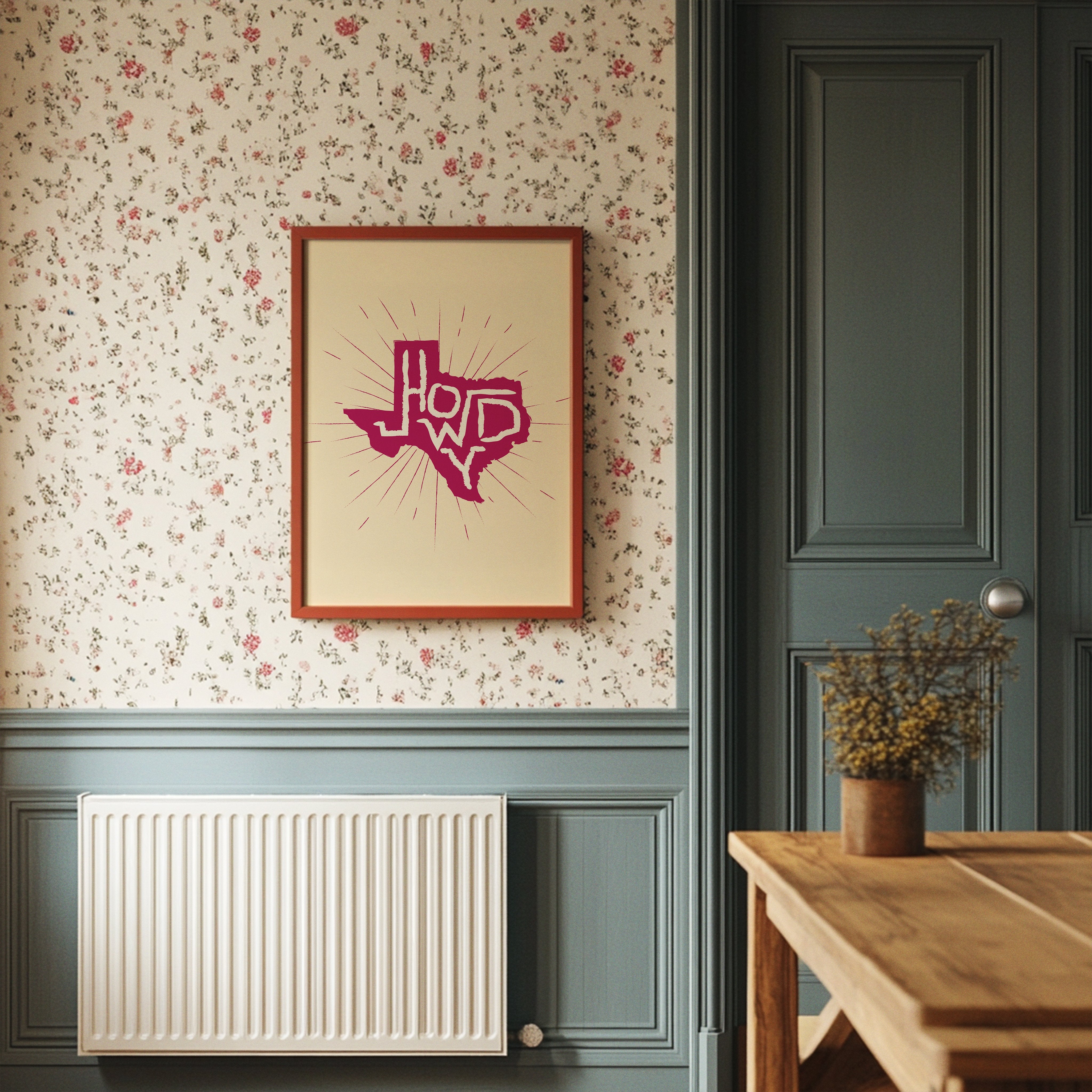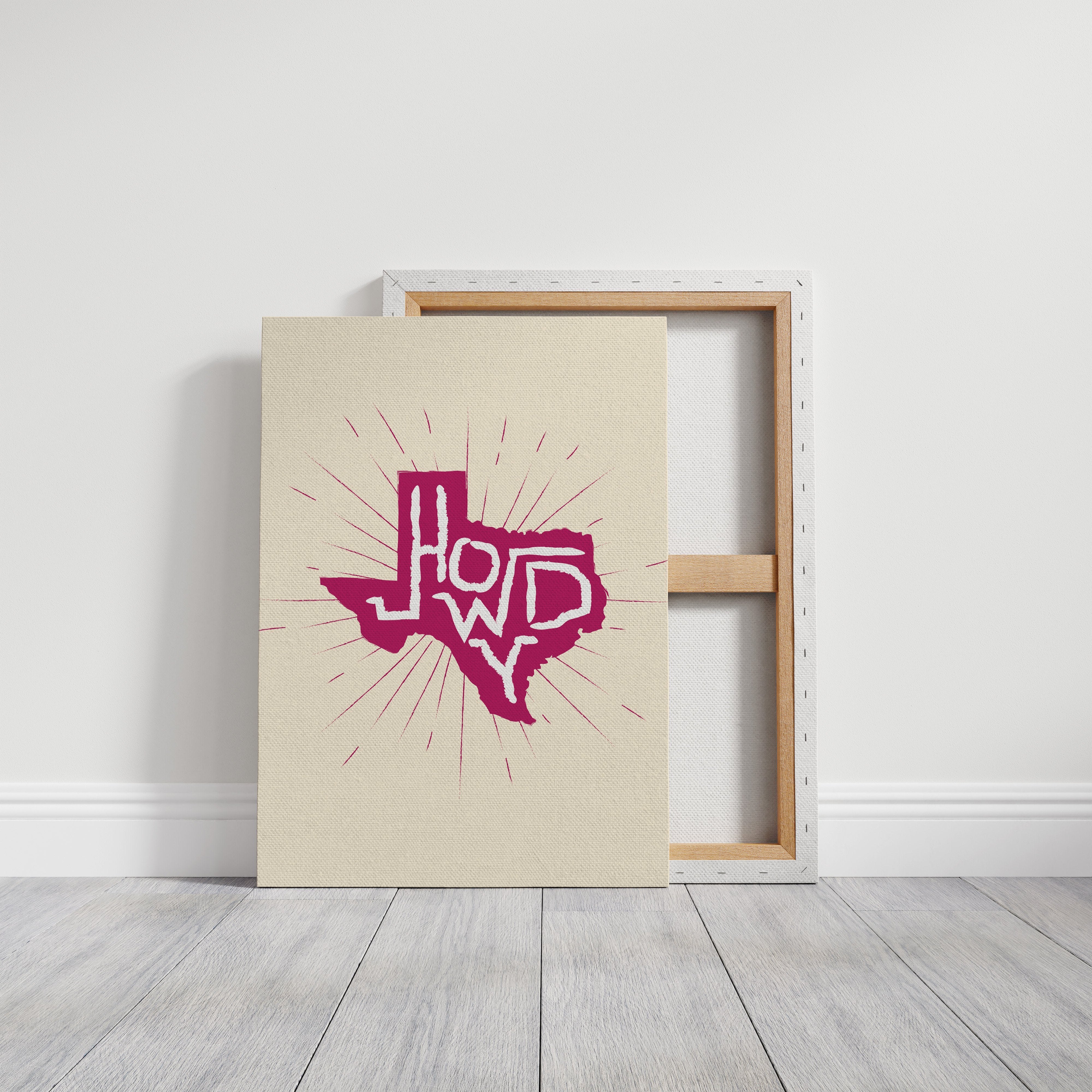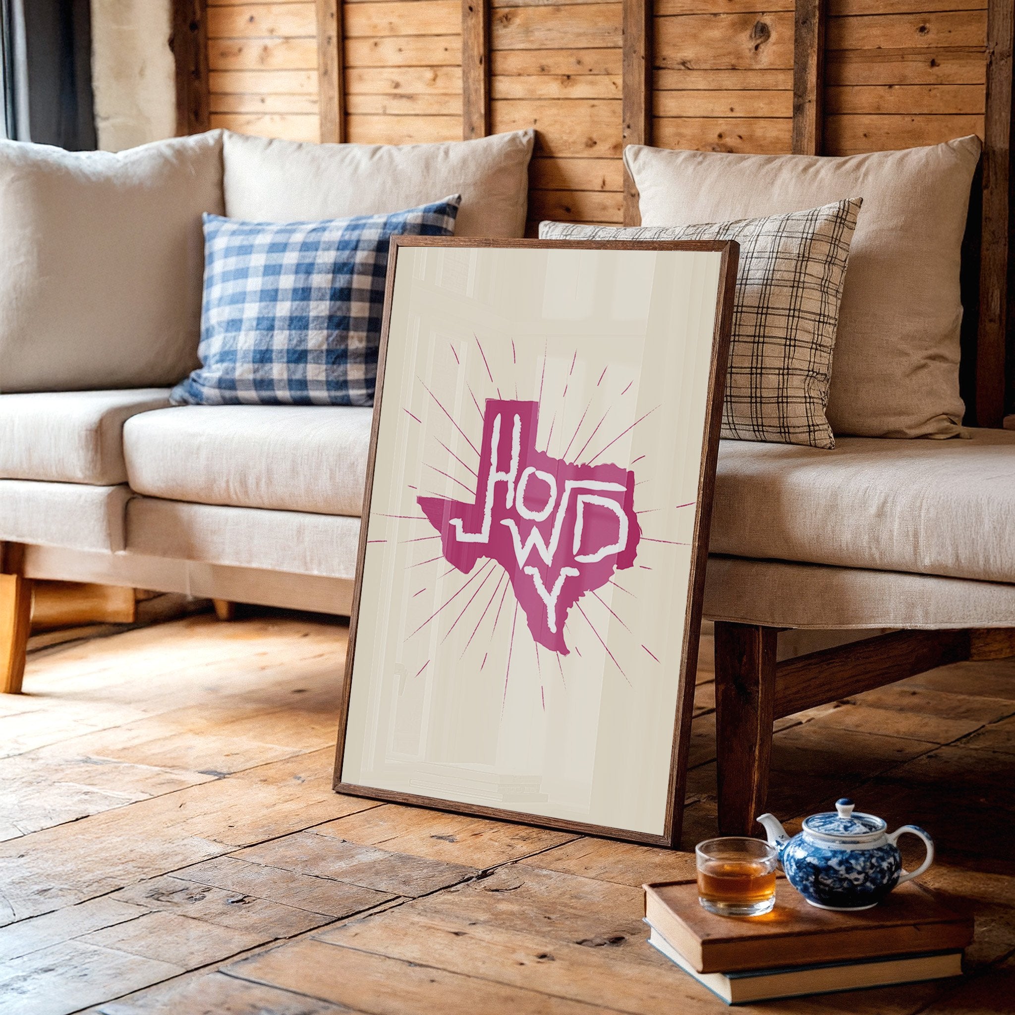 Pride radiates from this bold magenta silhouette of Texas, the word ""HOWDY"" hand-lettered across its iconic shape. Radiating lines burst outward against a soft cream background, creating a sense of energy and warmth that captures the state's legendary hospitality. The rough-edged typography gives it an authentic, handcrafted quality that feels both modern and timeless. This statement piece brings personality to entryways, home offices, or any space needing a touch of Southwestern charm with contemporary flair.