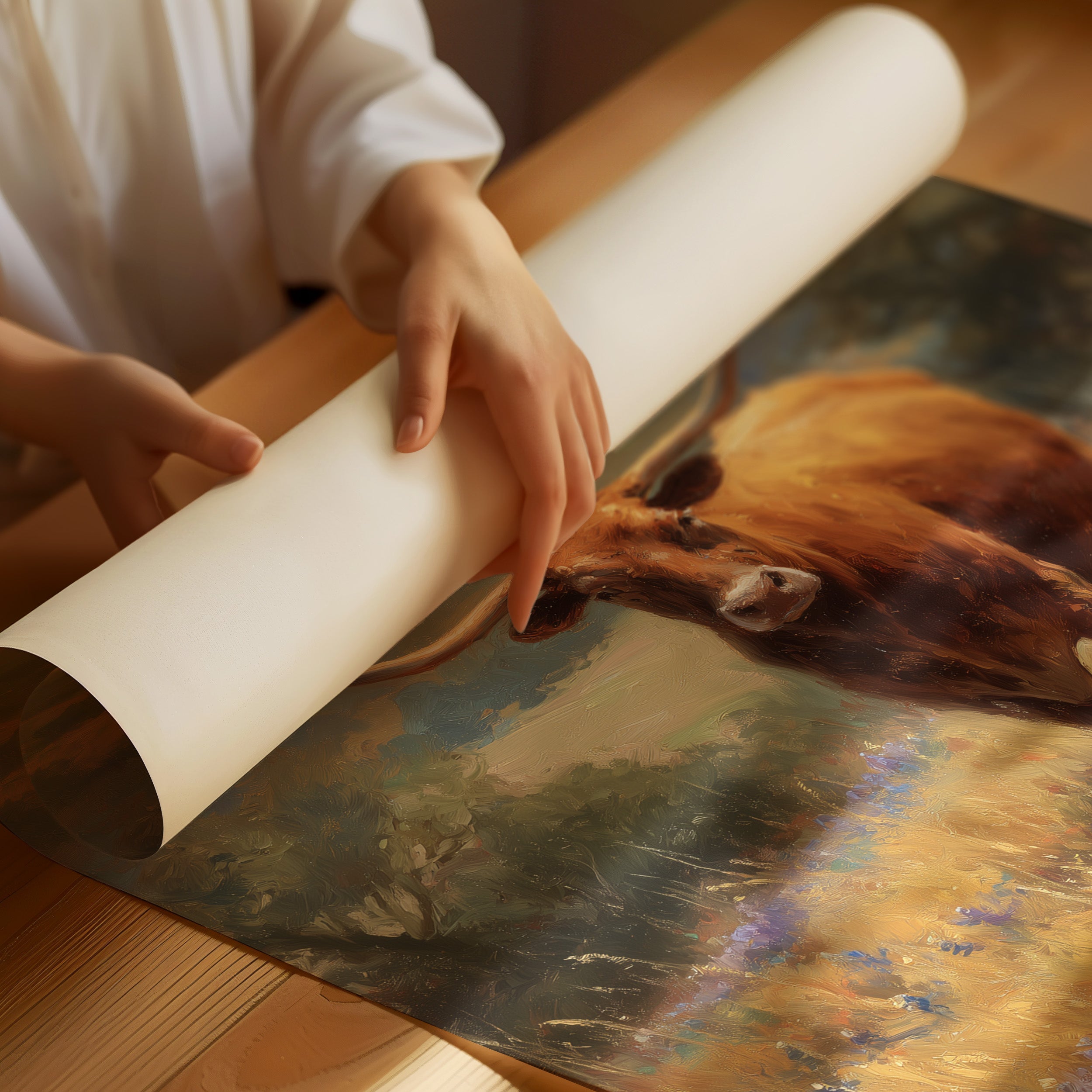 A majestic Texas longhorn stands proudly amidst a sea of wild bluebonnets, the golden prairie grass swaying beneath the endless sky. Rich earth tones blend with delicate purple wildflowers, creating a quintessential scene of untamed Western beauty. The painting captures both the rugged strength of the iconic cattle and the delicate grace of Texas spring blooms. This striking piece brings authentic ranch house character to modern living spaces, perfect for adding a touch of sophisticated Western charm to a living room or study.