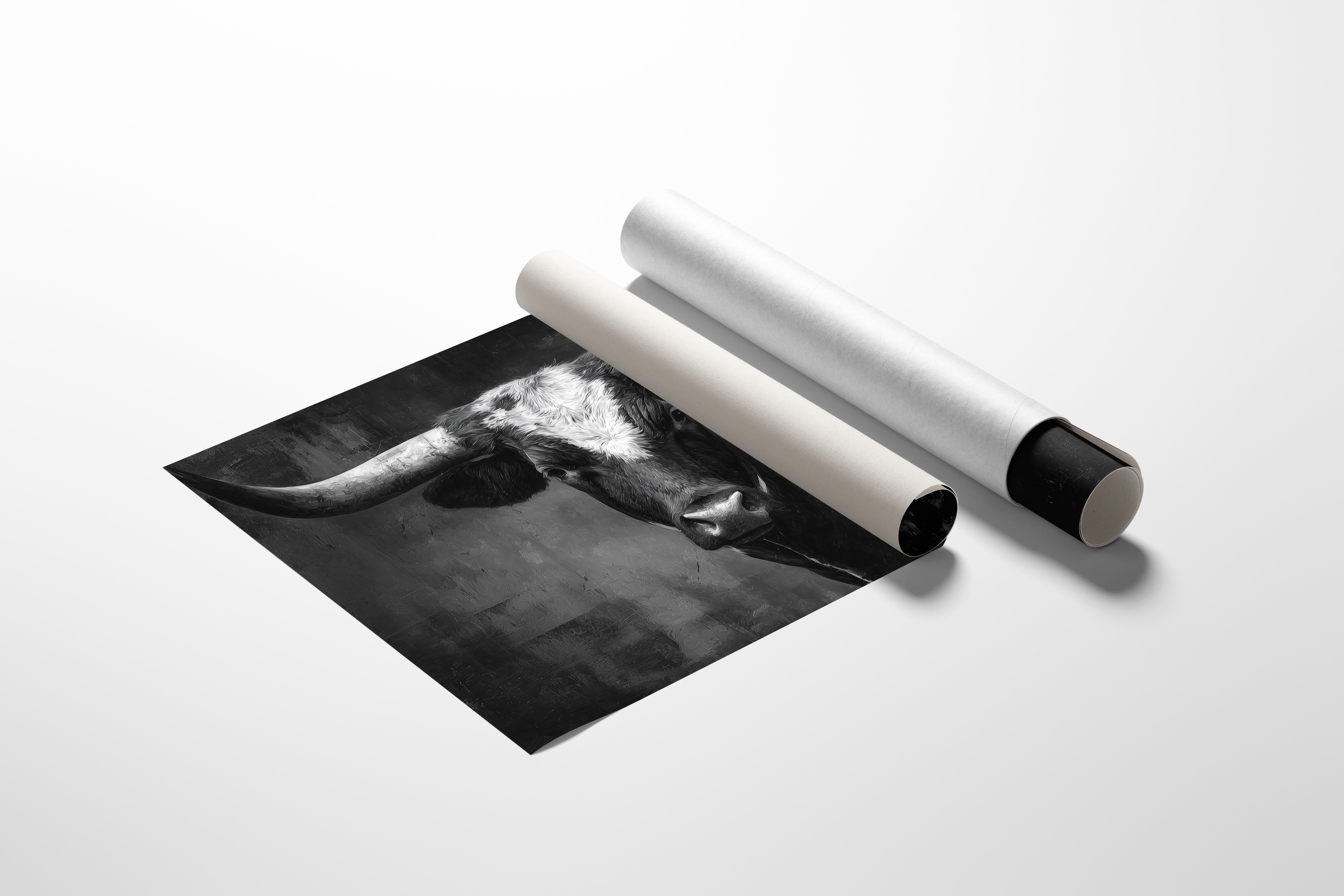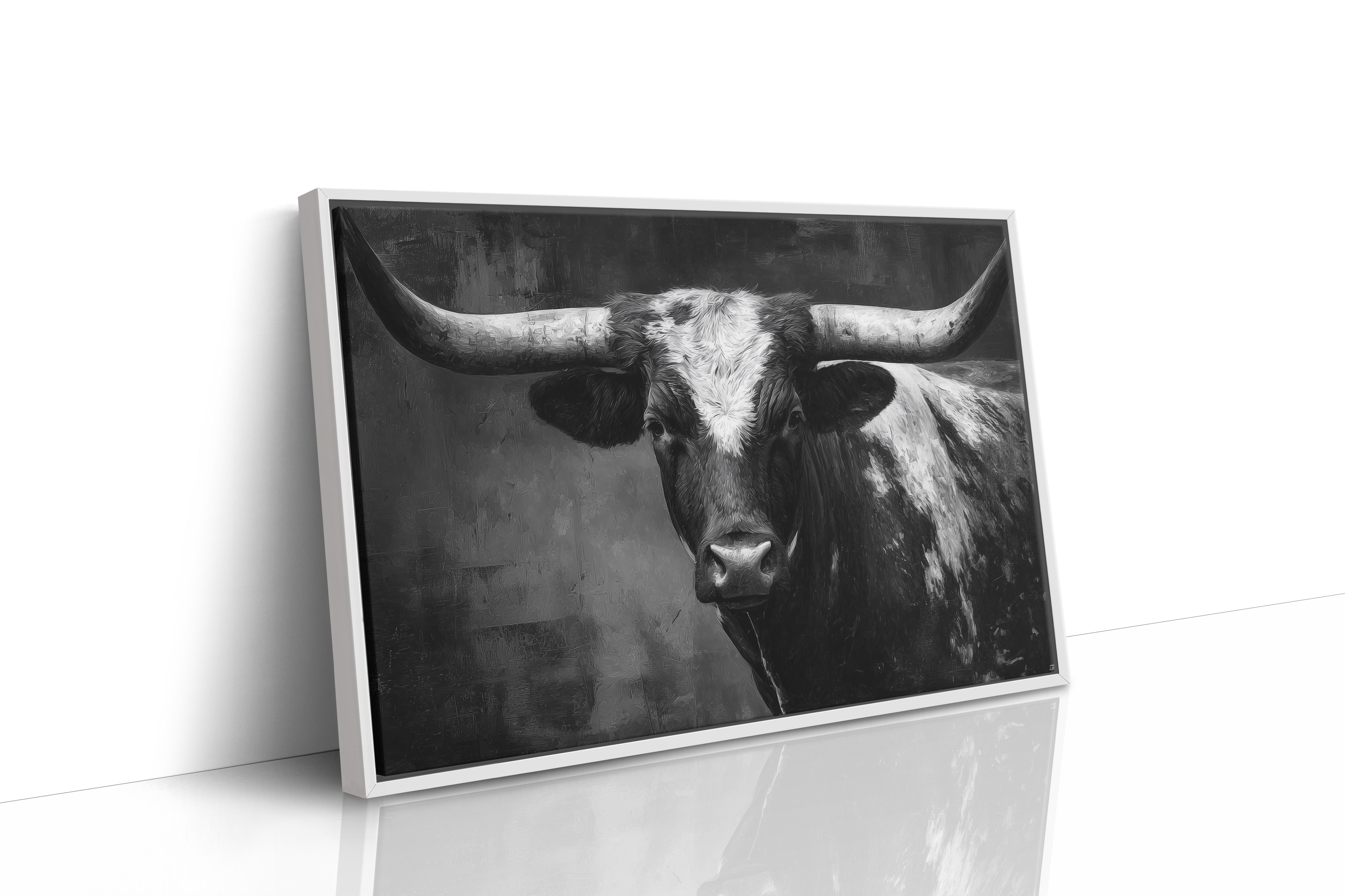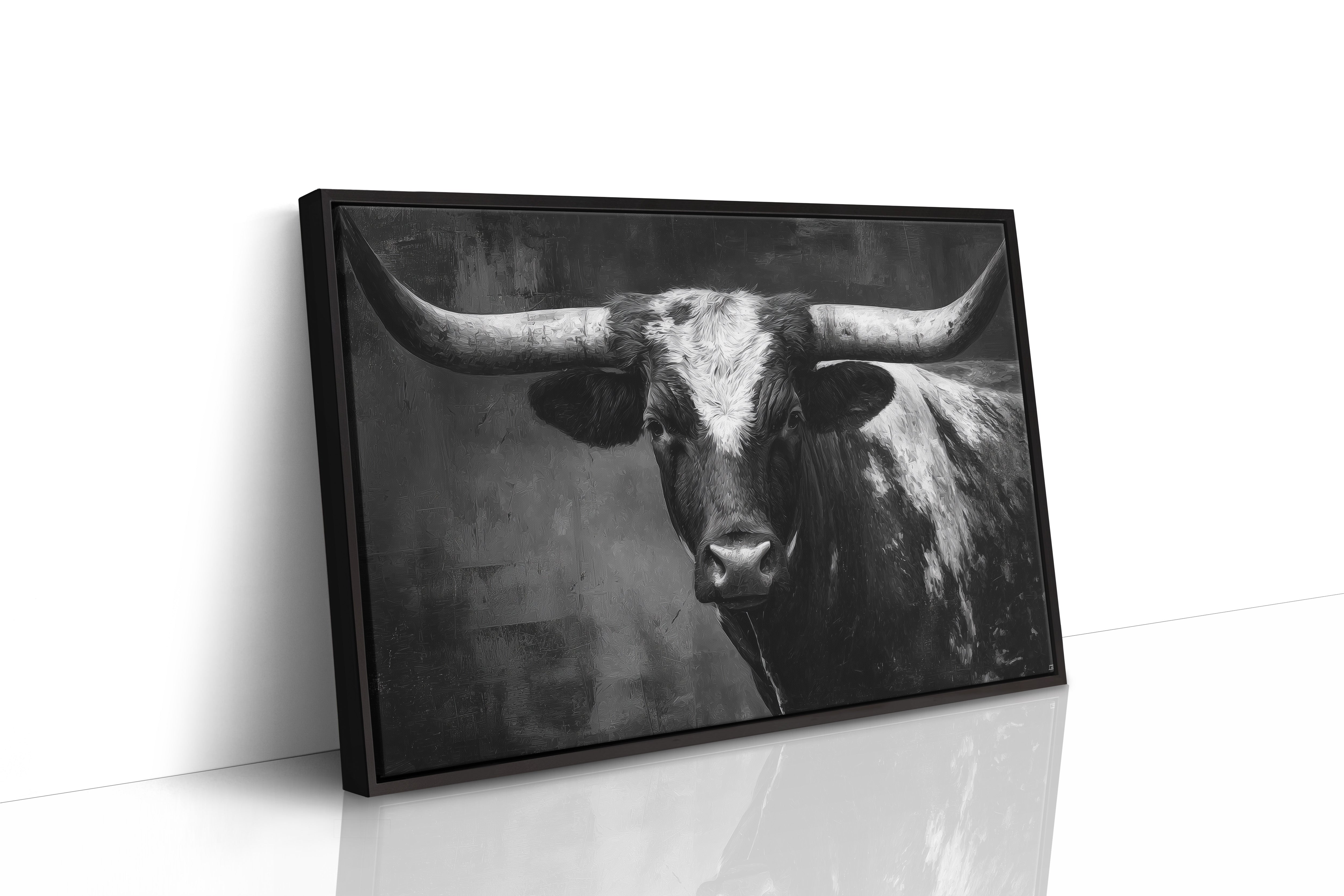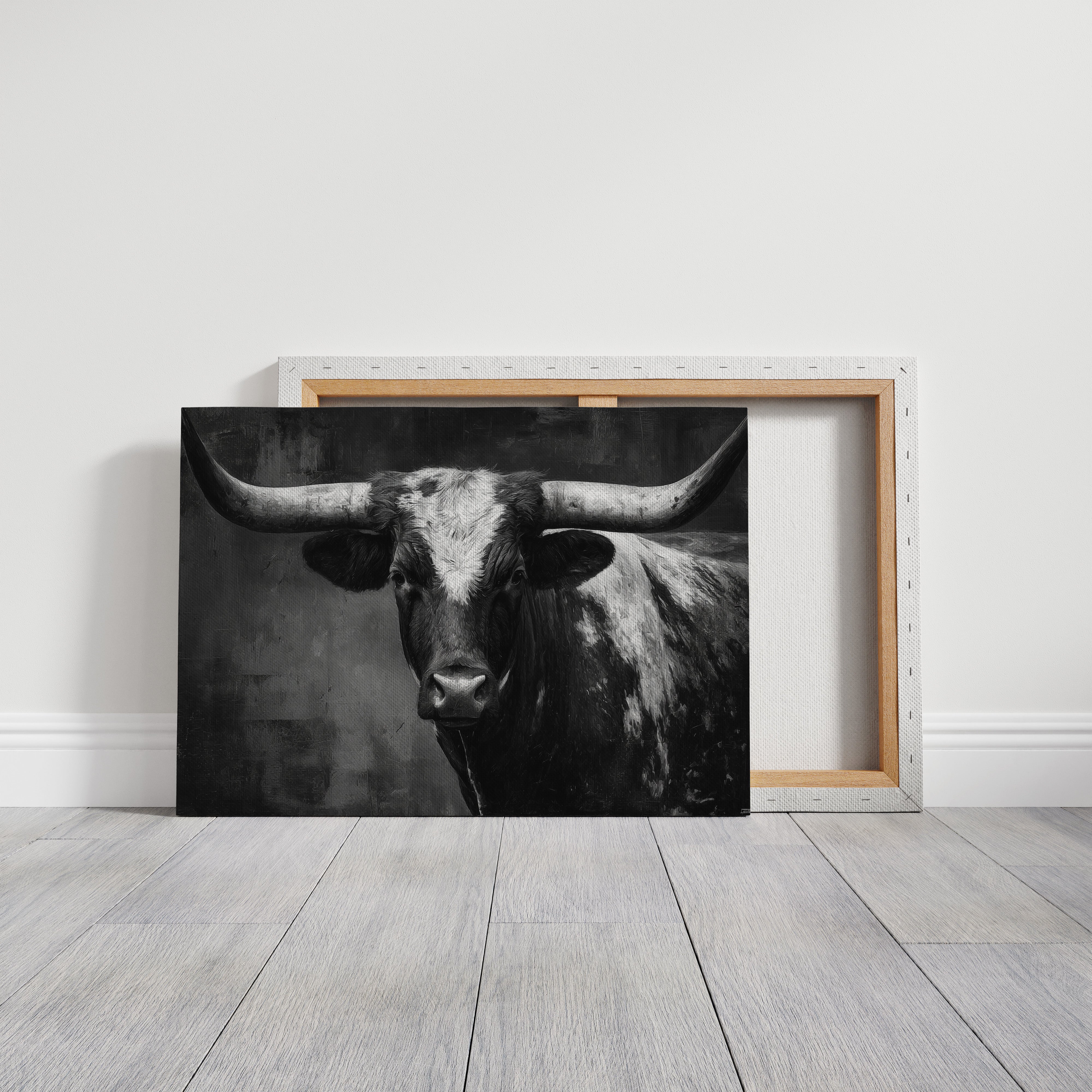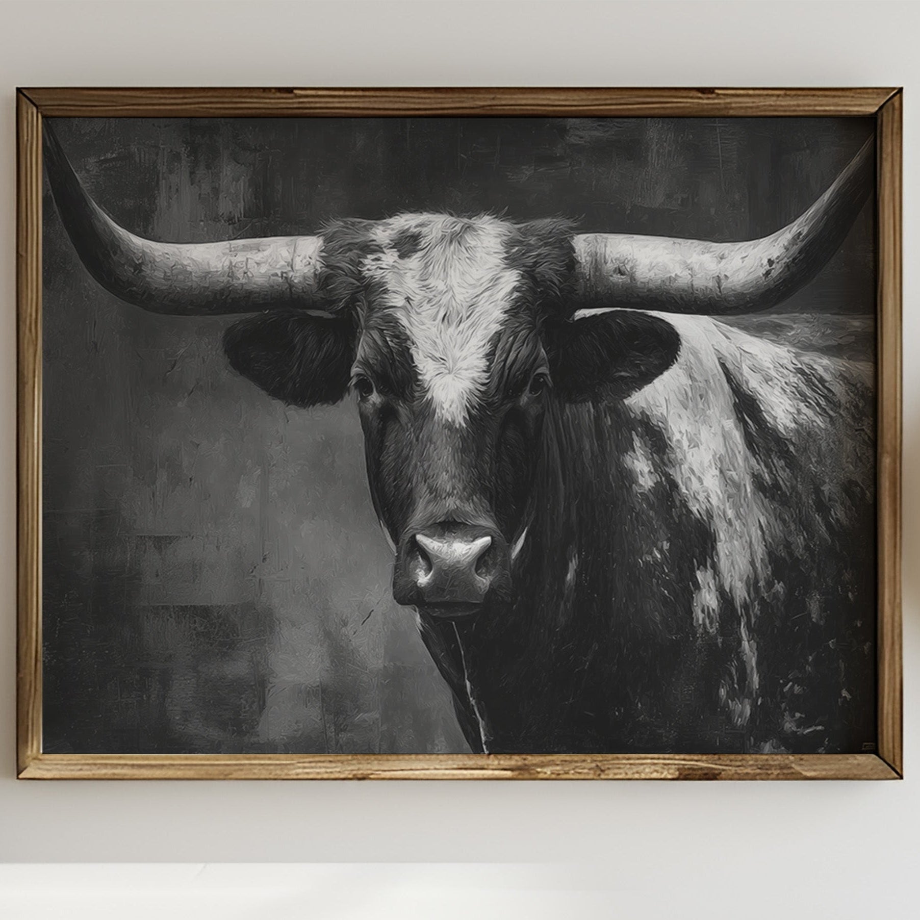 A powerful gaze pierces through the dusky atmosphere, where strength meets grace in perfect harmony. This striking contemporary portrait captures the noble essence of Texas heritage in dramatic black and white. The intricate details of the longhorn's face tell stories of wild prairies and untamed spirits, while the contrast between light and dark creates a commanding presence that demands attention. The textured fur and magnificent horns emerge from the shadowy background like a legend taking form. This bold statement piece commands attention in a modern ranch house, industrial loft, or any space seeking to capture the raw beauty of the American West. Each glance reveals new details in this timeless portrait of western majesty.