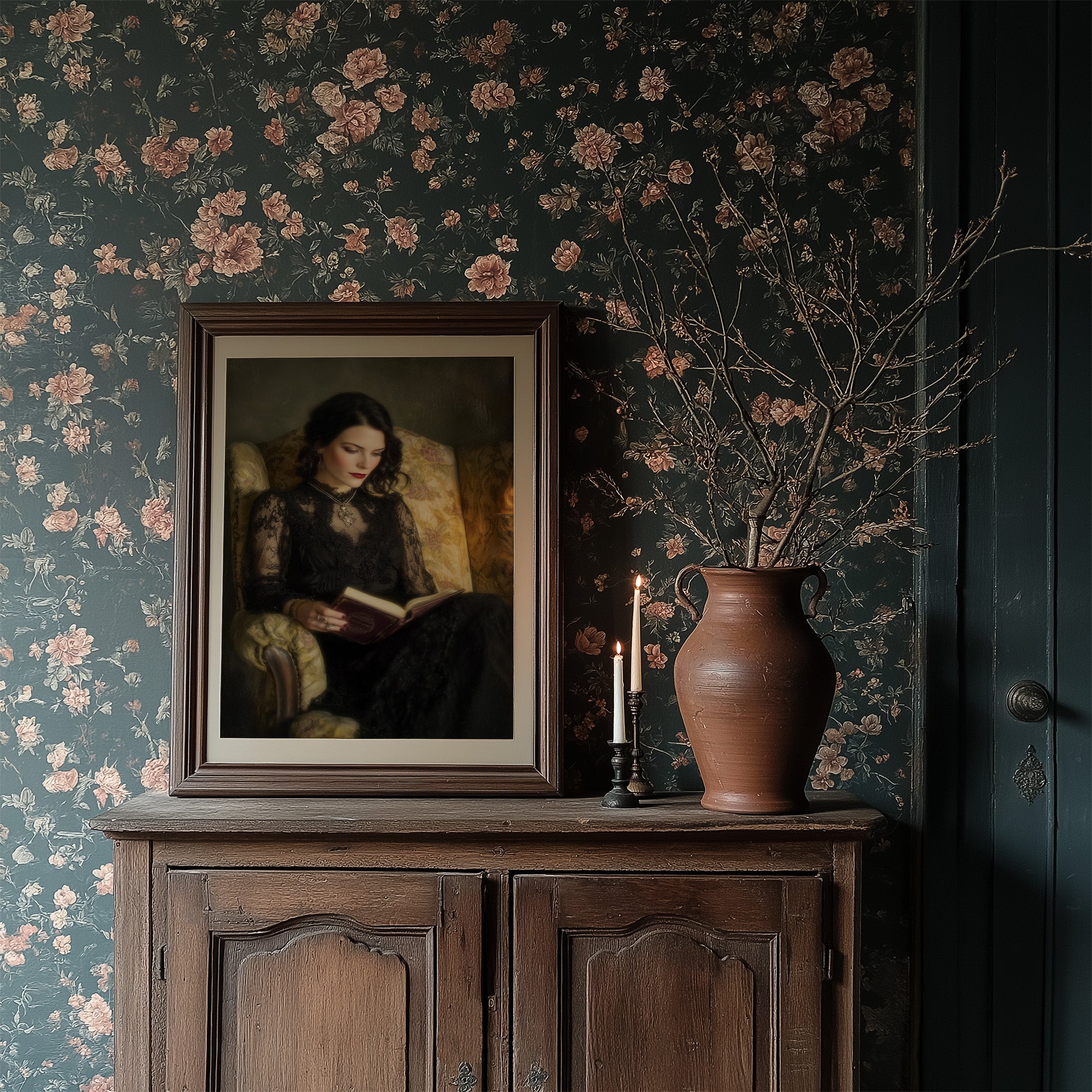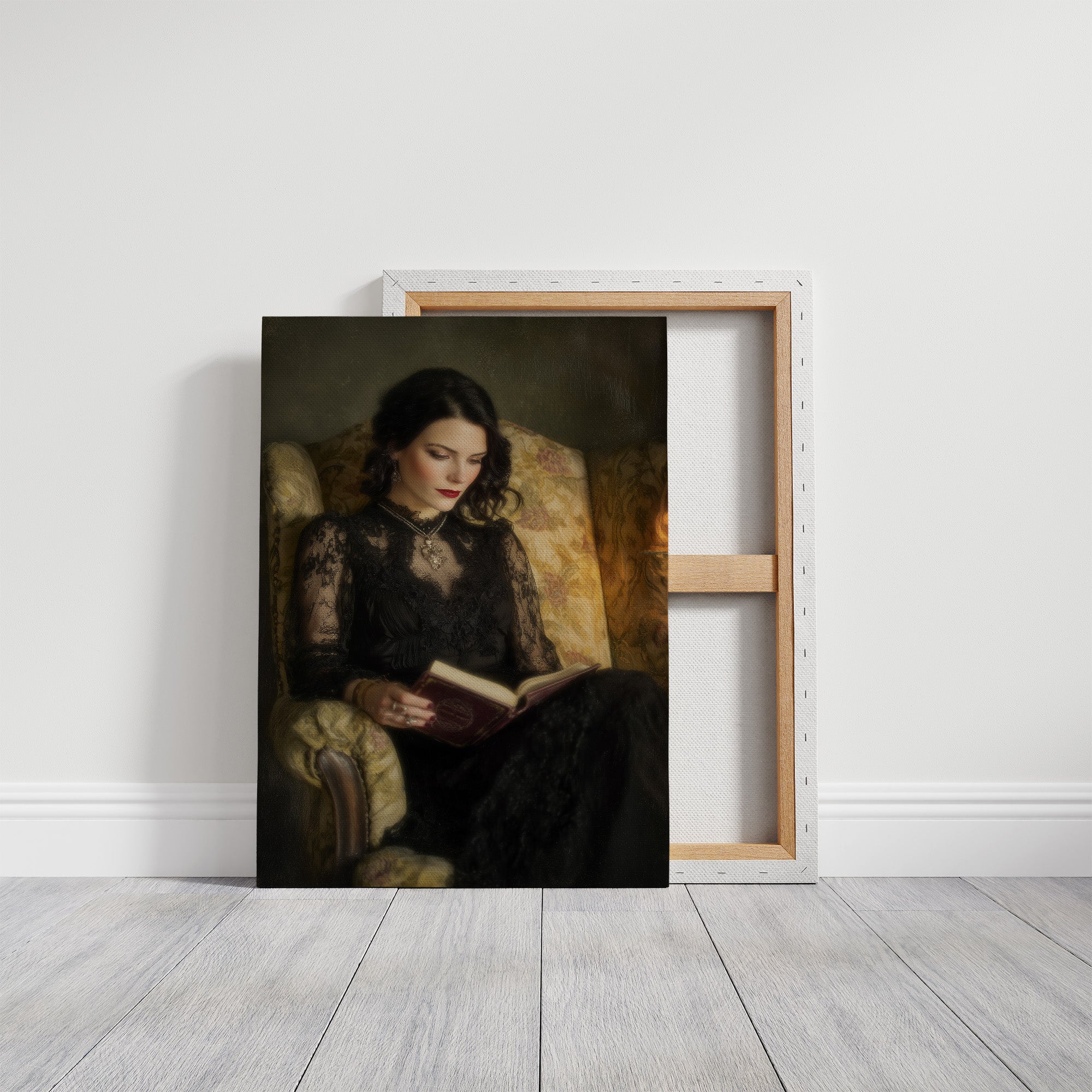 A moment suspended in time, where literature meets luxury in the soft glow of evening light. The portrait captures a figure in delicate black lace, absorbed in the pages of a book, seated against a backdrop of golden damask. The rich contrast between the dark attire and the warm tones of the antique chair creates a painterly atmosphere reminiscent of classical portraiture with a contemporary edge. This elegant piece would bring sophisticated drama to a library, reading nook, or as a statement piece in a modern living space with classic elements.