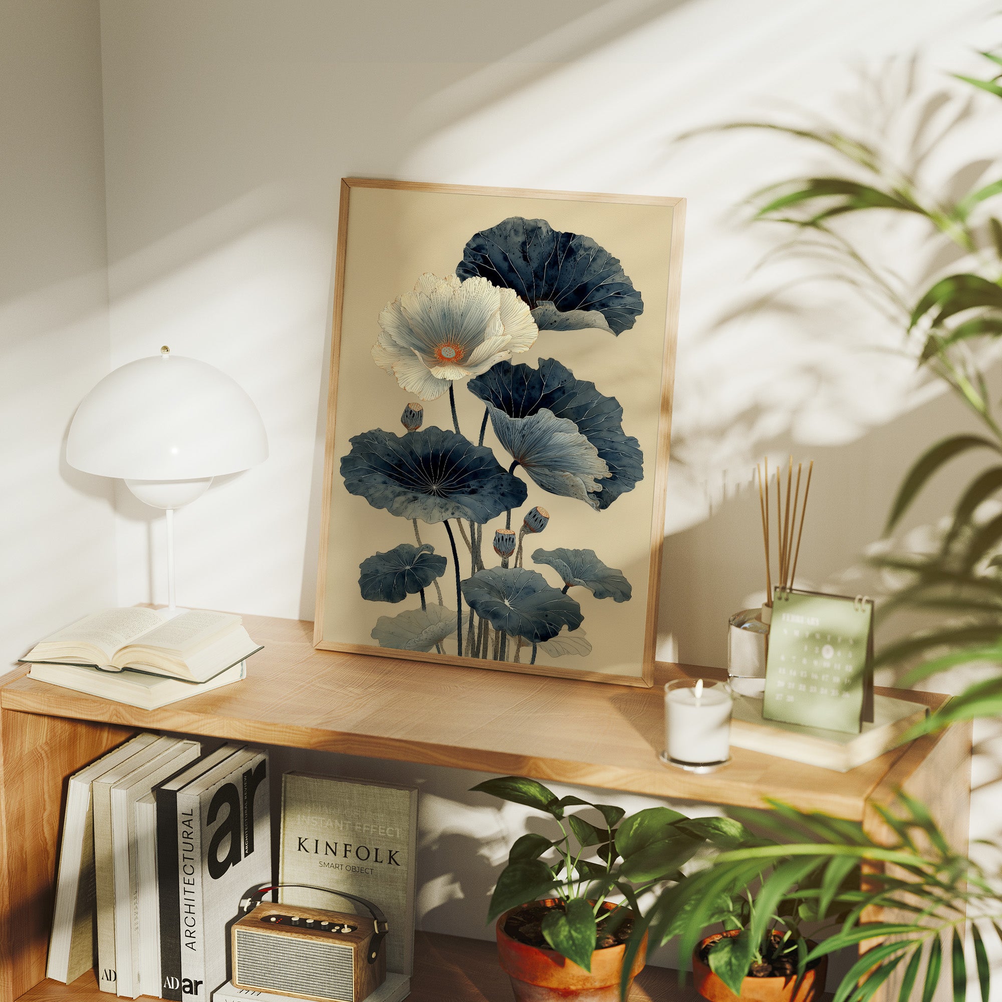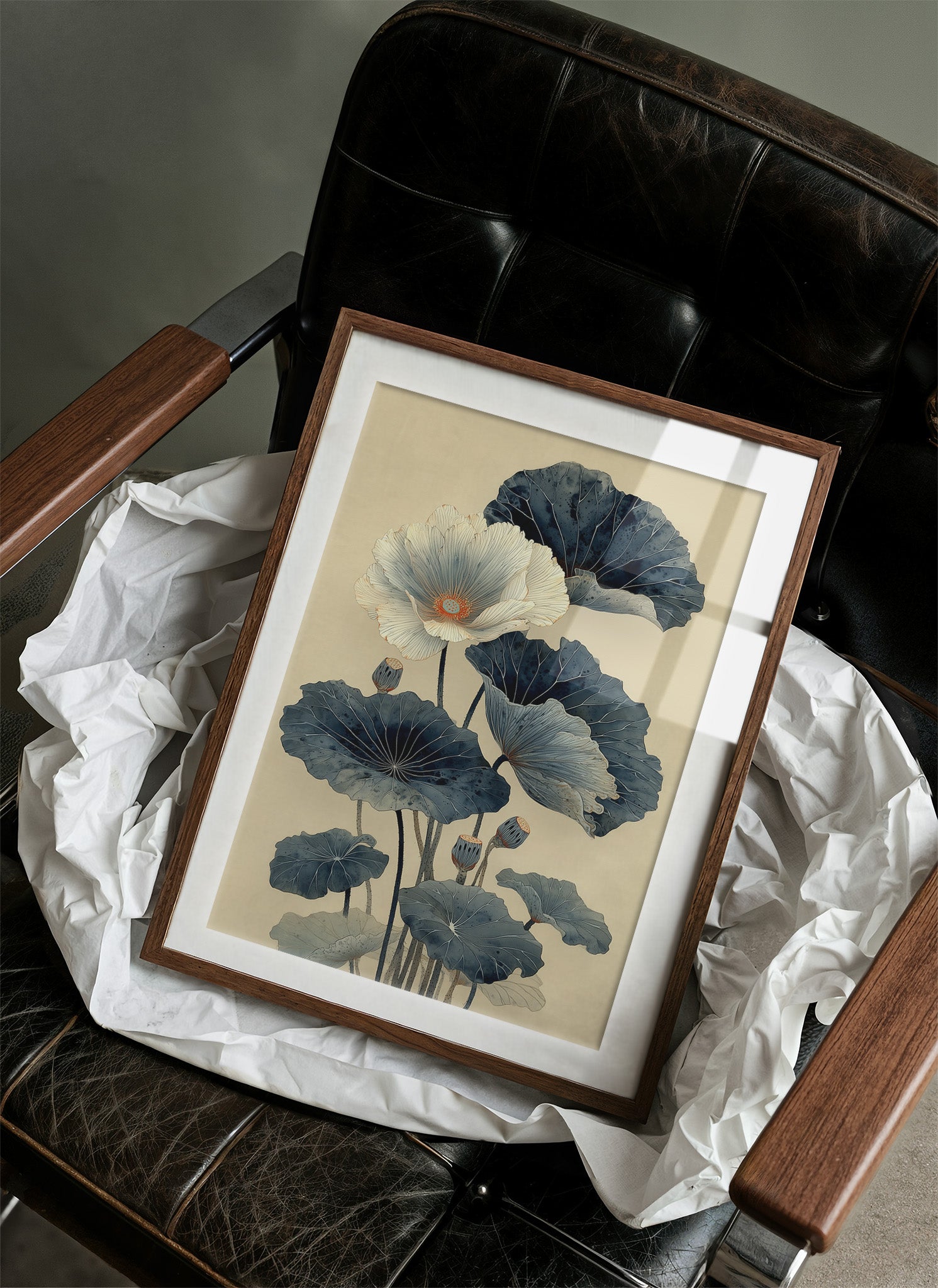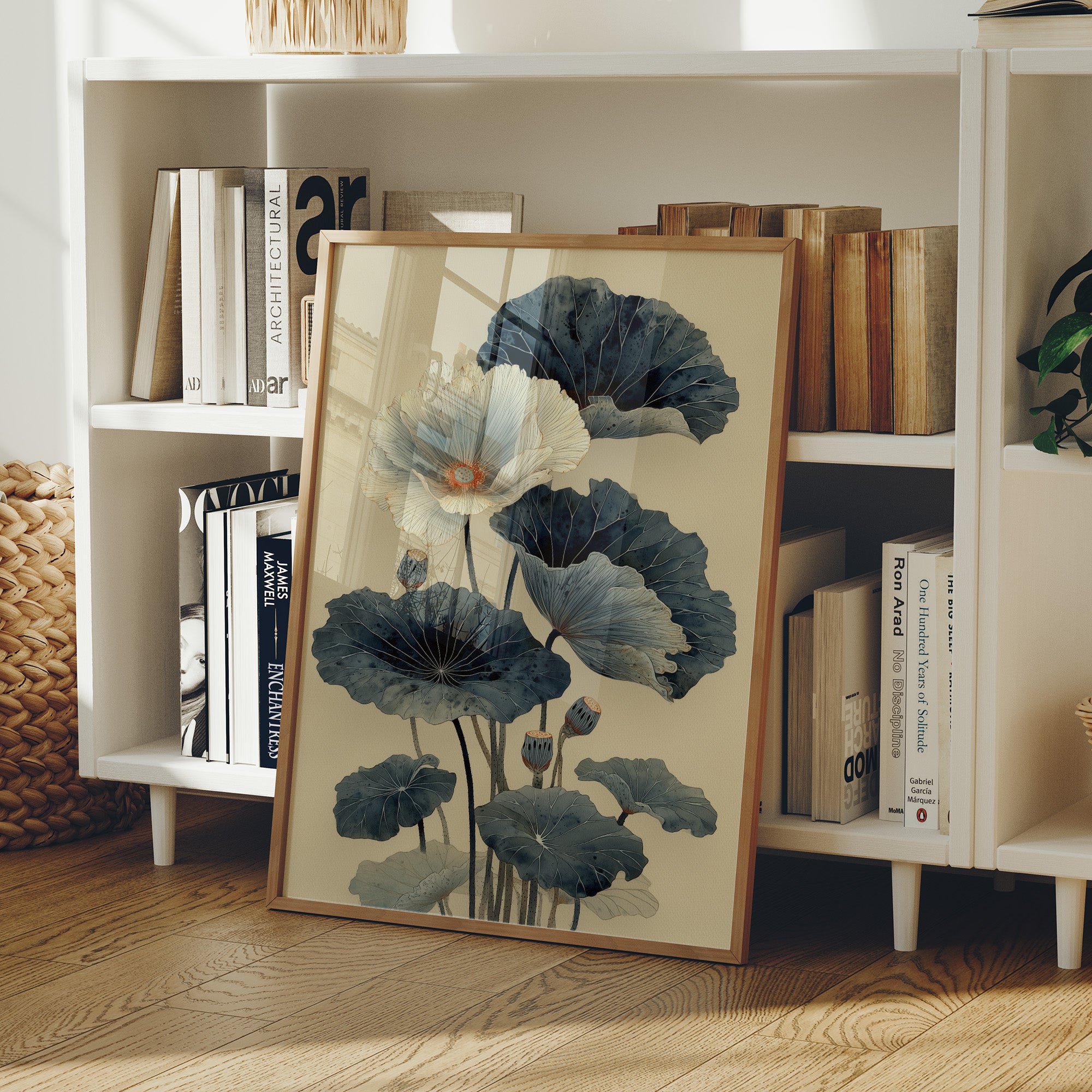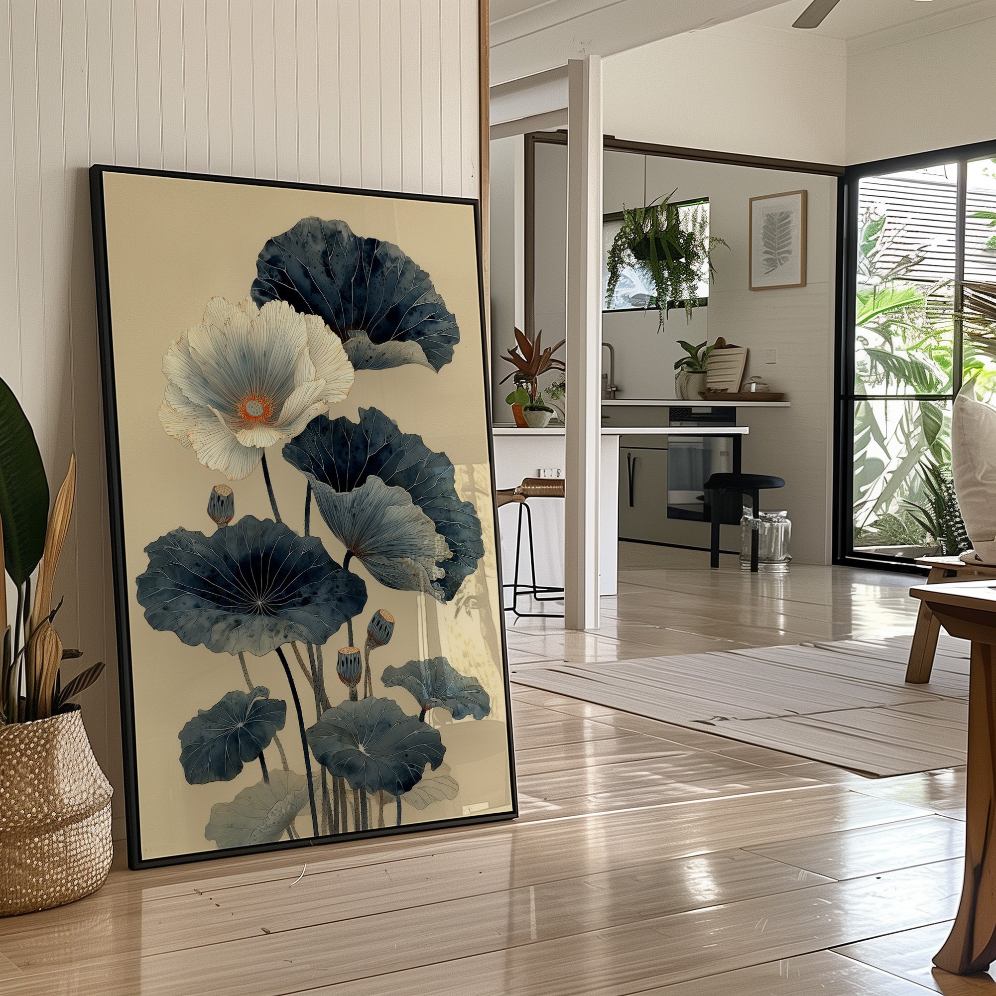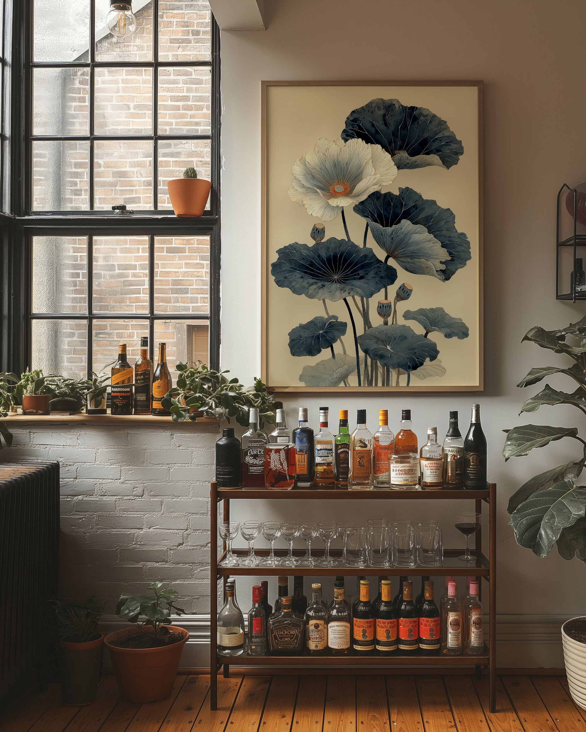 Indigo lotus leaves unfurl against cream-colored stillness, their elegant forms dancing above a carefully curated collection of spirits. The composition marries Eastern tranquility with modern sophistication, as deep blue-green botanicals create a mesmerizing focal point in this urban sanctuary. Natural light streams through industrial windows, casting gentle shadows across the wooden floors and highlighting the artful arrangement of bottles below. This piece transforms any home bar or dining space into an sophisticated entertainment area where art meets hospitality.