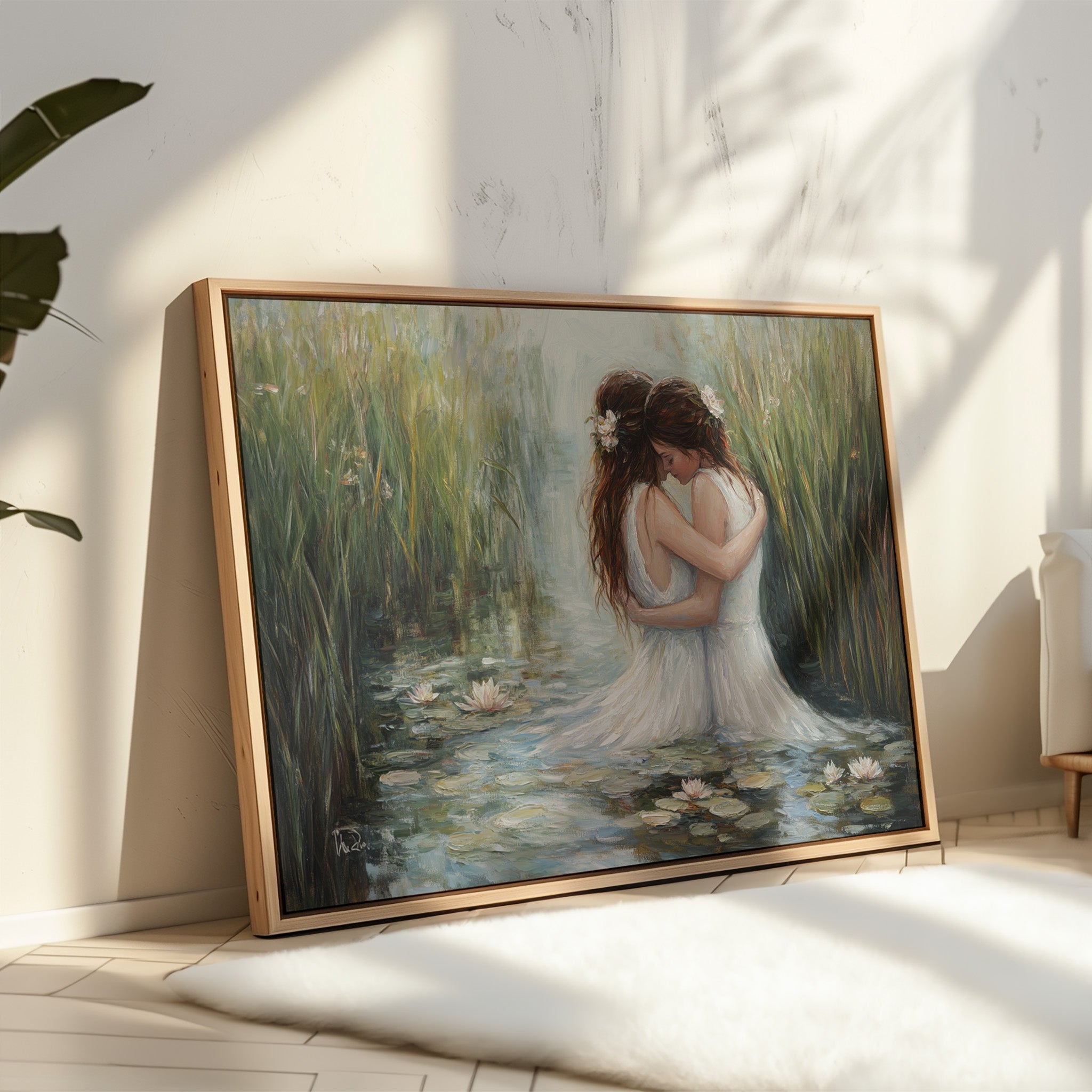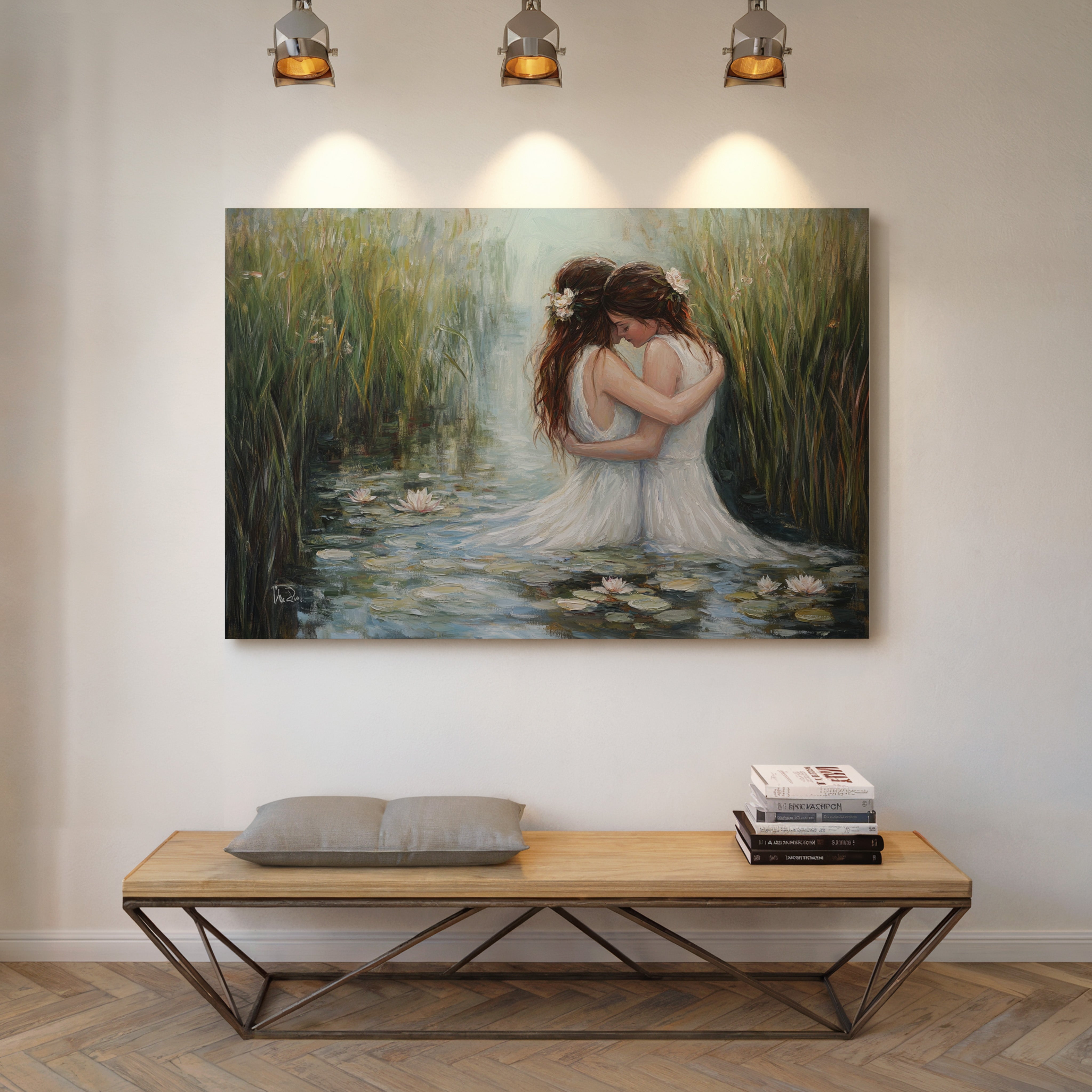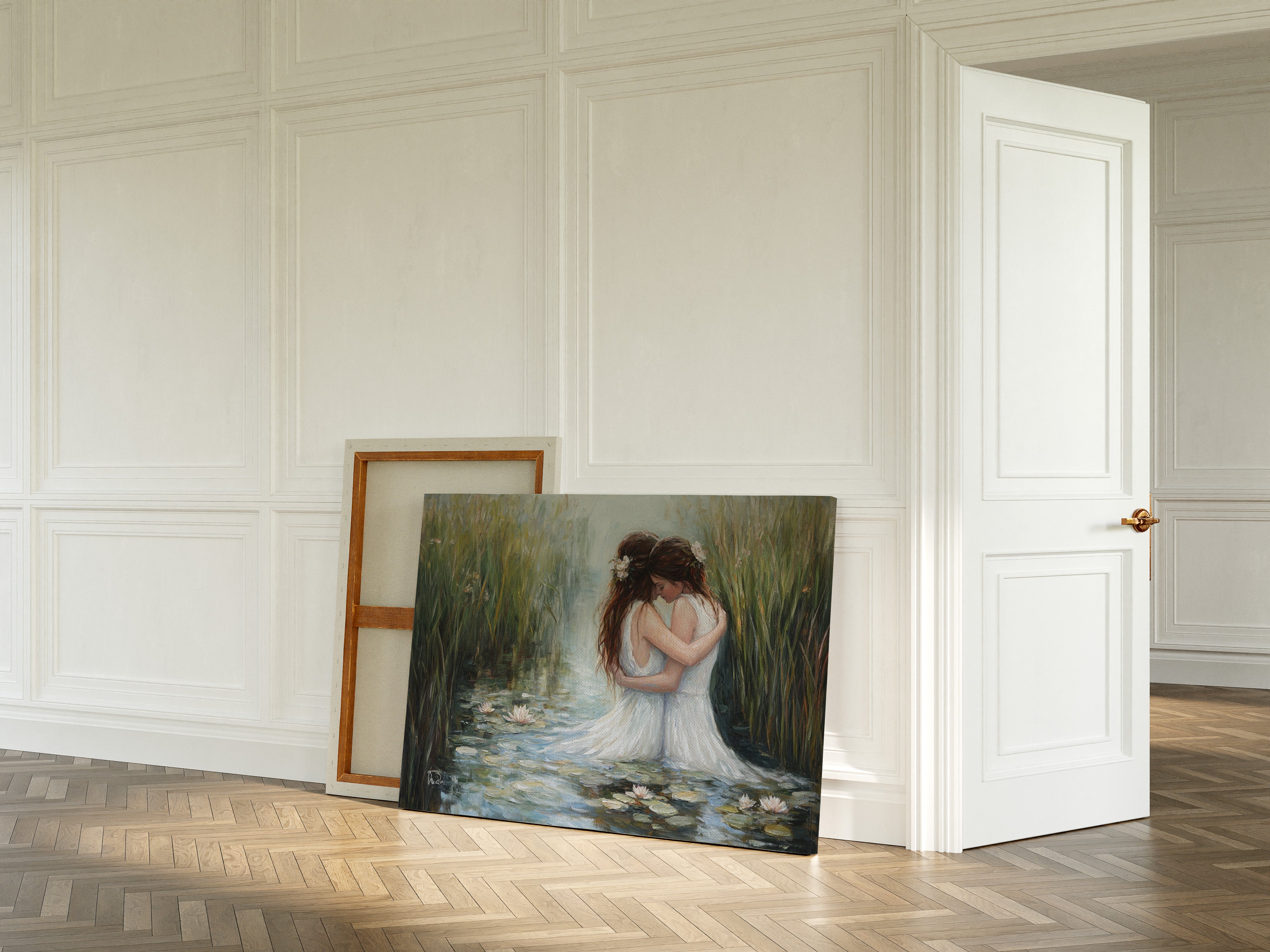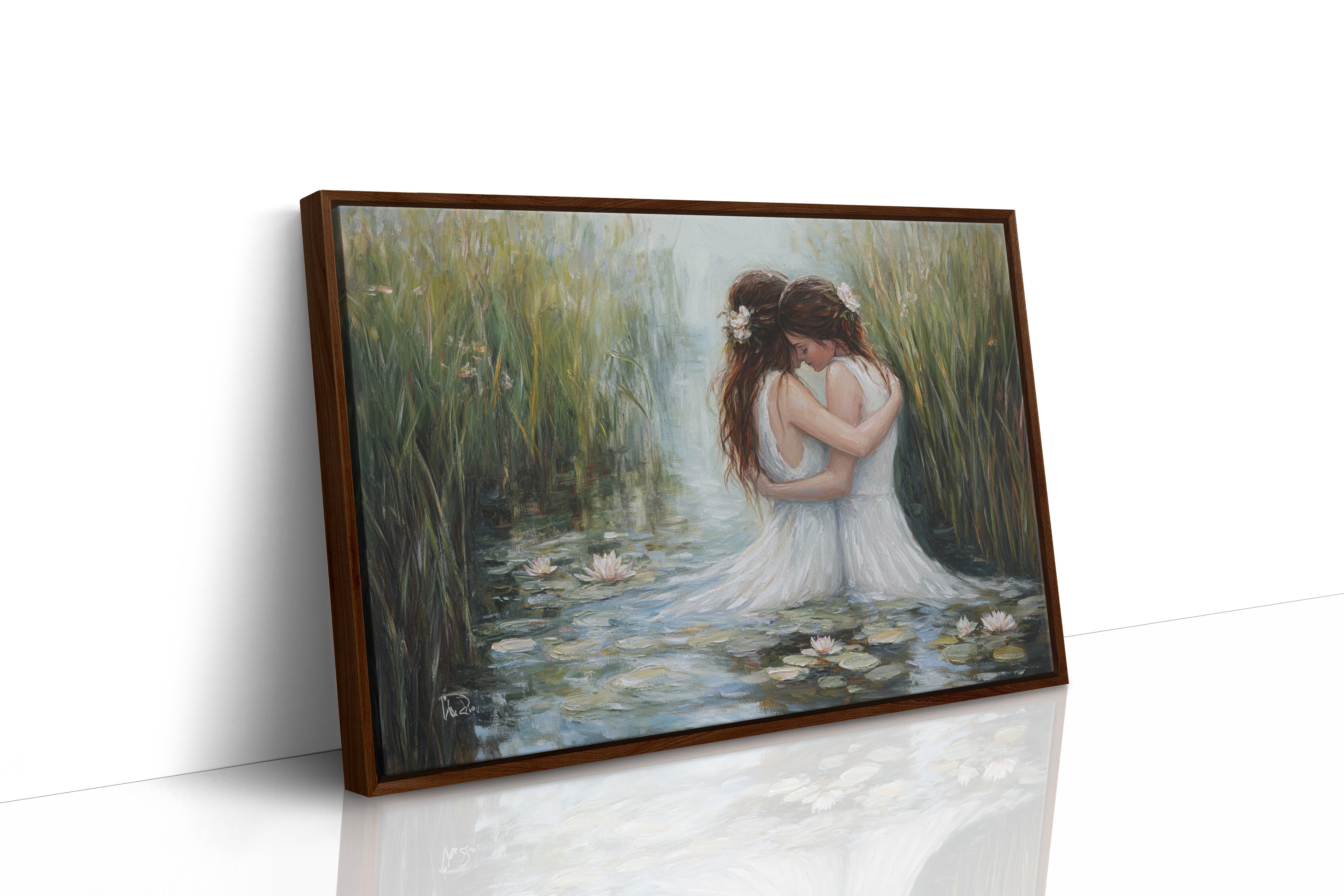 A tender moment unfolds in the soft light of a secluded pond, where time seems to pause in reverence. White dresses blend with the mist rising from tranquil waters, creating an ethereal scene punctuated by delicate pink water lilies. The surrounding cattails stand as silent sentinels, their green stalks creating a natural sanctuary while floating lily pads drift lazily across the reflecting surface. Perfect for a master bedroom or romantic reading nook where its dreamy atmosphere can inspire moments of peaceful contemplation.