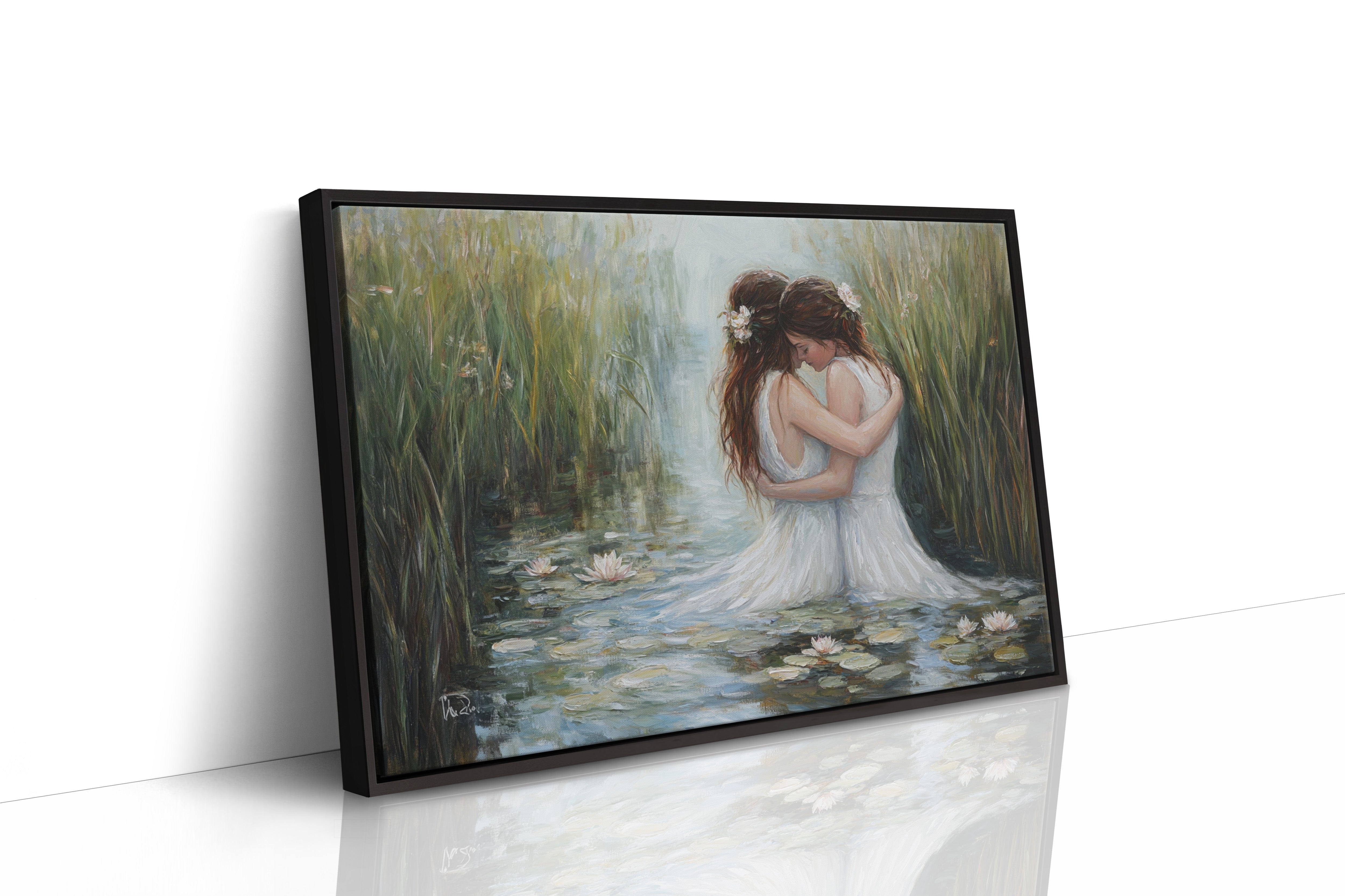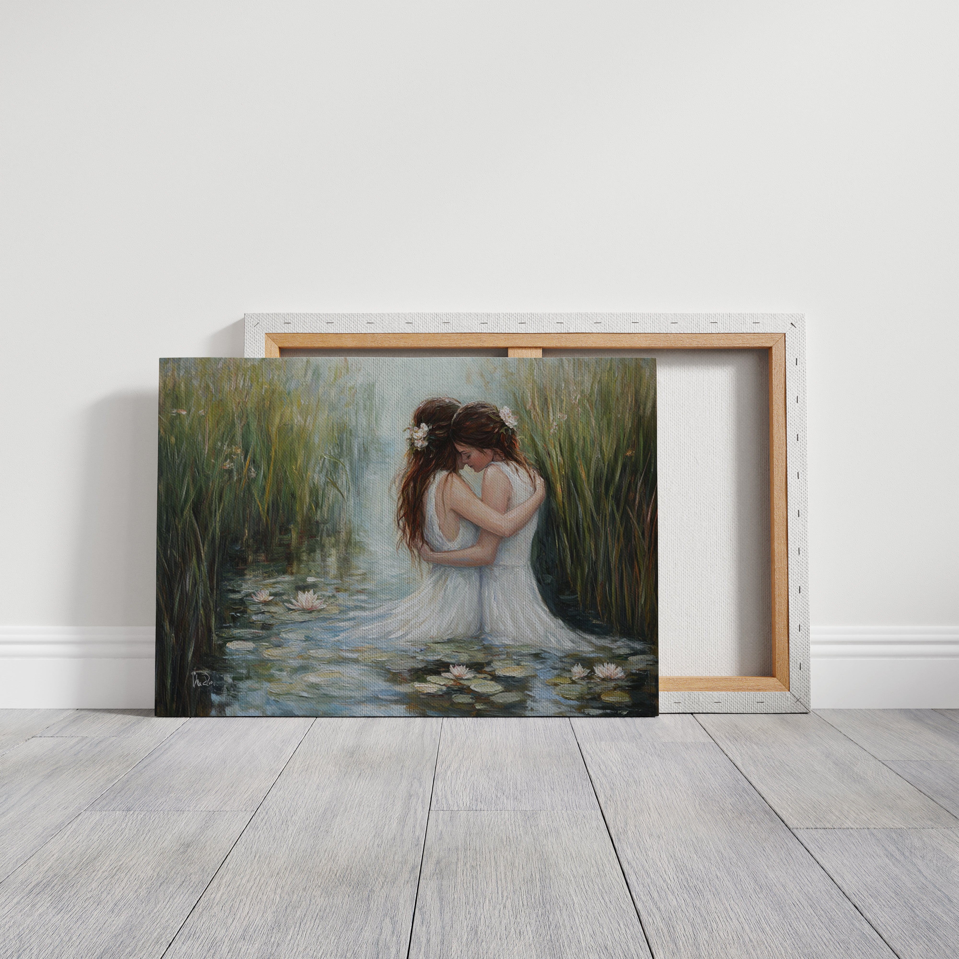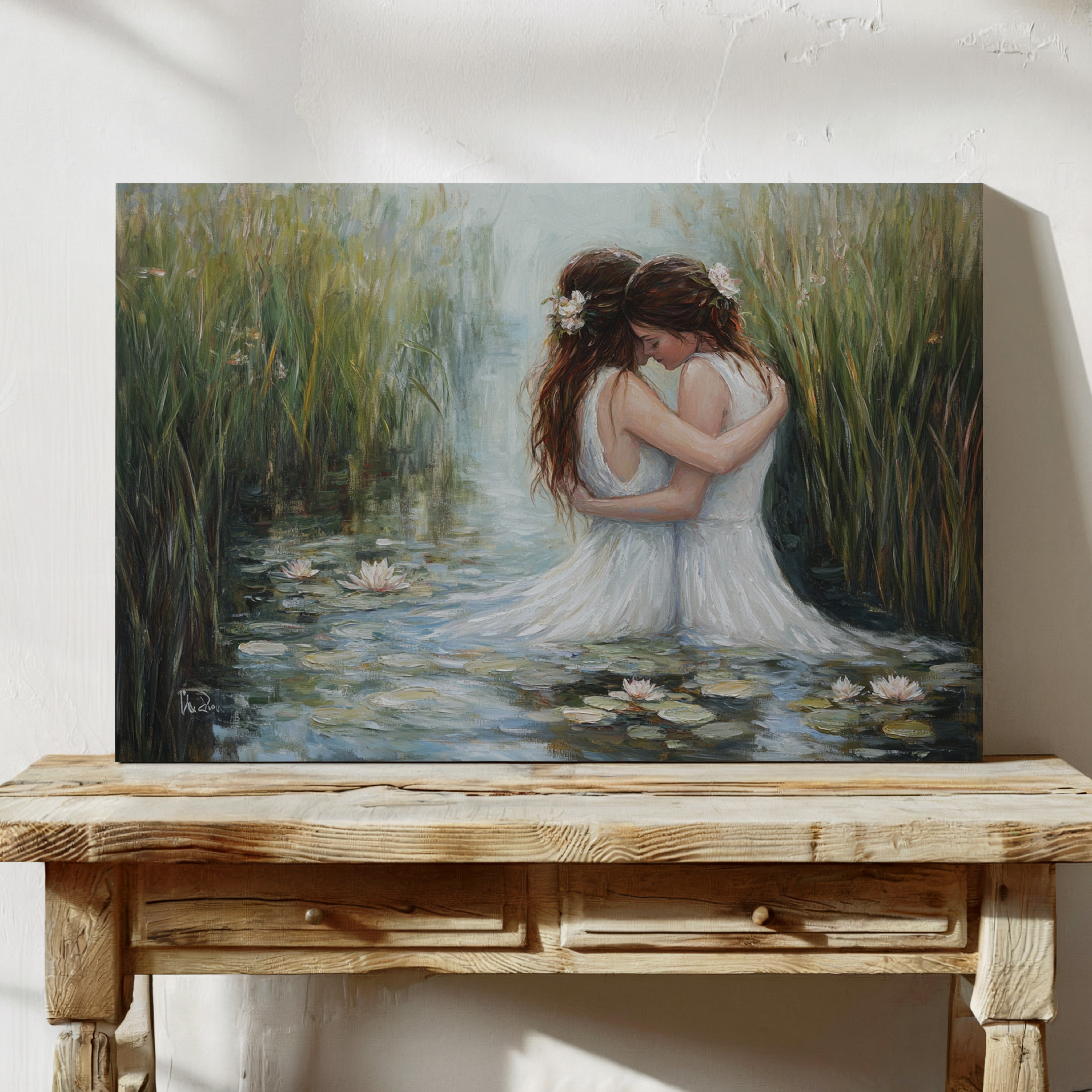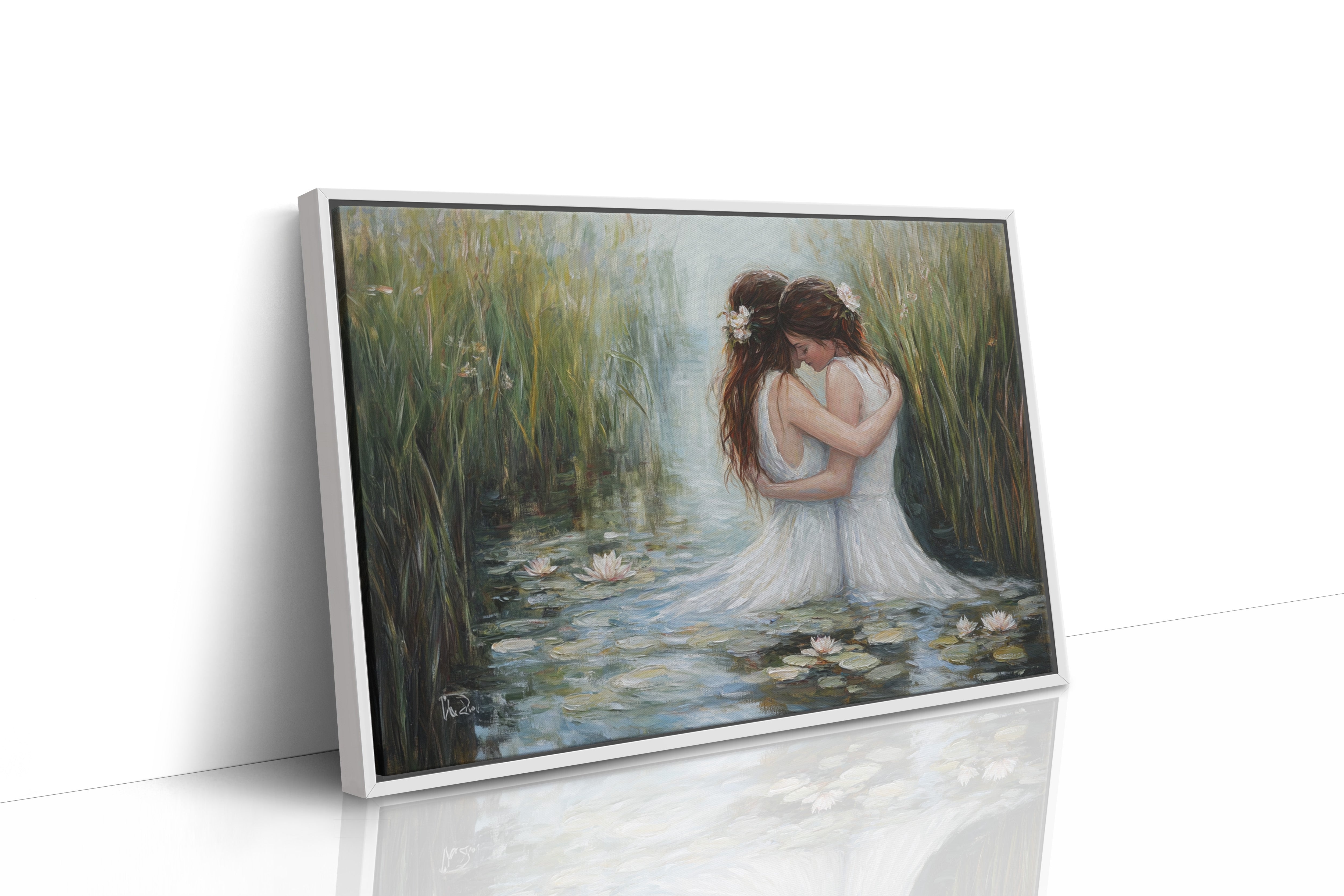 A tender moment unfolds in the soft light of a secluded pond, where time seems to pause in reverence. White dresses blend with the mist rising from tranquil waters, creating an ethereal scene punctuated by delicate pink water lilies. The surrounding cattails stand as silent sentinels, their green stalks creating a natural sanctuary while floating lily pads drift lazily across the reflecting surface. Perfect for a master bedroom or romantic reading nook where its dreamy atmosphere can inspire moments of peaceful contemplation.