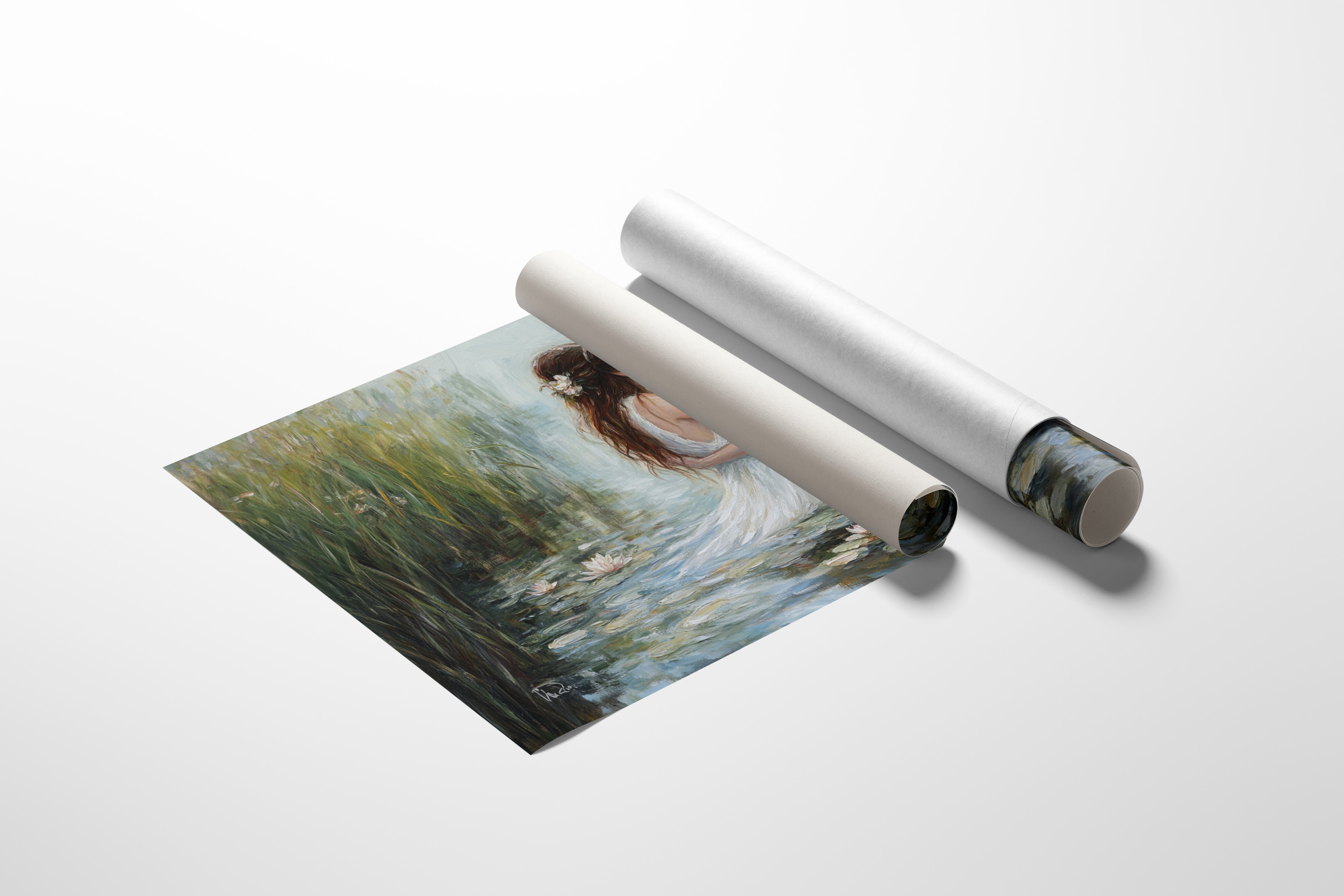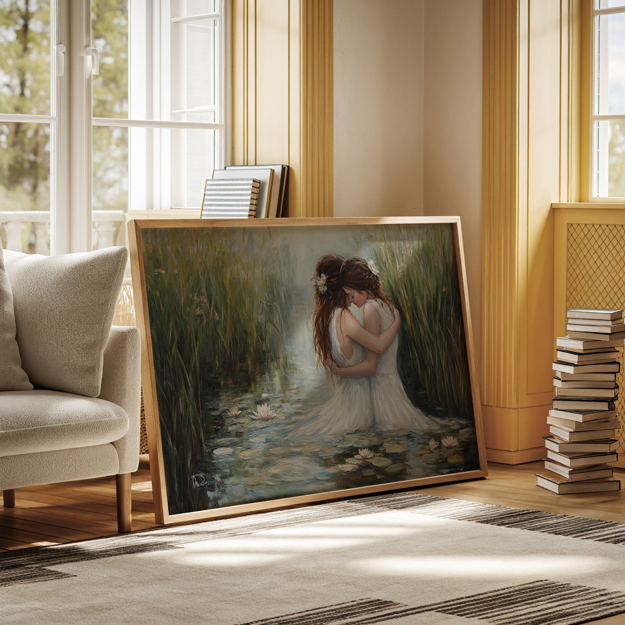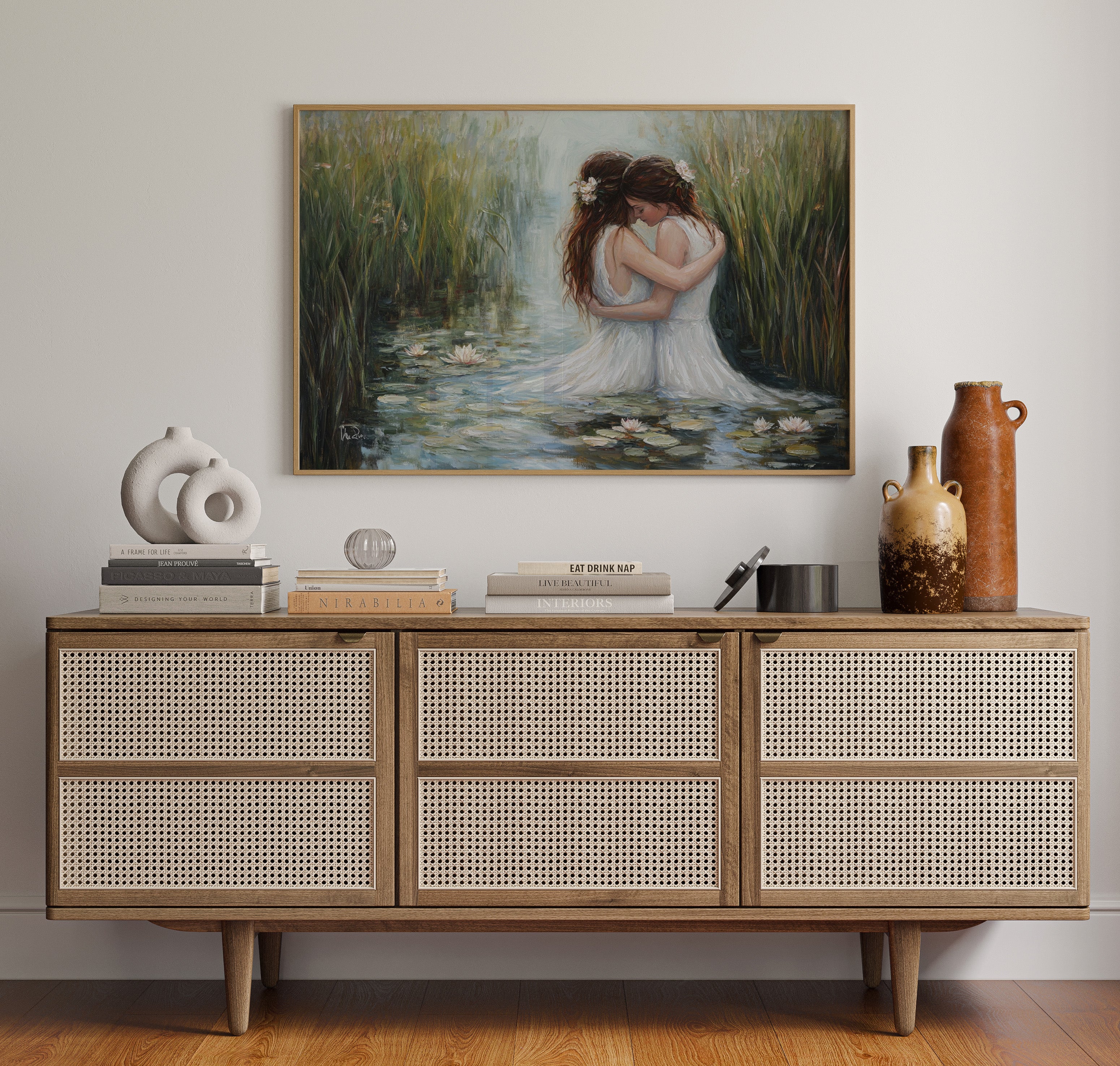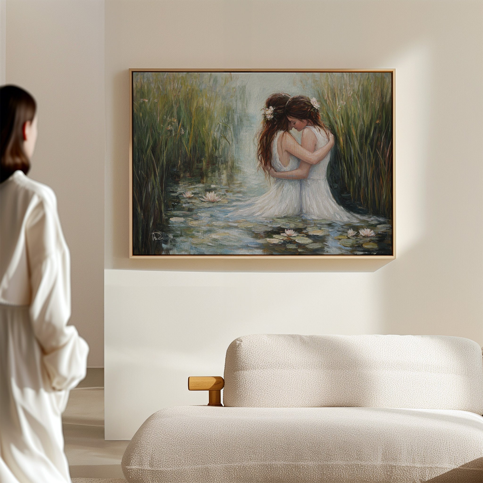 A tender moment unfolds in the soft light of a secluded pond, where time seems to pause in reverence. White dresses blend with the mist rising from tranquil waters, creating an ethereal scene punctuated by delicate pink water lilies. The surrounding cattails stand as silent sentinels, their green stalks creating a natural sanctuary while floating lily pads drift lazily across the reflecting surface. Perfect for a master bedroom or romantic reading nook where its dreamy atmosphere can inspire moments of peaceful contemplation.