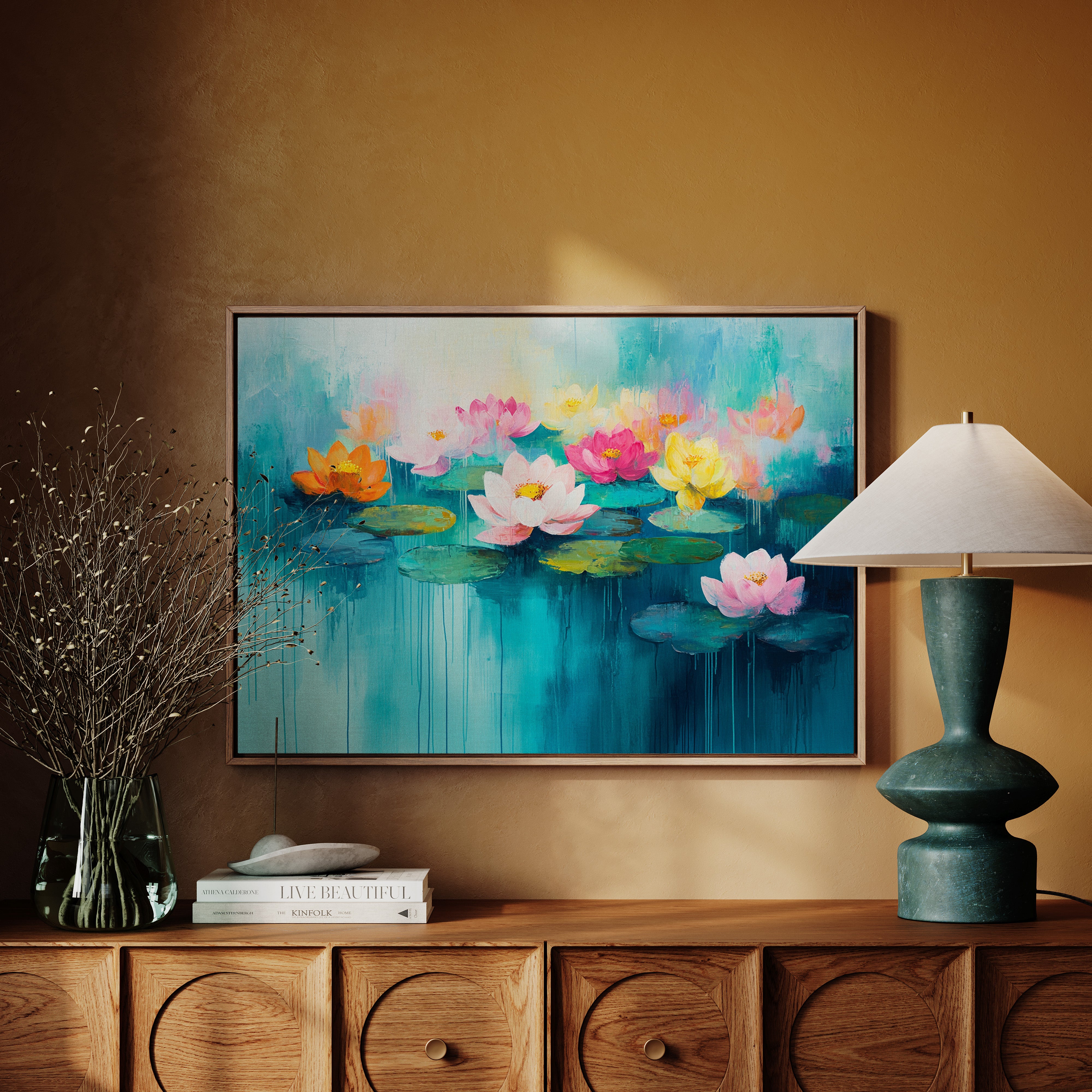 Delicate water lilies drift across a mysterious turquoise expanse, their petals unfurling like morning thoughts. Pink, orange, and yellow blooms create a symphony of color against deep teal waters, while lily pads provide nature's perfect stage. The impressionistic brushstrokes and dripping technique create a dreamlike quality, suggesting both movement and stillness in this aquatic ballet. This piece brings the serenity of a summer pond into interior spaces, ideal for creating a peaceful focal point in meditation rooms or spa-like bathrooms where its calming energy can be fully appreciated.