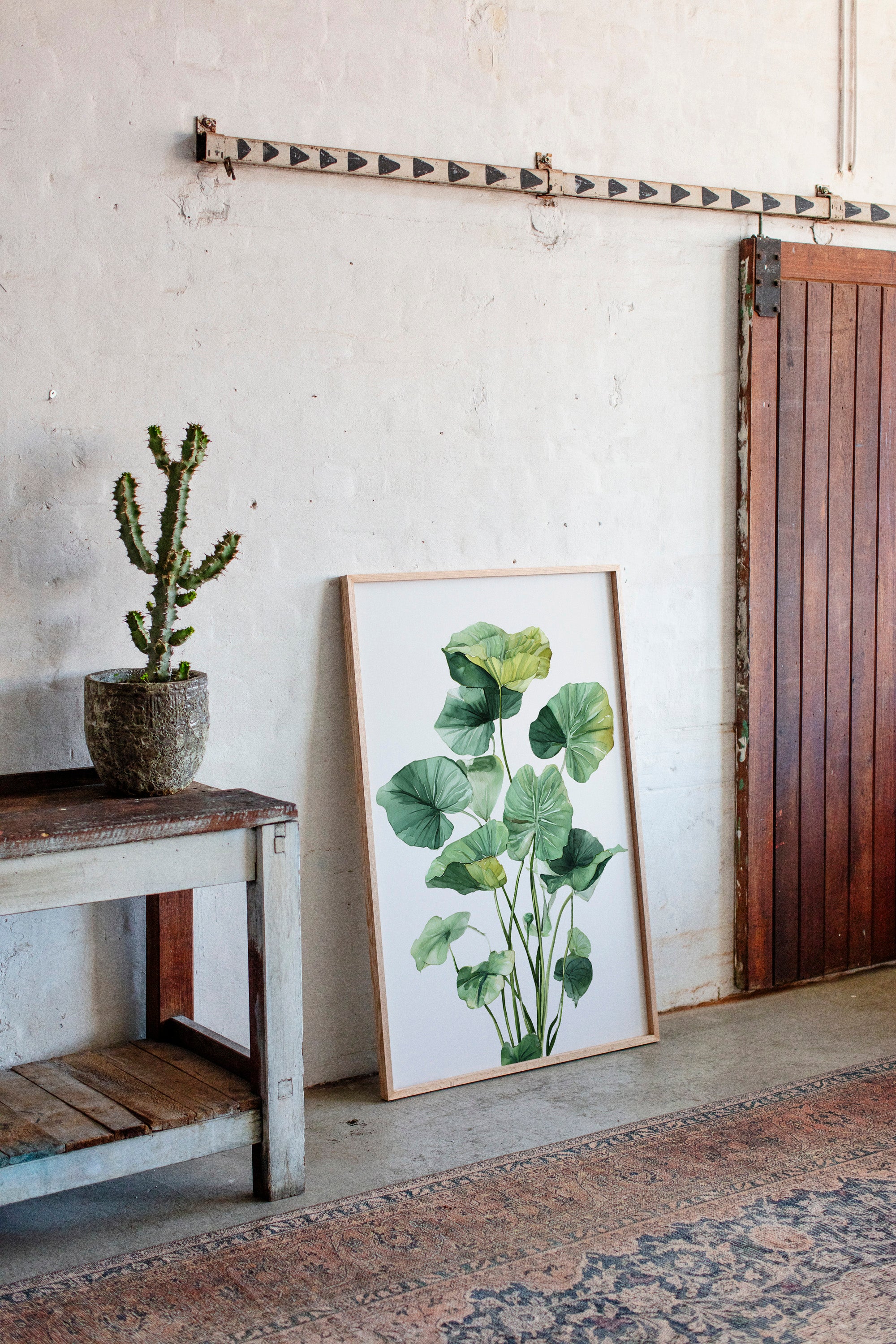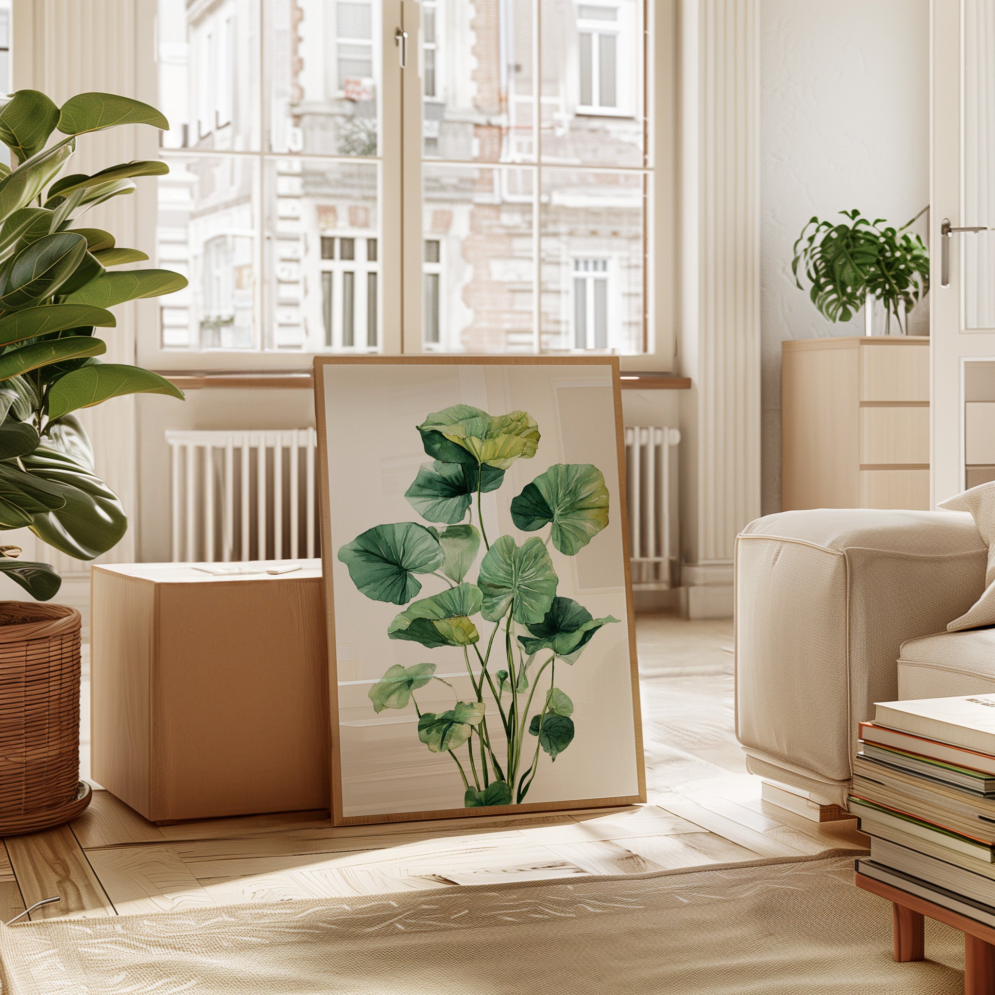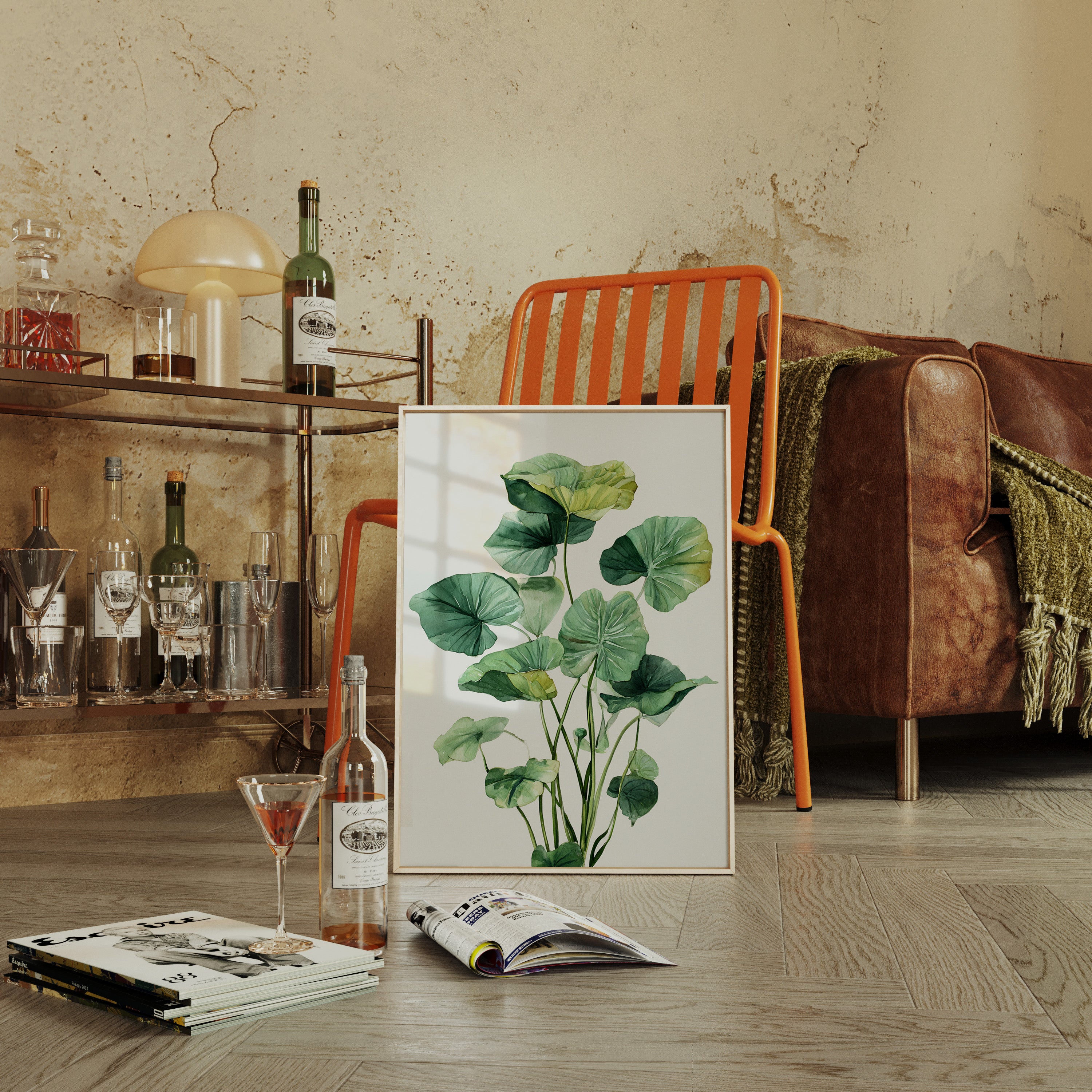 Delicate watercolor strokes capture the graceful dance of lotus leaves, their circular forms reaching skyward like nature's own parasols. Each leaf tells a story through varying shades of jade and emerald, their translucent layers revealing the masterful interplay of light and shadow. The composition's elegant simplicity speaks to the quiet strength found in botanical forms, with slender stems supporting the bold, circular leaves in their reaching ascent. This piece would bring a sense of serenity and natural elegance to a modern dining room or create a peaceful focal point in a minimalist bedroom sanctuary.