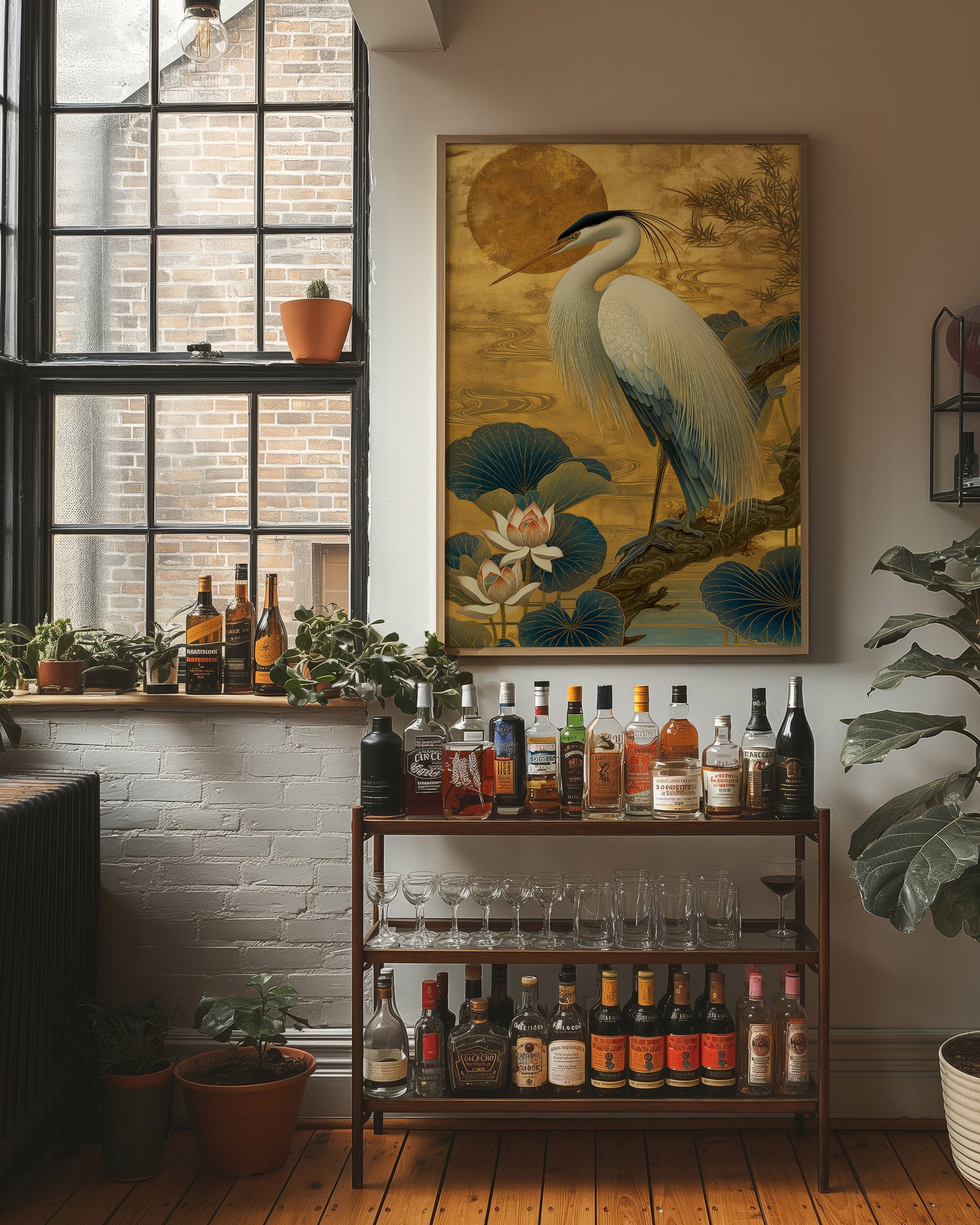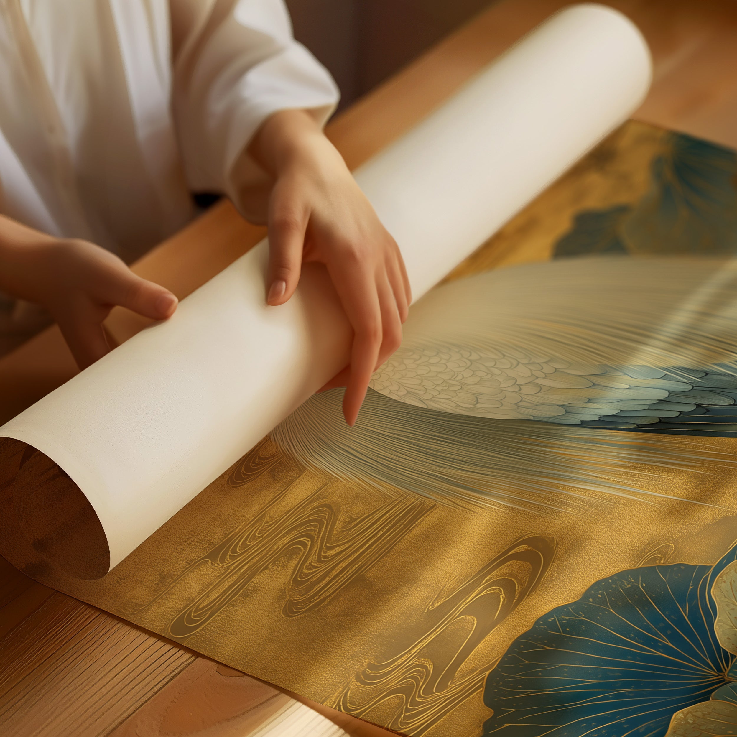 A majestic white heron stands sentinel against a luminous golden background, its elegant form perfectly balanced among blooming lotus flowers. The composition weaves together deep teal lotus leaves with delicate pink blossoms, creating a timeless scene that captures the essence of traditional Asian artistry. The interplay of soft whites, rich golds, and deep blues speaks to both serenity and nobility, while subtle ripples in the water suggest the quiet movement of life. This striking piece would elevate any space seeking to blend contemporary minimalism with classical Eastern aesthetics. Perfect for a serene reading nook, meditation space, or as an elegant focal point in a modern dining room.