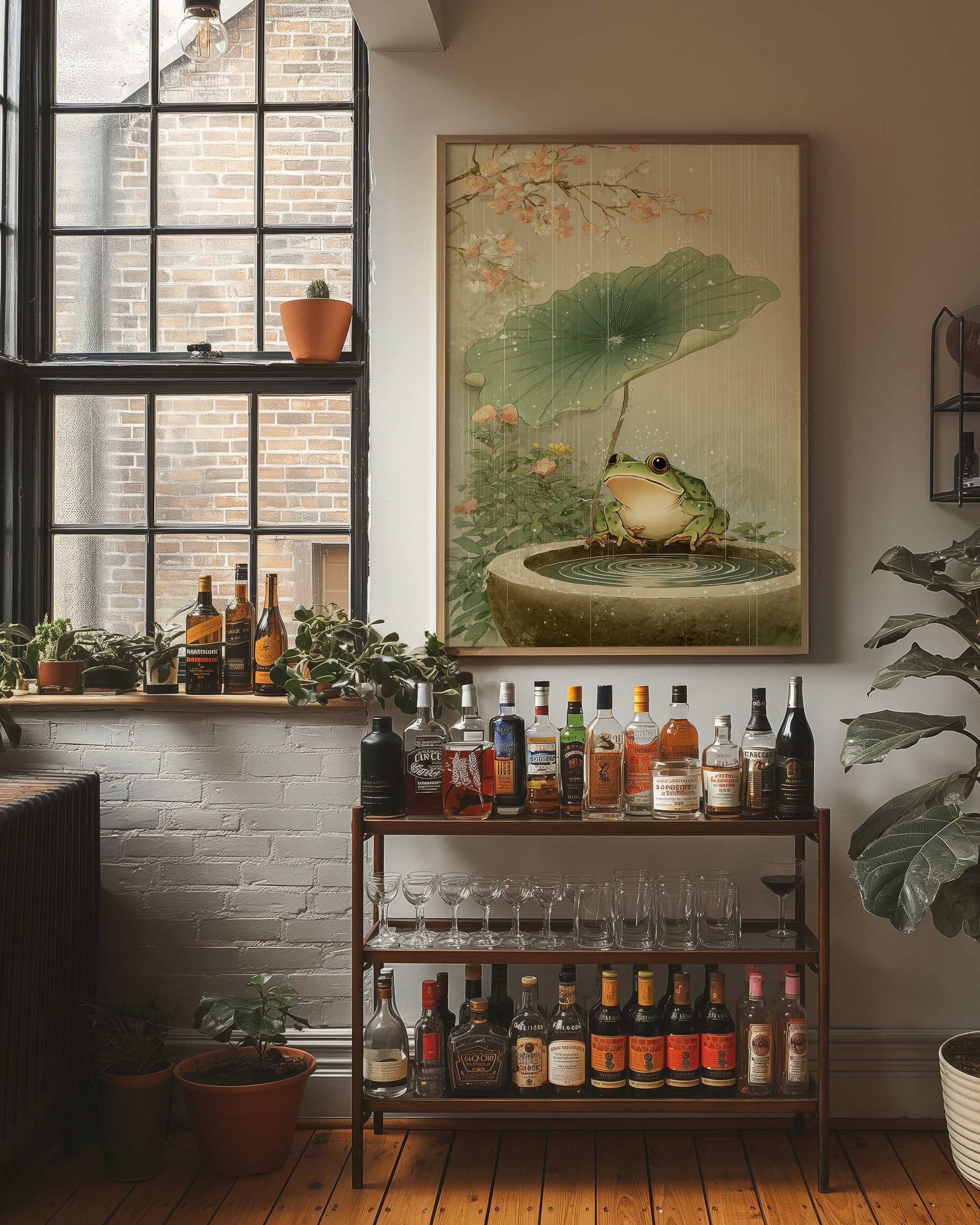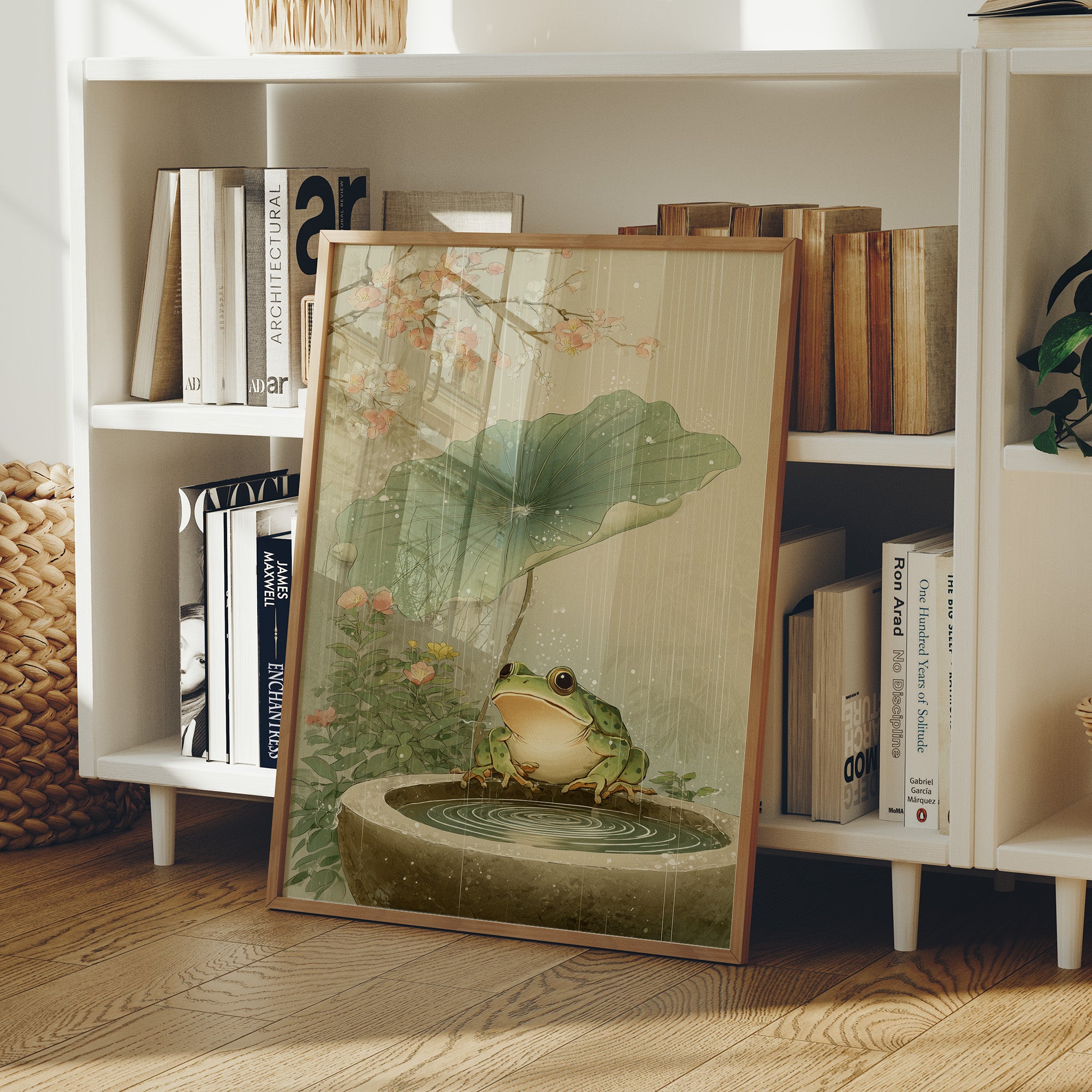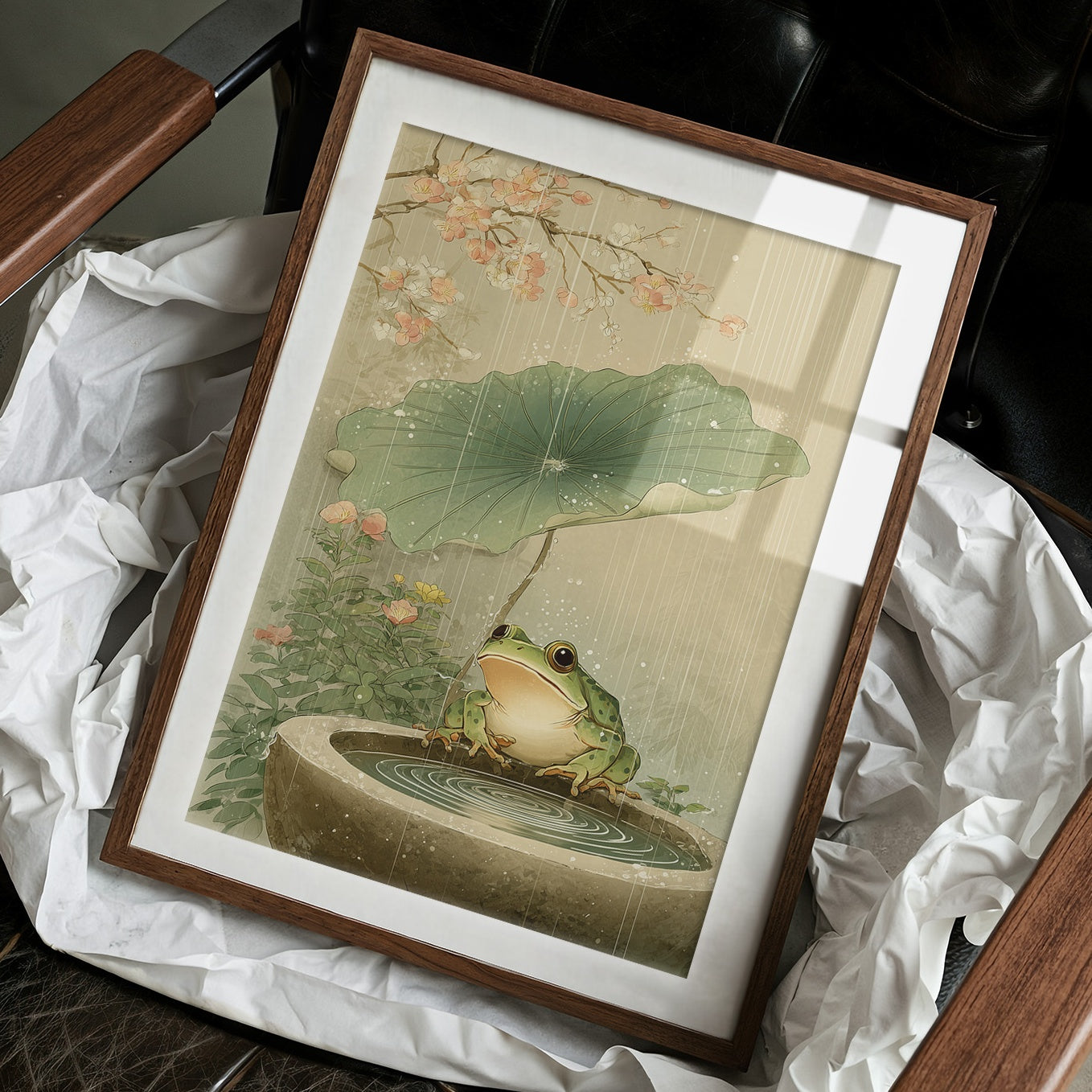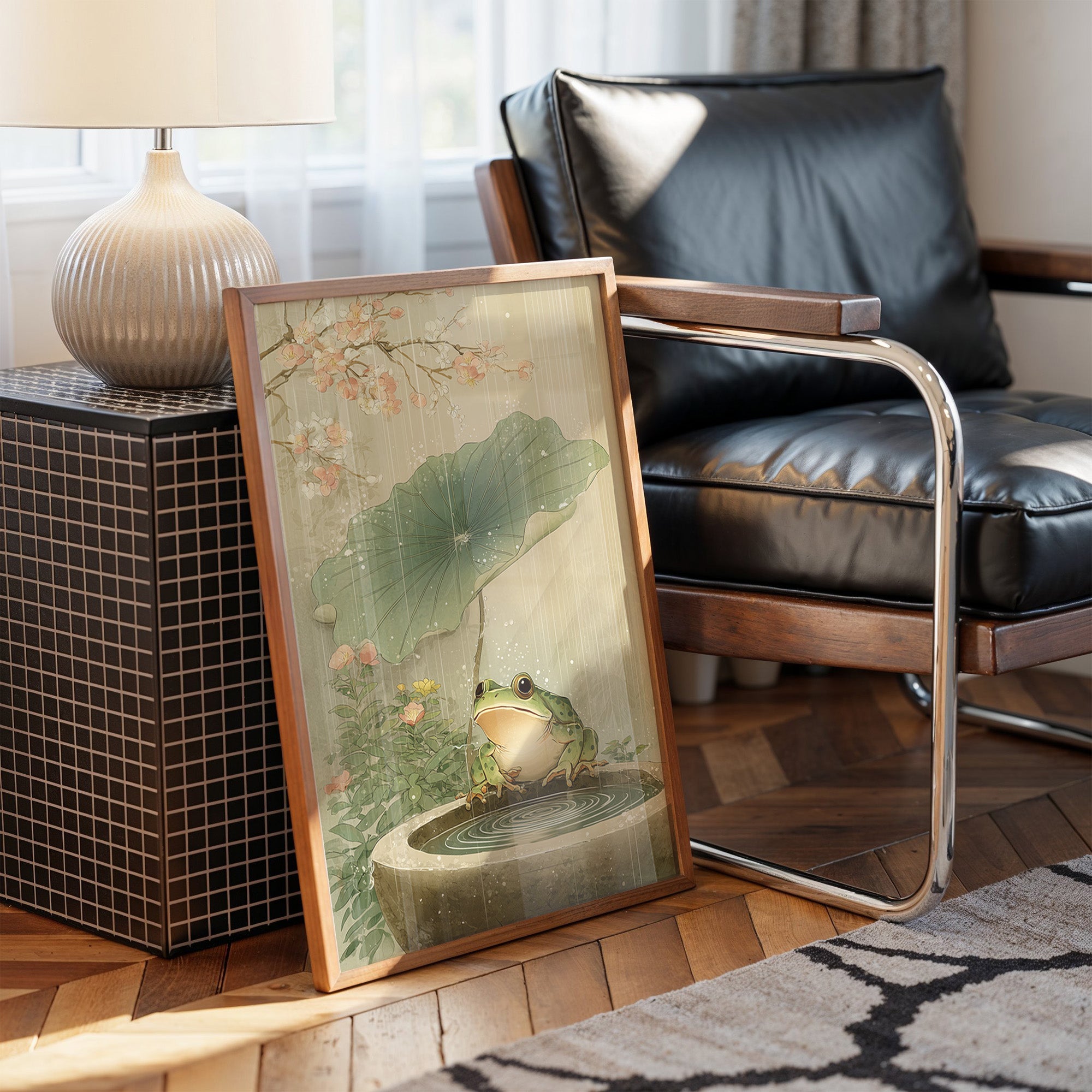 Gentle raindrops create ripples on a tranquil pond, where a content frog finds shelter beneath an expansive lotus leaf. The scene captures a moment of peaceful coexistence, with delicate cherry blossoms adding touches of coral pink against a misty sage backdrop. The illustration's ethereal quality emerges through soft watercolor techniques and dreamy atmospheric elements, creating a harmonious blend of Eastern artistic influence and storybook charm. This piece would bring a sense of whimsy and tranquility to a reading nook, child's room, or any space seeking to capture the magic of nature's quiet moments.