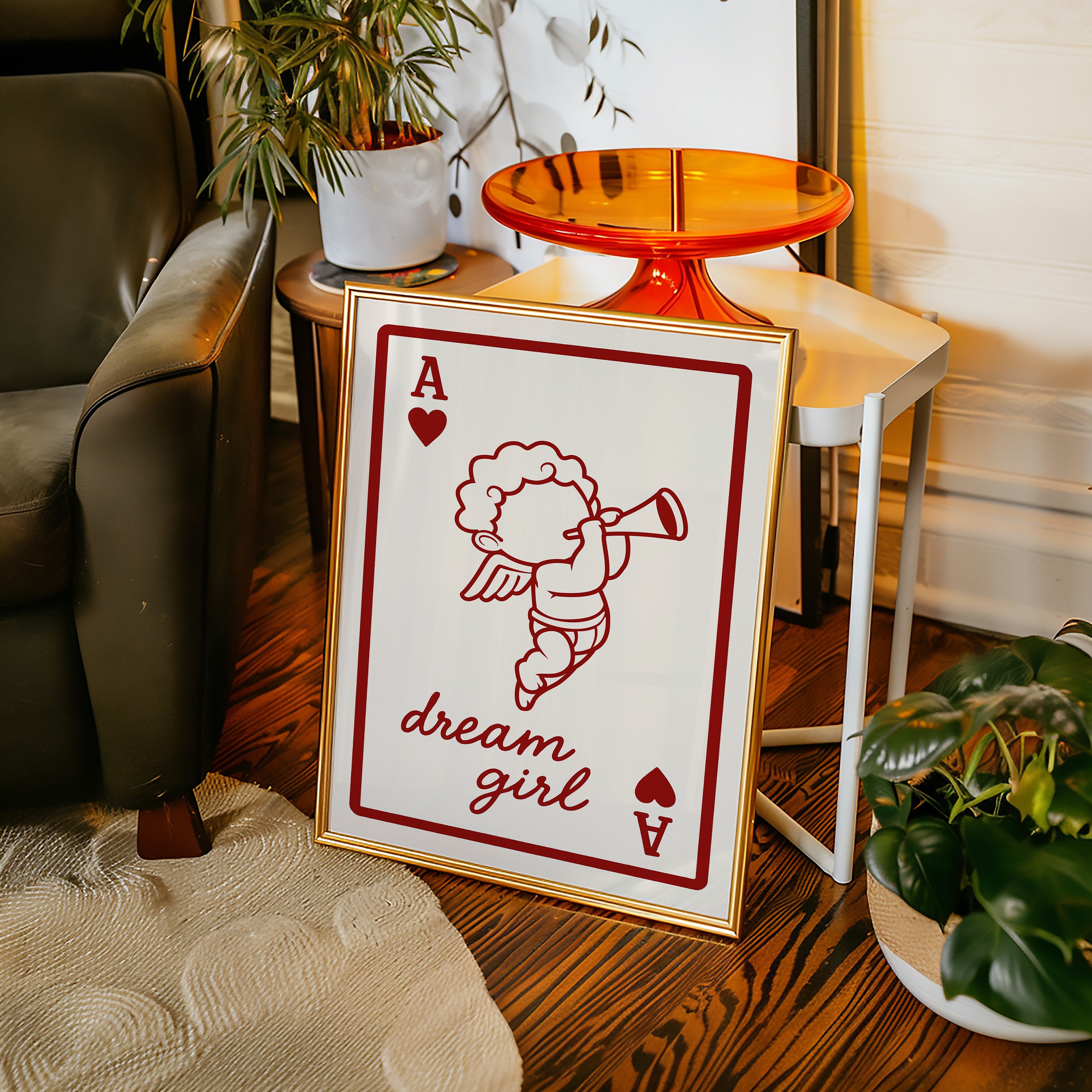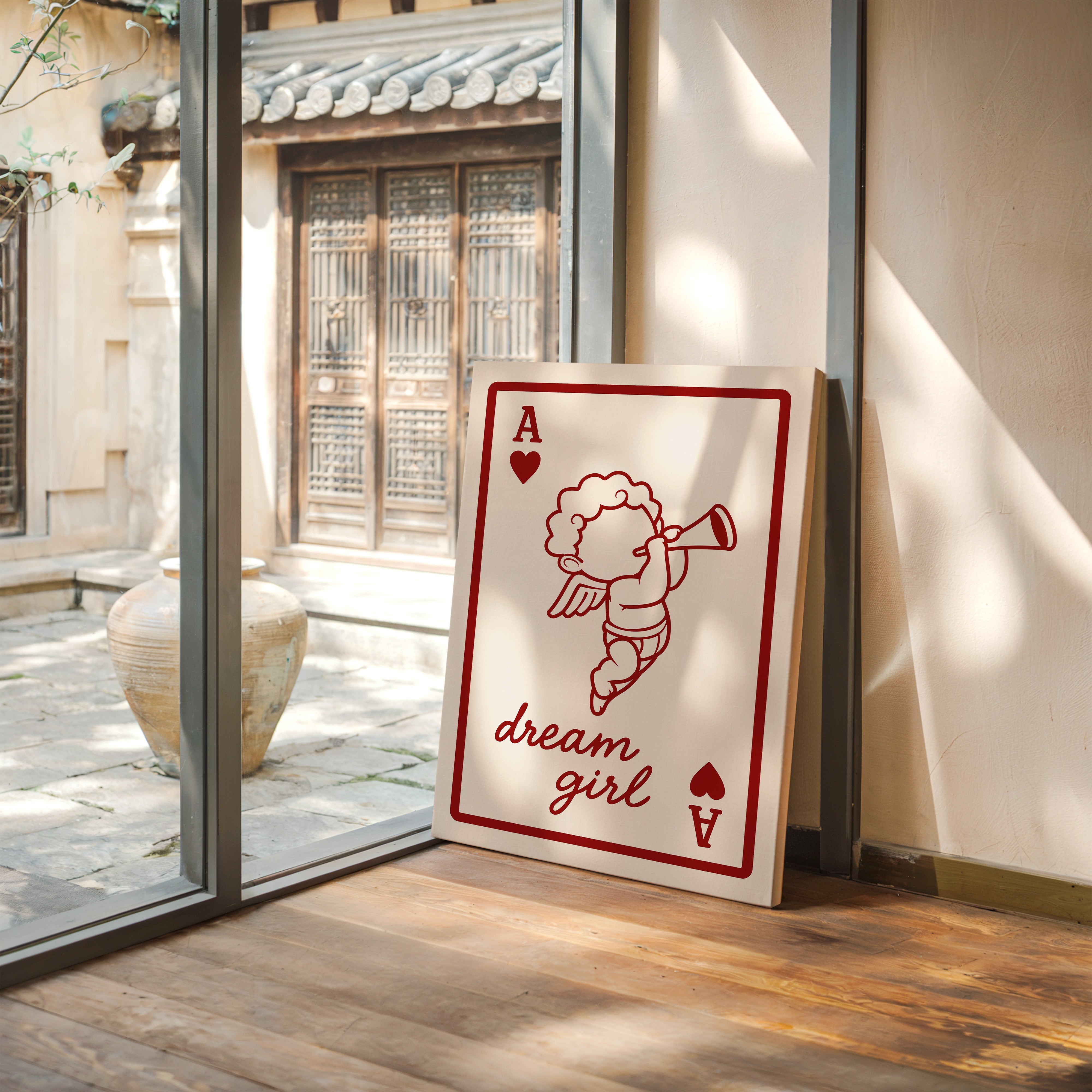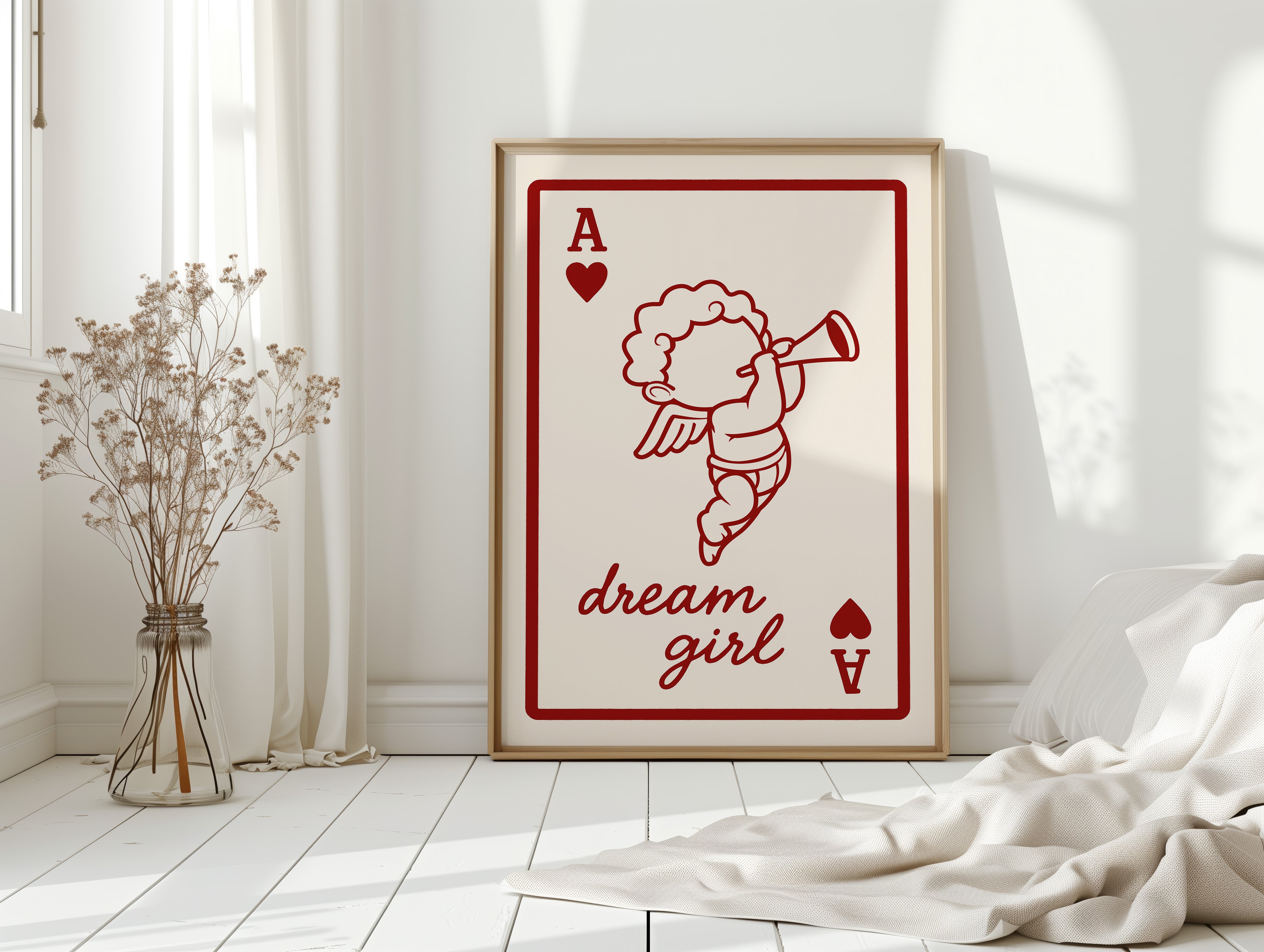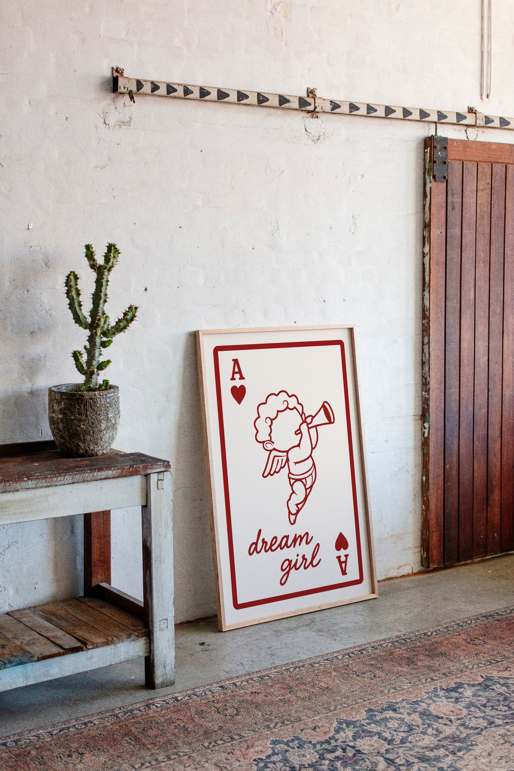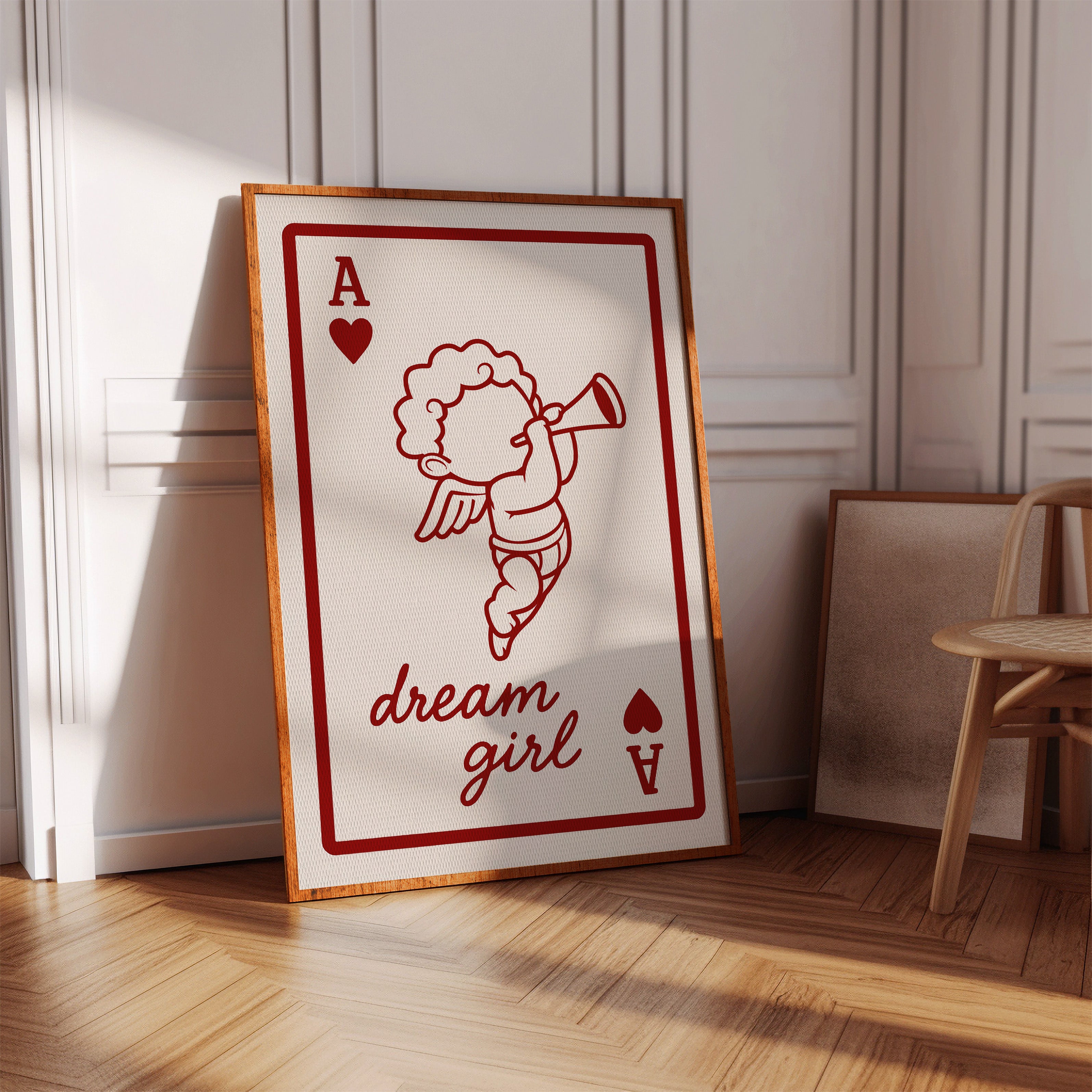 A charming illustration captures the whimsy of childhood innocence, rendered in deep crimson against a soft cream background. The playing card design features a cherubic figure blowing a trumpet, framed by the ace of hearts symbology, creating a delightful blend of classical card imagery and playful art. The cursive text and minimalist line work evoke a sense of vintage Valentine's Day cards while maintaining a contemporary edge. This piece would bring a touch of romantic nostalgia to a nursery, child's room, or any space seeking a blend of classic charm and modern simplicity.