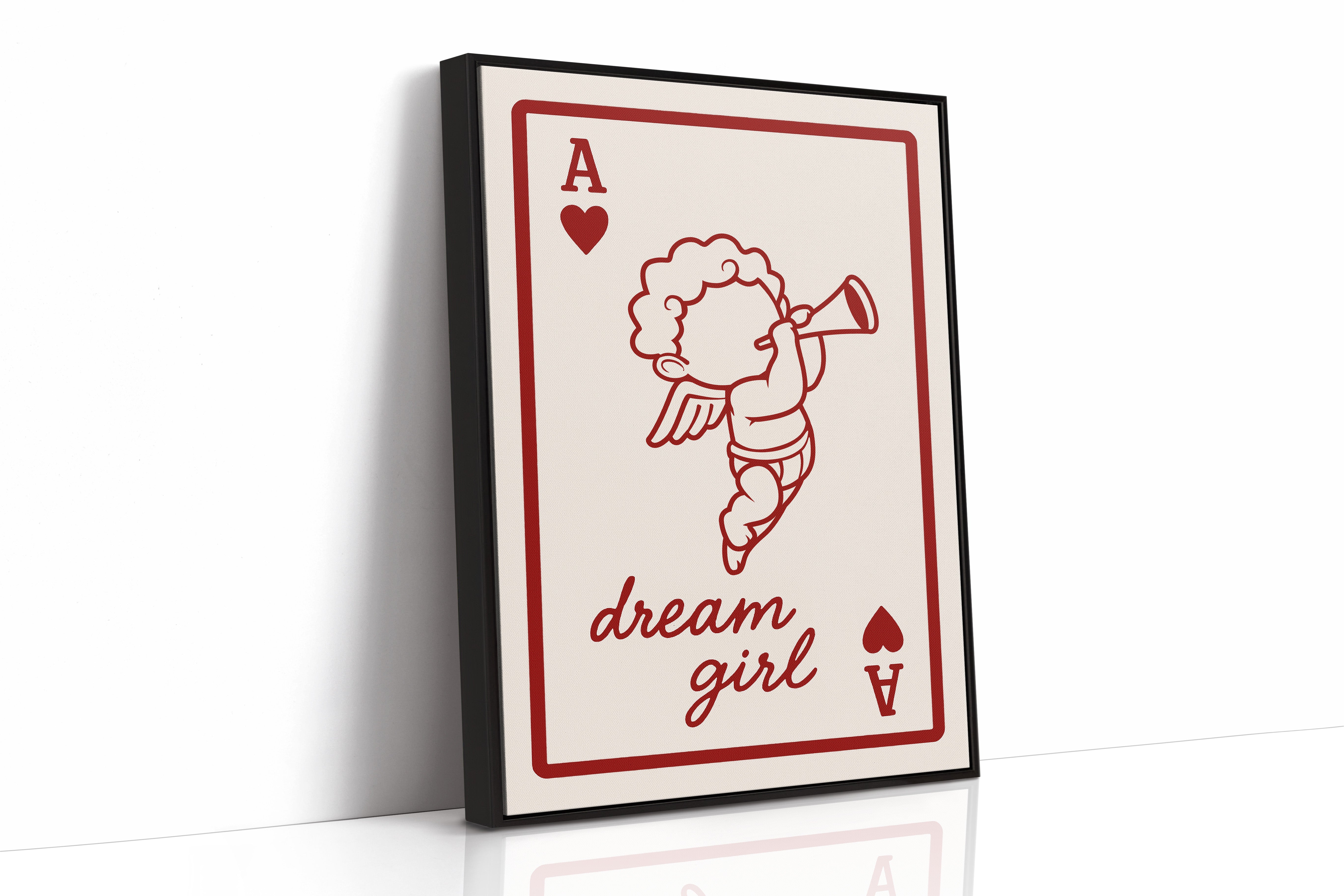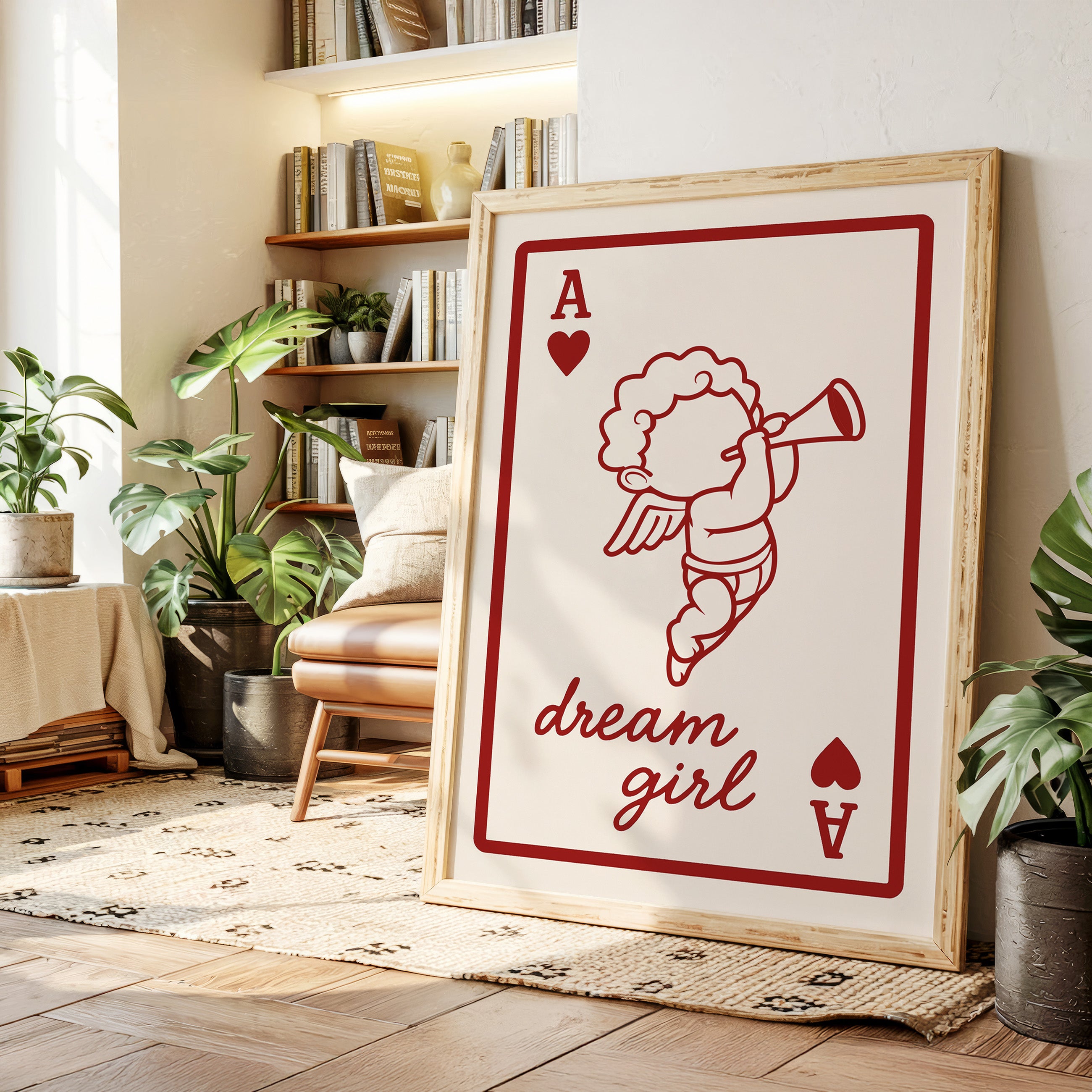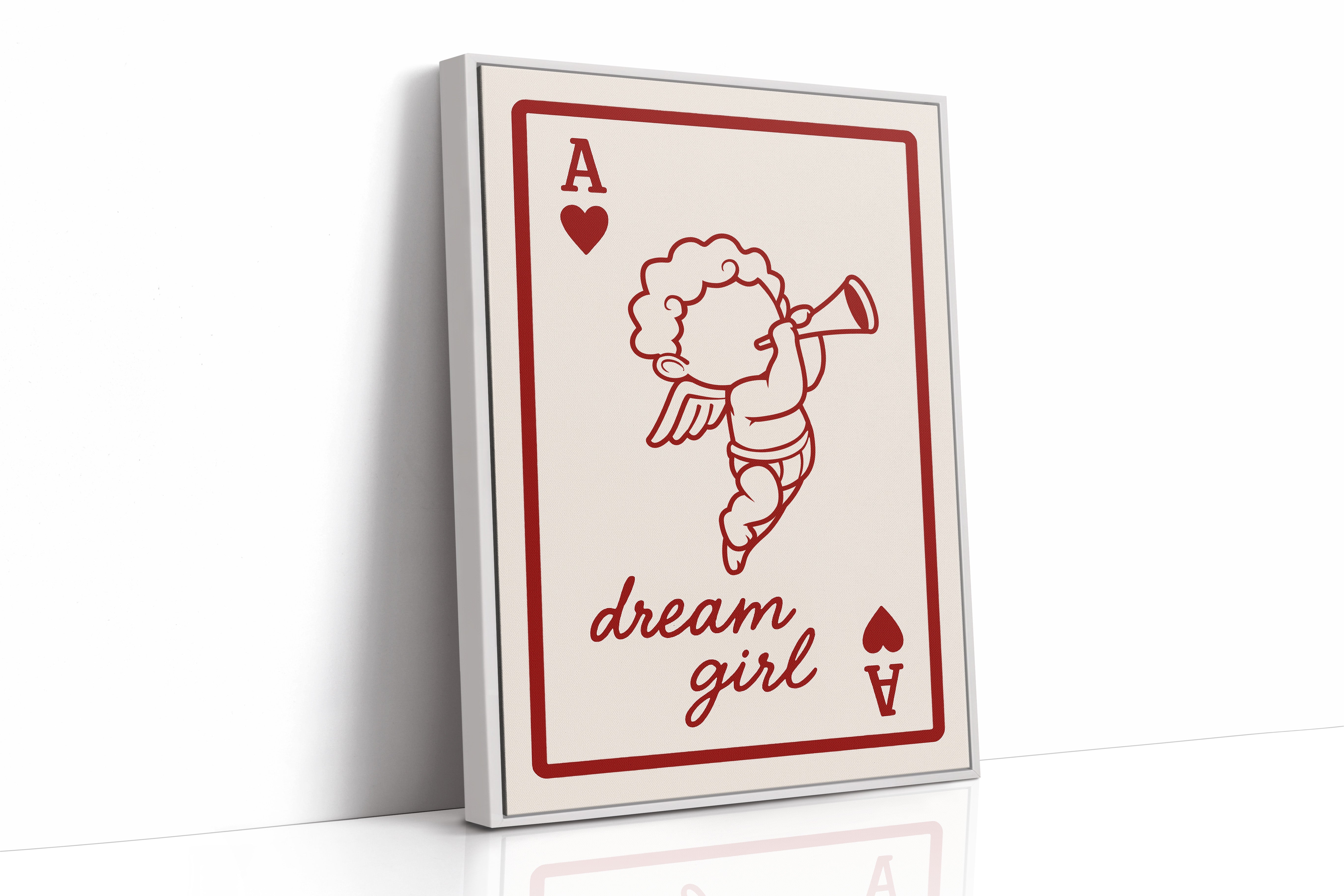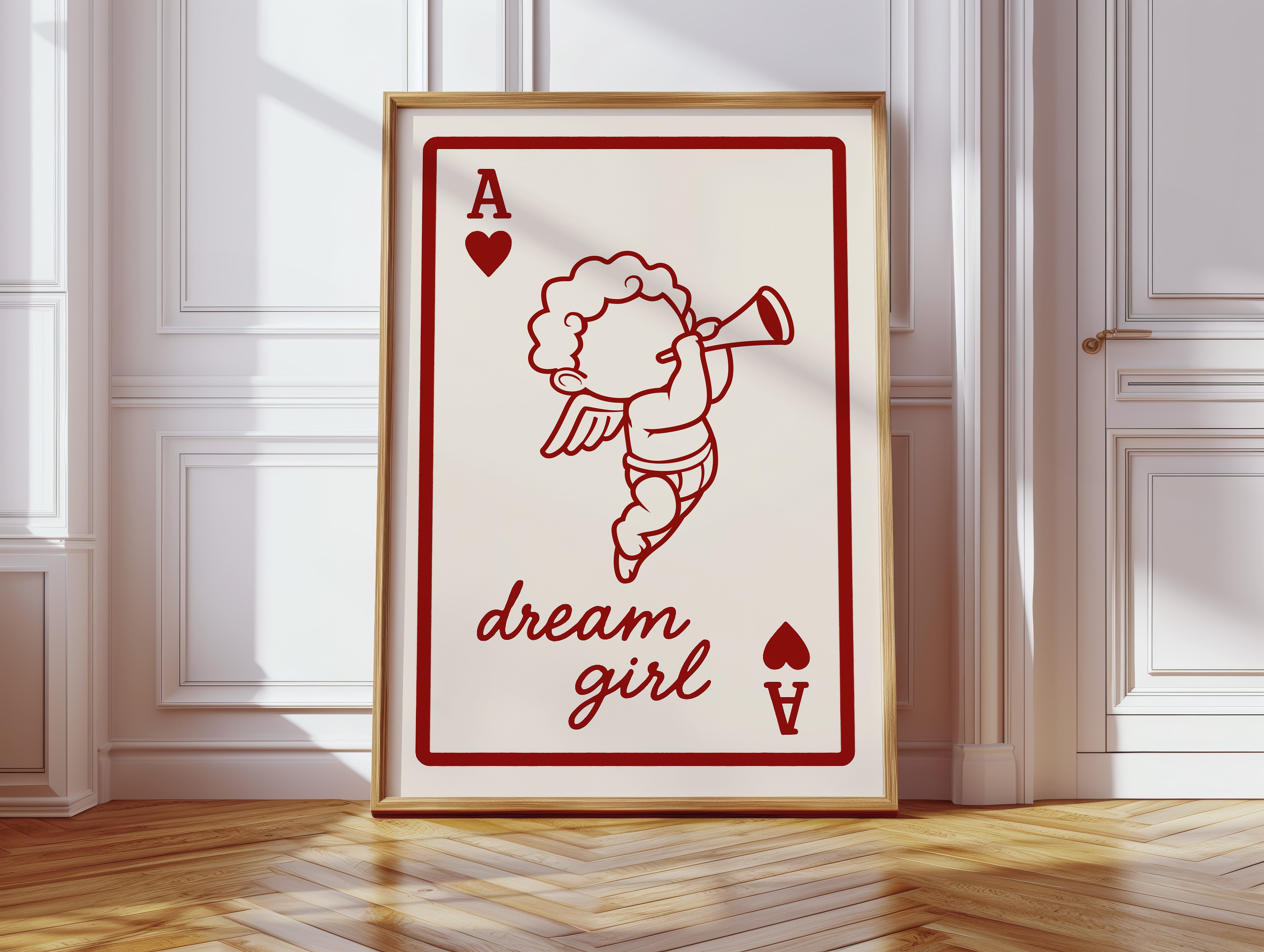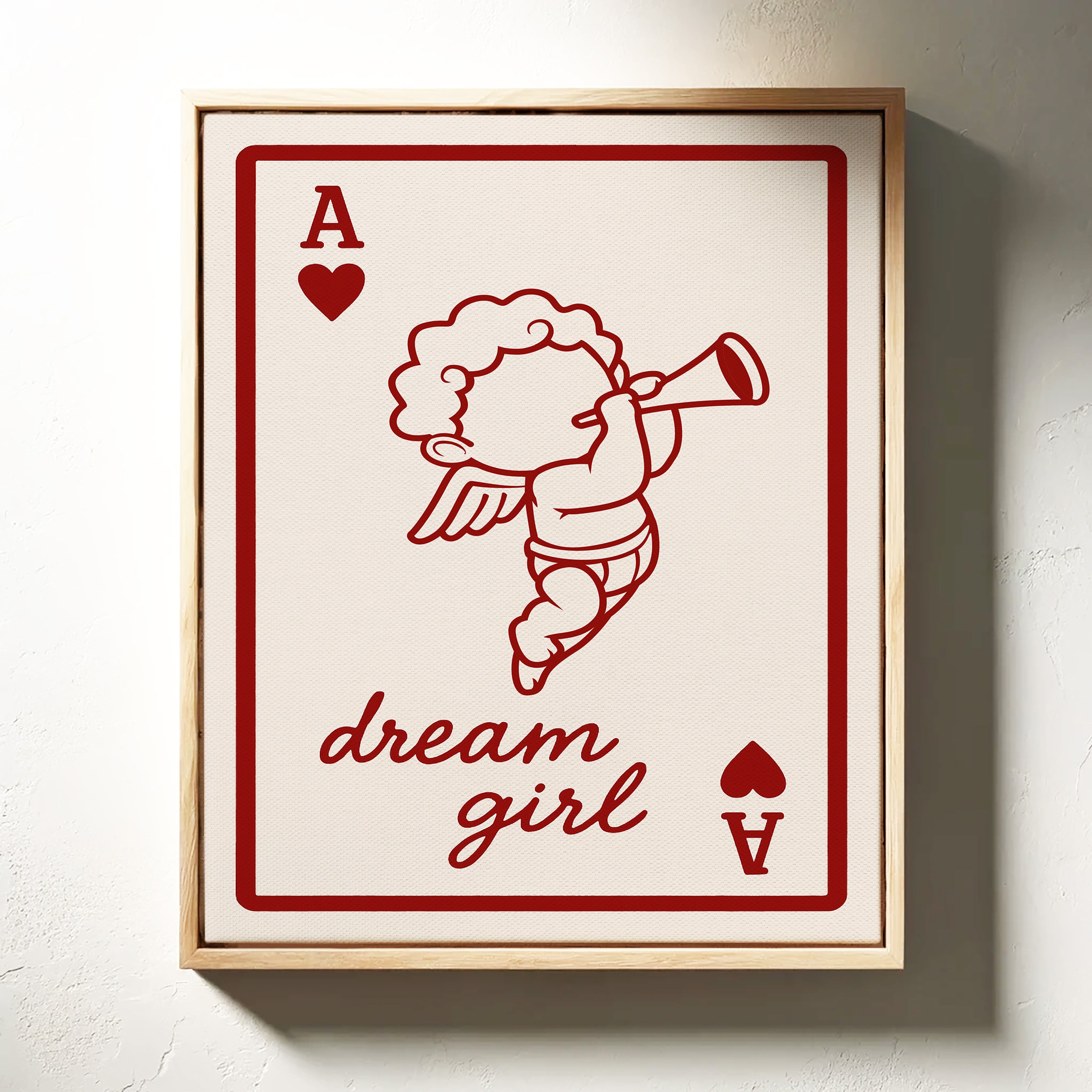 A charming illustration captures the whimsy of childhood innocence, rendered in deep crimson against a soft cream background. The playing card design features a cherubic figure blowing a trumpet, framed by the ace of hearts symbology, creating a delightful blend of classical card imagery and playful art. The cursive text and minimalist line work evoke a sense of vintage Valentine's Day cards while maintaining a contemporary edge. This piece would bring a touch of romantic nostalgia to a nursery, child's room, or any space seeking a blend of classic charm and modern simplicity.