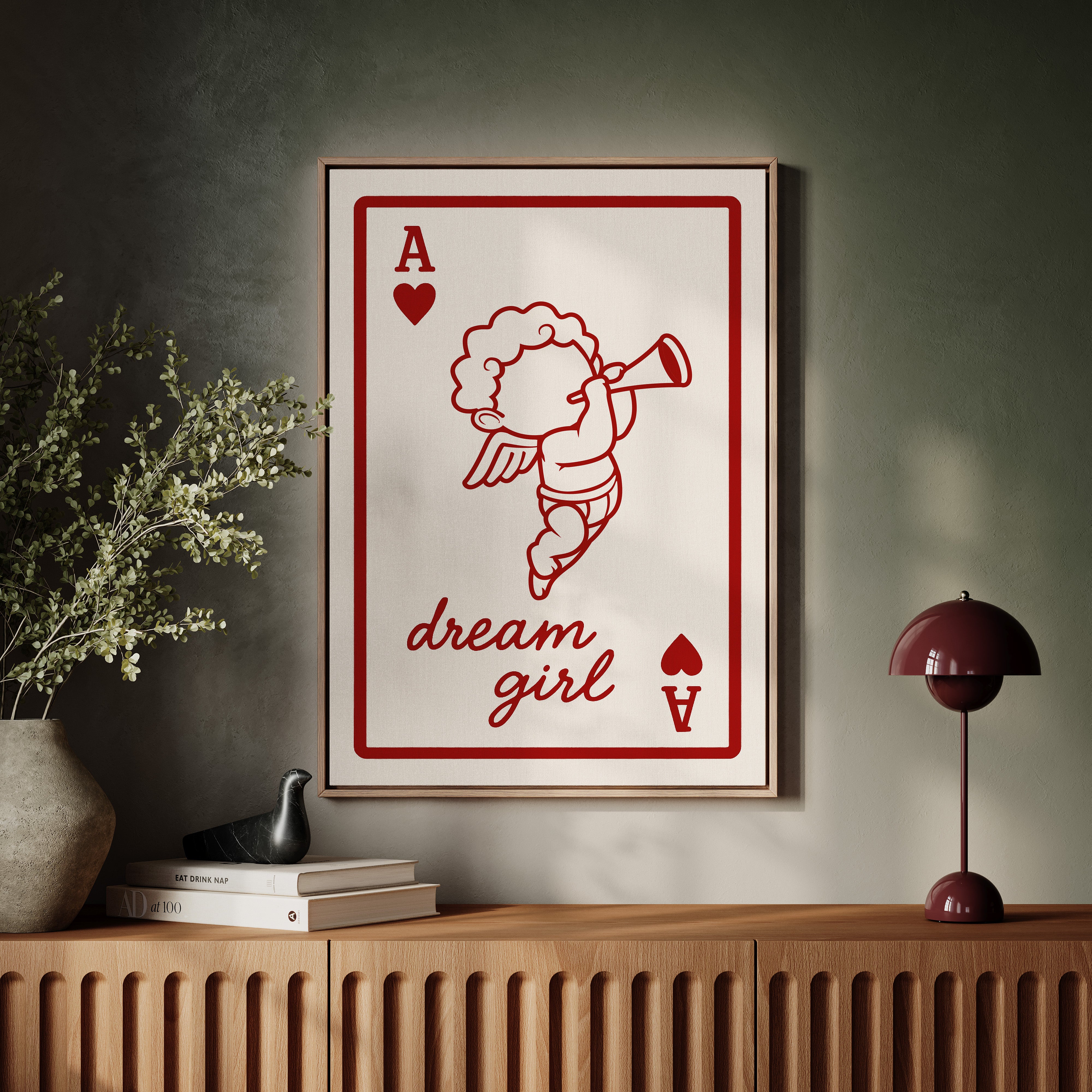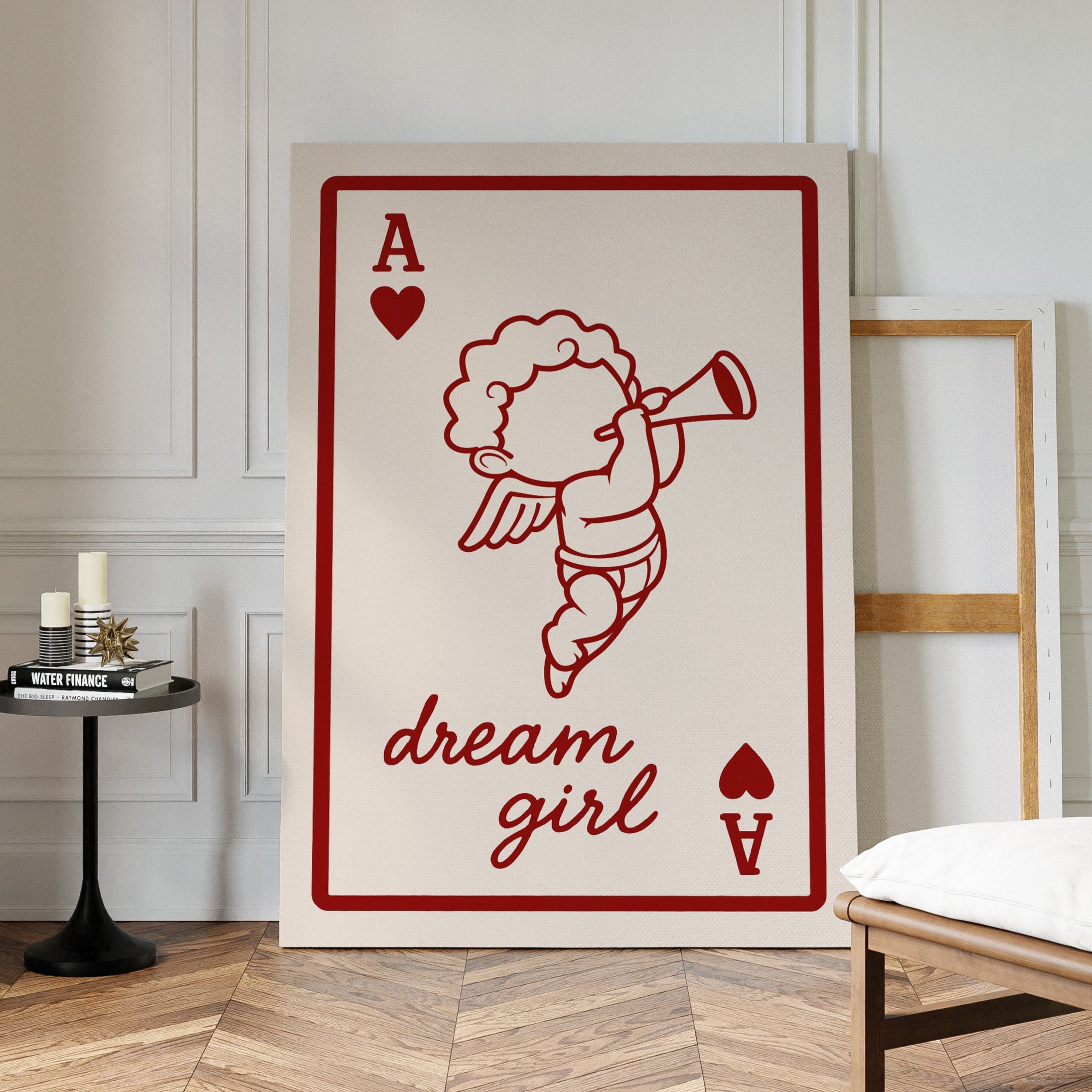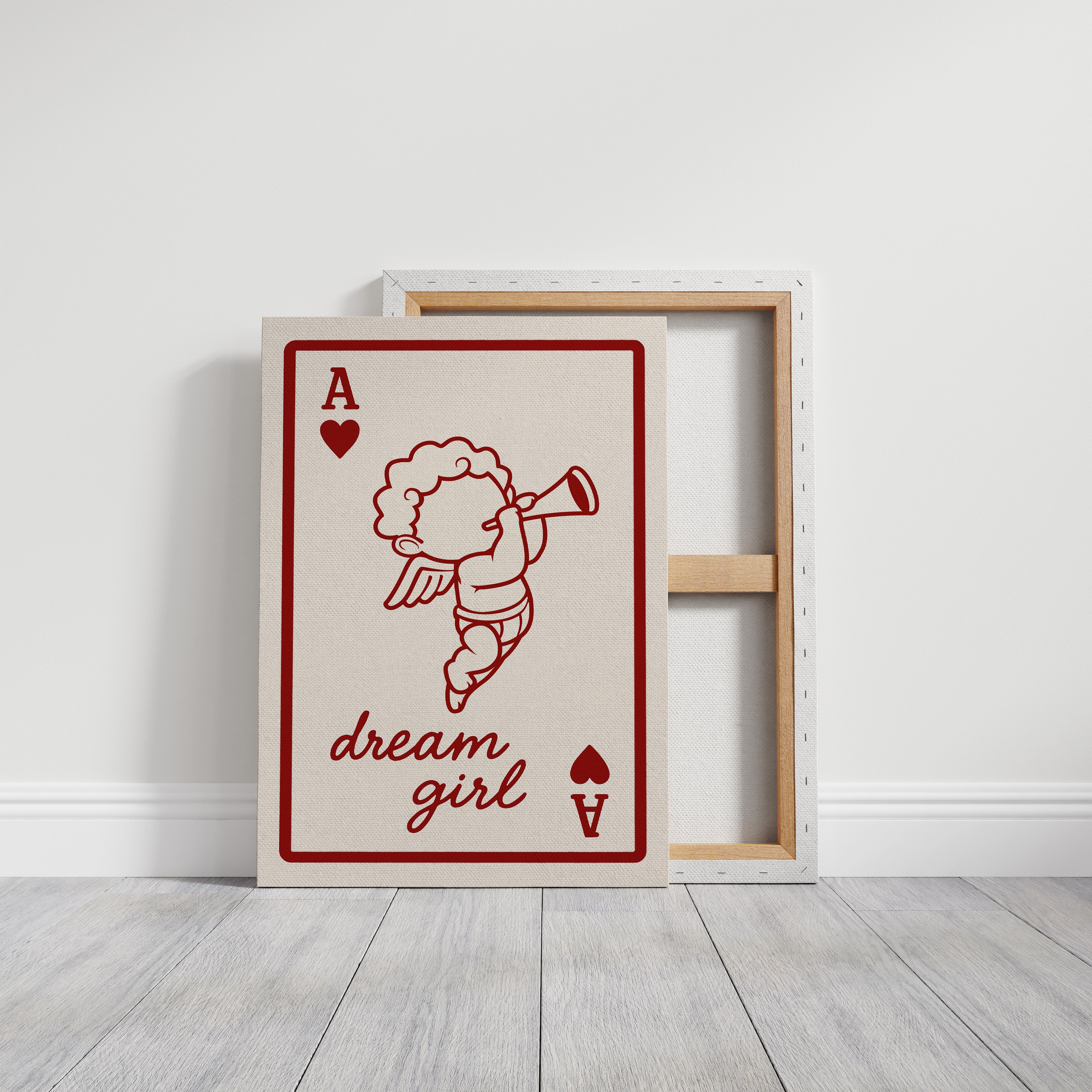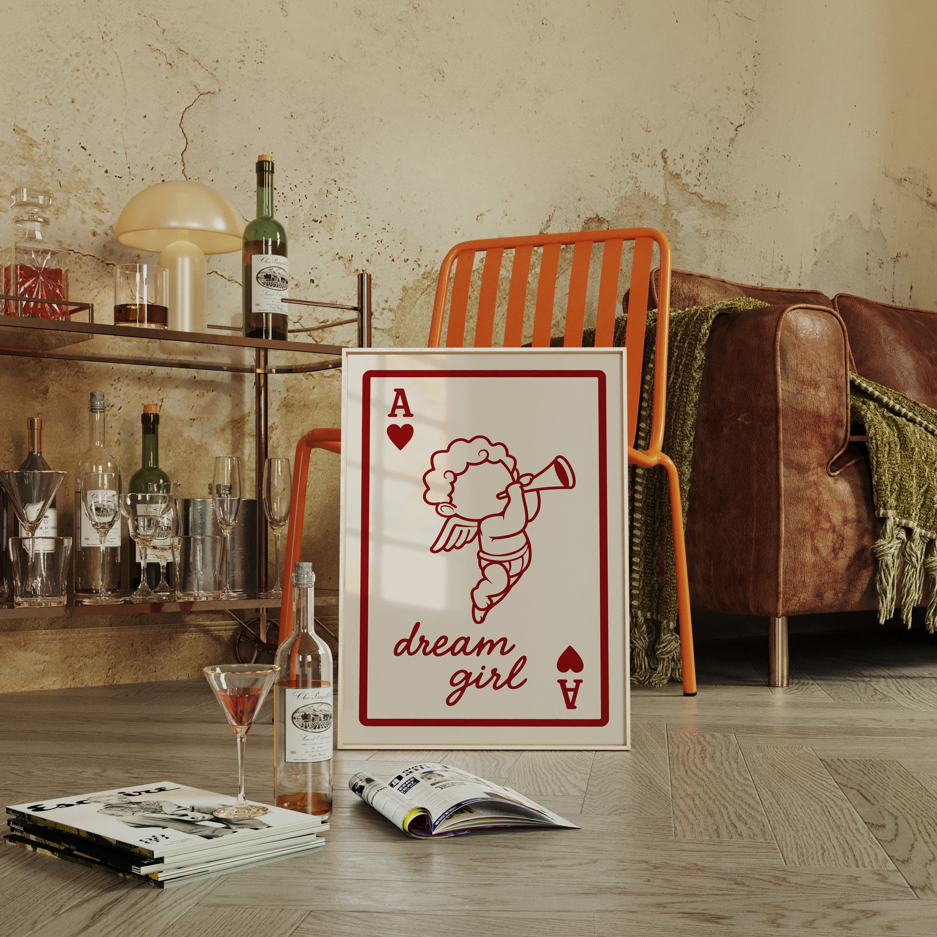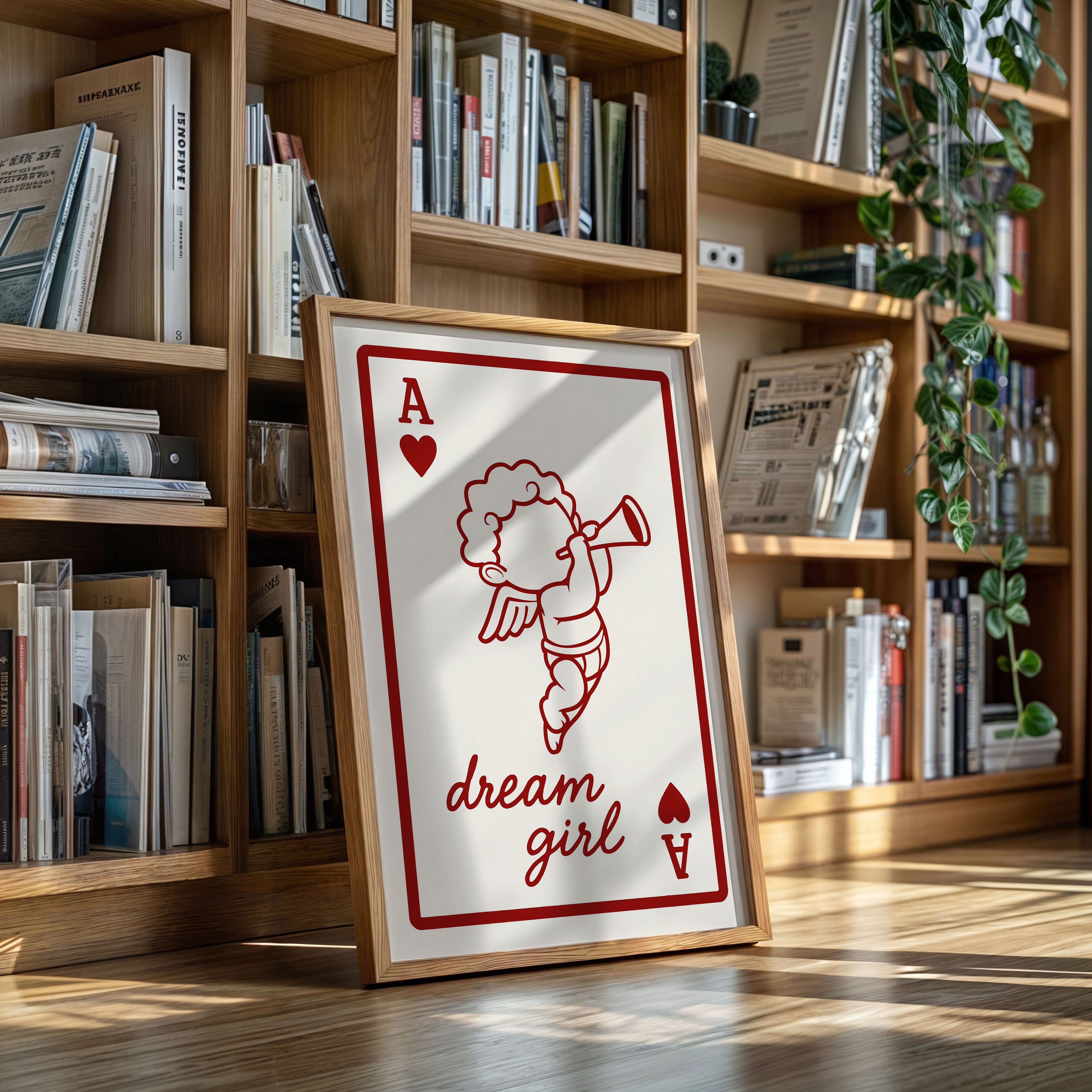 A charming illustration captures the whimsy of childhood innocence, rendered in deep crimson against a soft cream background. The playing card design features a cherubic figure blowing a trumpet, framed by the ace of hearts symbology, creating a delightful blend of classical card imagery and playful art. The cursive text and minimalist line work evoke a sense of vintage Valentine's Day cards while maintaining a contemporary edge. This piece would bring a touch of romantic nostalgia to a nursery, child's room, or any space seeking a blend of classic charm and modern simplicity.
