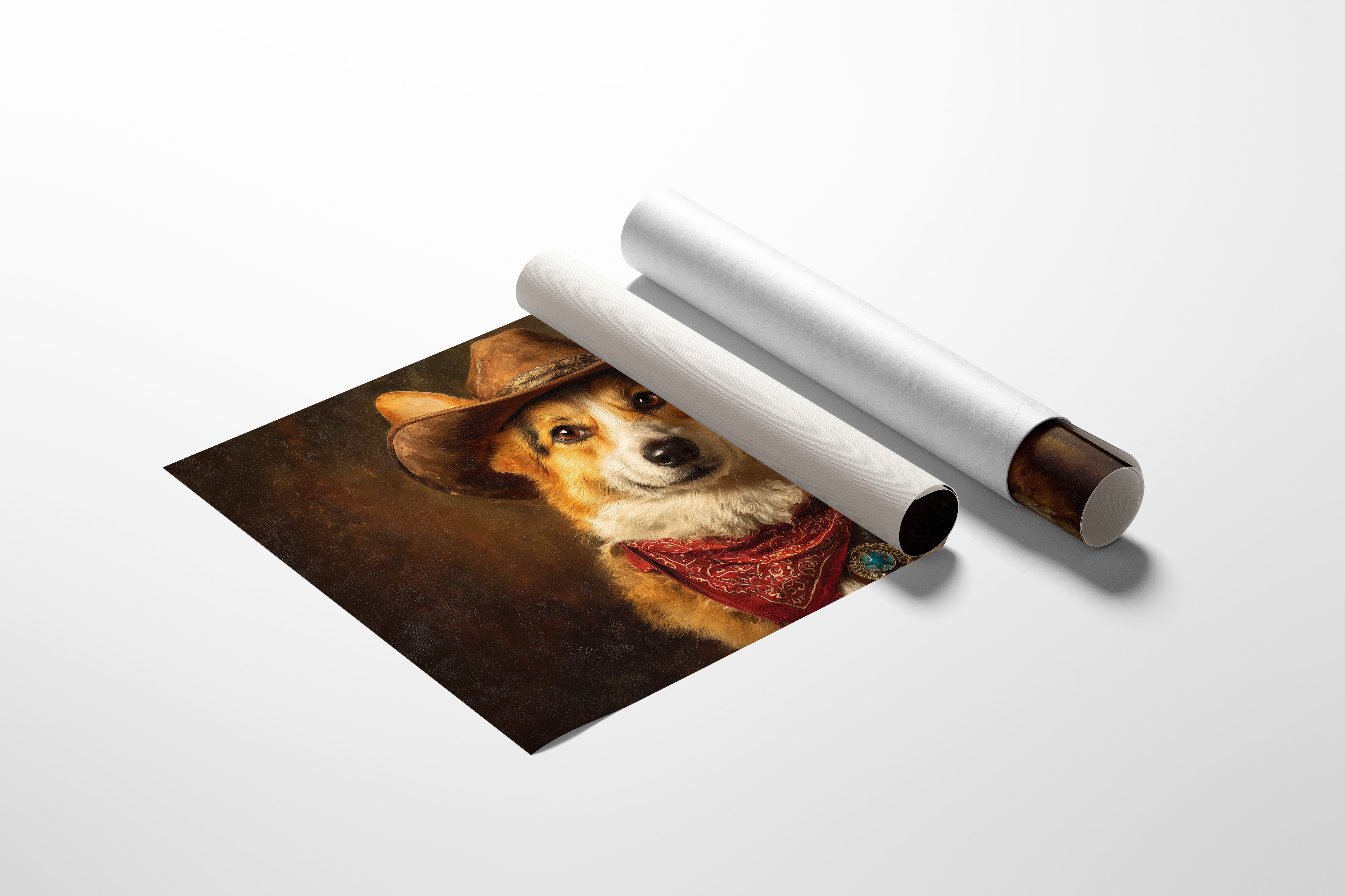 Warm amber eyes meet yours with gentle curiosity, framed by the weathered brim of a cowboy hat. This portrait captures the soulful gaze of a corgi adorned in classic western weara rich leather hat and vibrant red bandana creating a charming contrast against rustic copper and cream fur. The masterful brushwork and deep sepia background give this piece a timeless, nostalgic quality reminiscent of traditional portrait paintings. This statement piece brings personality and warmth to living rooms, dens, or any space needing a touch of whimsy paired with sophisticated execution.