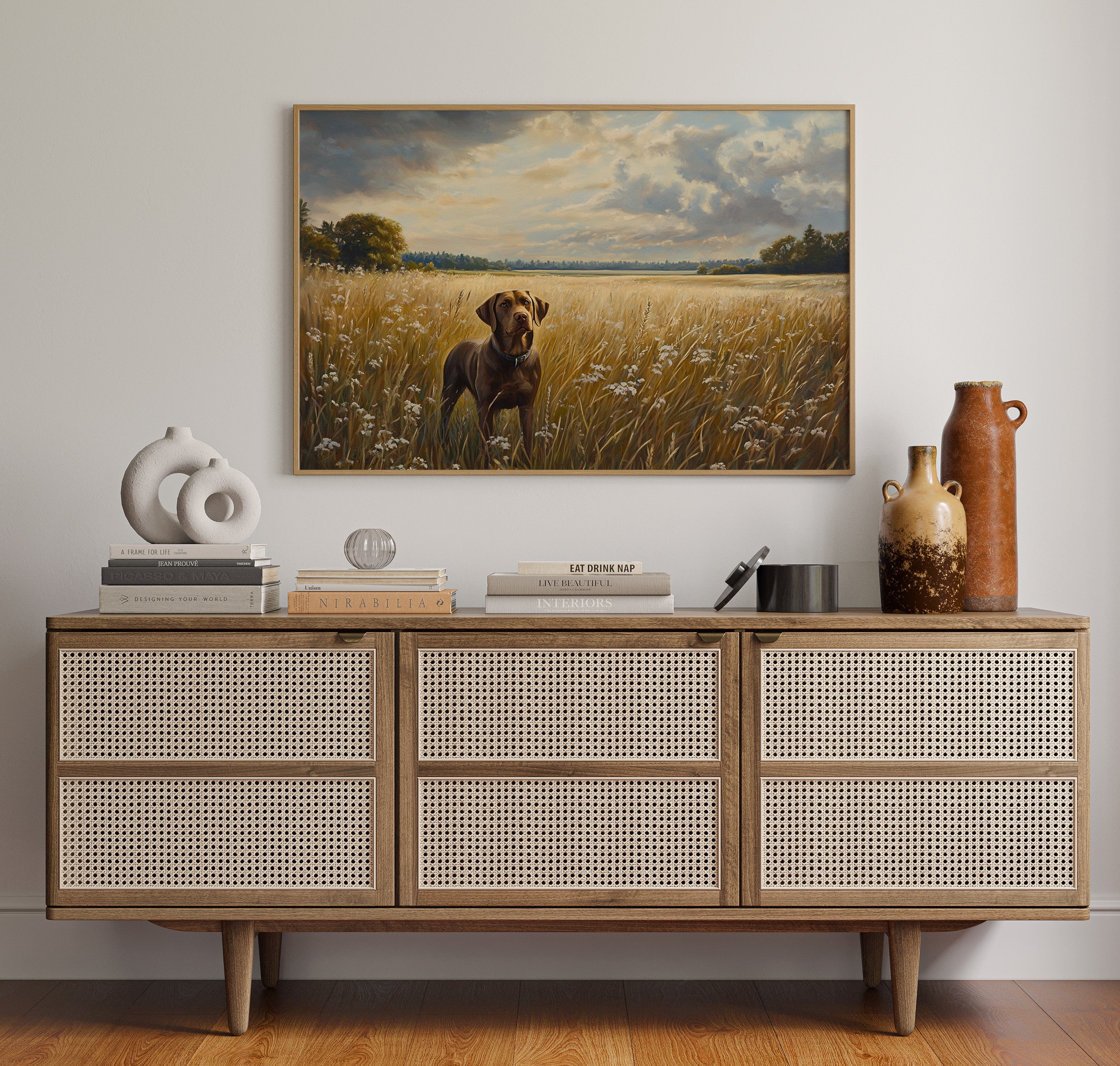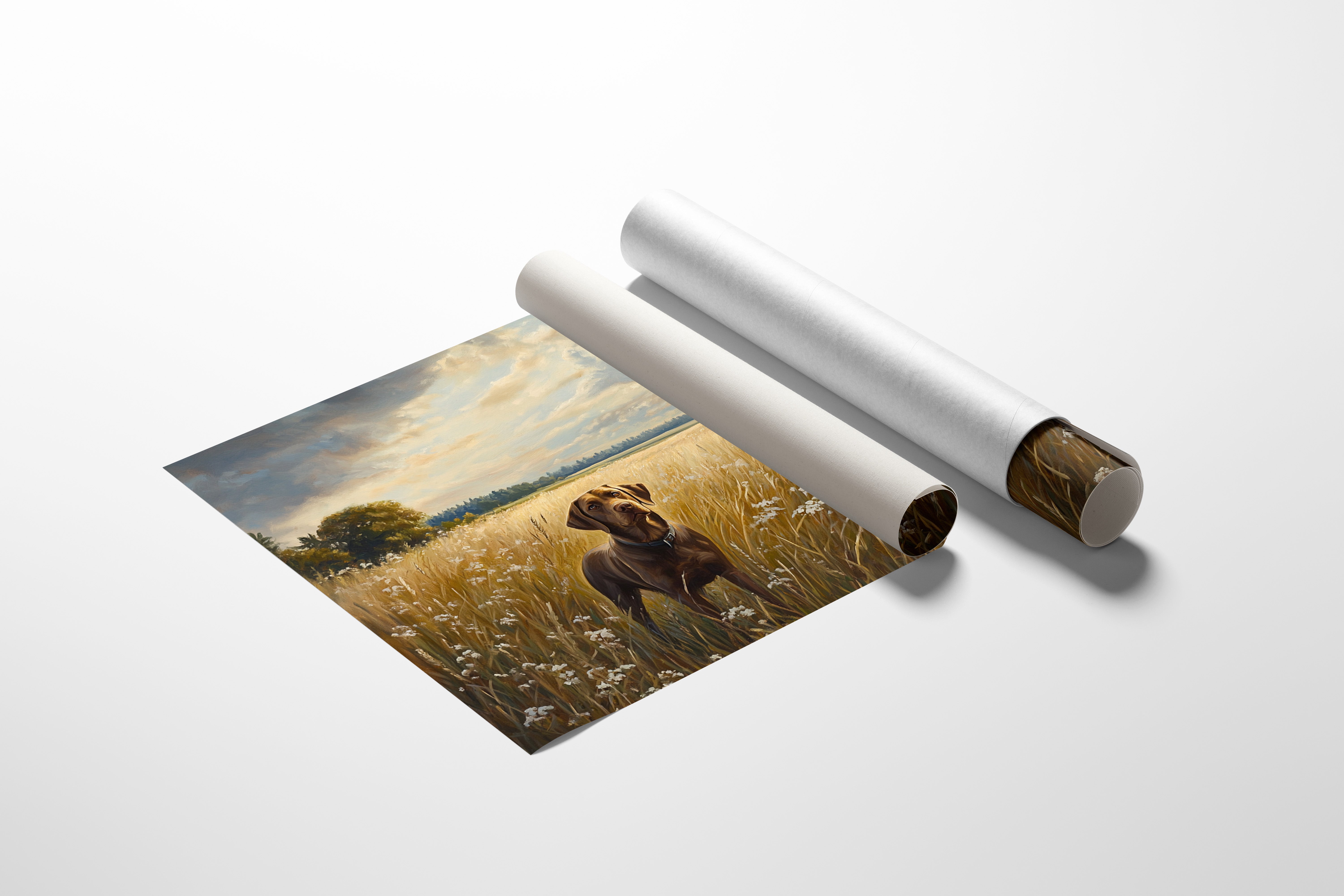 Golden wheat sways beneath clouds painted in amber and pearl, as a chocolate Labrador stands alert in nature's embrace. The dog's noble stance creates a striking silhouette against the pastoral landscape, where delicate white wildflowers dance among sun-kissed grasses. Rich earth tones blend with the warm afternoon light, while distant trees frame the scene in deep emerald shadows. This heartwarming portrait captures the special bond between companion and countryside, perfect for bringing natural warmth to a living room or study where stories of loyalty and adventure are cherished.