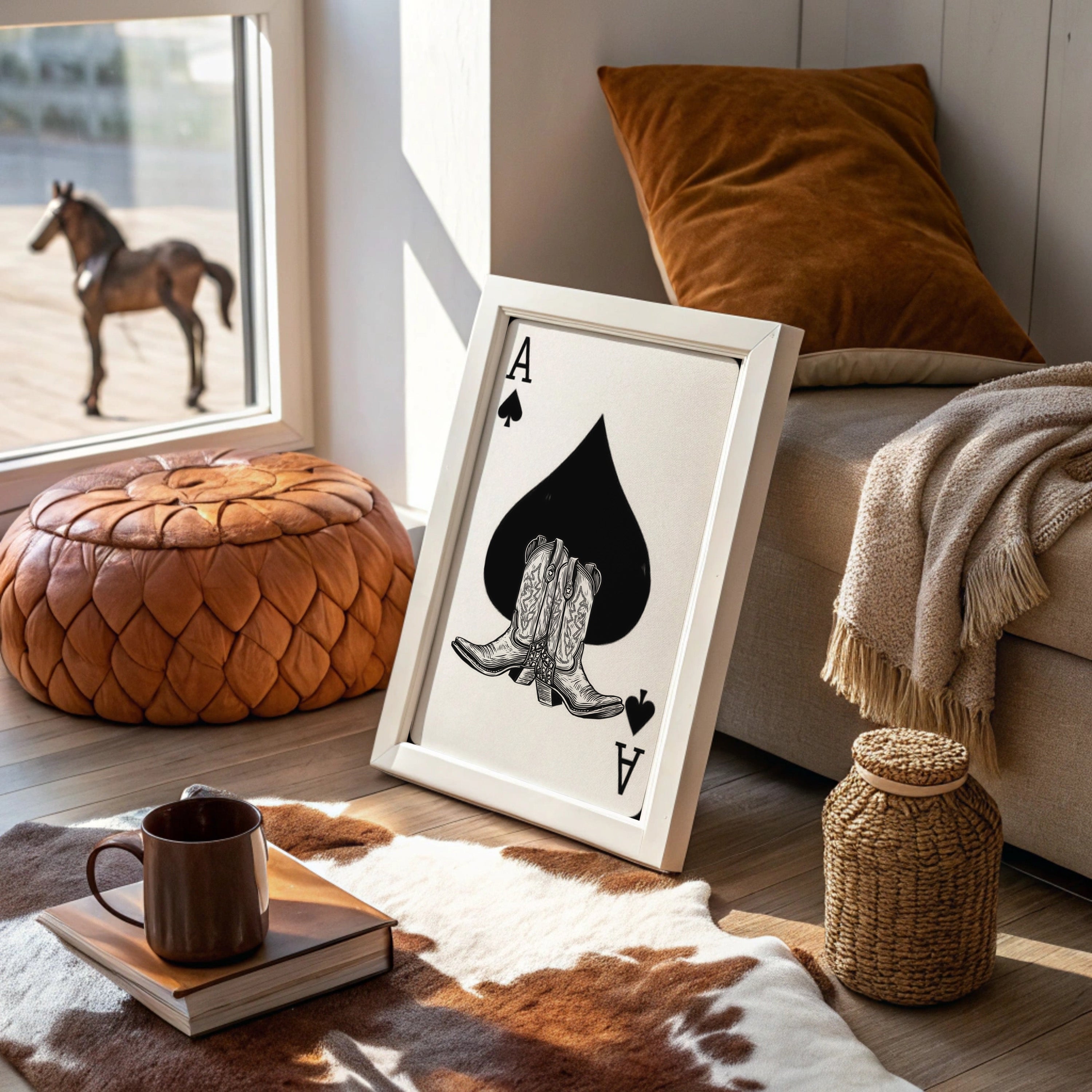 A striking monochromatic composition merges classic playing card design with iconic Western style. The detailed illustration of ornate cowboy boots stands boldly against the dramatic black spade, creating a powerful visual metaphor where gambling meets frontier spirit. The crisp contrast between black and white emphasizes the intricate stitching and leather work of the boots, while the traditional card elements frame the scene with timeless elegance. Perfect for a game room, modern ranch house, or any space seeking to blend contemporary edge with Western charm.