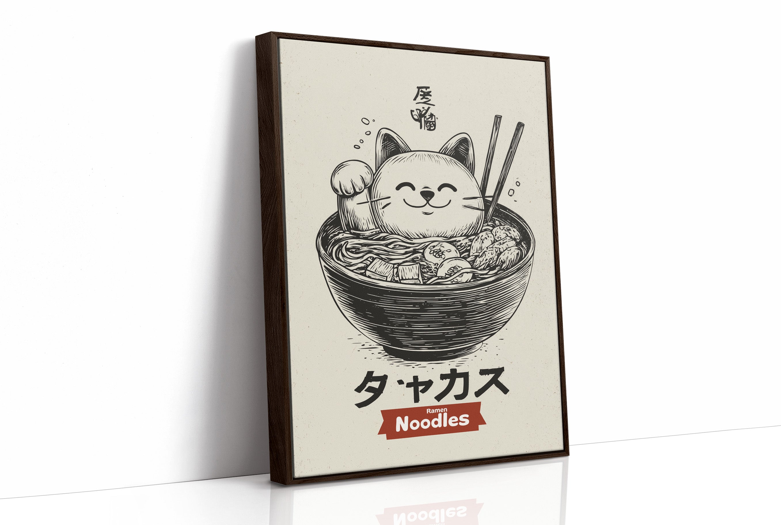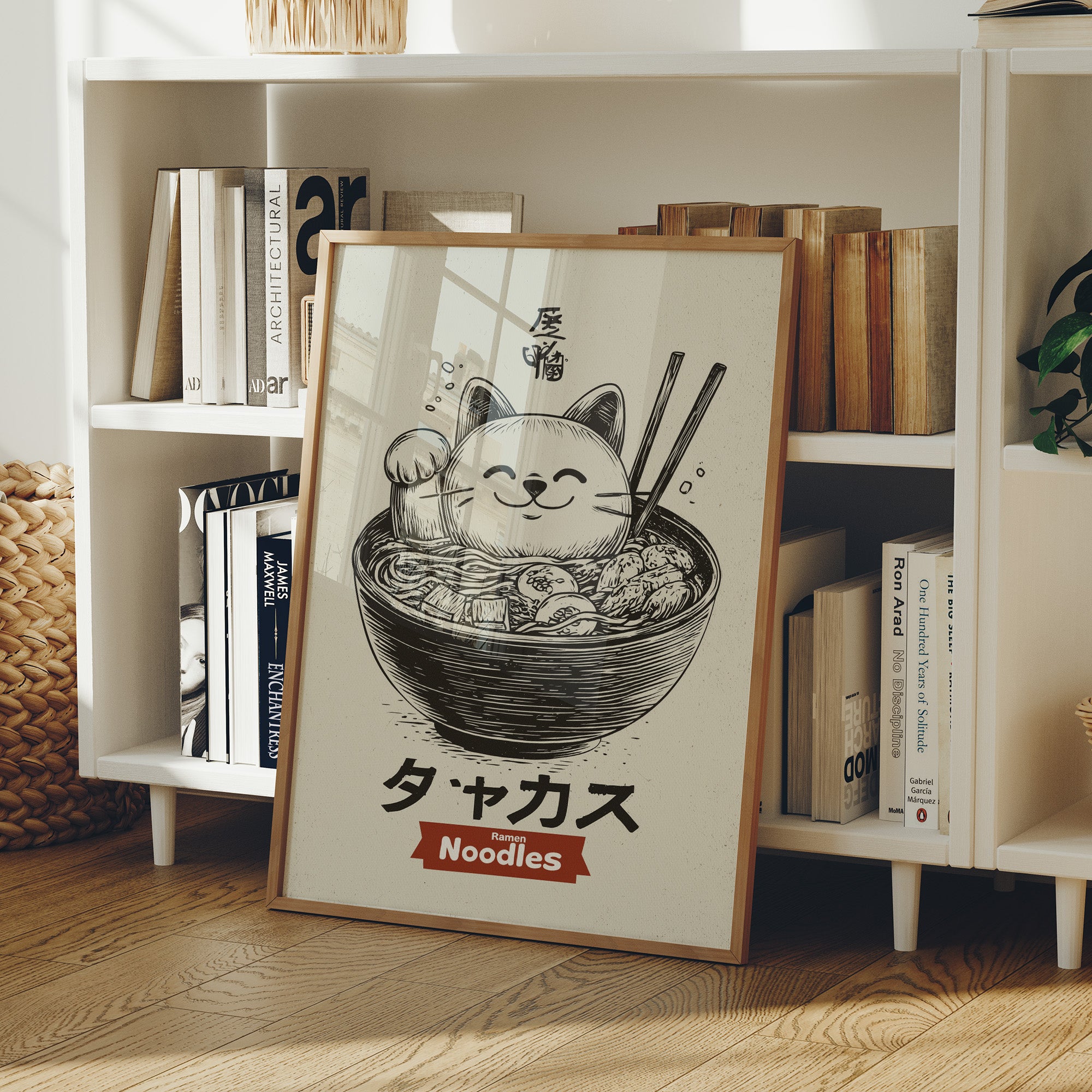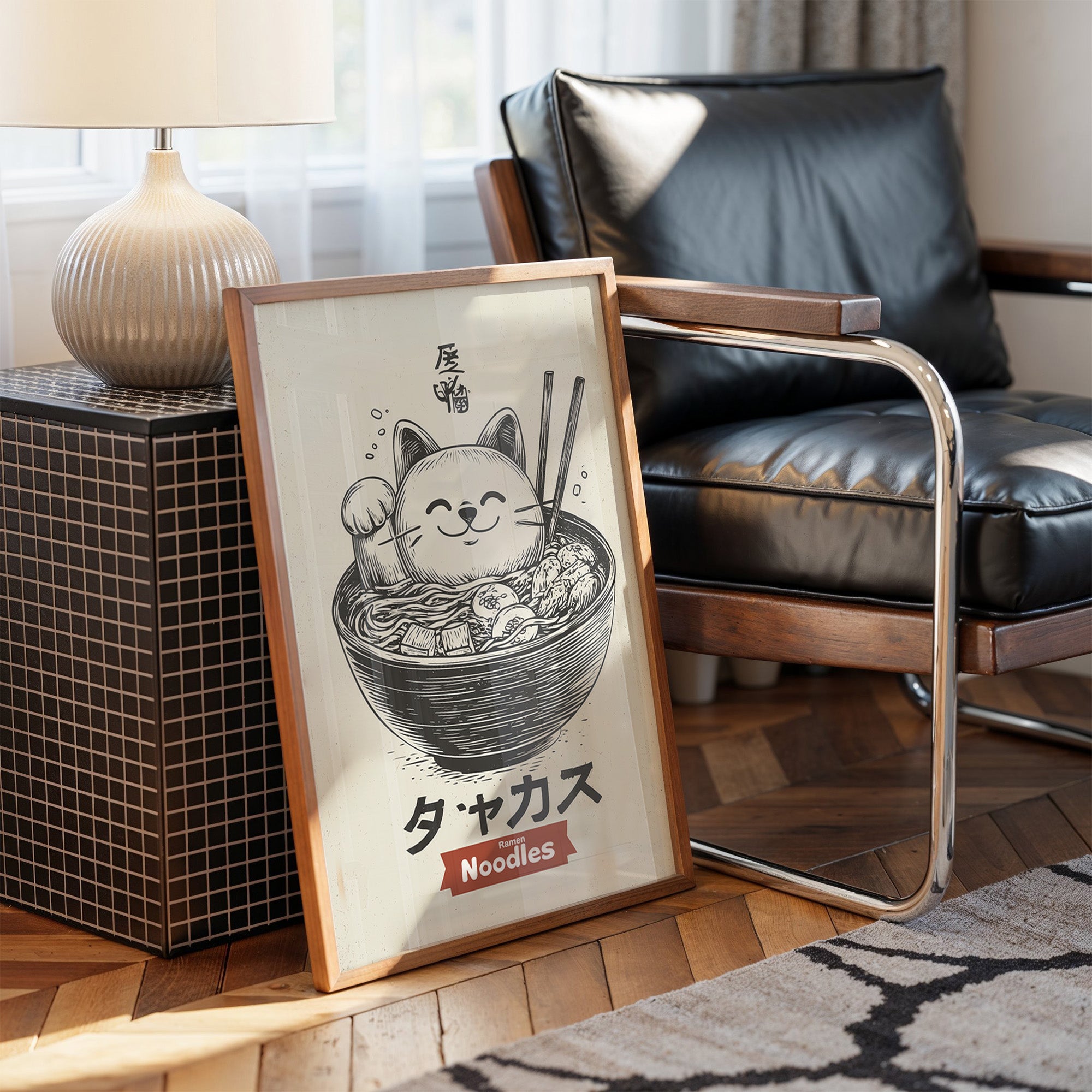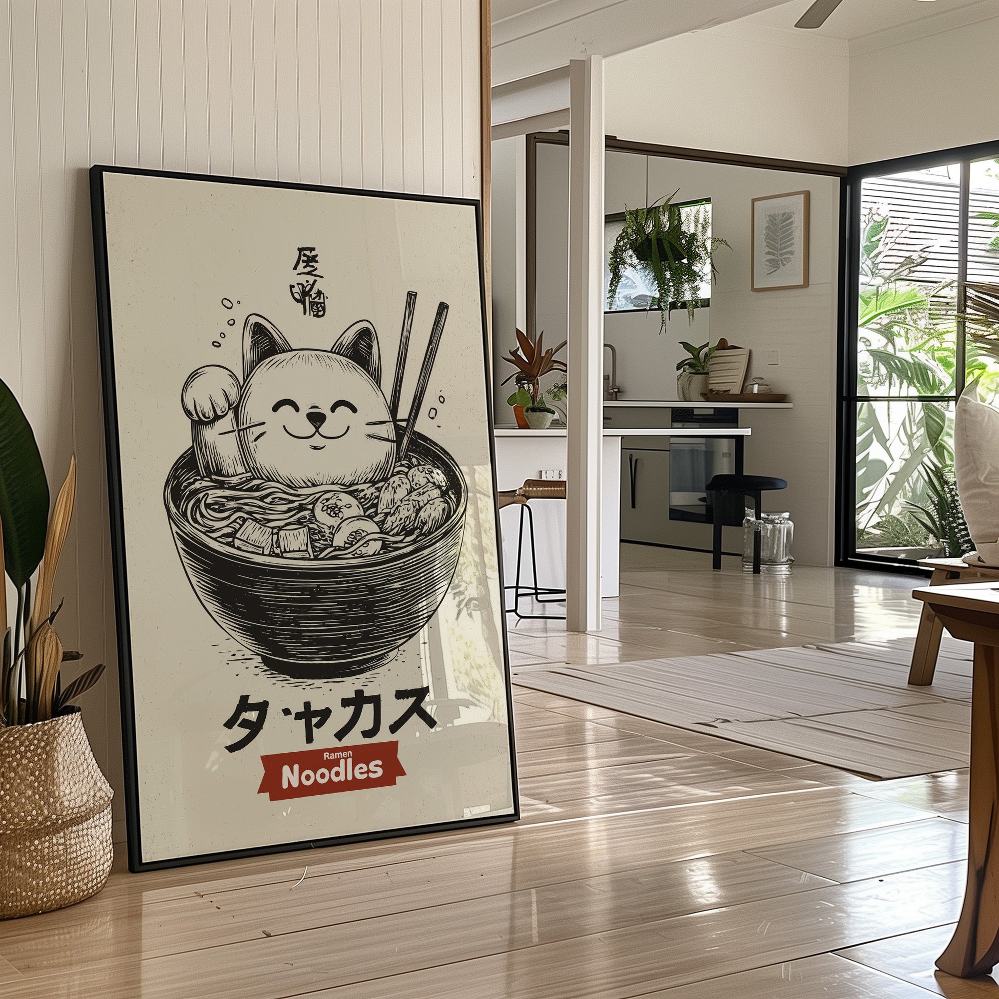 A charming Japanese-inspired illustration brings whimsy to this sophisticated bar corner. The playful lucky cat floating in a bowl of ramen creates a delightful contrast against the carefully curated collection of premium spirits below. Natural light streams through industrial windows, casting warm shadows across wooden floors while potted plants add organic touches to this urban oasis. Perfect for a modern dining room or trendy restaurant space where Asian fusion meets craft cocktail culture.