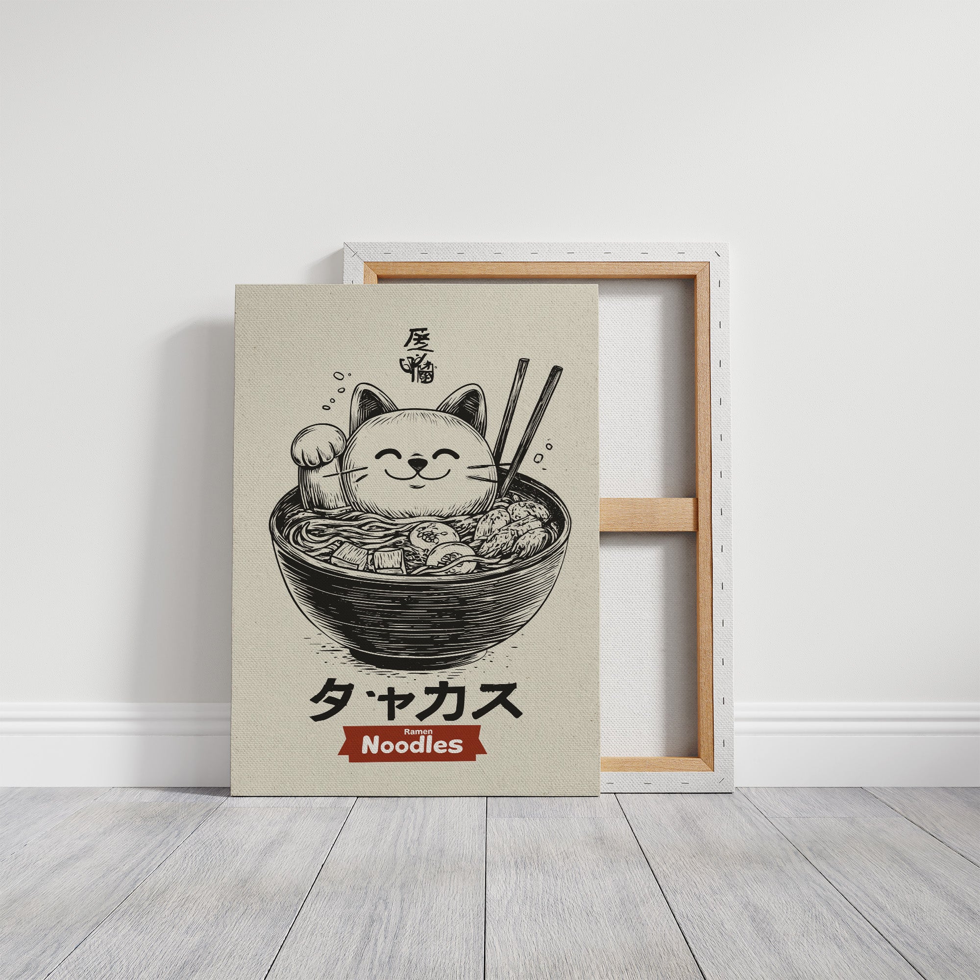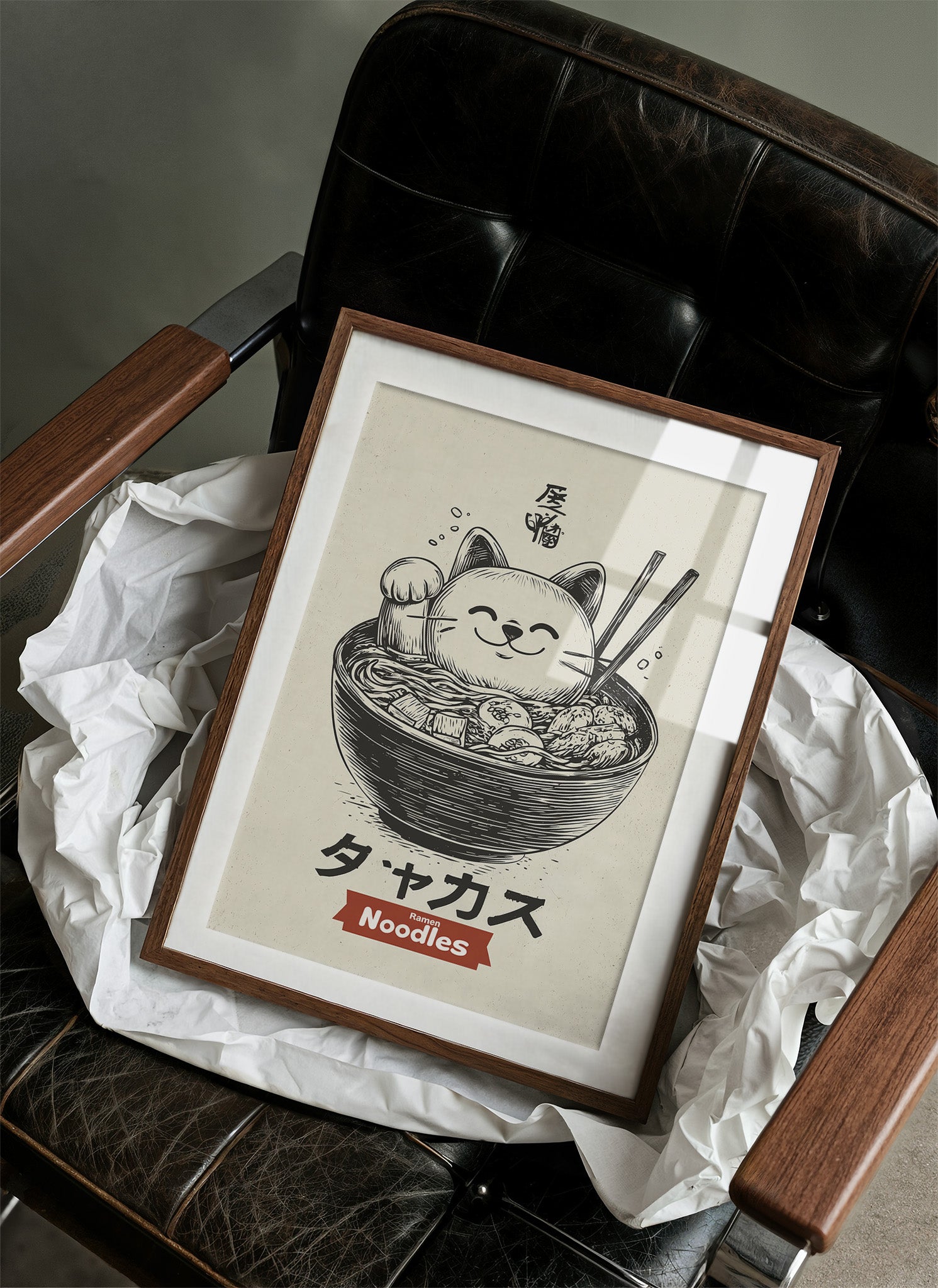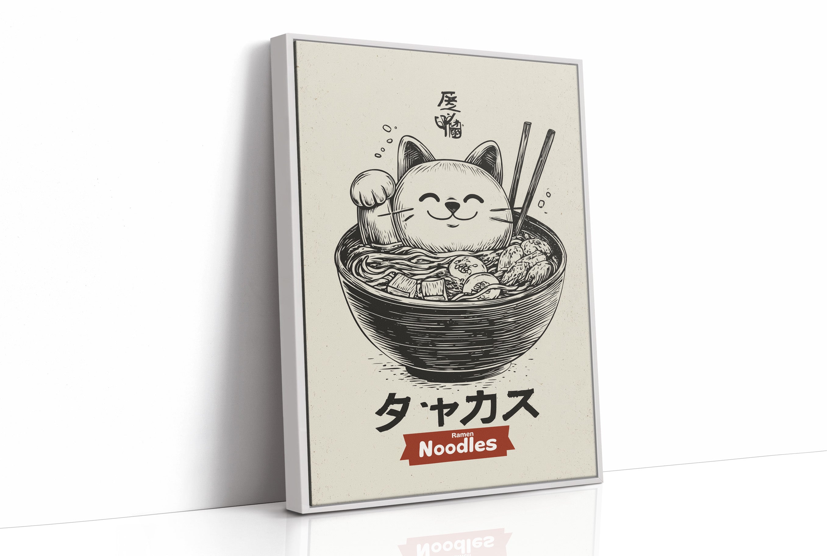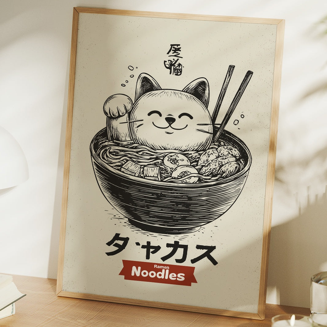A charming Japanese-inspired illustration brings whimsy to this sophisticated bar corner. The playful lucky cat floating in a bowl of ramen creates a delightful contrast against the carefully curated collection of premium spirits below. Natural light streams through industrial windows, casting warm shadows across wooden floors while potted plants add organic touches to this urban oasis. Perfect for a modern dining room or trendy restaurant space where Asian fusion meets craft cocktail culture.