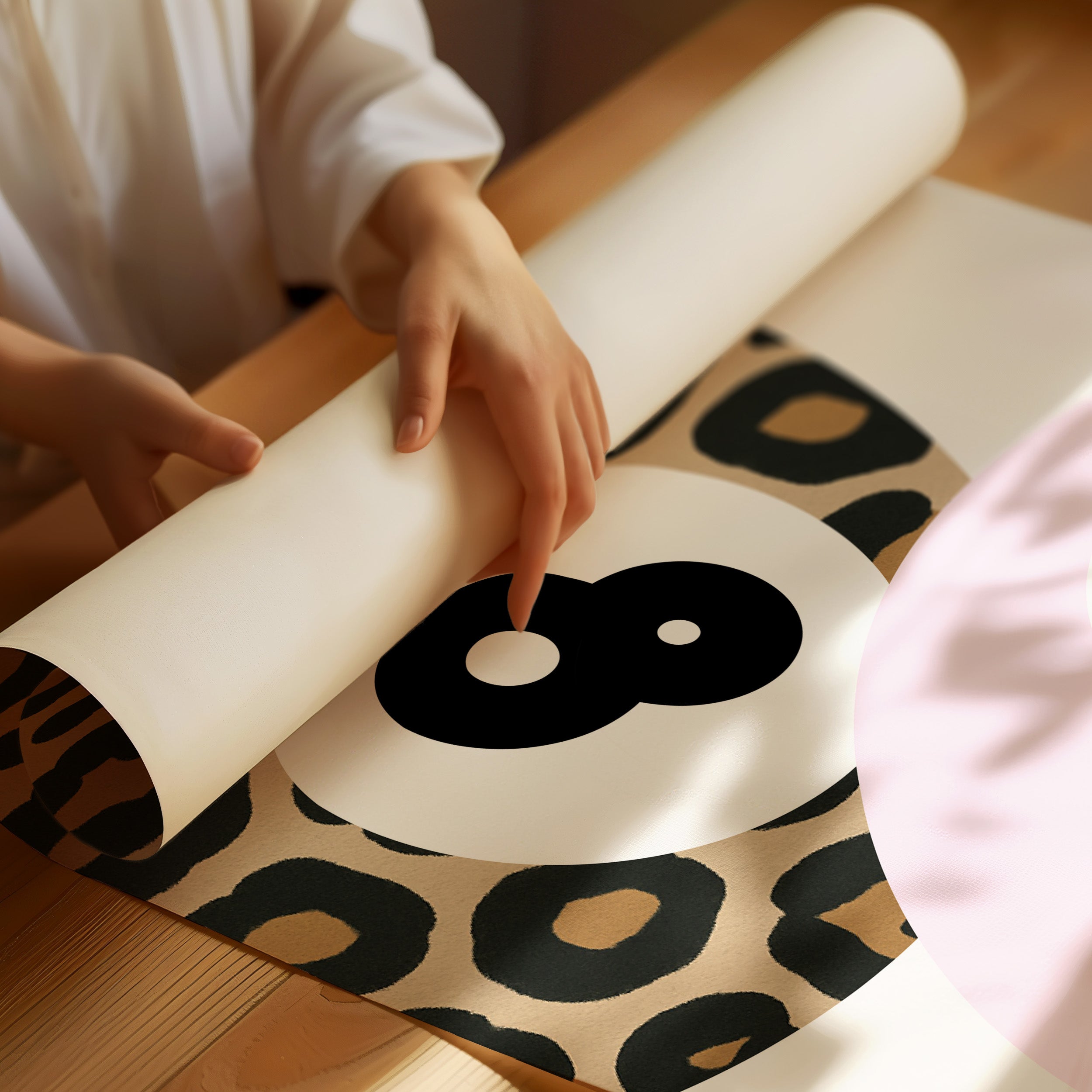 Playful geometry meets untamed pattern in this bold contemporary composition. A soft pink circle and leopard-printed curve create a harmonious dance with stark black figure eights, offering a perfect balance of wild and refined. The minimalist design speaks through confident shapes and a sophisticated palette of blush pink, tan, and deep black against clean white space. This statement piece brings personality to modern spaces, ideal for a fashion-forward home office or a chic bedroom where its mix of feminine and fierce can take center stage.