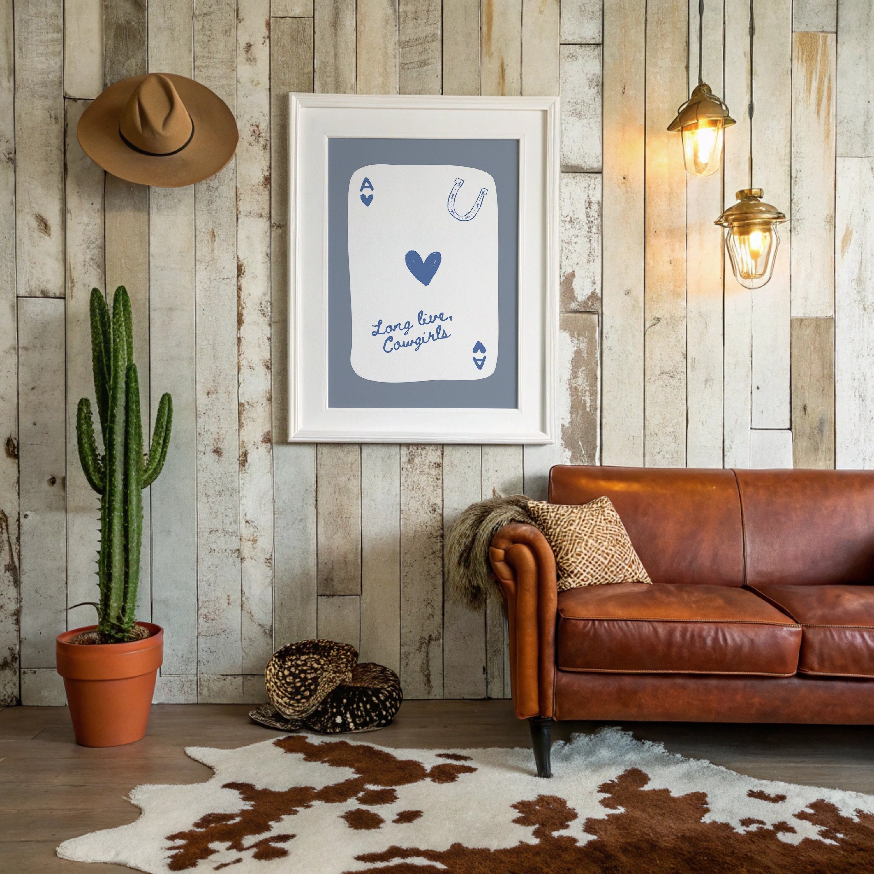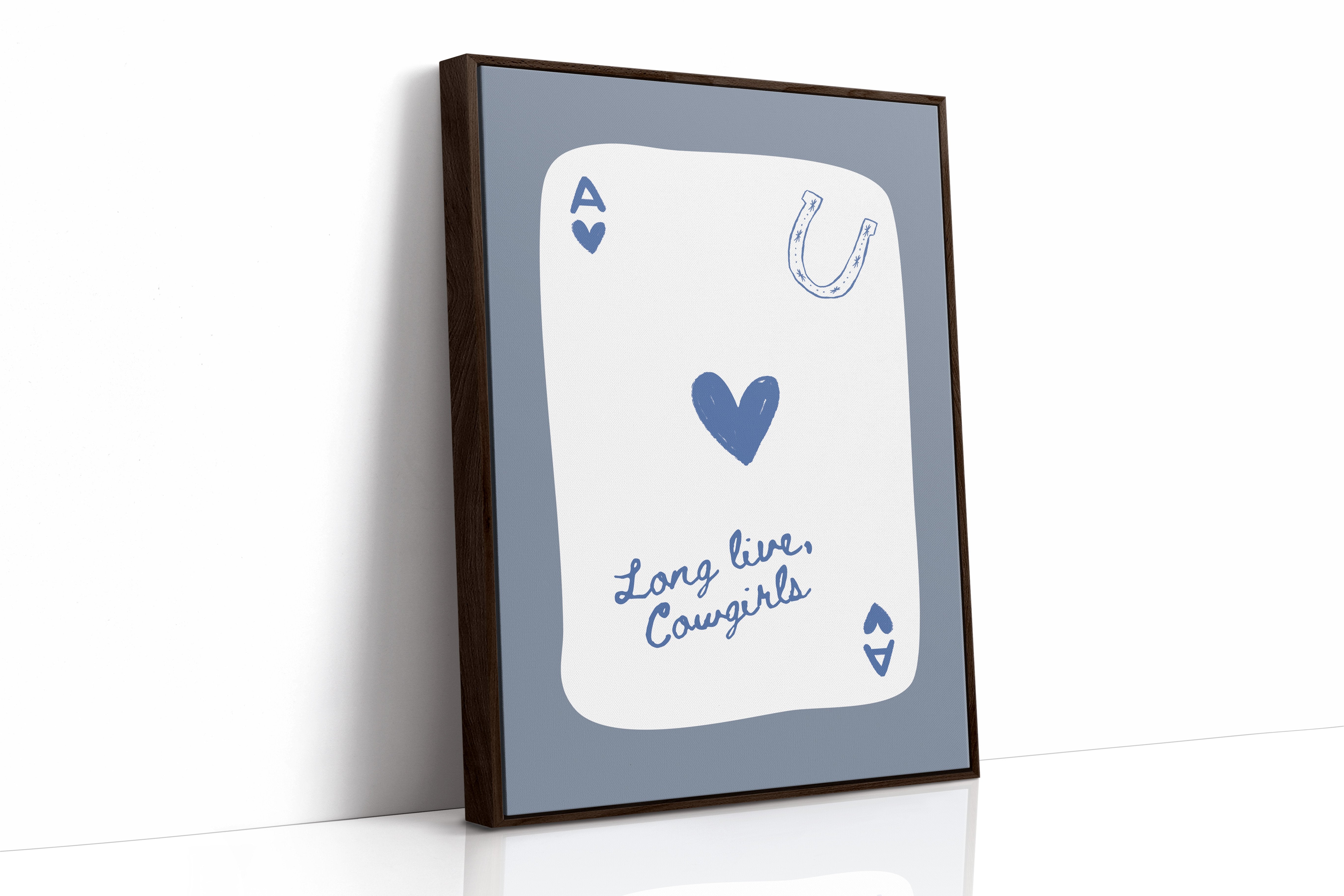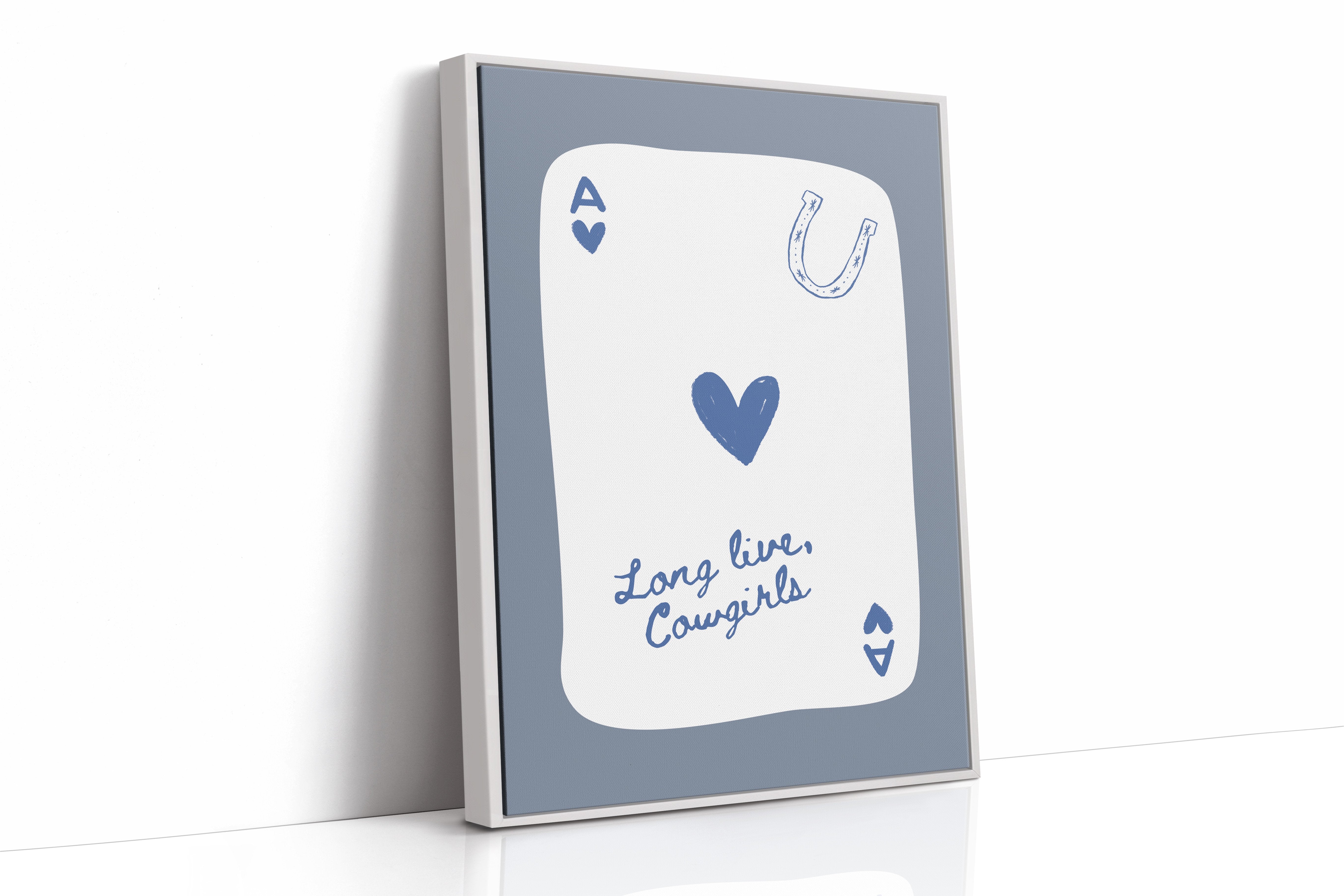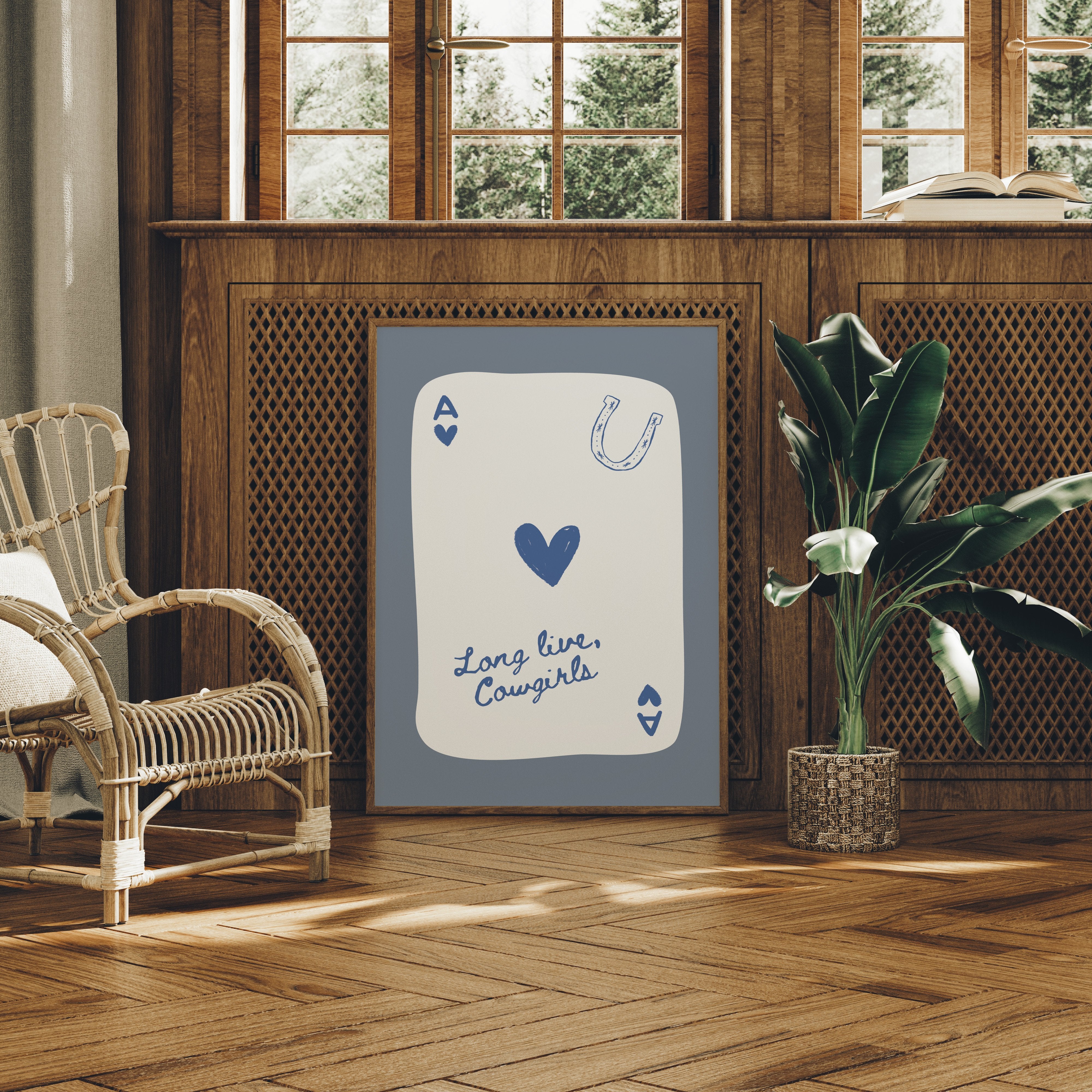 A gentle reminder of fortune dealt in cornflower blue strokes against crisp white. The playful illustration transforms a classic ace of hearts into a cowgirl's talisman, with a horseshoe promising good luck and a hand-drawn script that celebrates frontier spirit. The minimalist design balances whimsy and sophistication with its thoughtful composition and soothing color palette. This piece brings a touch of western charm to contemporary spaces, perfect for adding character to a home office, reading nook, or anywhere that could use a reminder of resilience with a dash of luck.