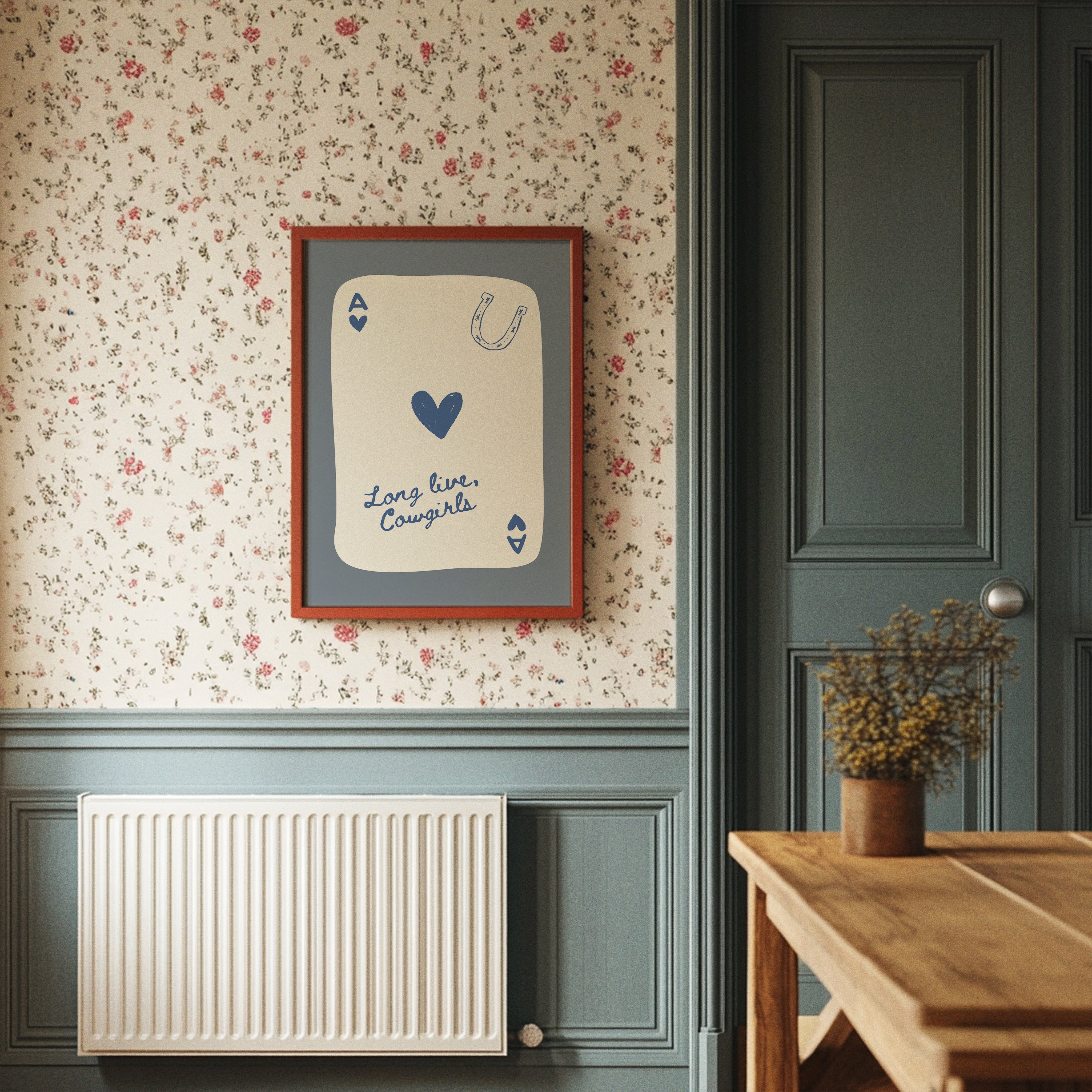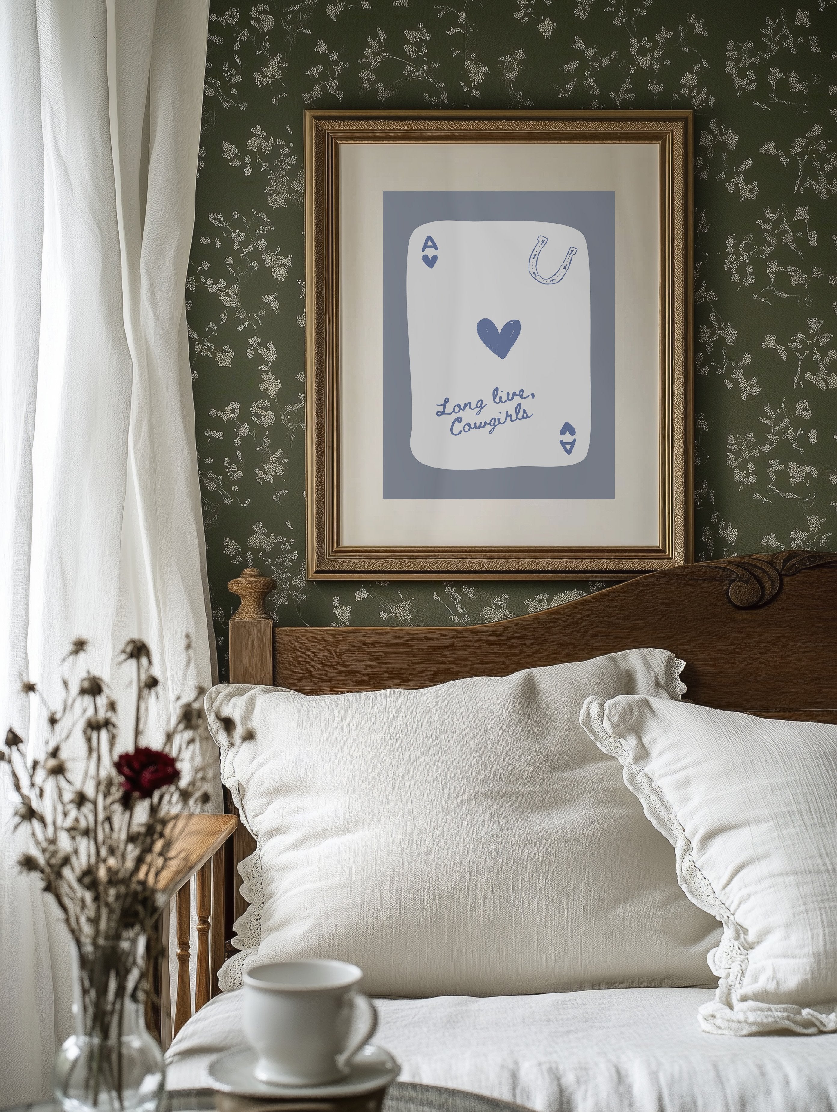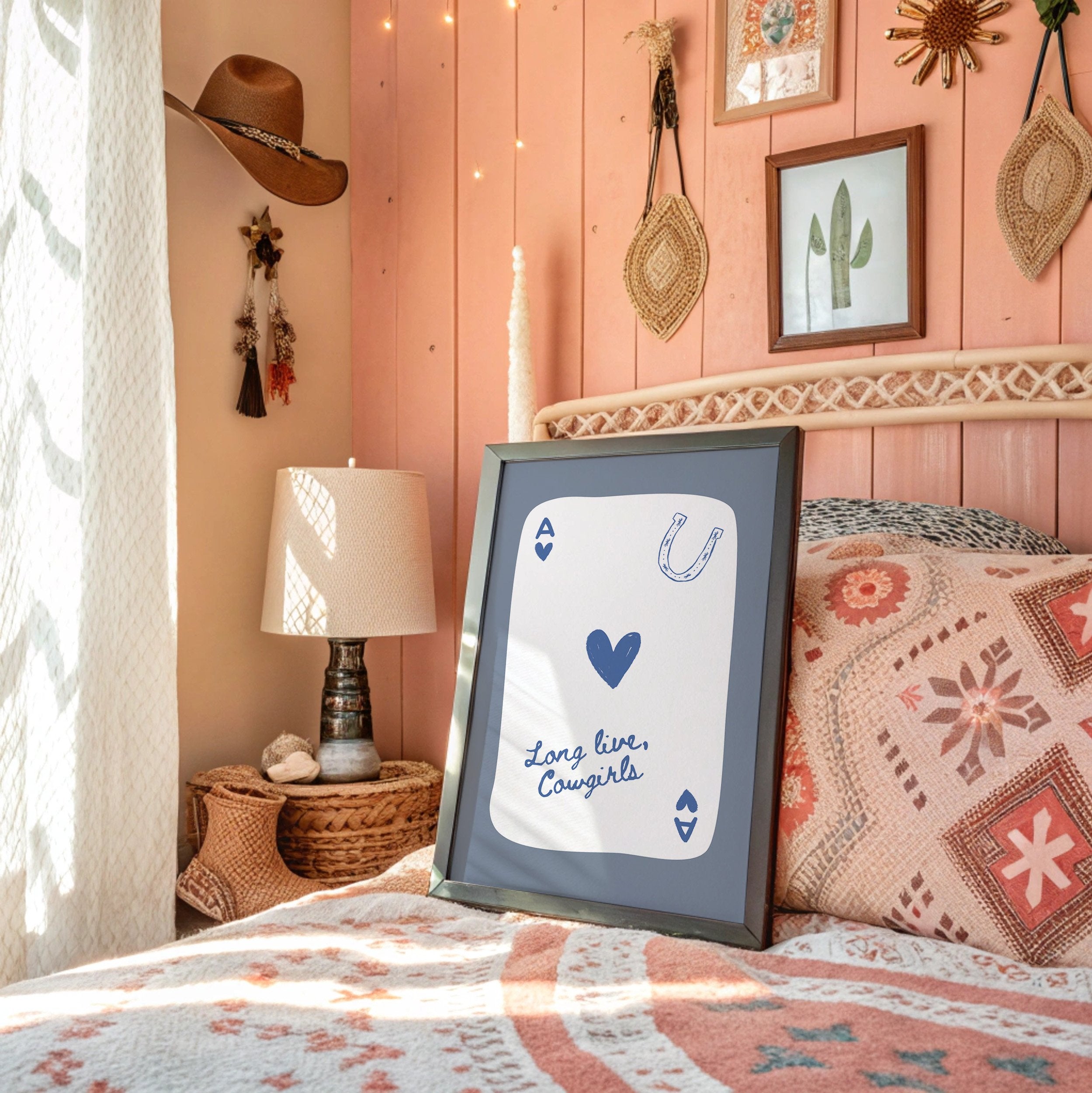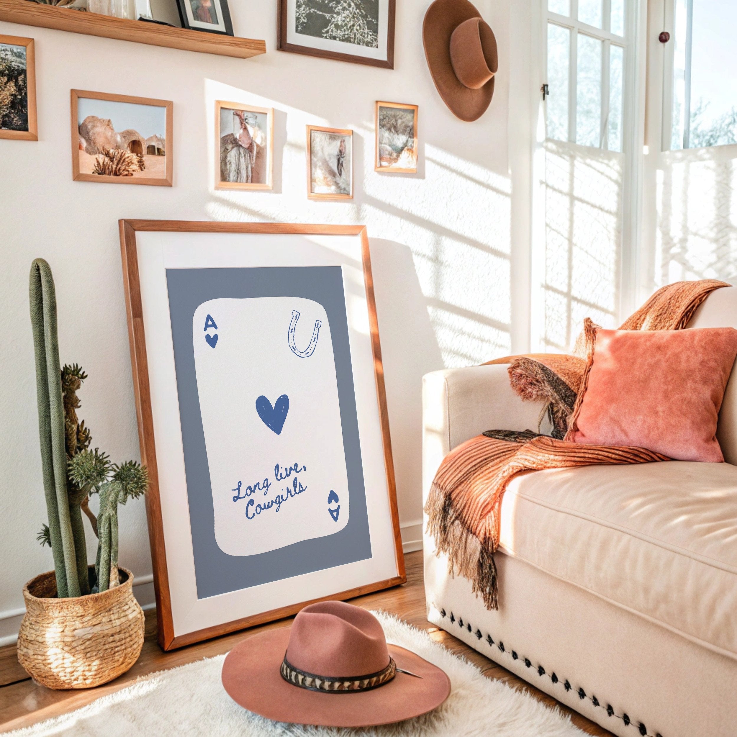 A gentle reminder of fortune dealt in cornflower blue strokes against crisp white. The playful illustration transforms a classic ace of hearts into a cowgirl's talisman, with a horseshoe promising good luck and a hand-drawn script that celebrates frontier spirit. The minimalist design balances whimsy and sophistication with its thoughtful composition and soothing color palette. This piece brings a touch of western charm to contemporary spaces, perfect for adding character to a home office, reading nook, or anywhere that could use a reminder of resilience with a dash of luck.