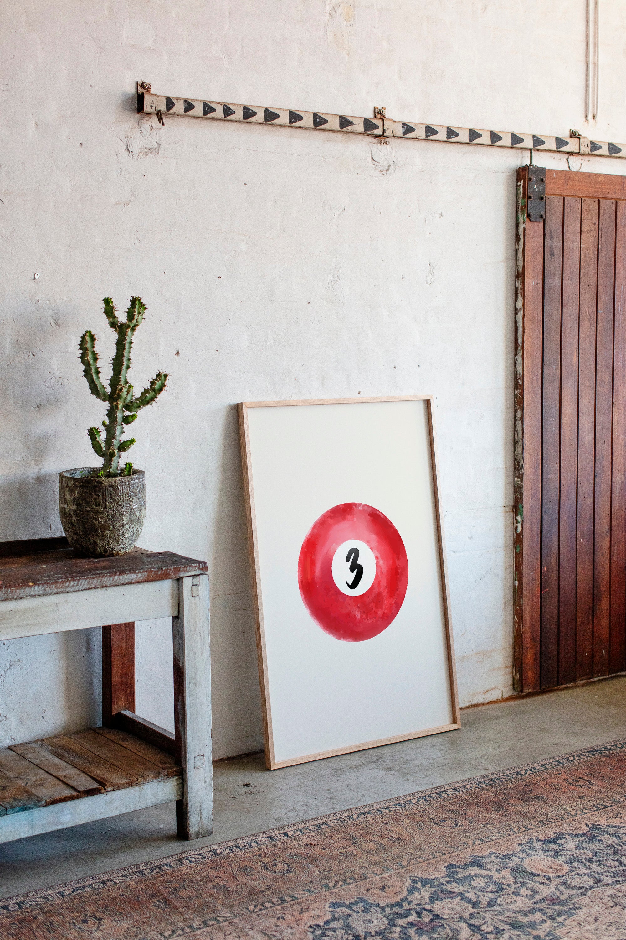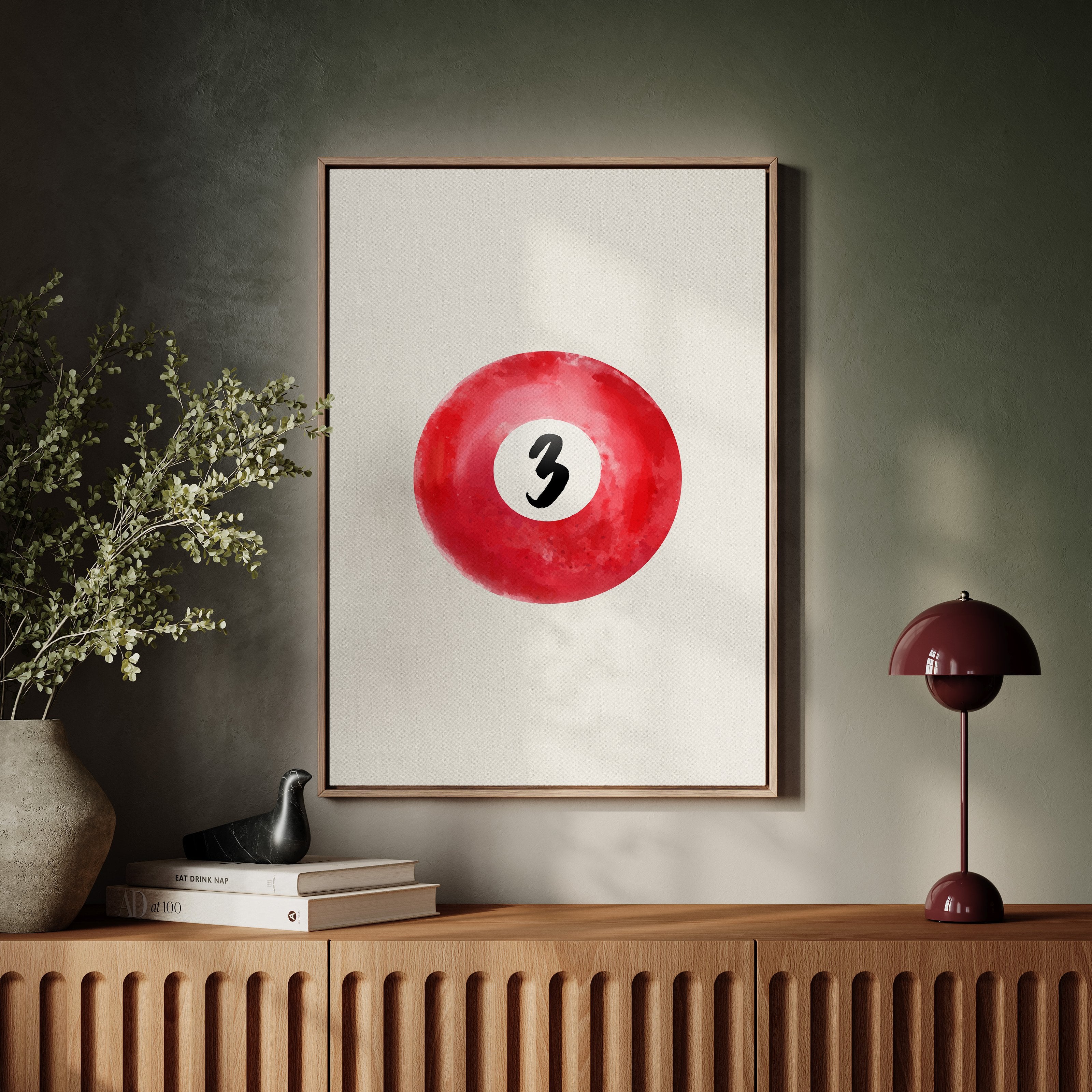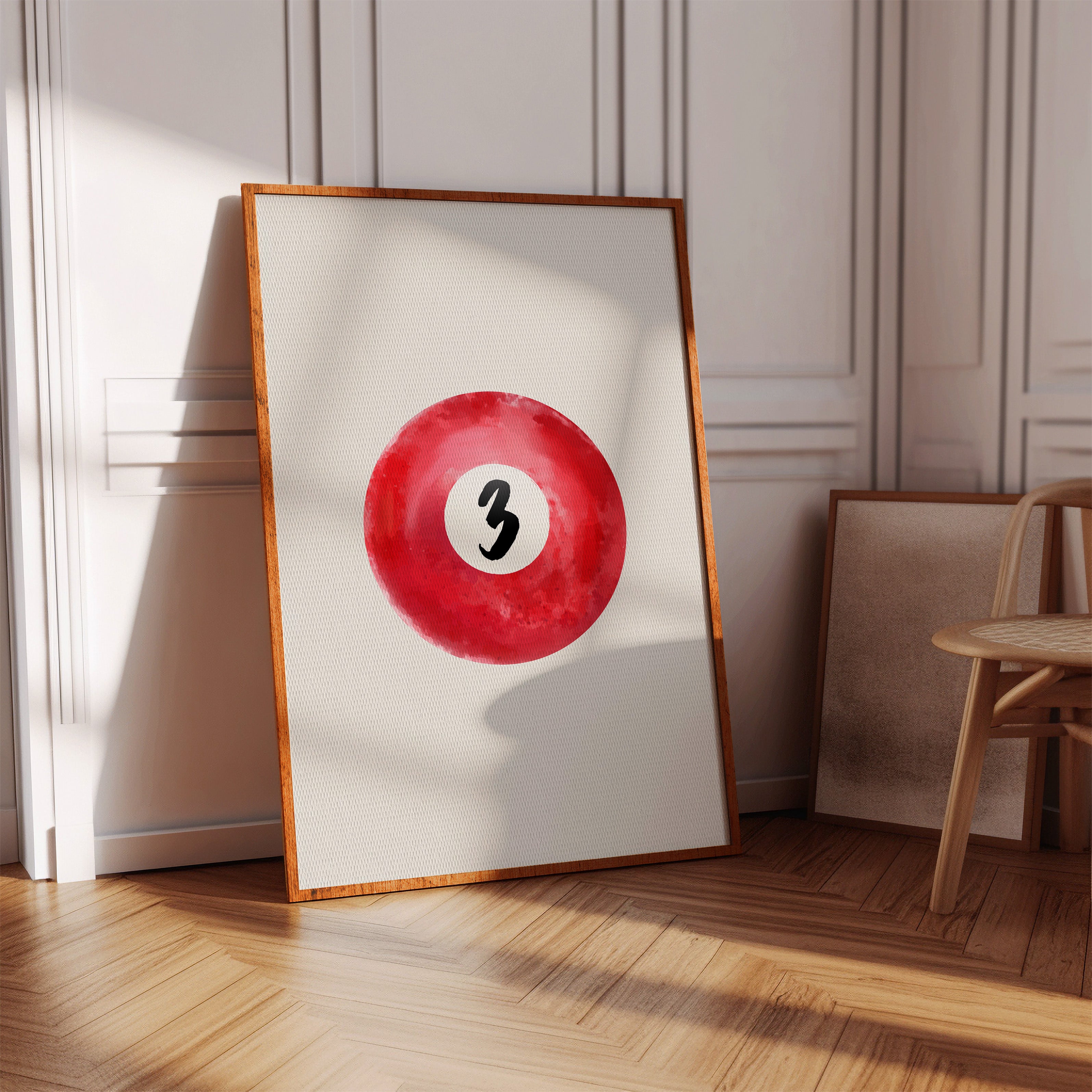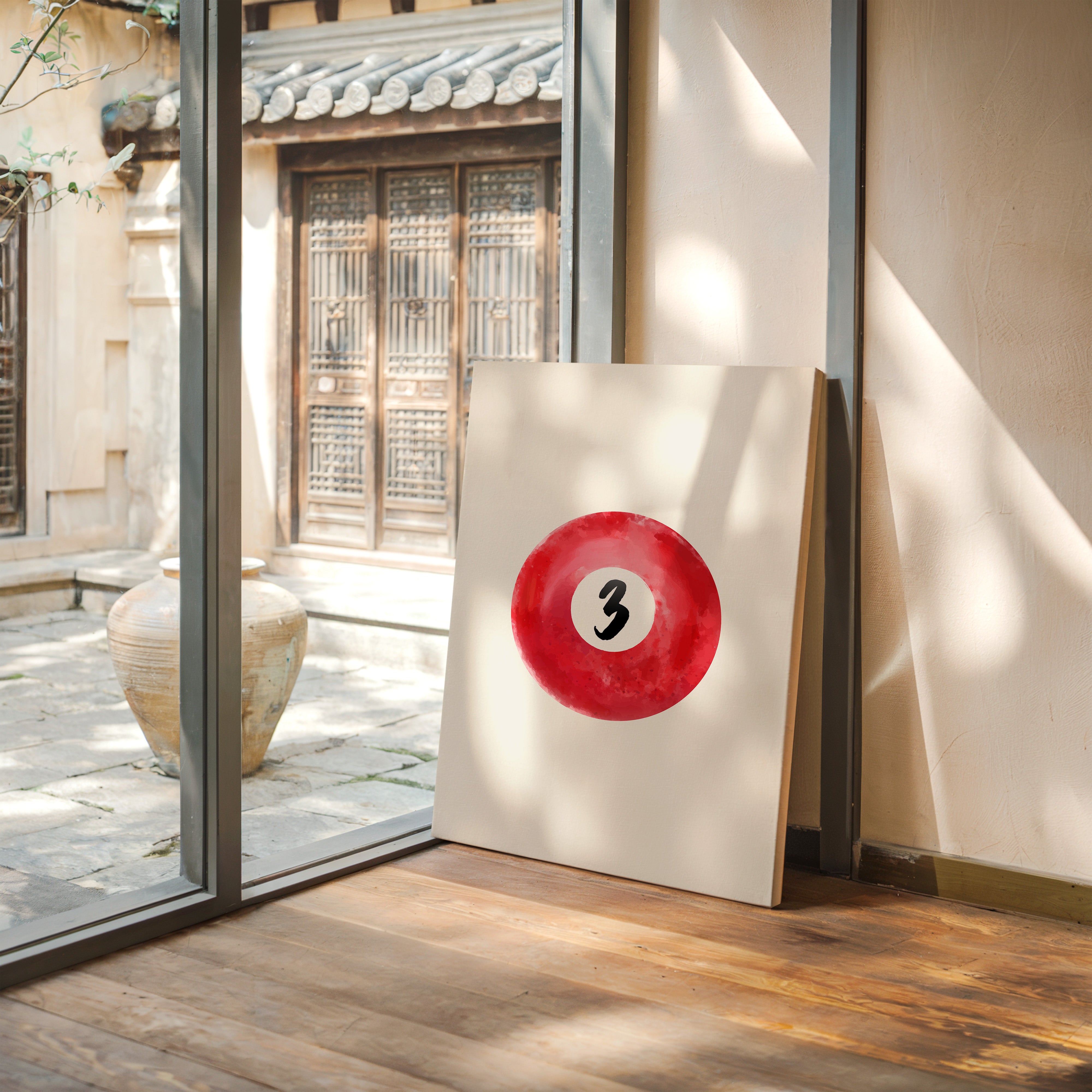 A vibrant red billiard ball radiates with the intensity of a summer sunset, its number three standing bold against pristine white. This piece from our Contemporary collection captures the essence of modern minimalism with a playful twist. The watercolor-like texture creates a mesmerizing depth, as if the pigment is still dancing across the surface, while subtle variations in the crimson tones suggest movement and life within the static form. Perfect for adding a pop of sophisticated color to a game room, den, or modern living space. The piece invites both nostalgia and contemporary charm, creating an unexpected focal point that sparks conversation.