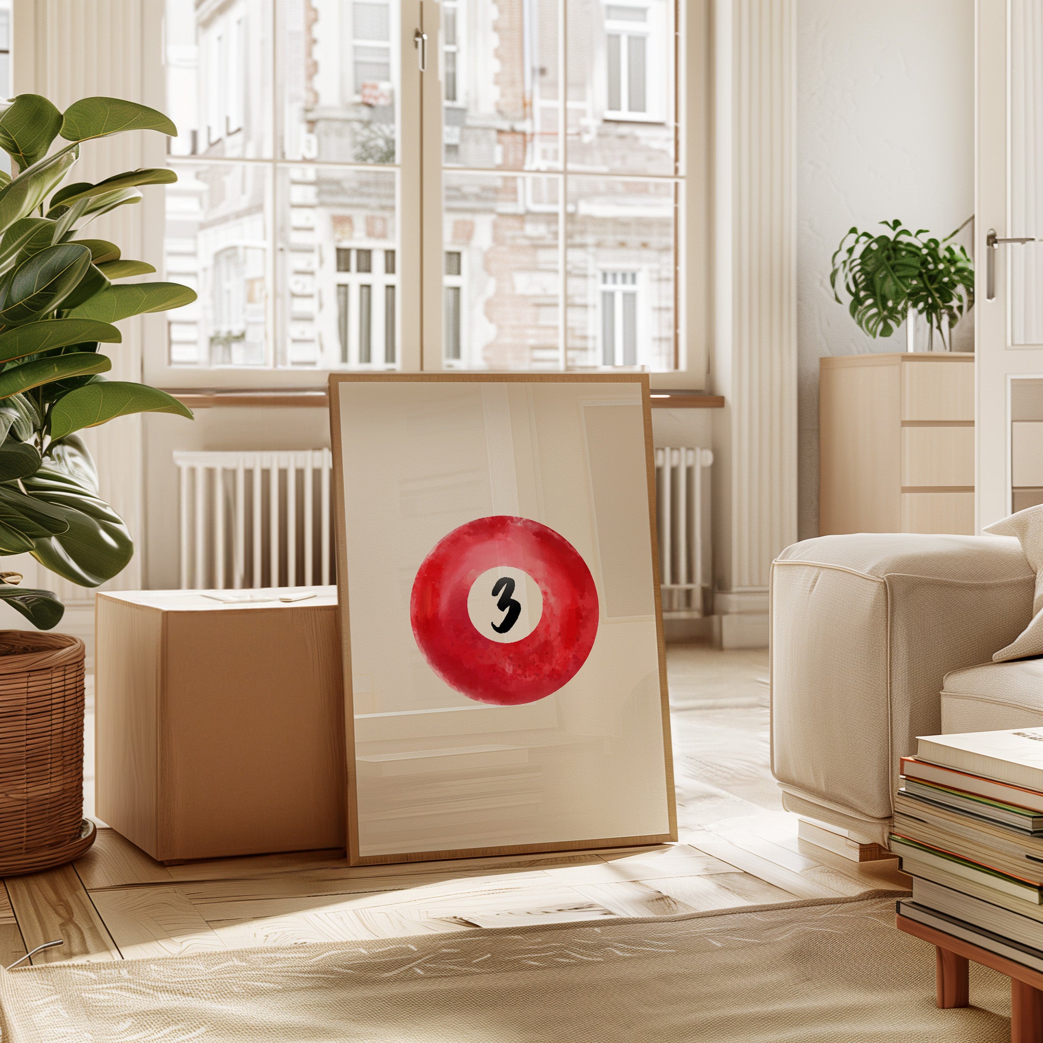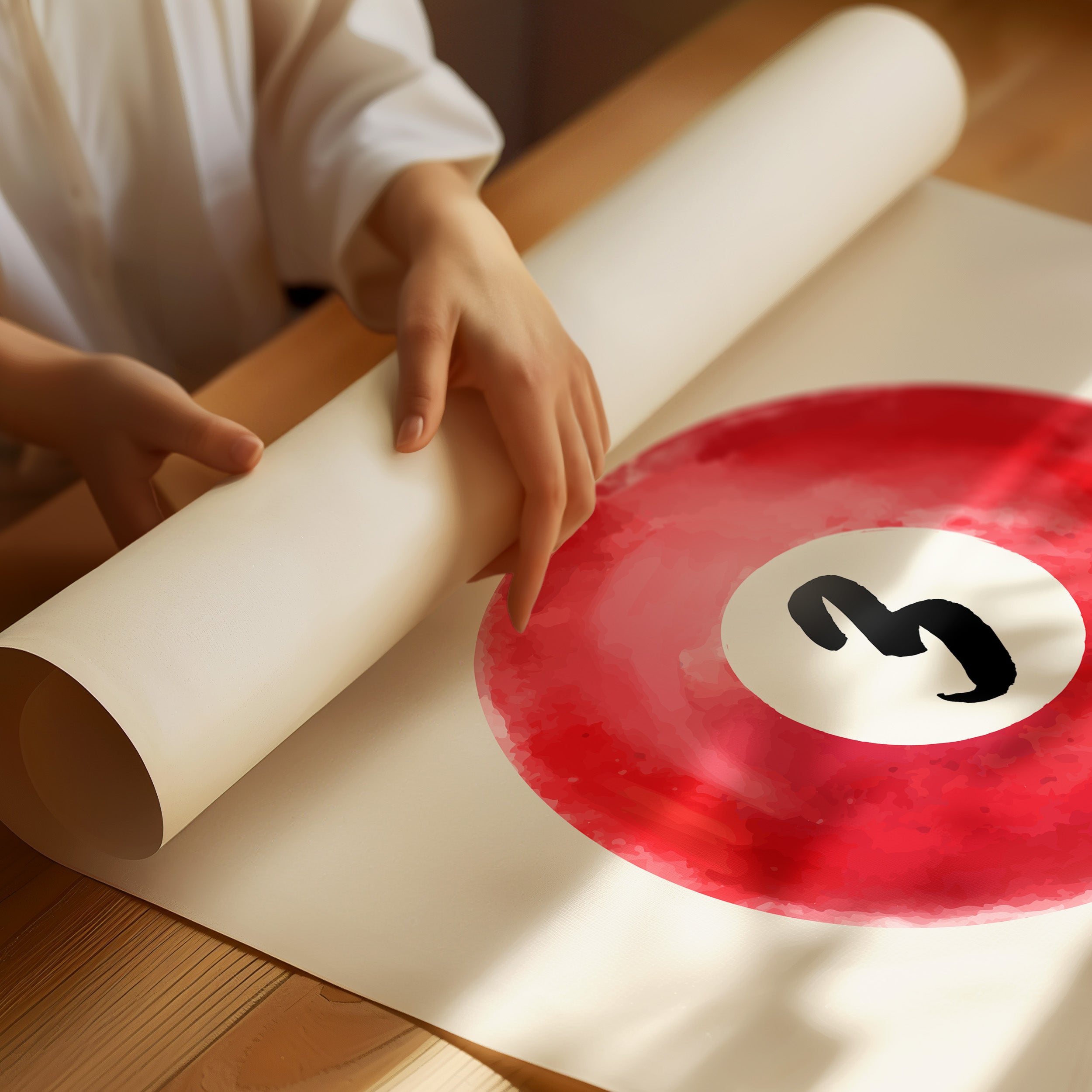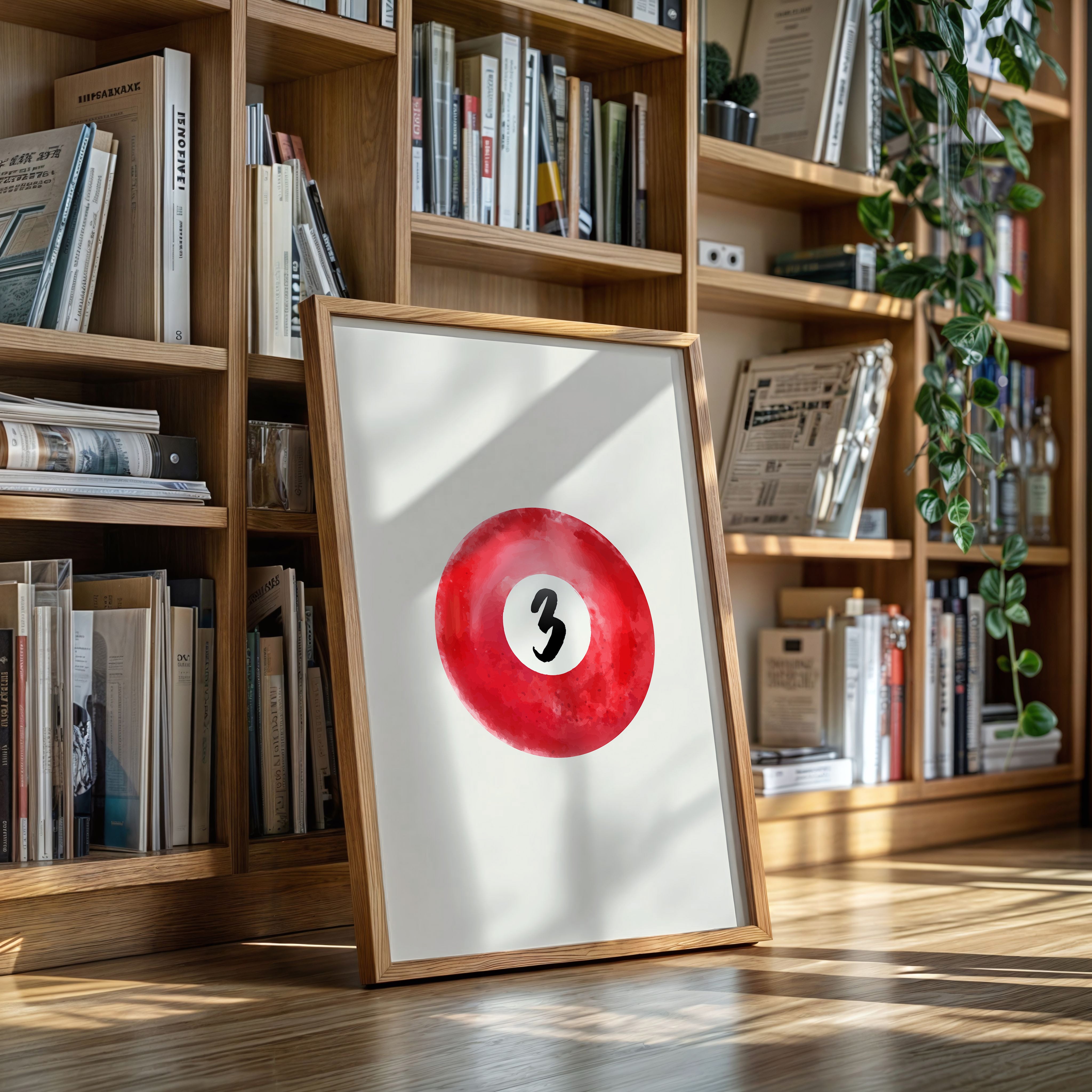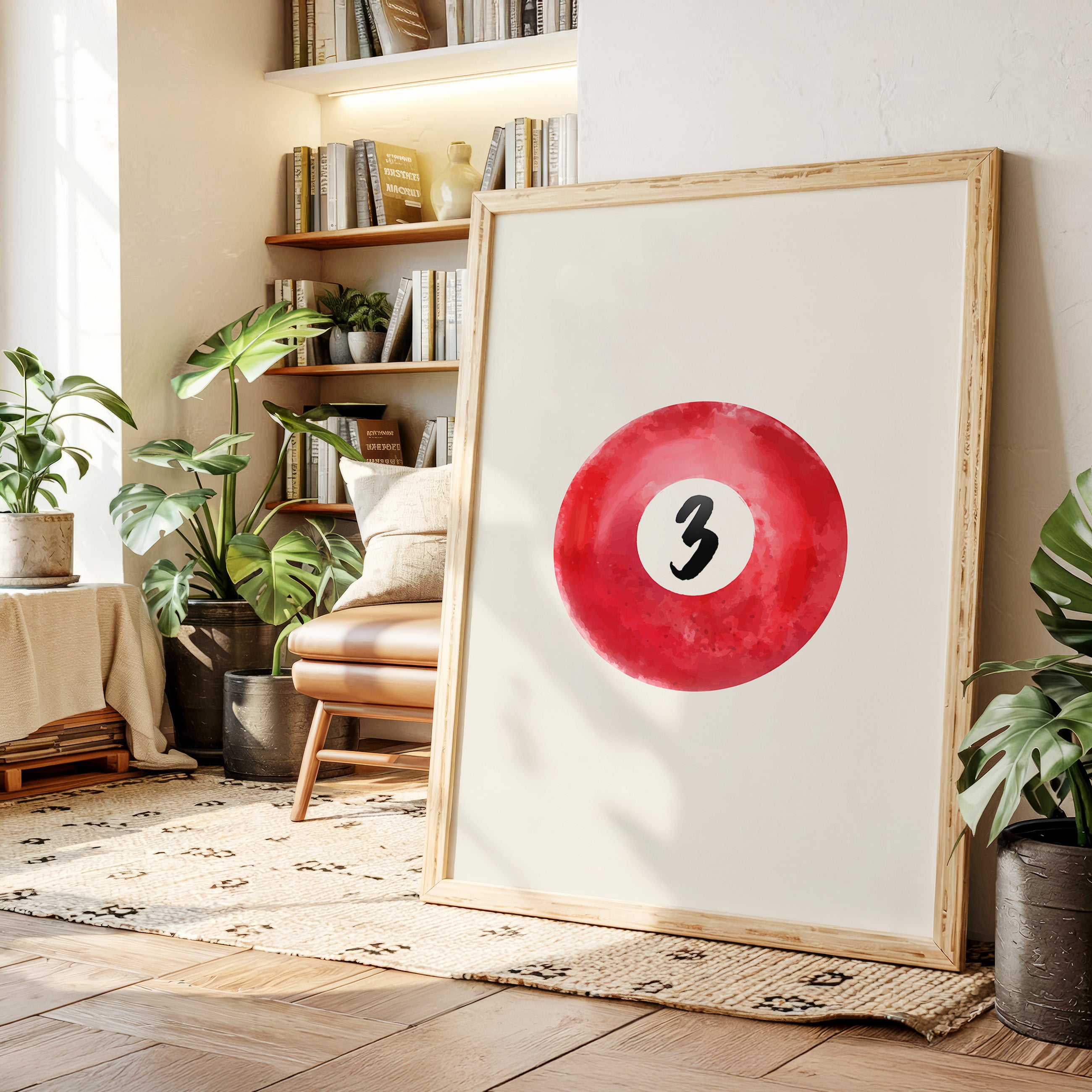 A vibrant red billiard ball radiates with the intensity of a summer sunset, its number three standing bold against pristine white. This piece from our Contemporary collection captures the essence of modern minimalism with a playful twist. The watercolor-like texture creates a mesmerizing depth, as if the pigment is still dancing across the surface, while subtle variations in the crimson tones suggest movement and life within the static form. Perfect for adding a pop of sophisticated color to a game room, den, or modern living space. The piece invites both nostalgia and contemporary charm, creating an unexpected focal point that sparks conversation.
