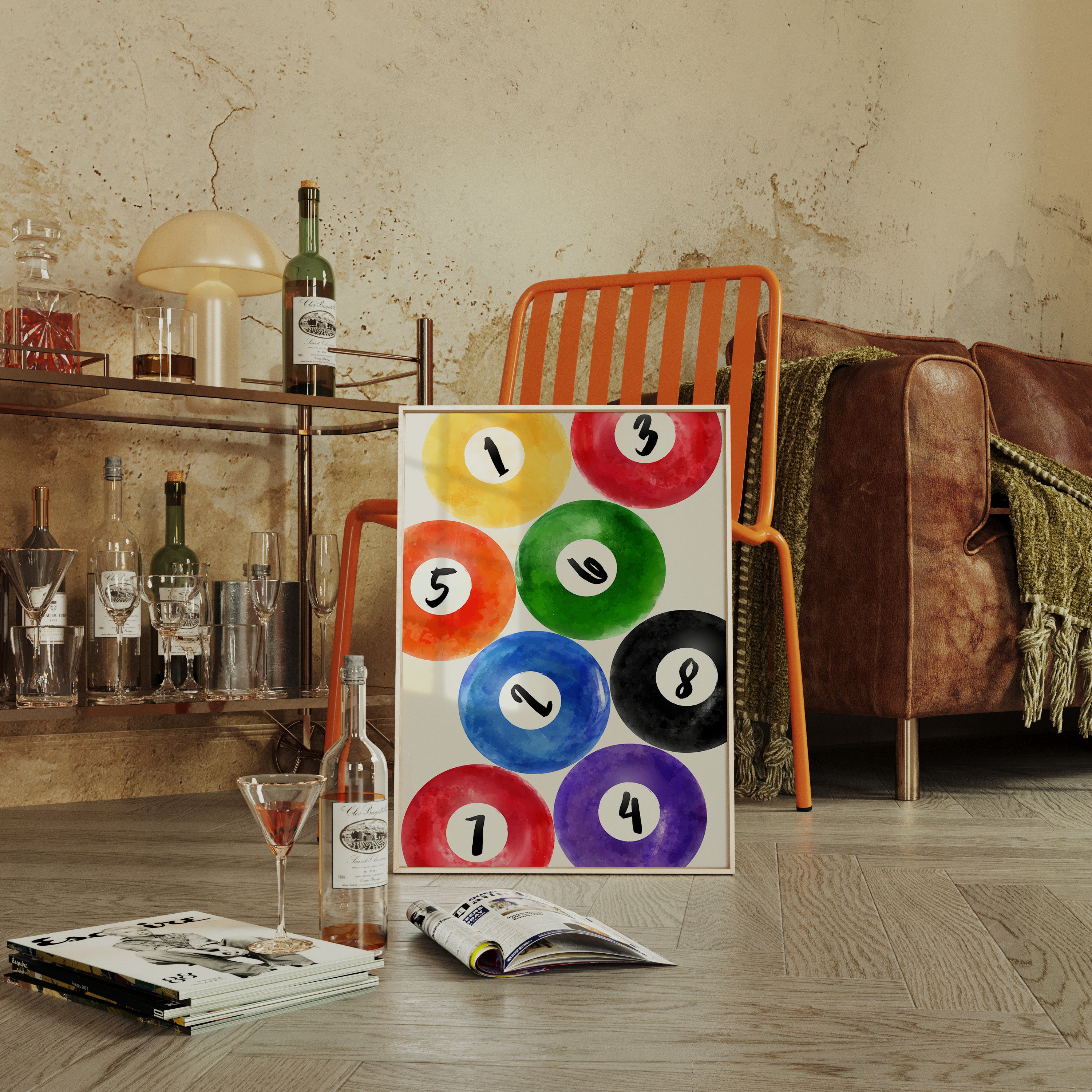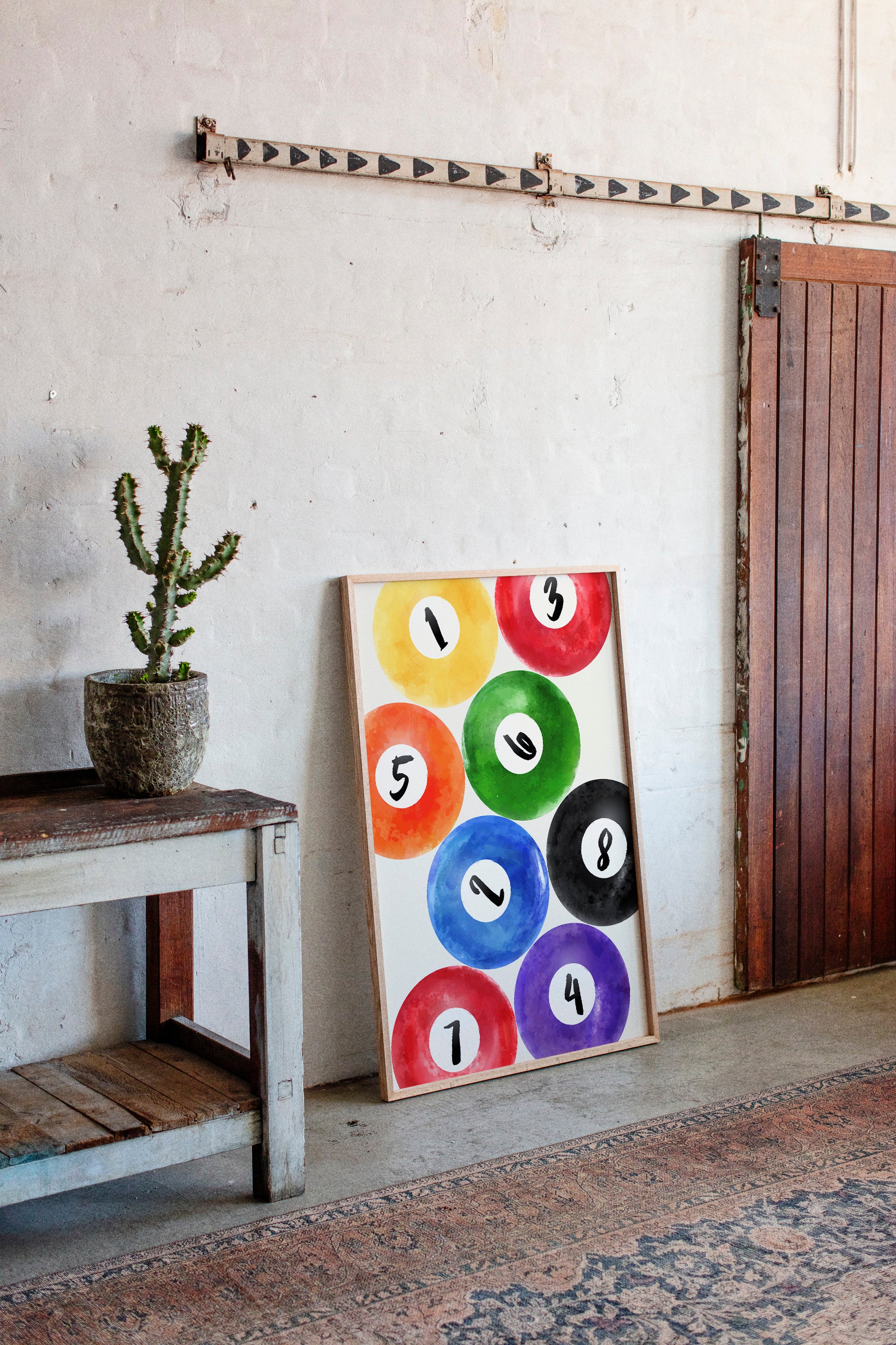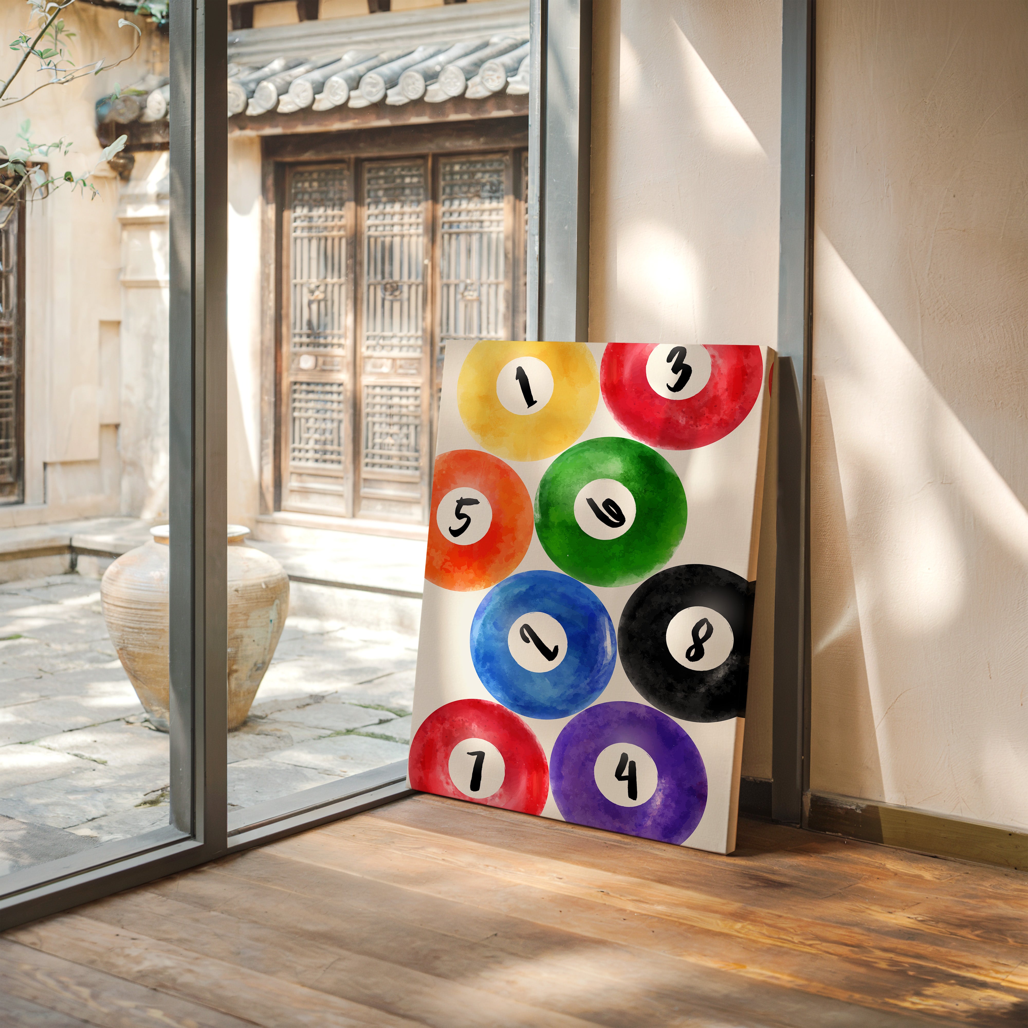 Vibrant pool balls float like celestial bodies against pristine white, each number carrying its own chromatic energy. This piece from our Contemporary collection merges playful nostalgia with modern minimalist design. The watercolor-style spheres create a dynamic composition, with rich reds, deep purples, and bold yellows bleeding into their perfect circles, while crisp black numbers add graphic punch to each orb. The arrangement suggests both movement and balance, like a perfectly executed break shot frozen in time. This statement piece brings a spark of sophisticated fun to a game room, office, or creative space, offering both geometric precision and artistic spontaneity.