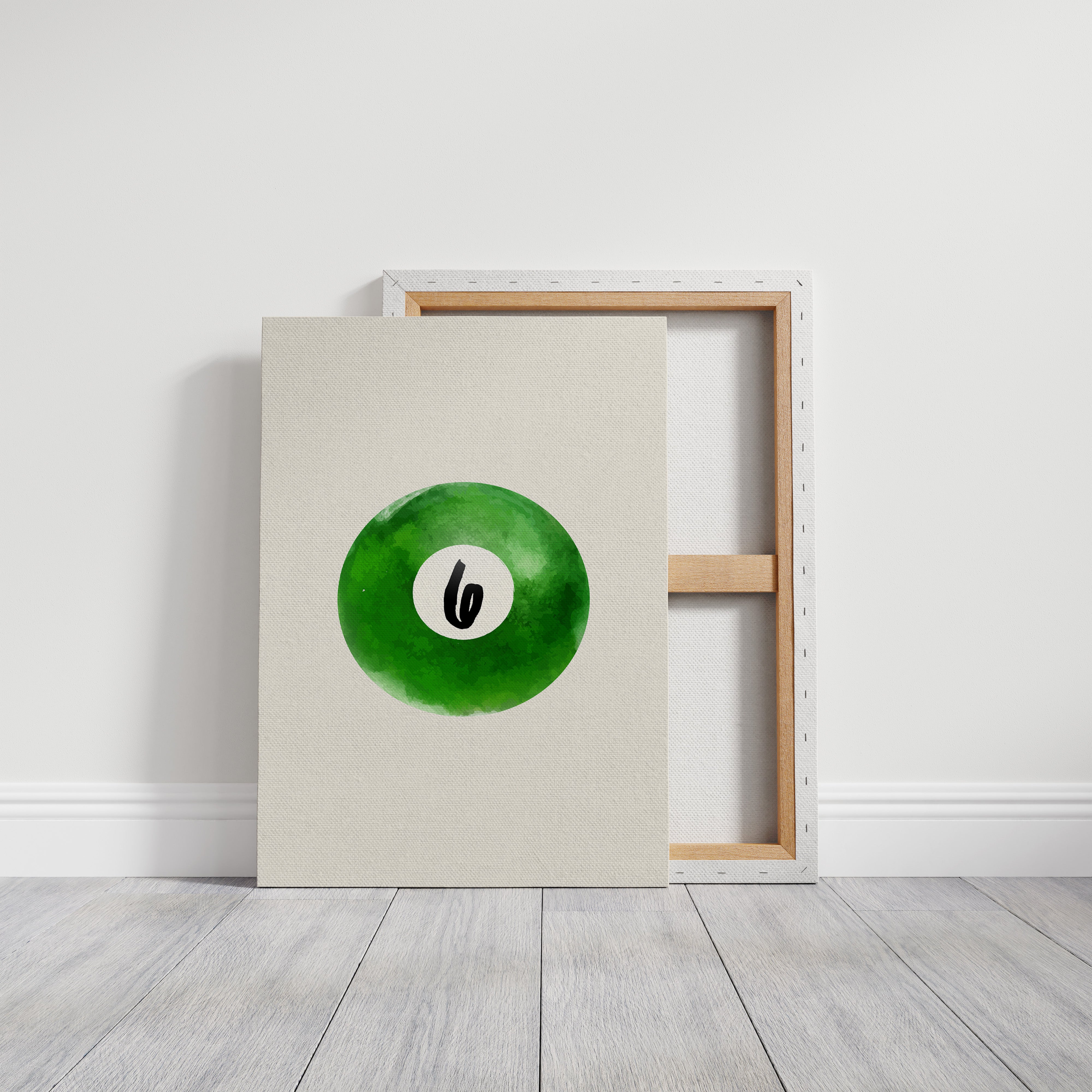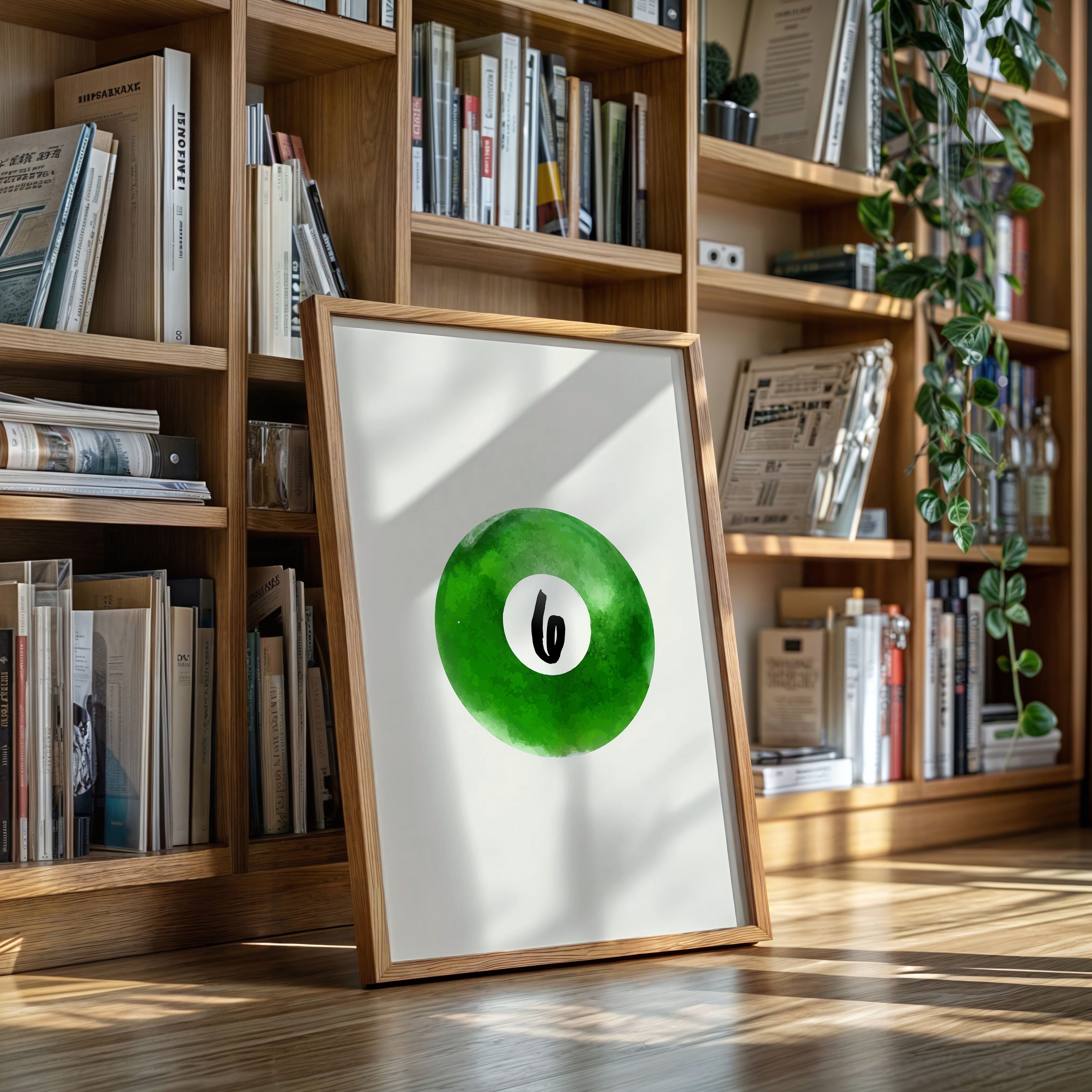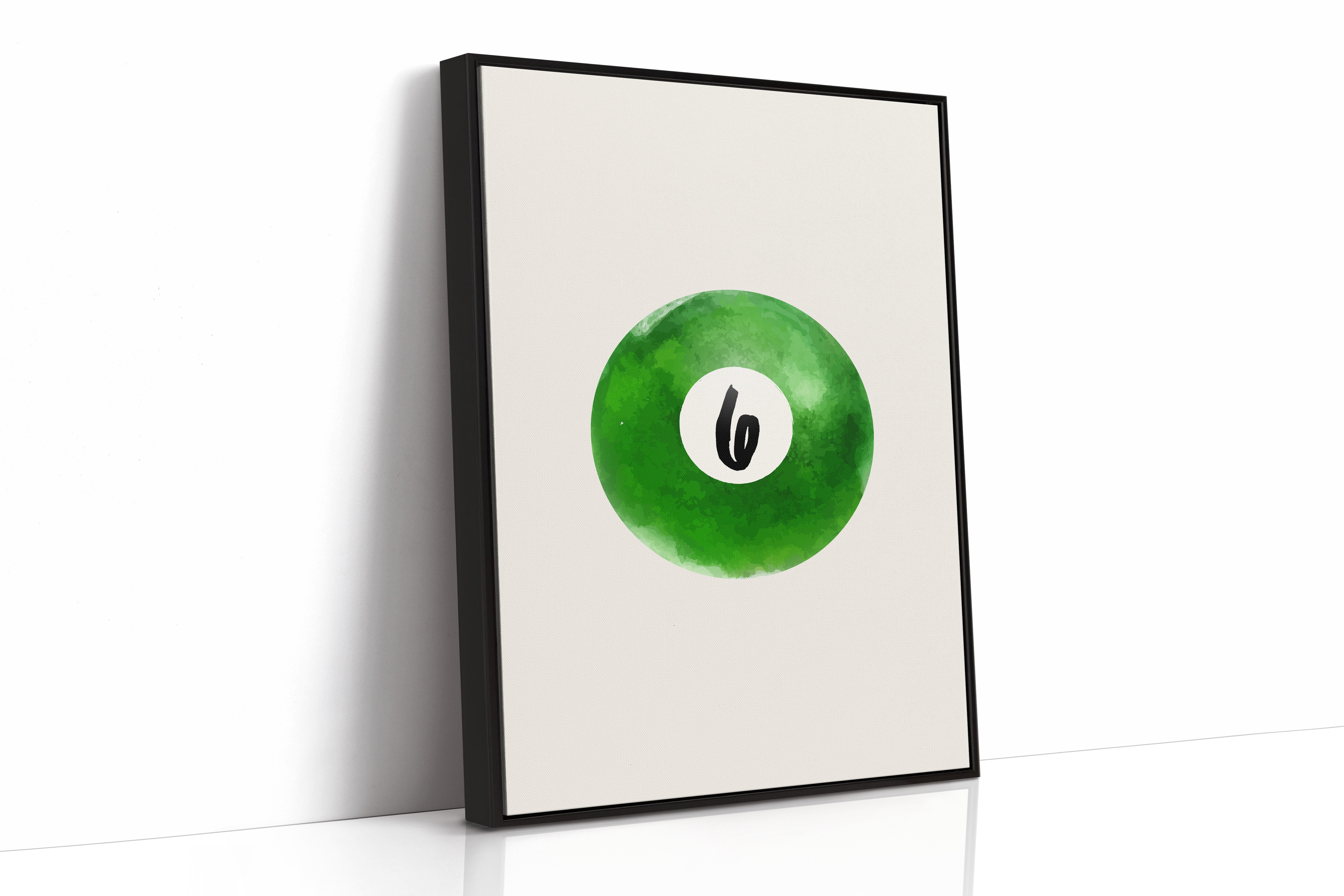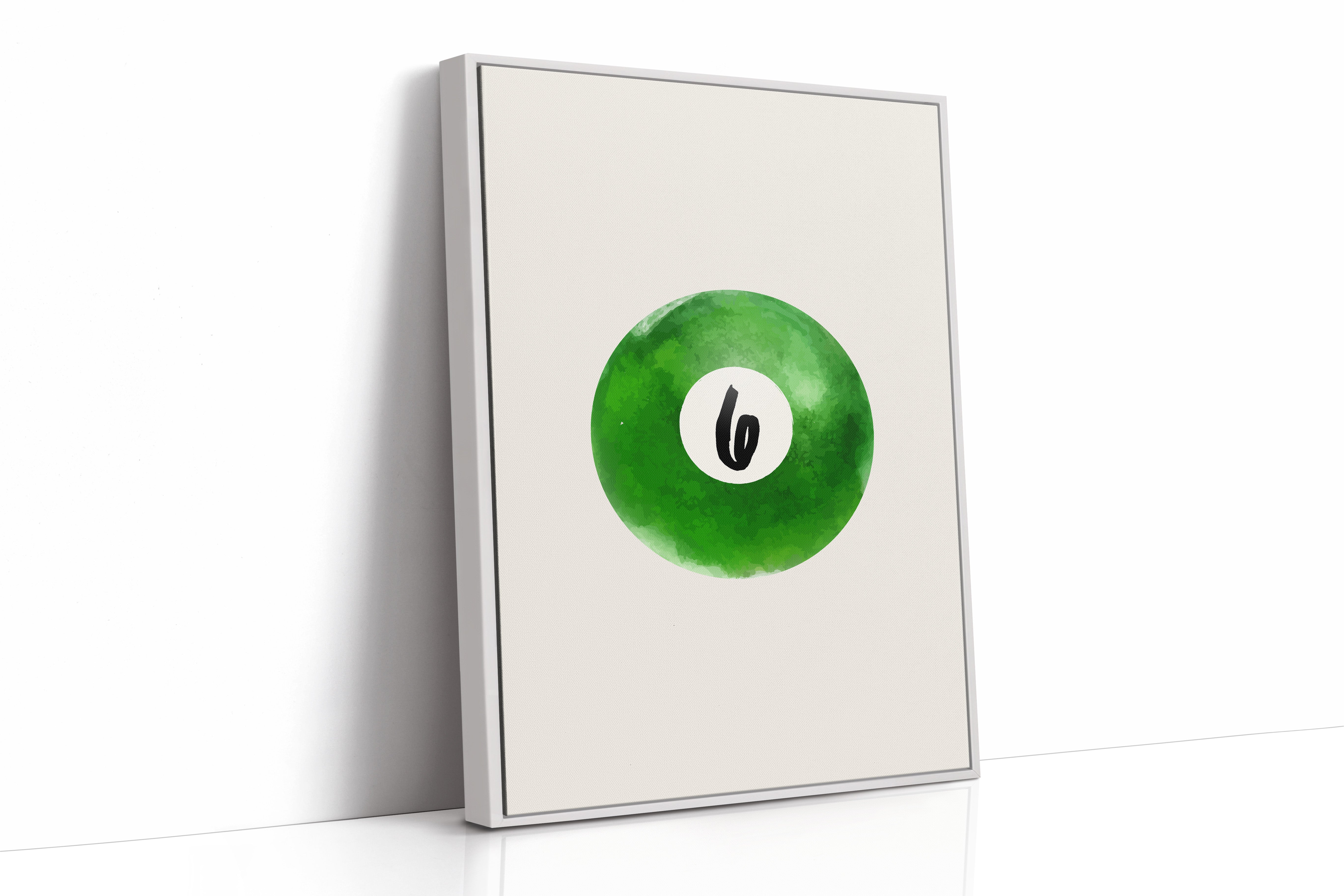A single billiard ball hovers in pristine white space, its emerald surface catching invisible light like morning dew on grass. This piece exemplifies the Contemporary collection's mastery of minimalist sport aesthetics. The deep forest green watercolor effect creates a mesmerizing depth, while the crisp number six stands in bold contrast, suggesting both playfulness and precision. The composition speaks to moments of perfect alignment, when sport meets artistry. Perfect for a game room, modern office, or any space seeking to blend recreational spirit with refined design. The piece invites both nostalgia and contemplation, bridging the gap between play and sophistication.