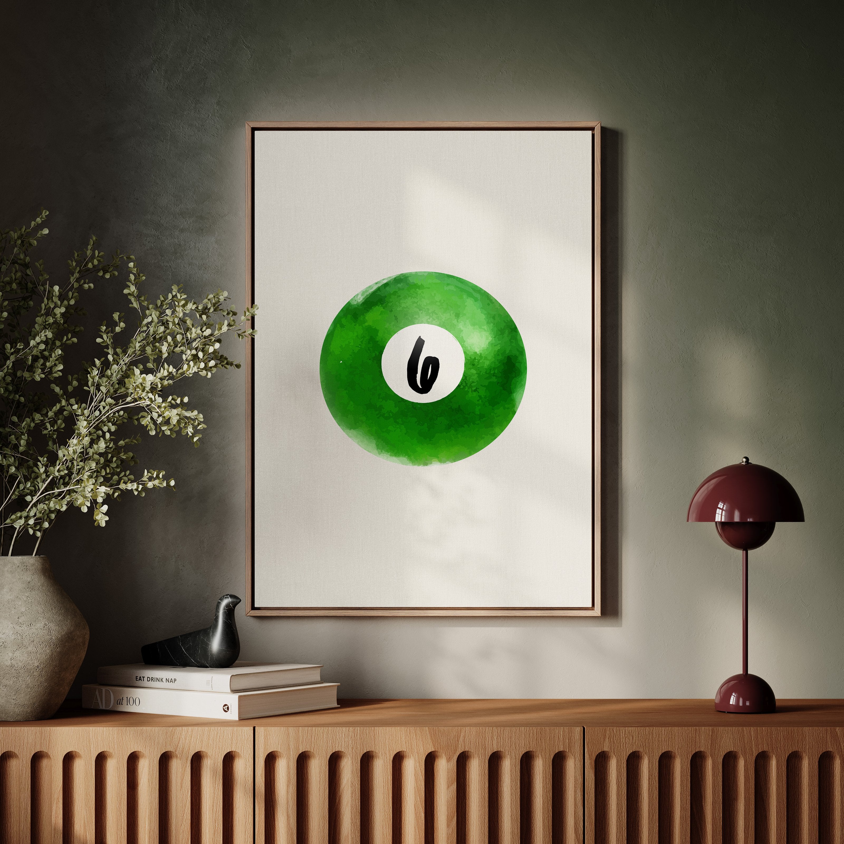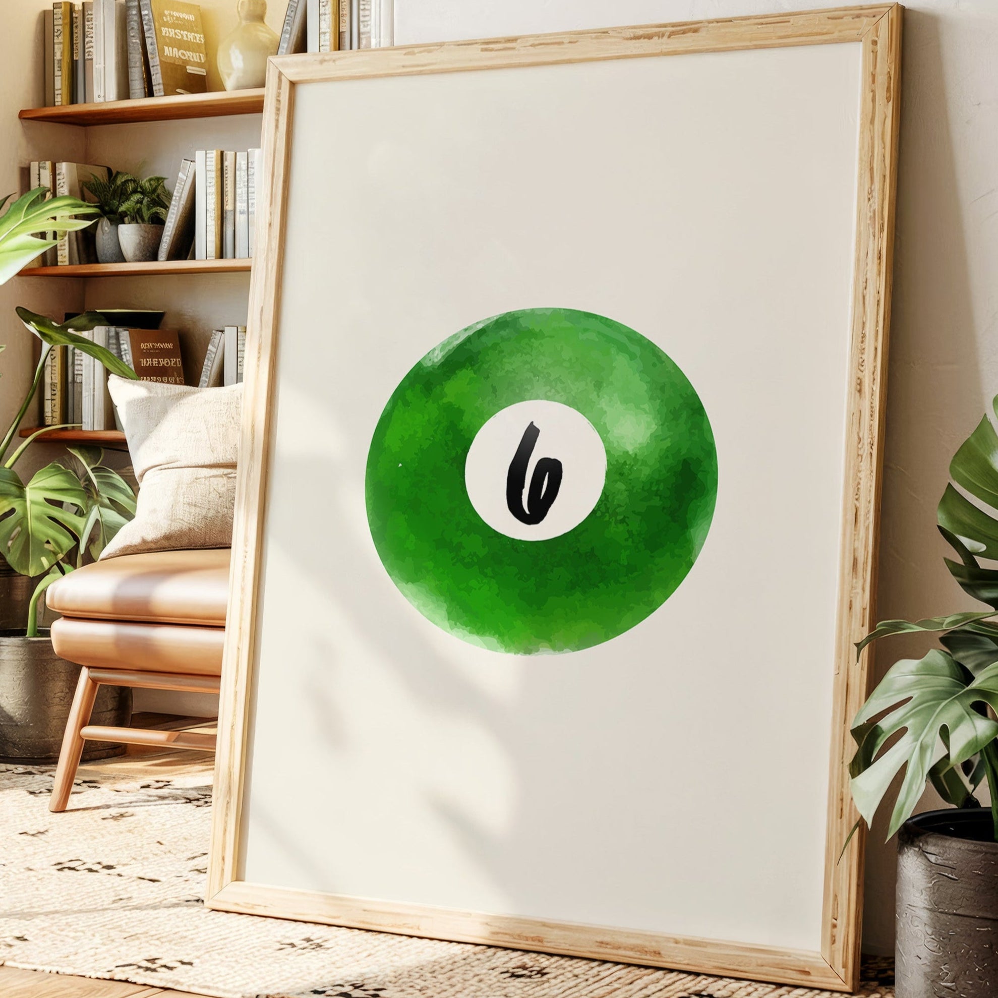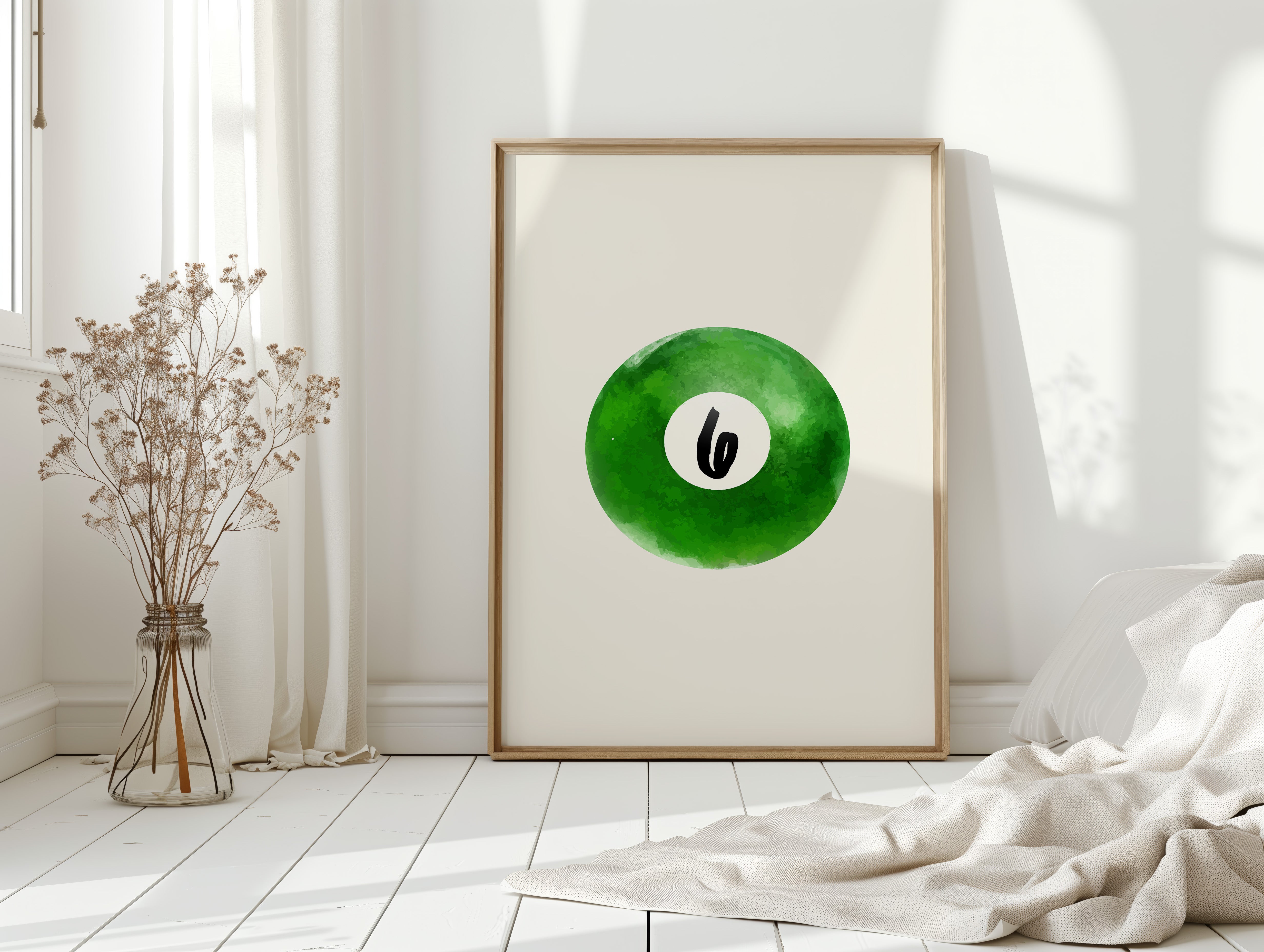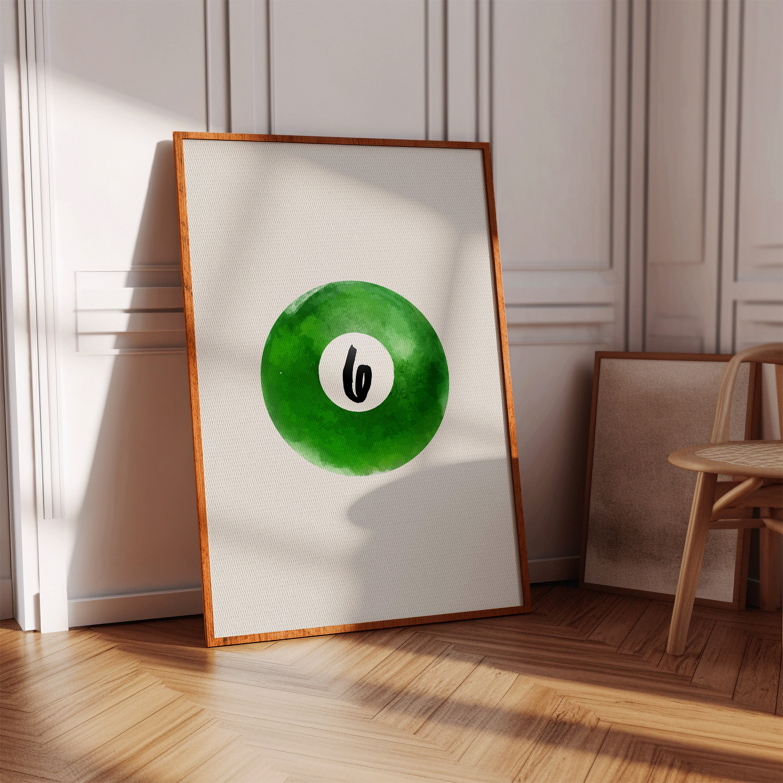 A single billiard ball hovers in pristine white space, its emerald surface catching invisible light like morning dew on grass. This piece exemplifies the Contemporary collection's mastery of minimalist sport aesthetics. The deep forest green watercolor effect creates a mesmerizing depth, while the crisp number six stands in bold contrast, suggesting both playfulness and precision. The composition speaks to moments of perfect alignment, when sport meets artistry. Perfect for a game room, modern office, or any space seeking to blend recreational spirit with refined design. The piece invites both nostalgia and contemplation, bridging the gap between play and sophistication.