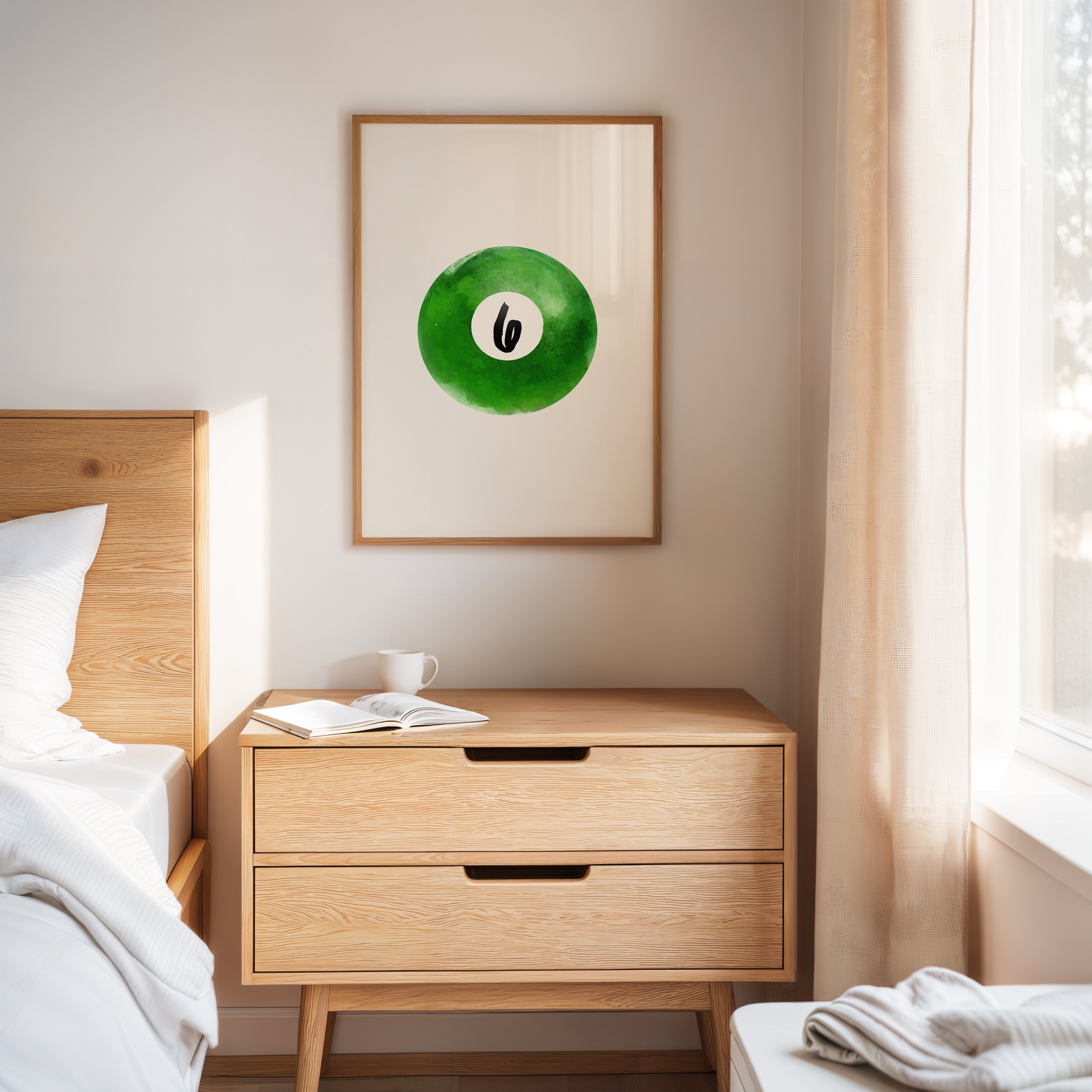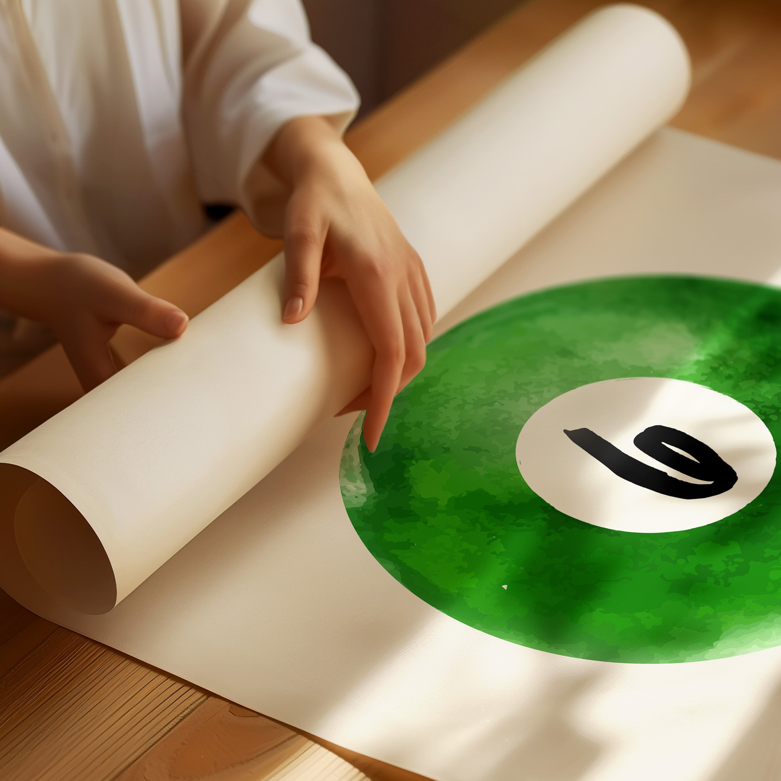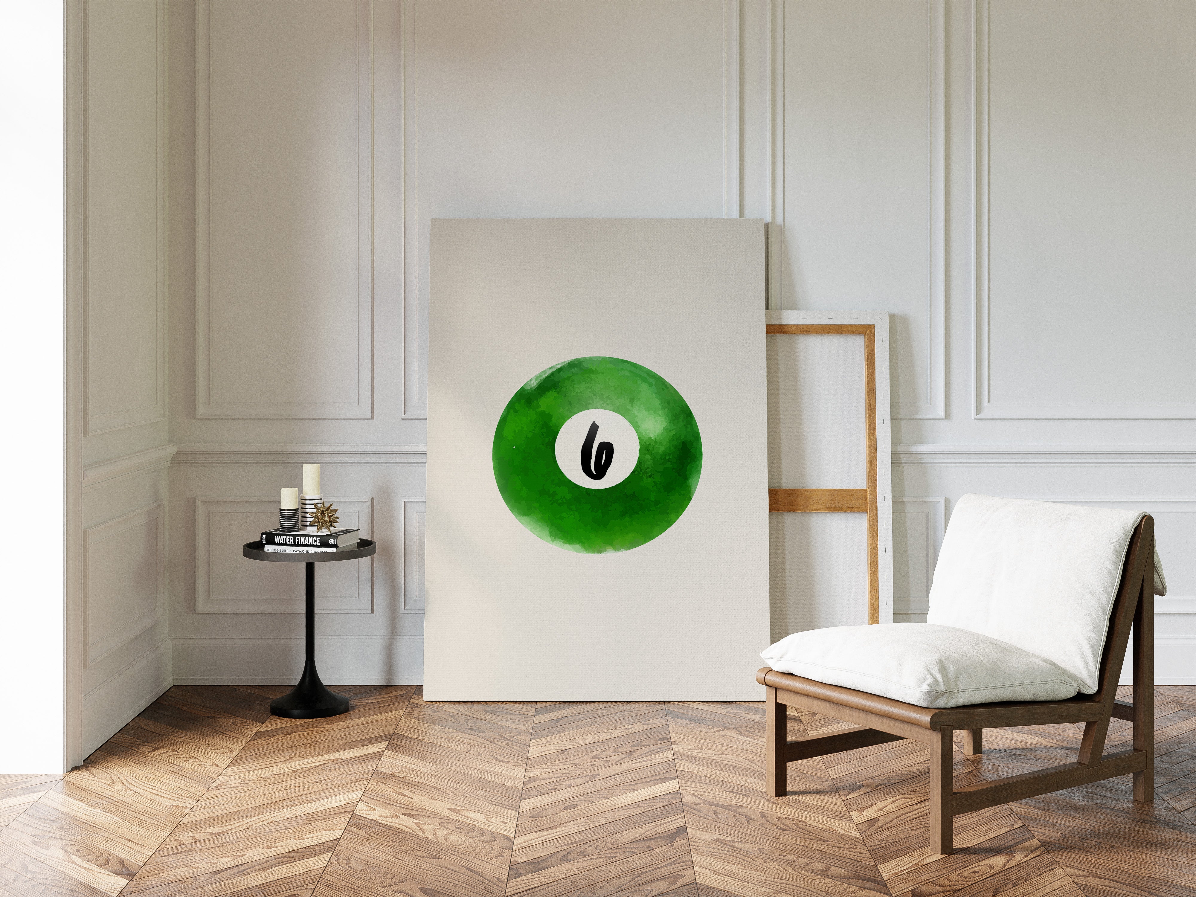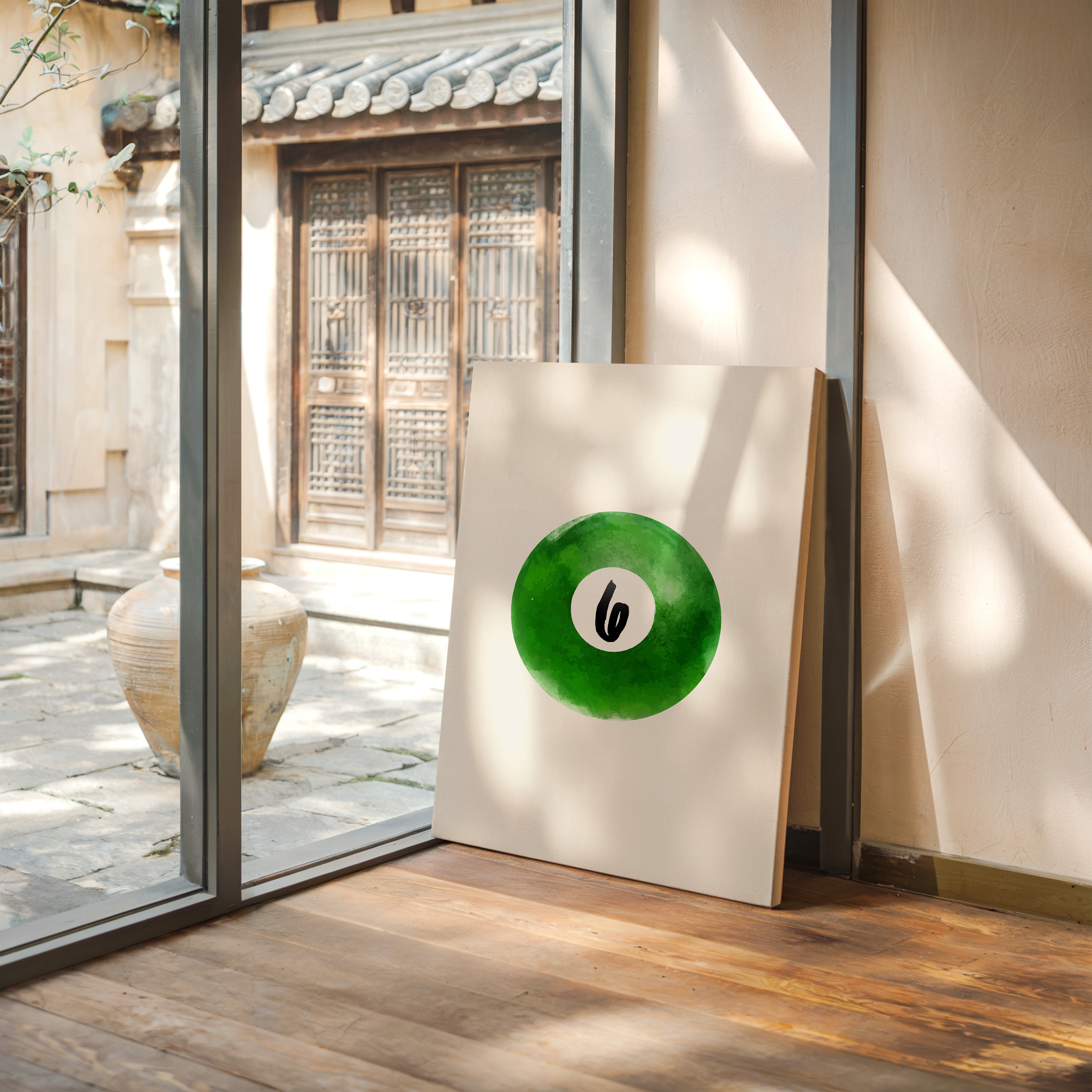 A single billiard ball hovers in pristine white space, its emerald surface catching invisible light like morning dew on grass. This piece exemplifies the Contemporary collection's mastery of minimalist sport aesthetics. The deep forest green watercolor effect creates a mesmerizing depth, while the crisp number six stands in bold contrast, suggesting both playfulness and precision. The composition speaks to moments of perfect alignment, when sport meets artistry. Perfect for a game room, modern office, or any space seeking to blend recreational spirit with refined design. The piece invites both nostalgia and contemplation, bridging the gap between play and sophistication.