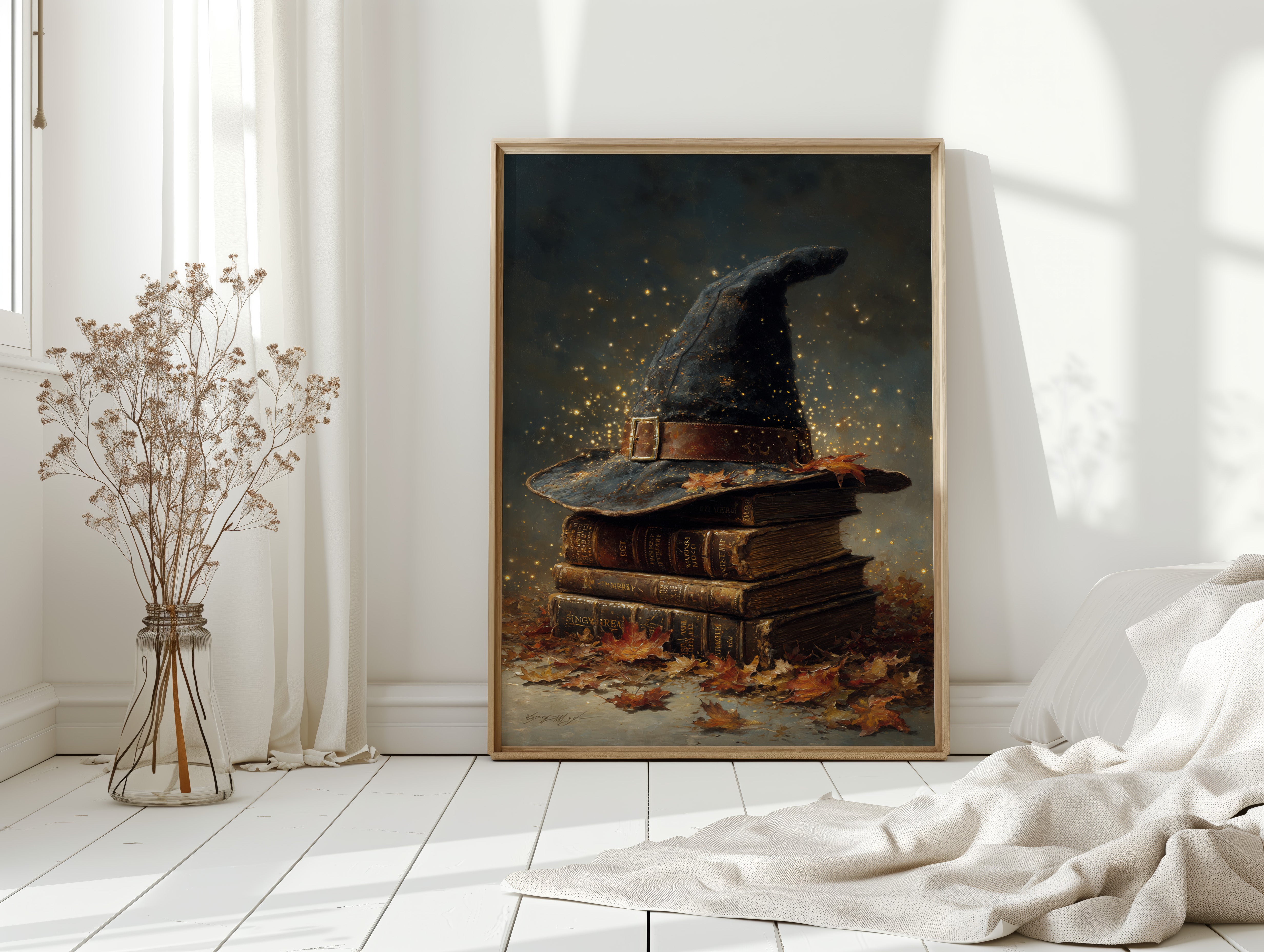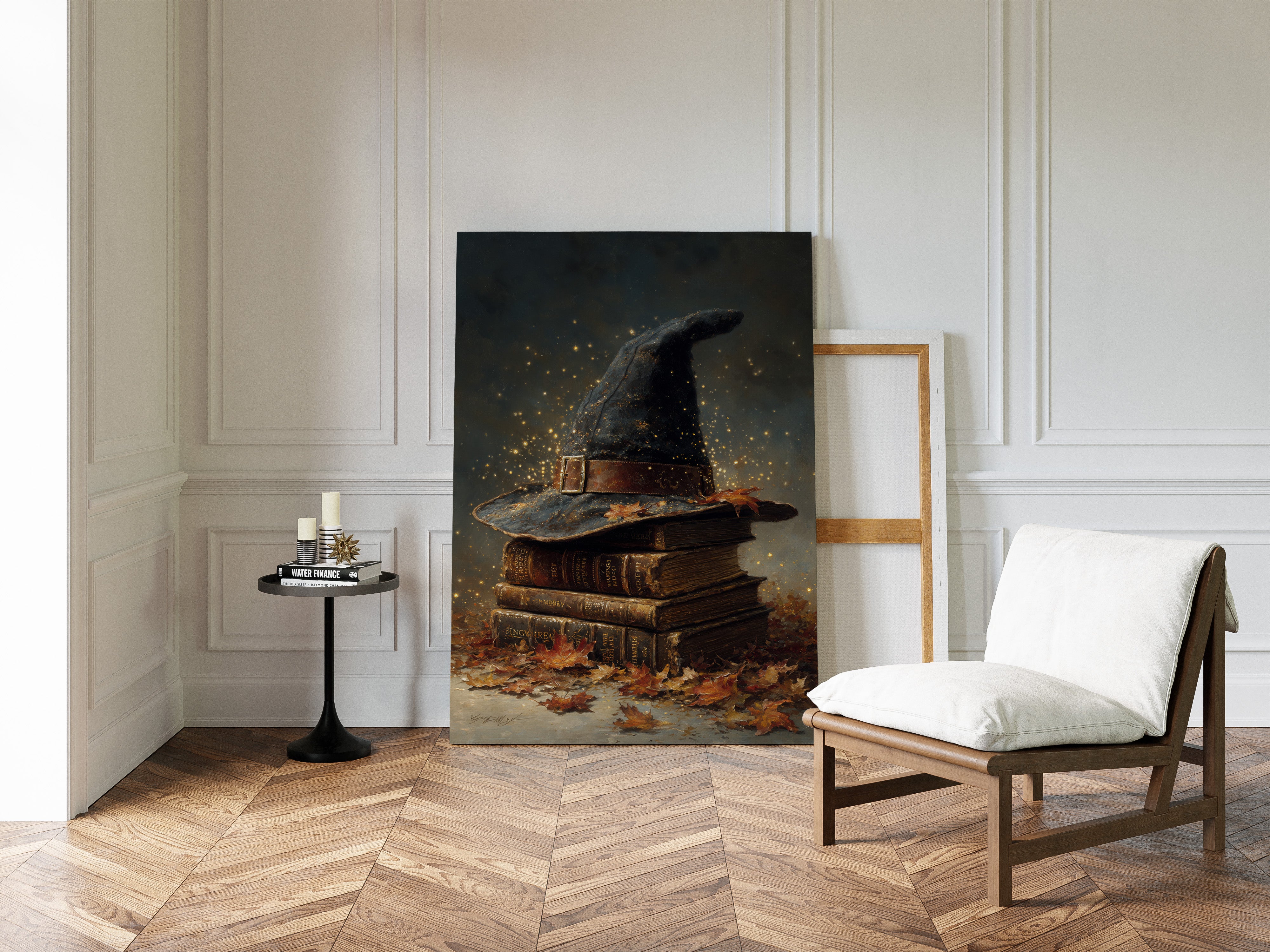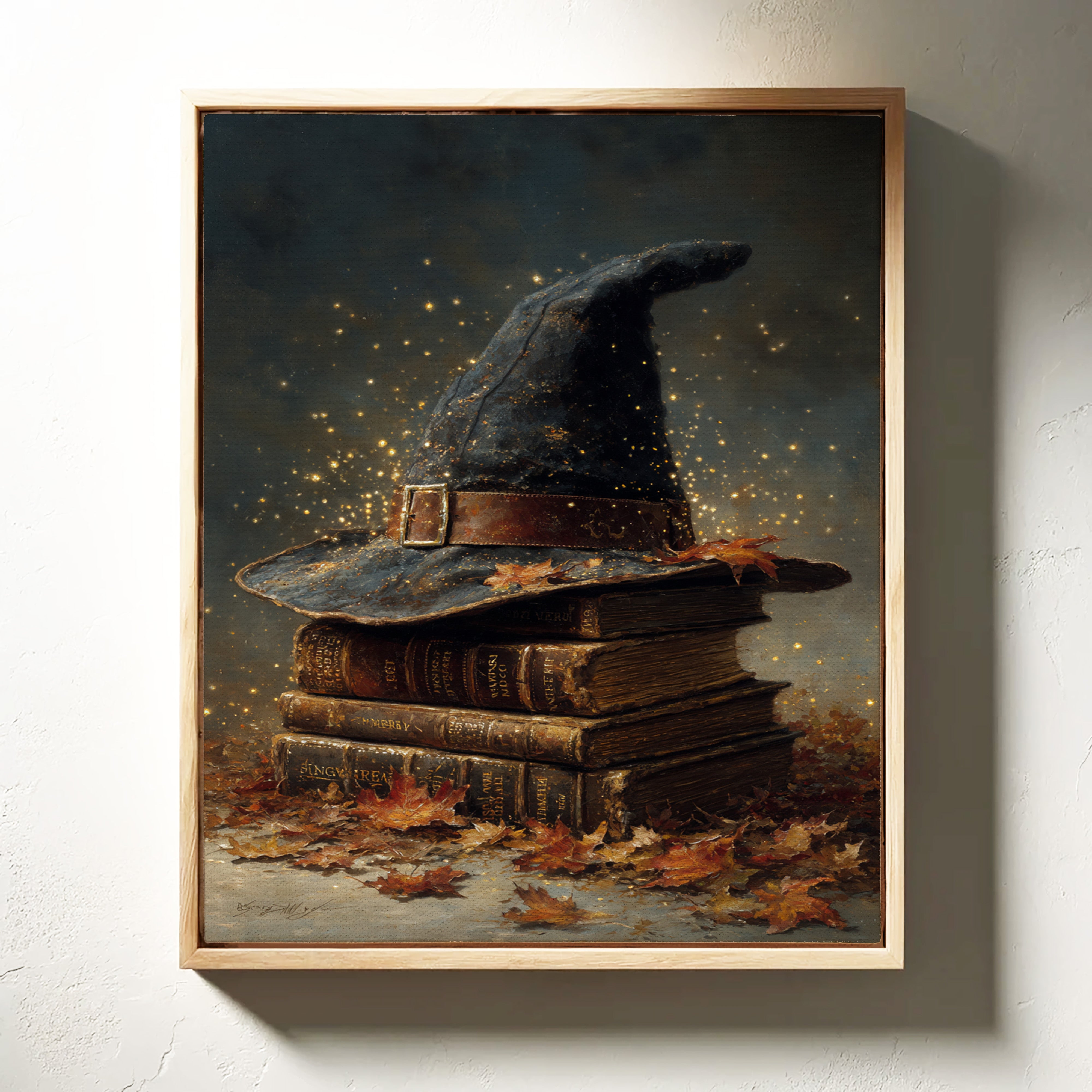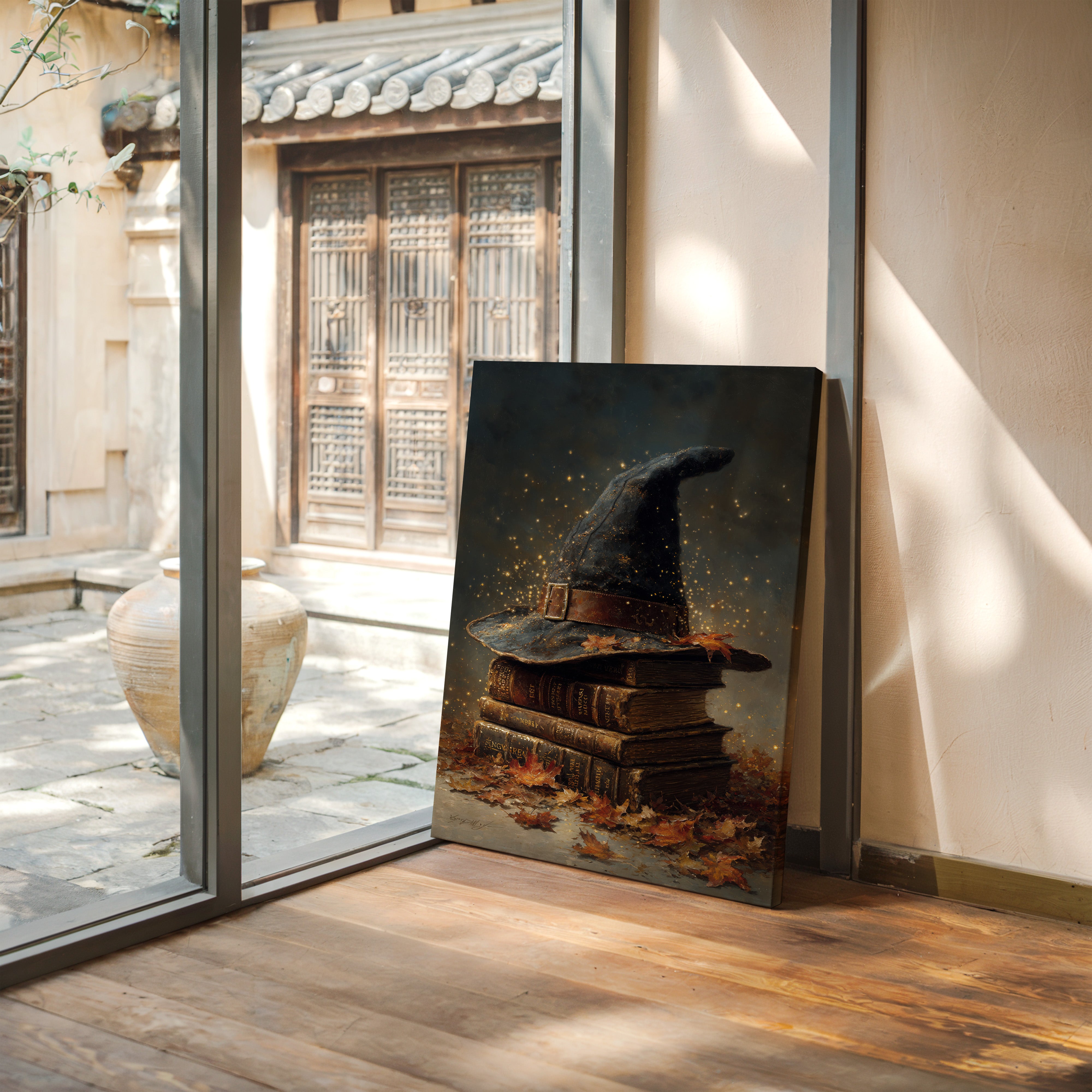 In a realm where stories linger, a worn hat rests atop ancient tomes, its fabric whispering tales of enchantment. This piece embodies the spirit of contemporary magic, inviting curiosity and wonder. Golden sparks dance in the air, illuminating the vibrant autumn leaves scattered around, each one a reminder of seasons passing and stories waiting to be told. Perfect for a cozy reading nook or an imaginative child's room, this artwork inspires moments of reflection and creativity.