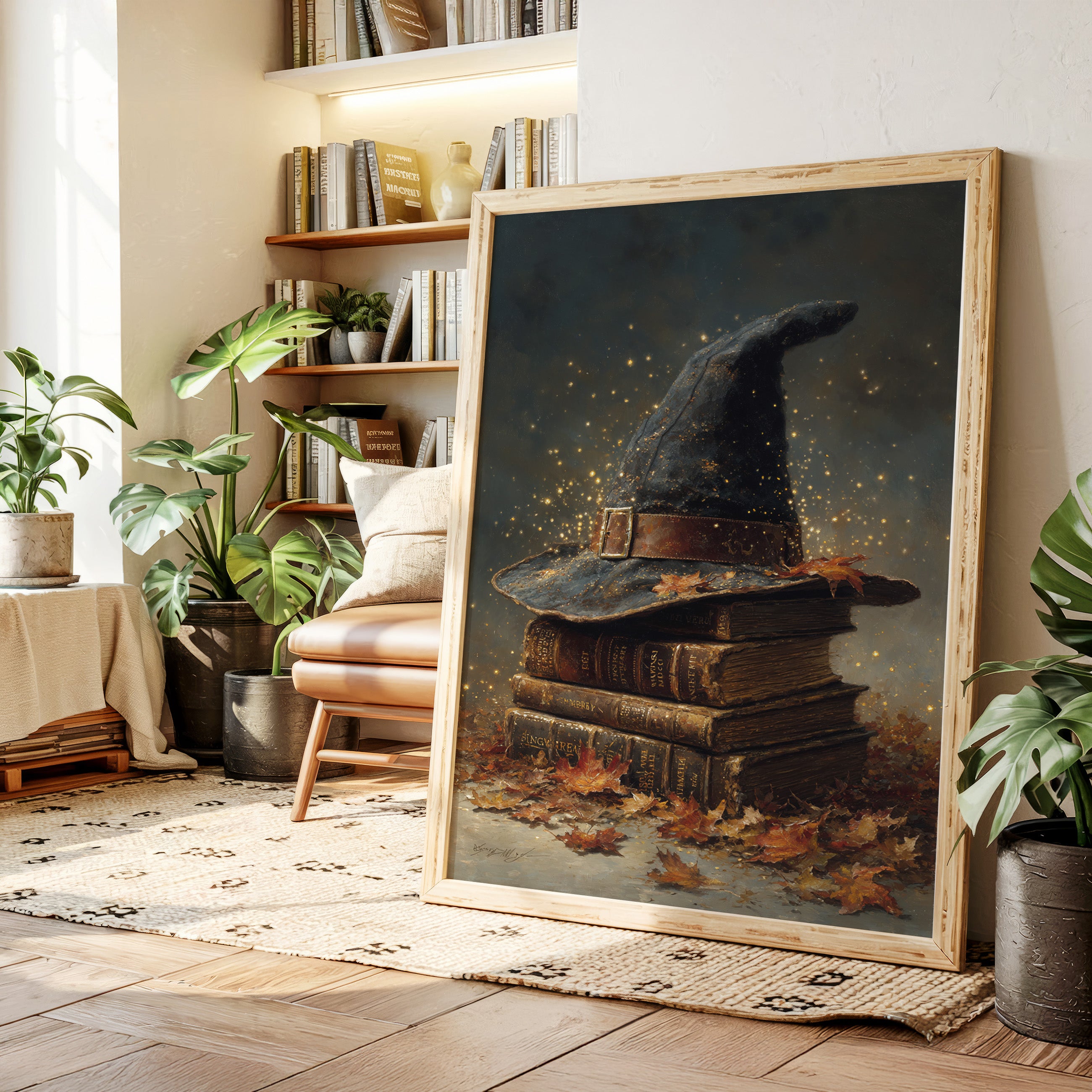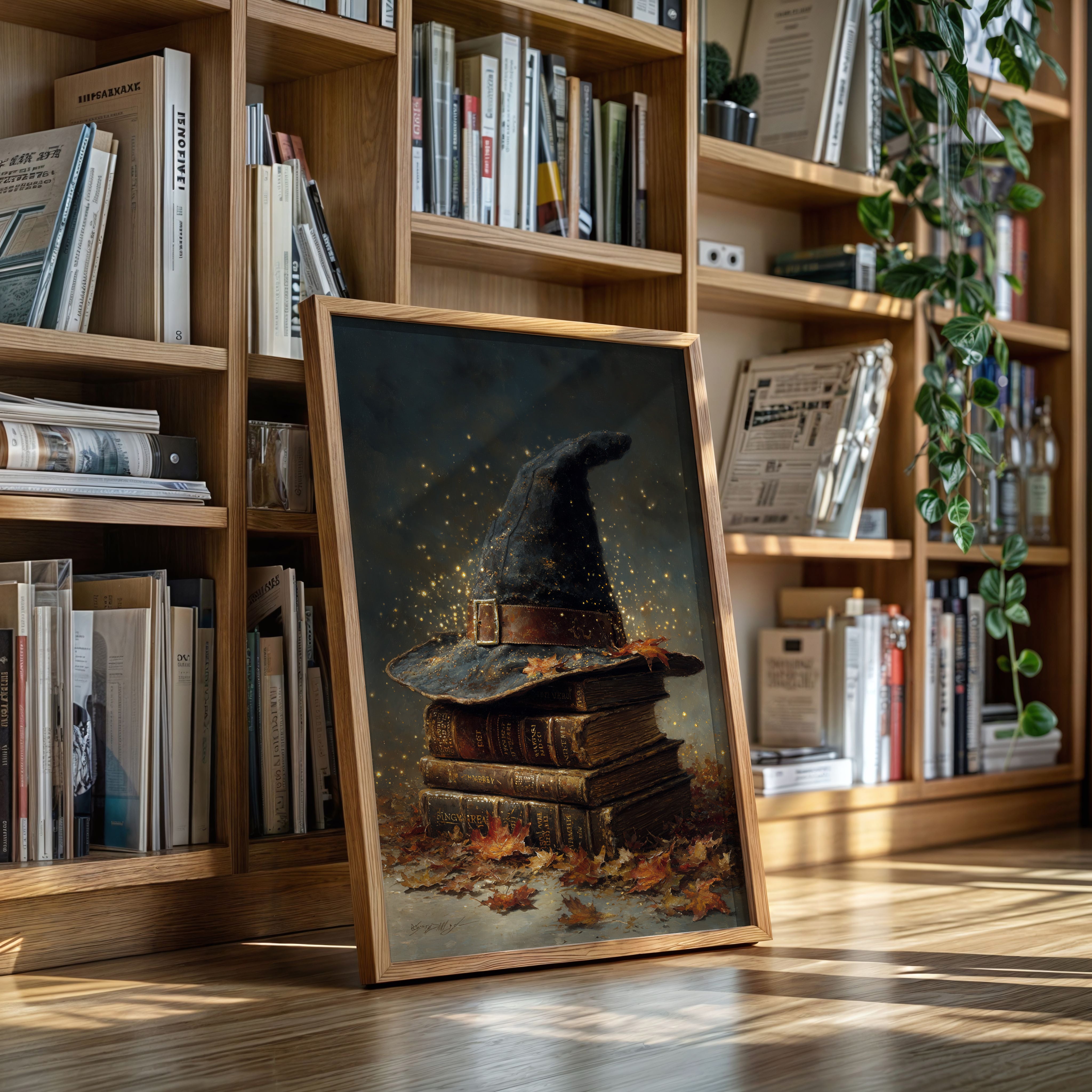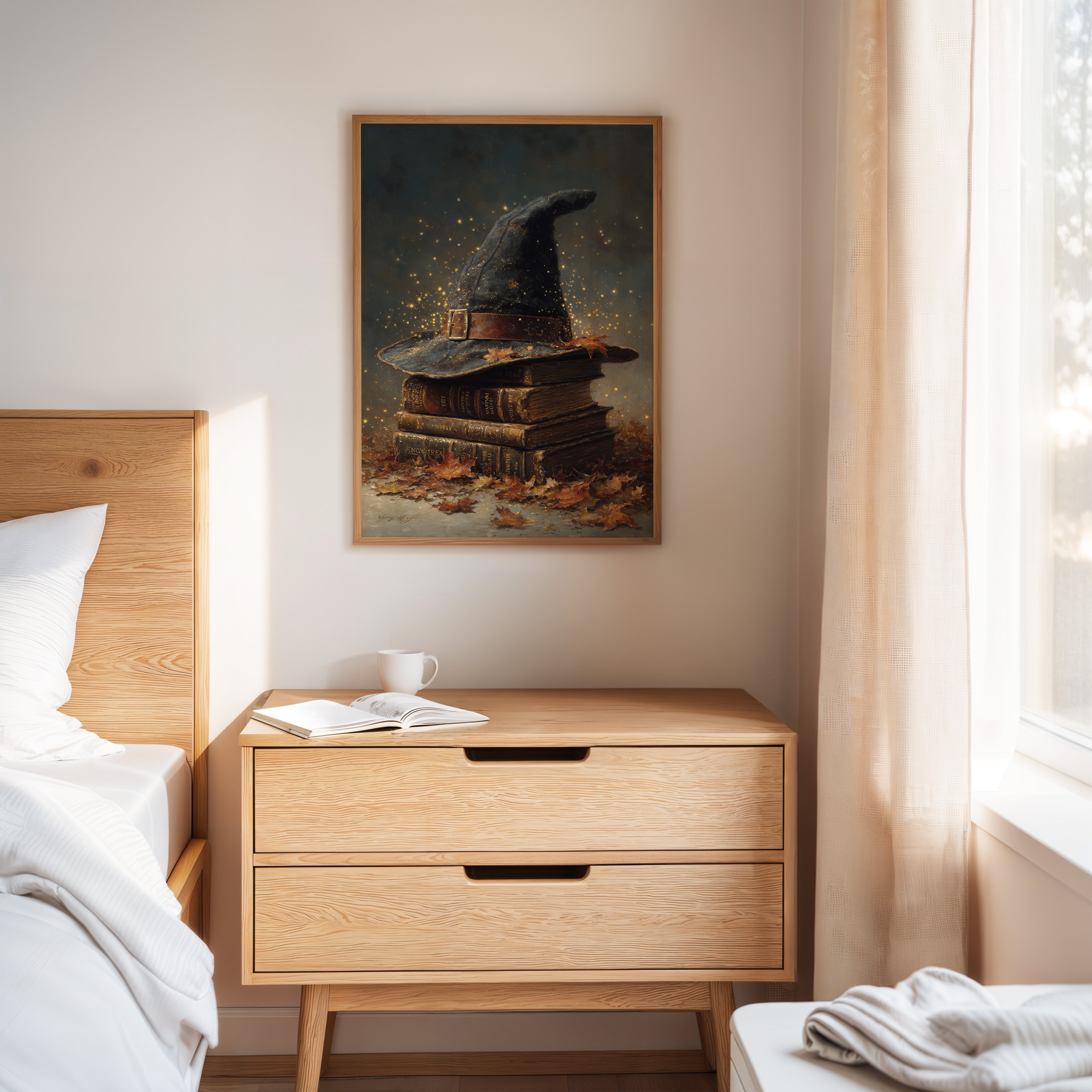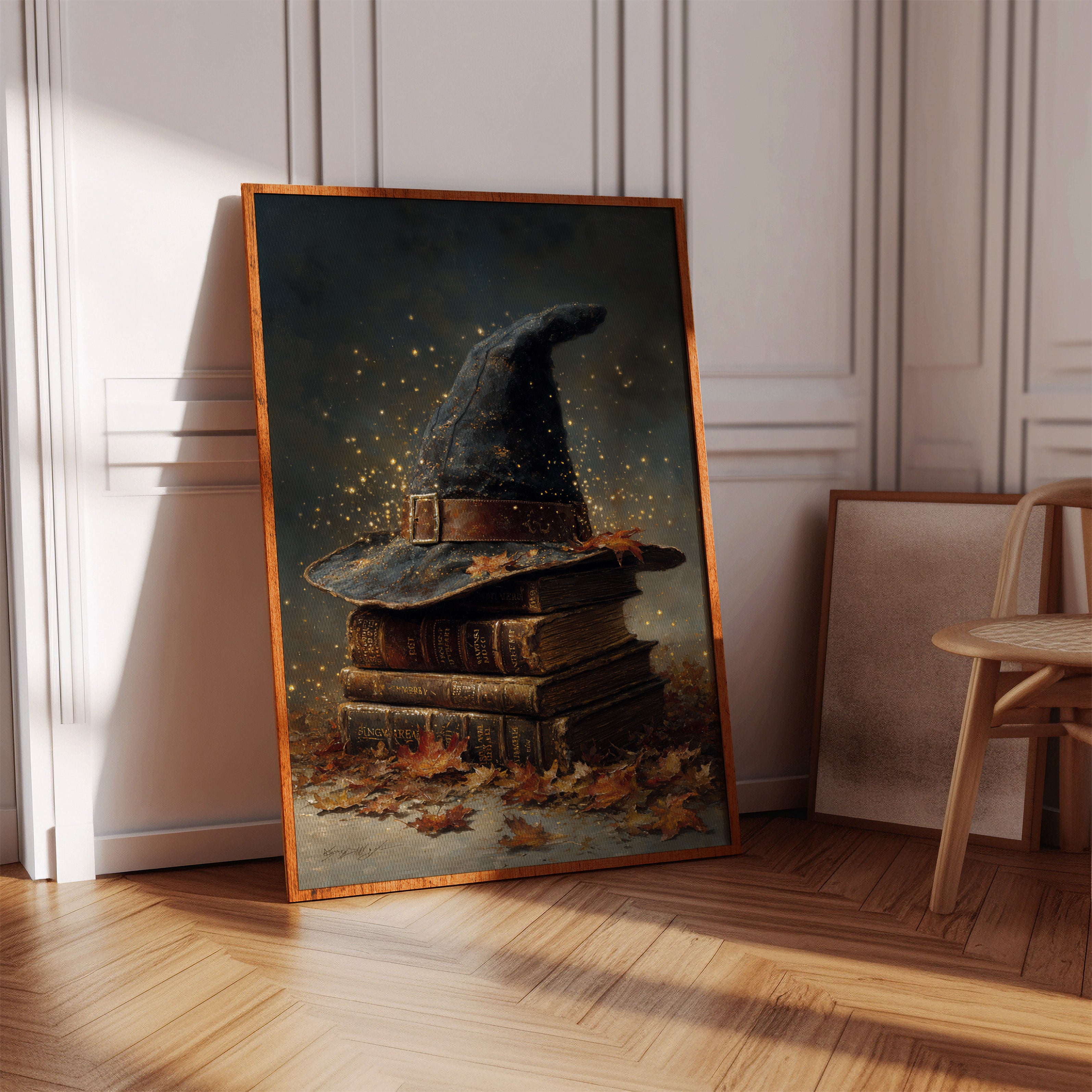 In a realm where stories linger, a worn hat rests atop ancient tomes, its fabric whispering tales of enchantment. This piece embodies the spirit of contemporary magic, inviting curiosity and wonder. Golden sparks dance in the air, illuminating the vibrant autumn leaves scattered around, each one a reminder of seasons passing and stories waiting to be told. Perfect for a cozy reading nook or an imaginative child's room, this artwork inspires moments of reflection and creativity.