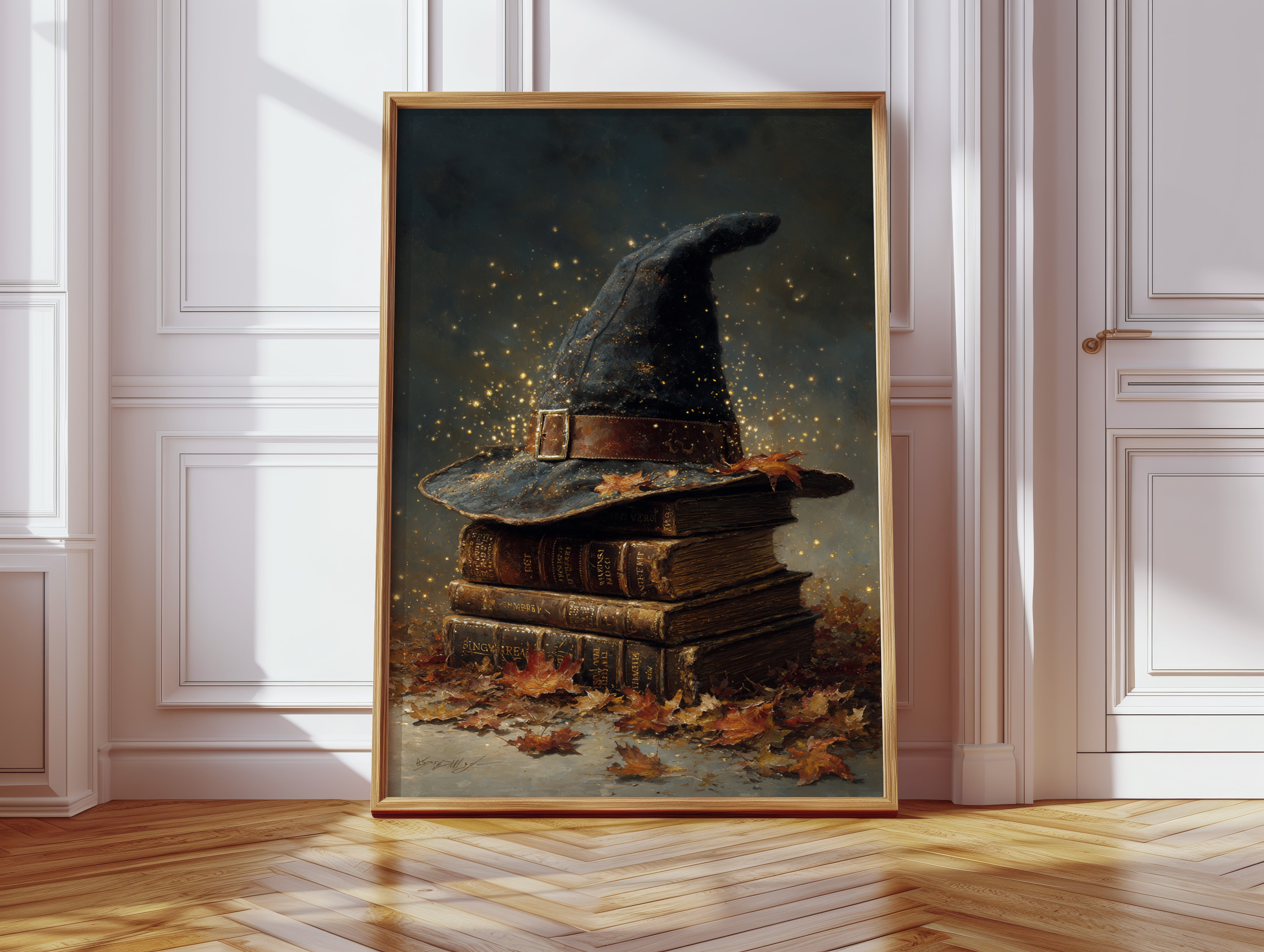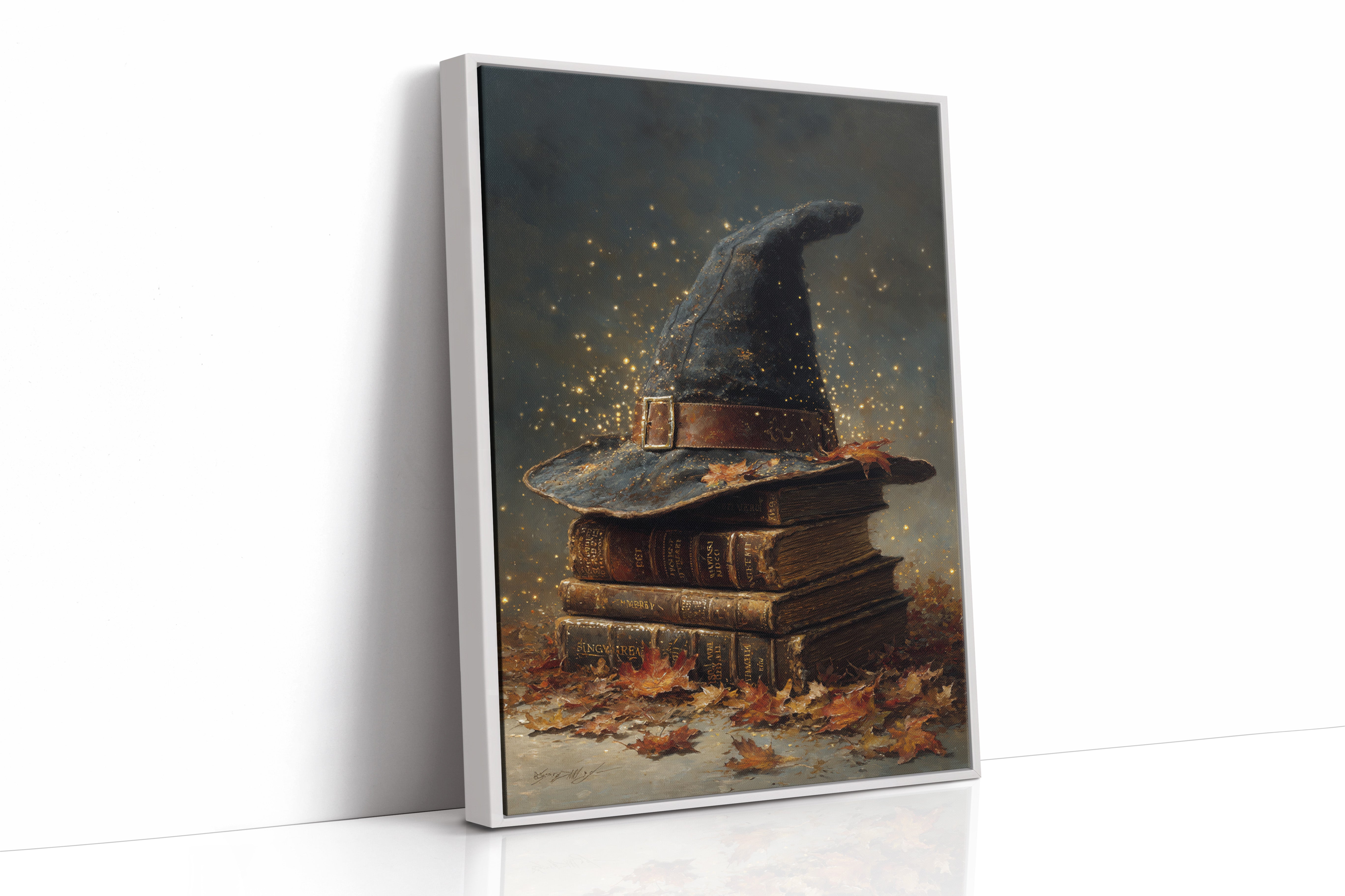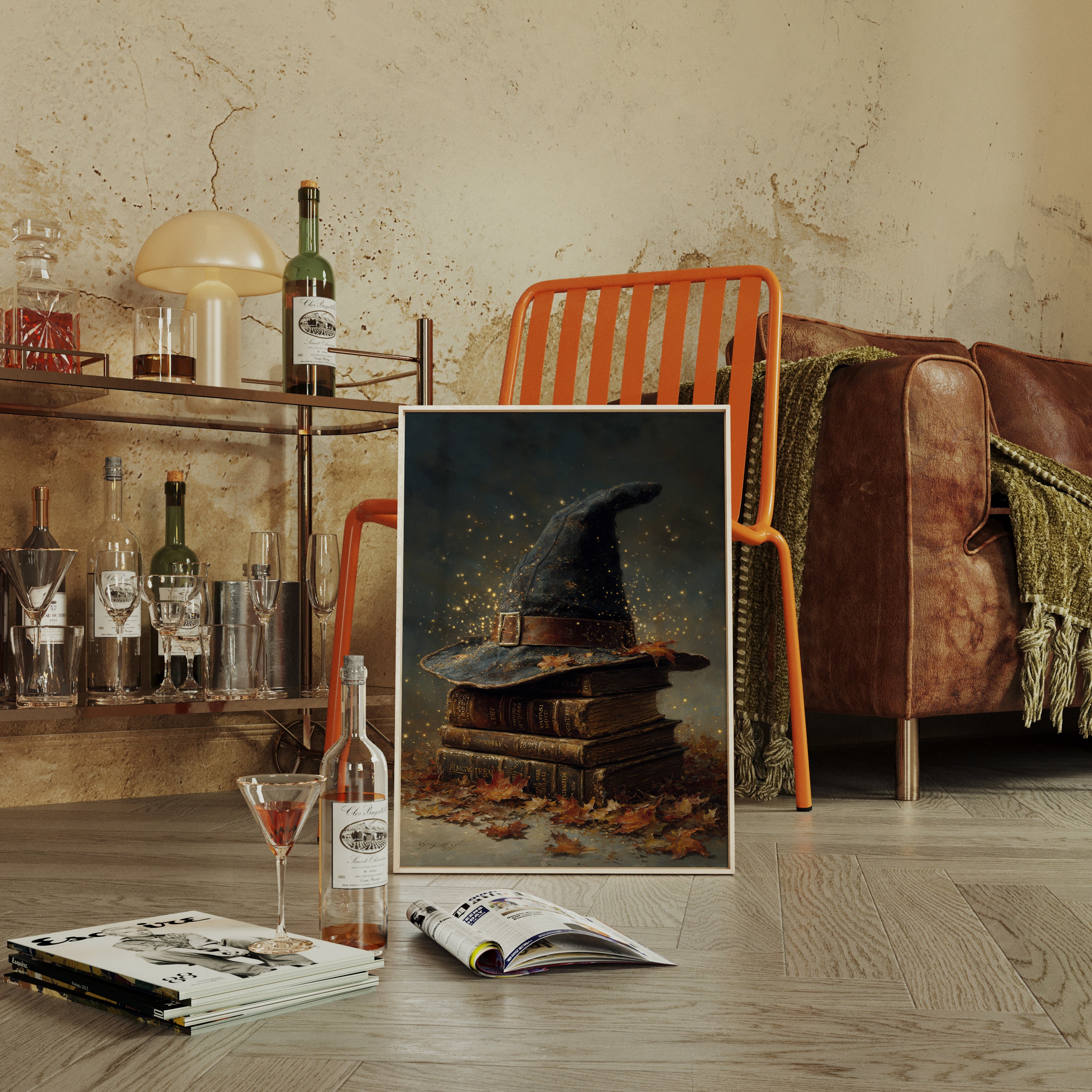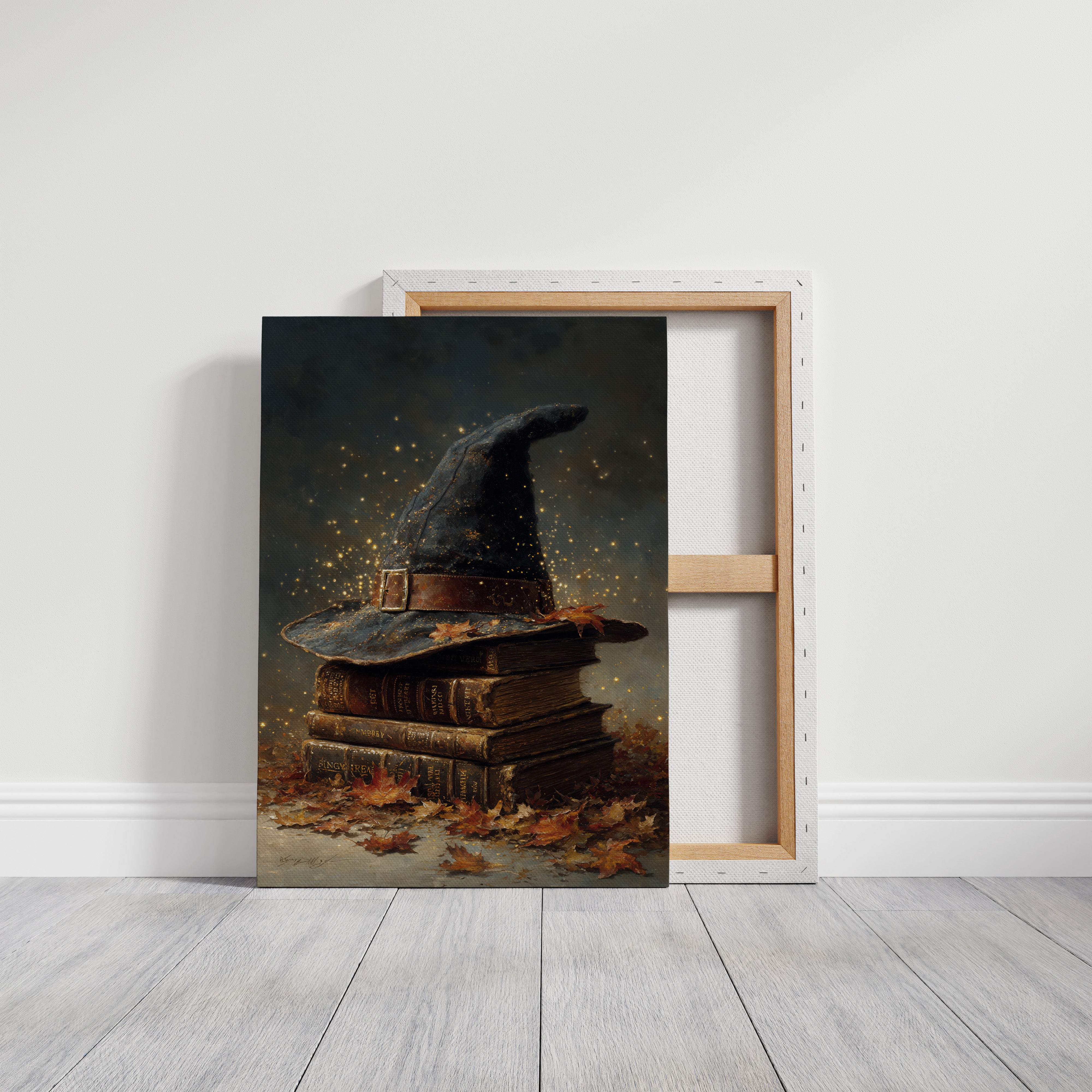 In a realm where stories linger, a worn hat rests atop ancient tomes, its fabric whispering tales of enchantment. This piece embodies the spirit of contemporary magic, inviting curiosity and wonder. Golden sparks dance in the air, illuminating the vibrant autumn leaves scattered around, each one a reminder of seasons passing and stories waiting to be told. Perfect for a cozy reading nook or an imaginative child's room, this artwork inspires moments of reflection and creativity.