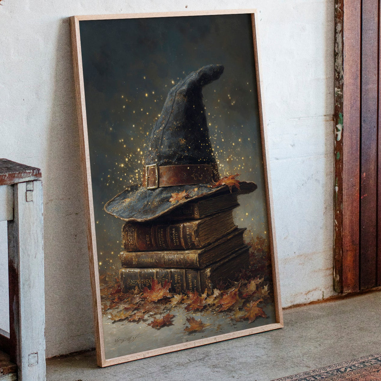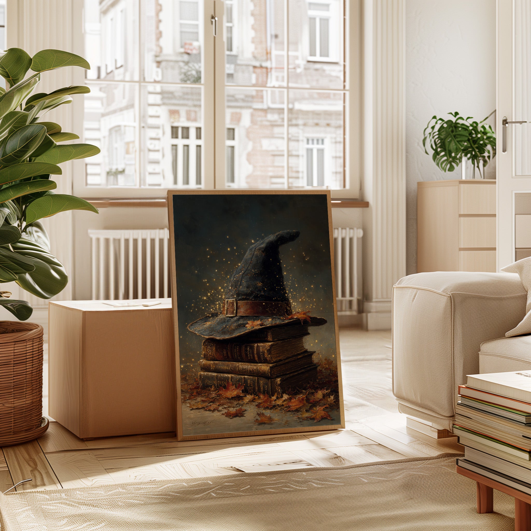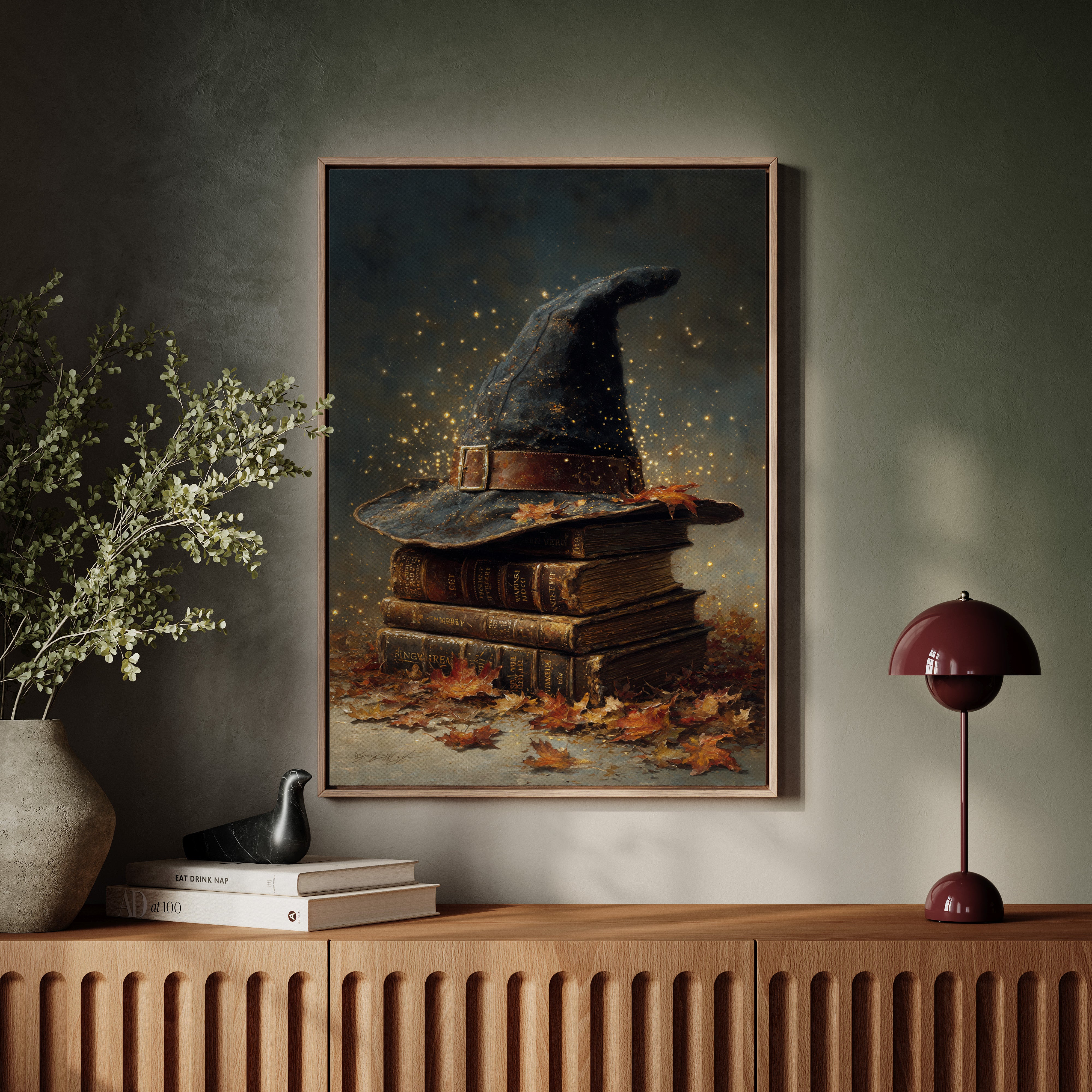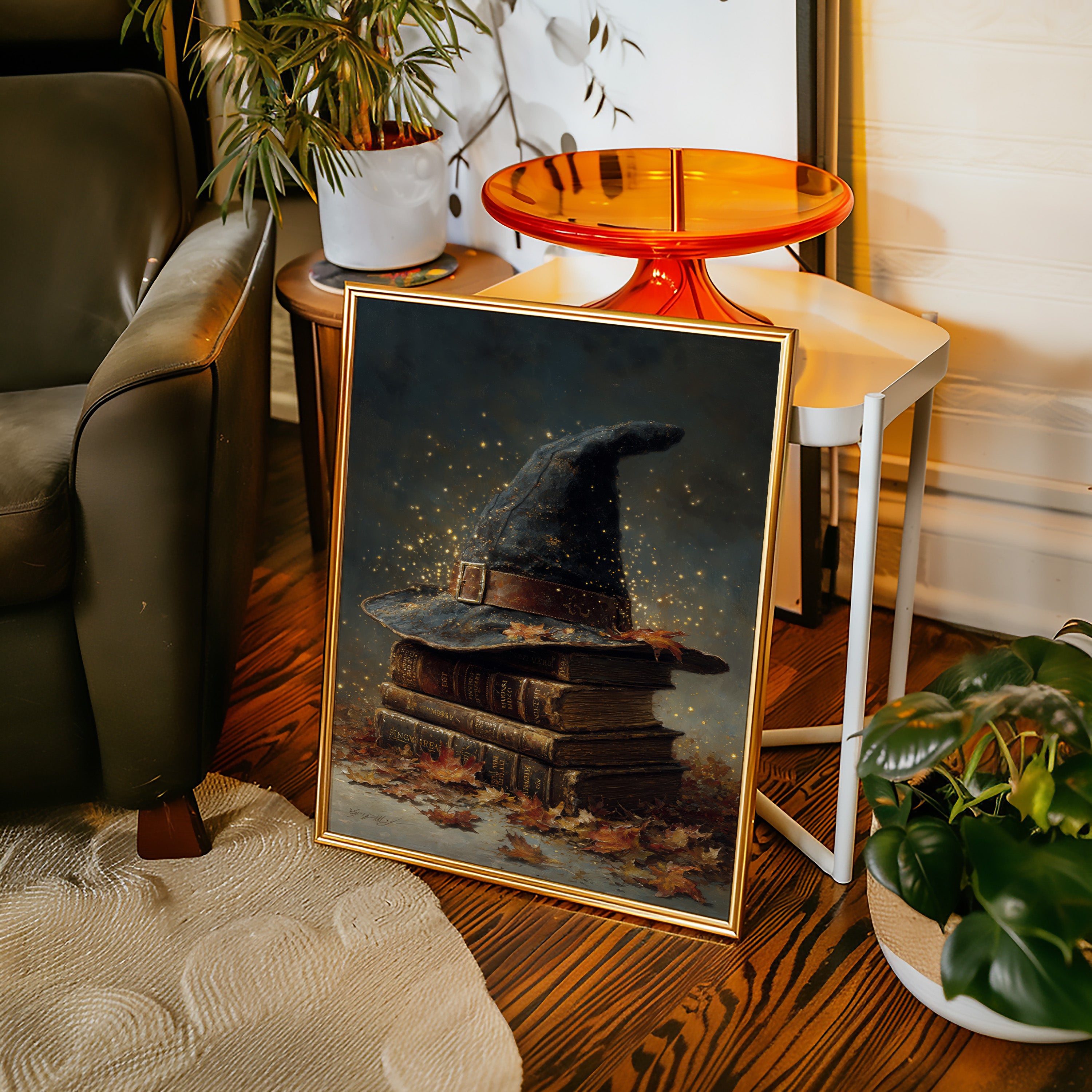 In a realm where stories linger, a worn hat rests atop ancient tomes, its fabric whispering tales of enchantment. This piece embodies the spirit of contemporary magic, inviting curiosity and wonder. Golden sparks dance in the air, illuminating the vibrant autumn leaves scattered around, each one a reminder of seasons passing and stories waiting to be told. Perfect for a cozy reading nook or an imaginative child's room, this artwork inspires moments of reflection and creativity.
