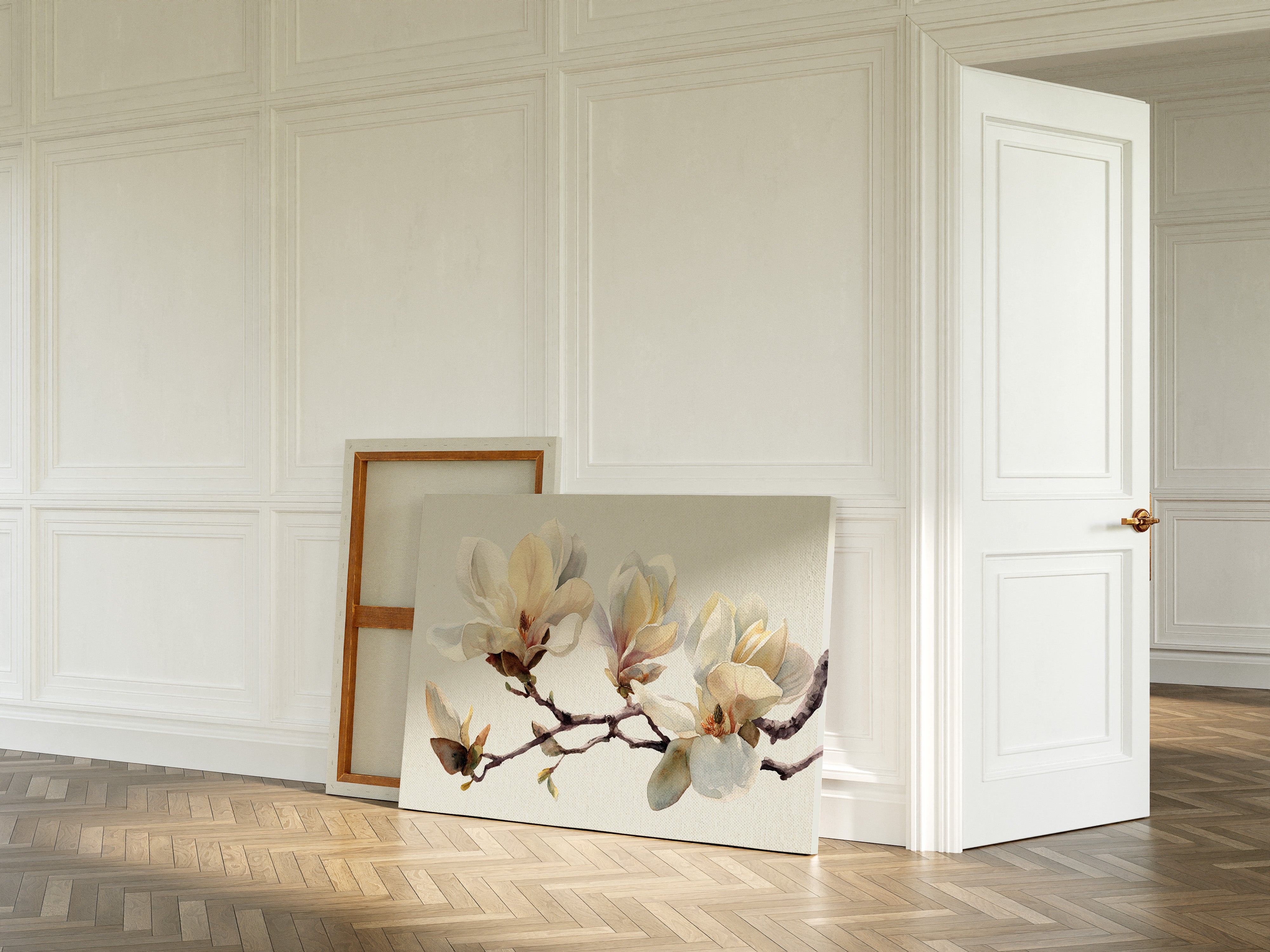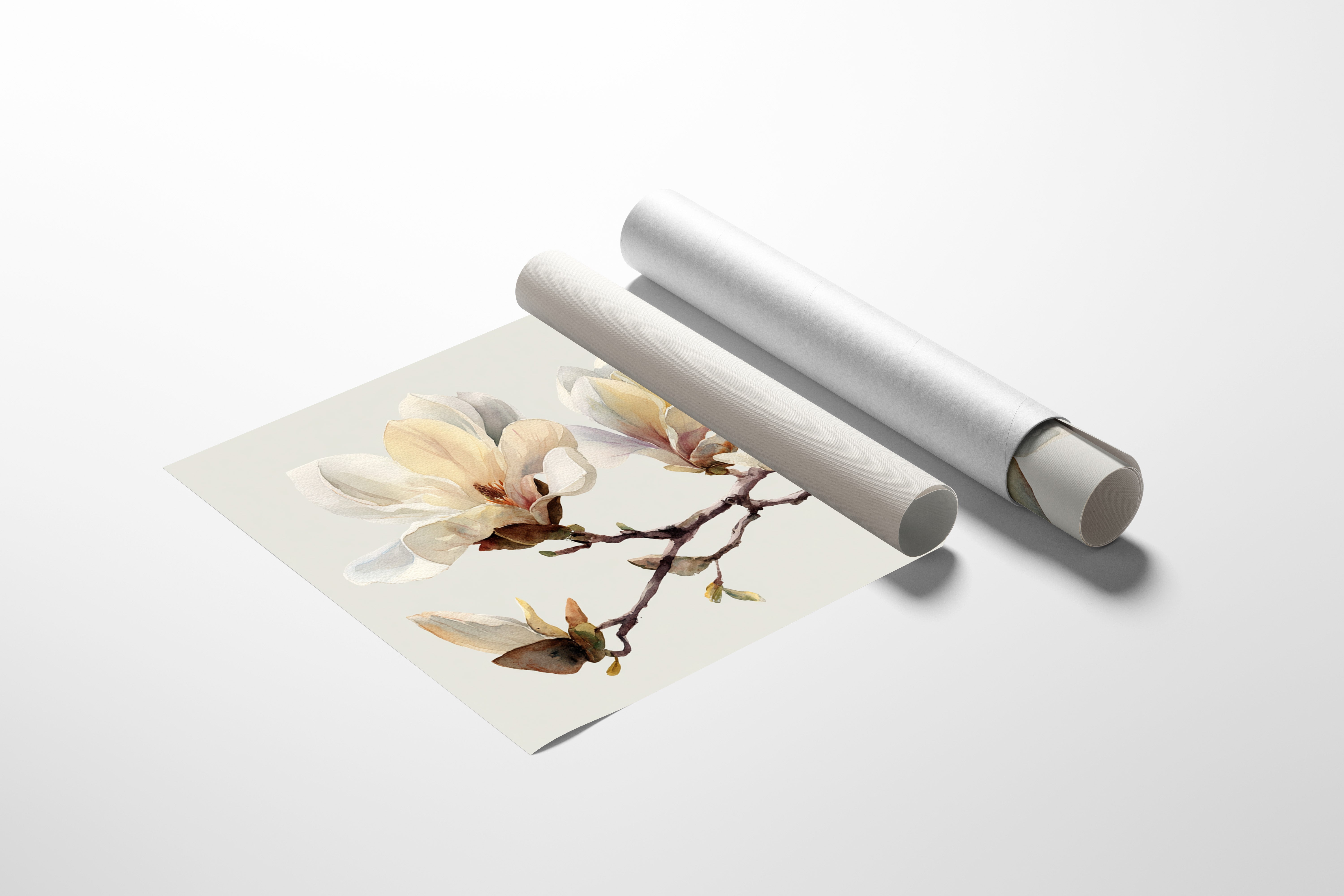 Delicate cream petals unfold like pages of an ancient story, each bloom caught in a graceful pause along the weathered branch. The watercolor technique captures the translucent layers of the magnolia flowers, their subtle shifts from ivory to butter yellow, with hints of dusky rose at their hearts. Dark branches create a dramatic counterpoint to the ethereal blooms, grounding the composition in nature's perfect balance. This piece would bring a touch of springtime serenity to a bedroom or reading nook, where its gentle palette and flowing forms can inspire moments of peaceful contemplation.
