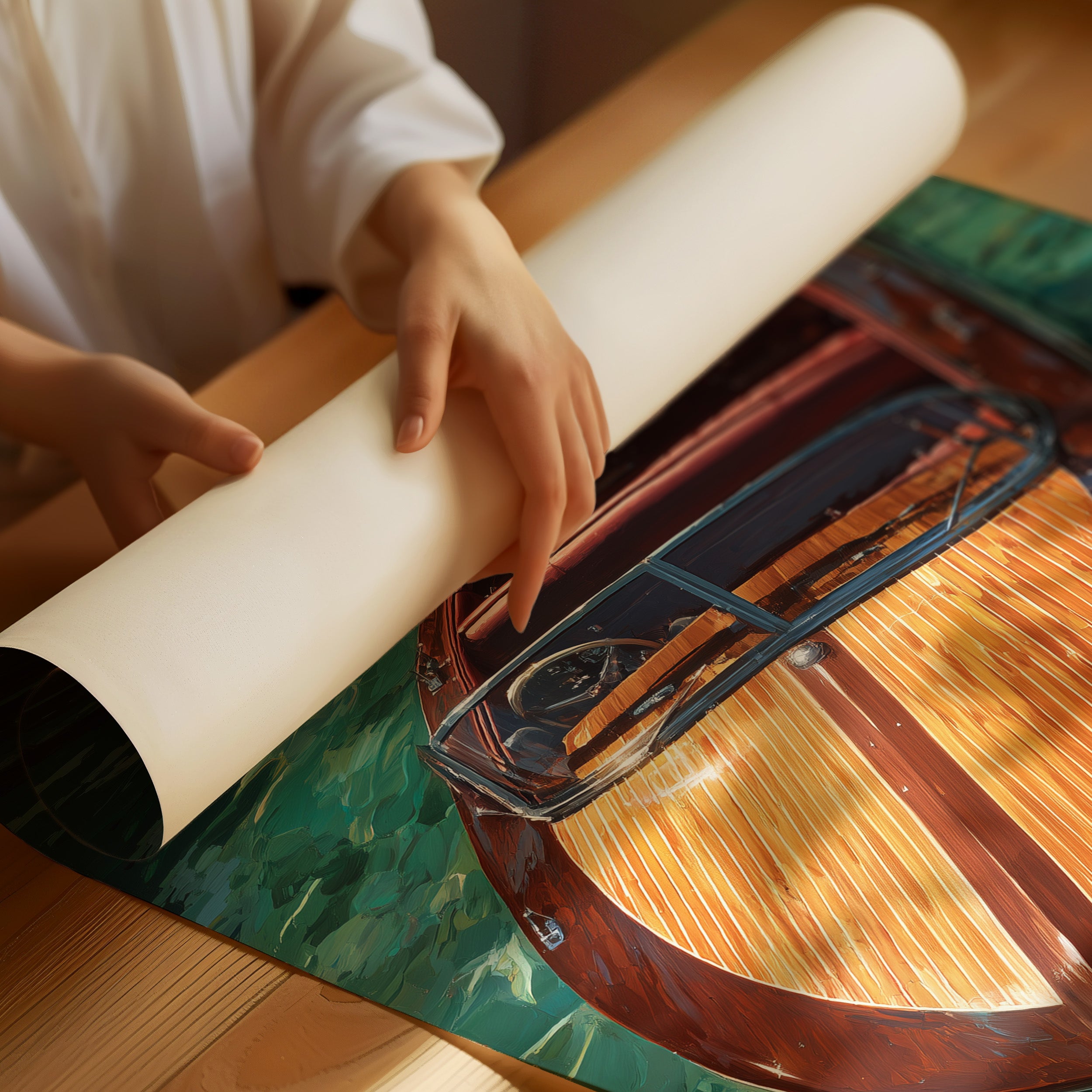 Sunlight dances across polished wood as this classic vessel cuts through crystal-clear waters, leaving gentle ripples in its wake. The rich mahogany deck contrasts beautifully with the emerald depths below, while the American flag flutters with quiet pride at the stern. This nostalgic scene captures the timeless elegance of vintage craftsmanship, where every curve and detail speaks of leisure days spent navigating serene lakes. Perfect for adding a touch of sophisticated adventure to a study, living room, or any space that celebrates classic Americana.