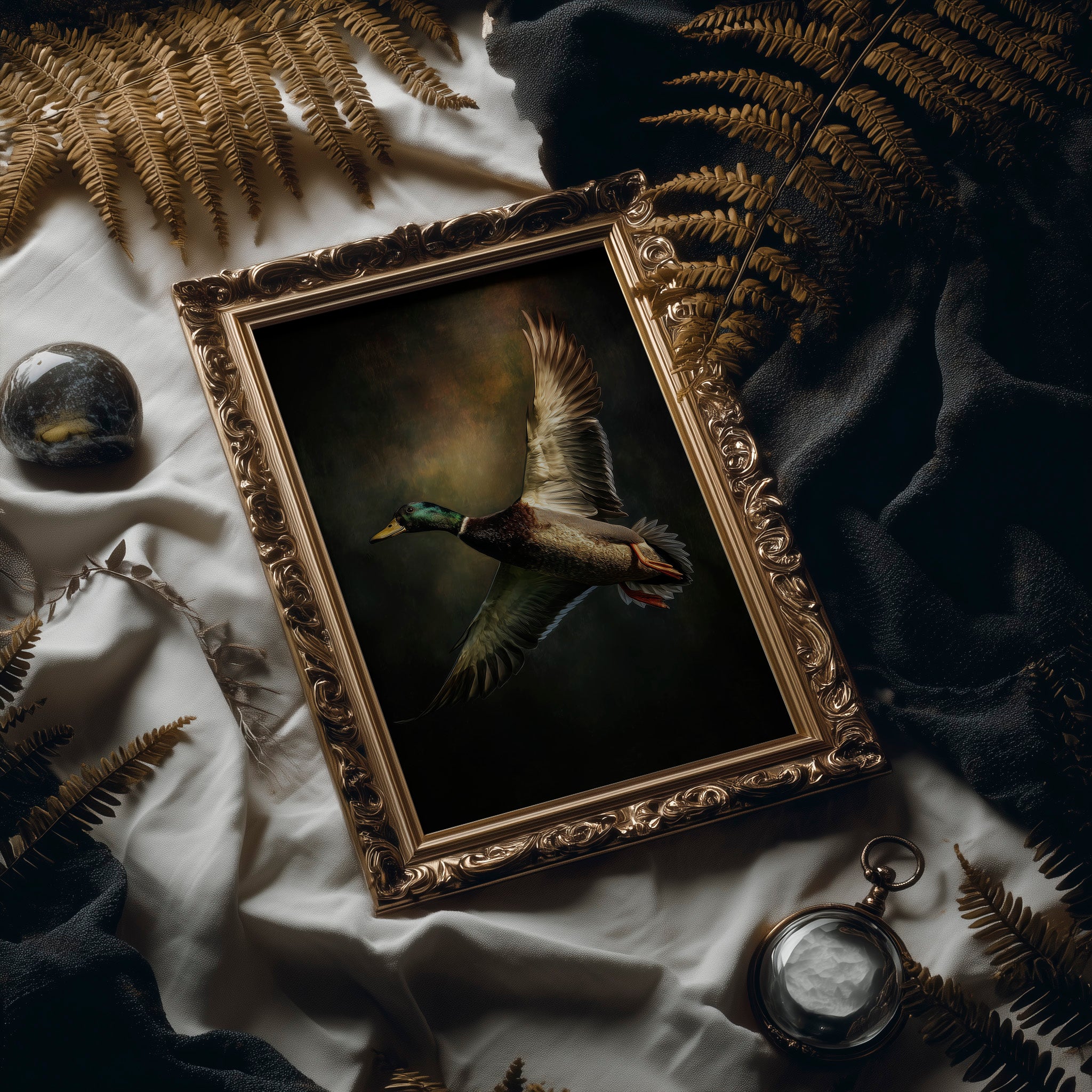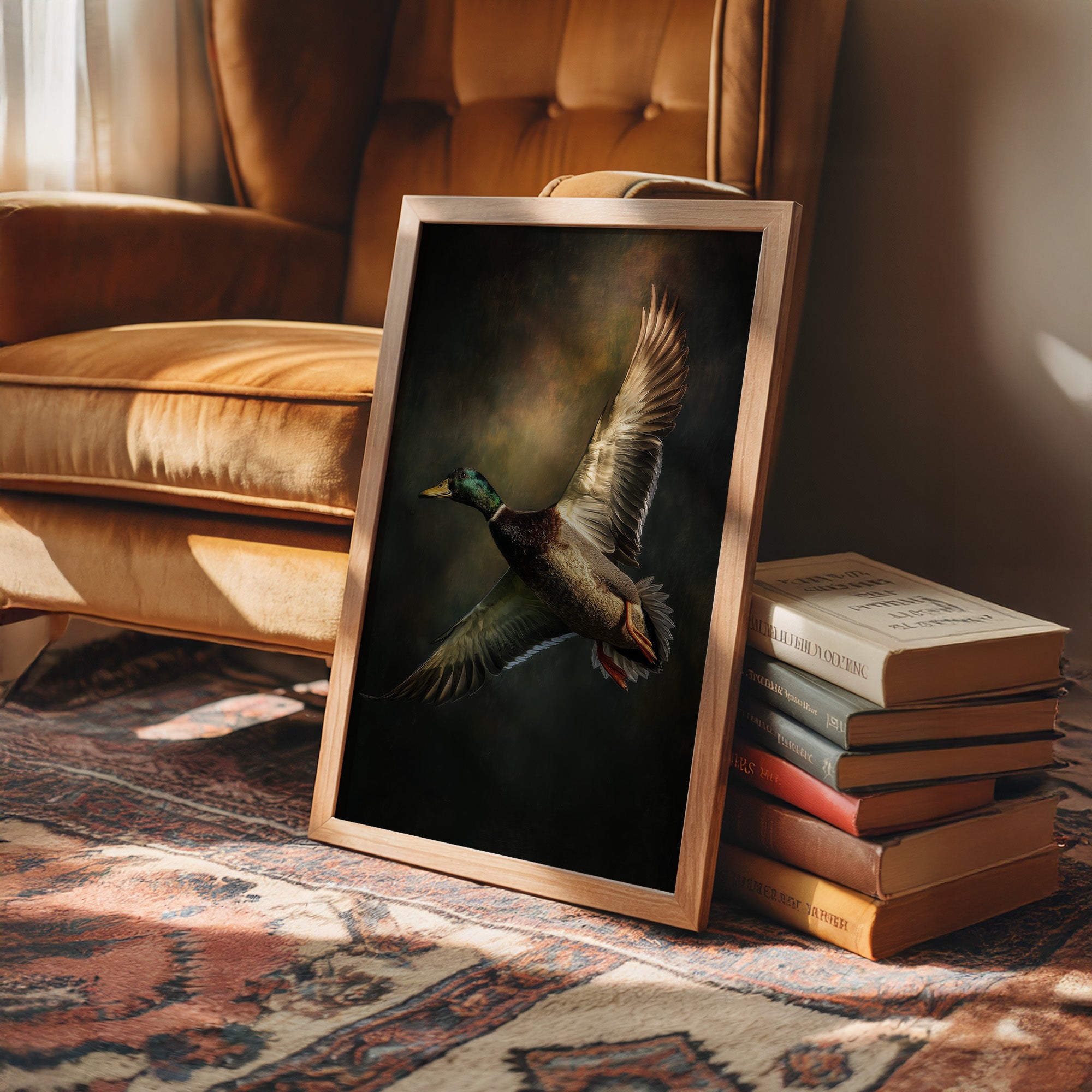 A moment suspended in flight, where time holds its breath as the mallard duck soars through a hazy golden atmosphere. The bird's emerald head catches light against the rich bronze backdrop, while its outstretched wings create a perfect silhouette of wild grace. The painting balances photographic realism with classical portraiture, the atmospheric background lending an almost Renaissance quality to this celebration of natural movement. This striking piece brings sophisticated drama to a study room, library, or dining space where its moody elegance can be fully appreciated.