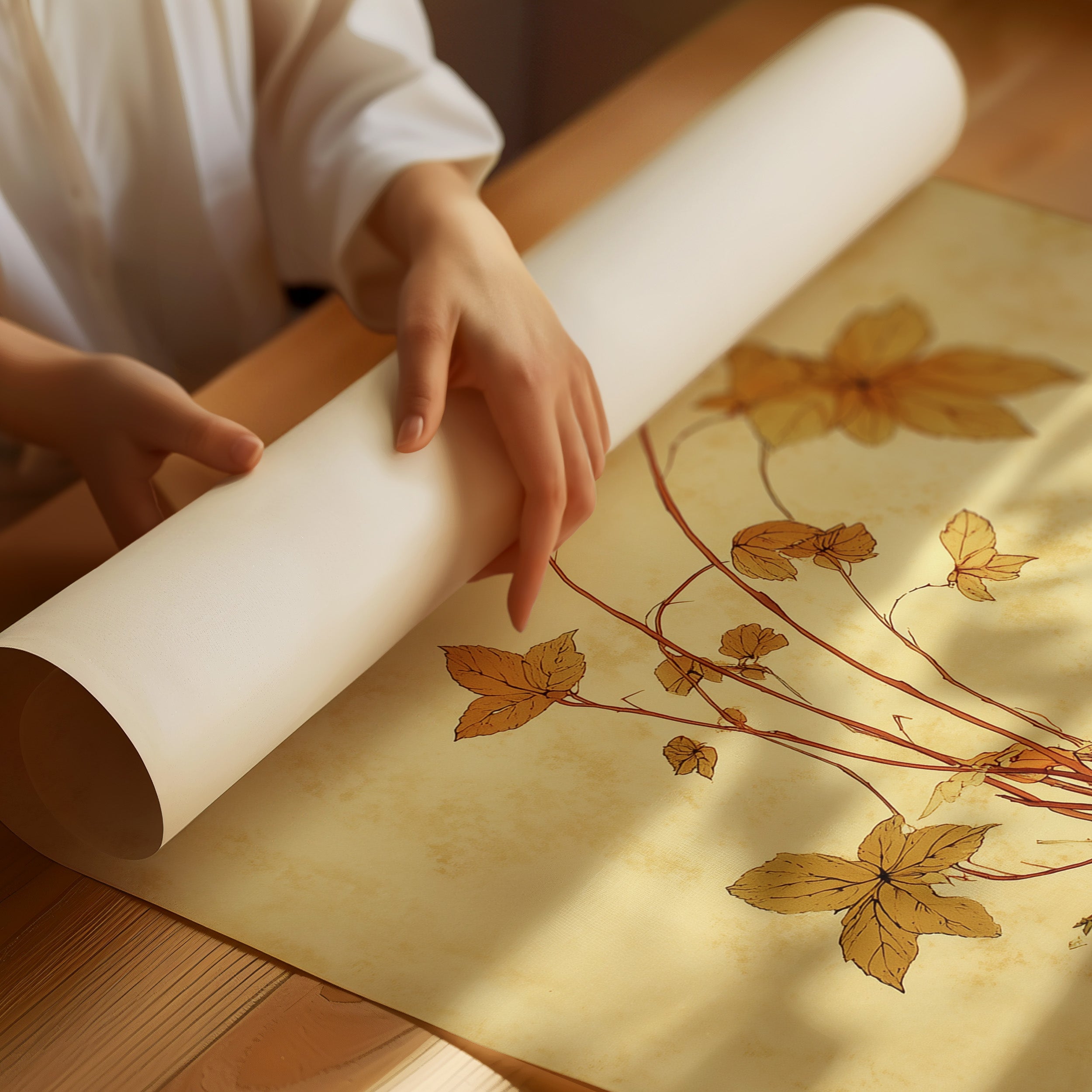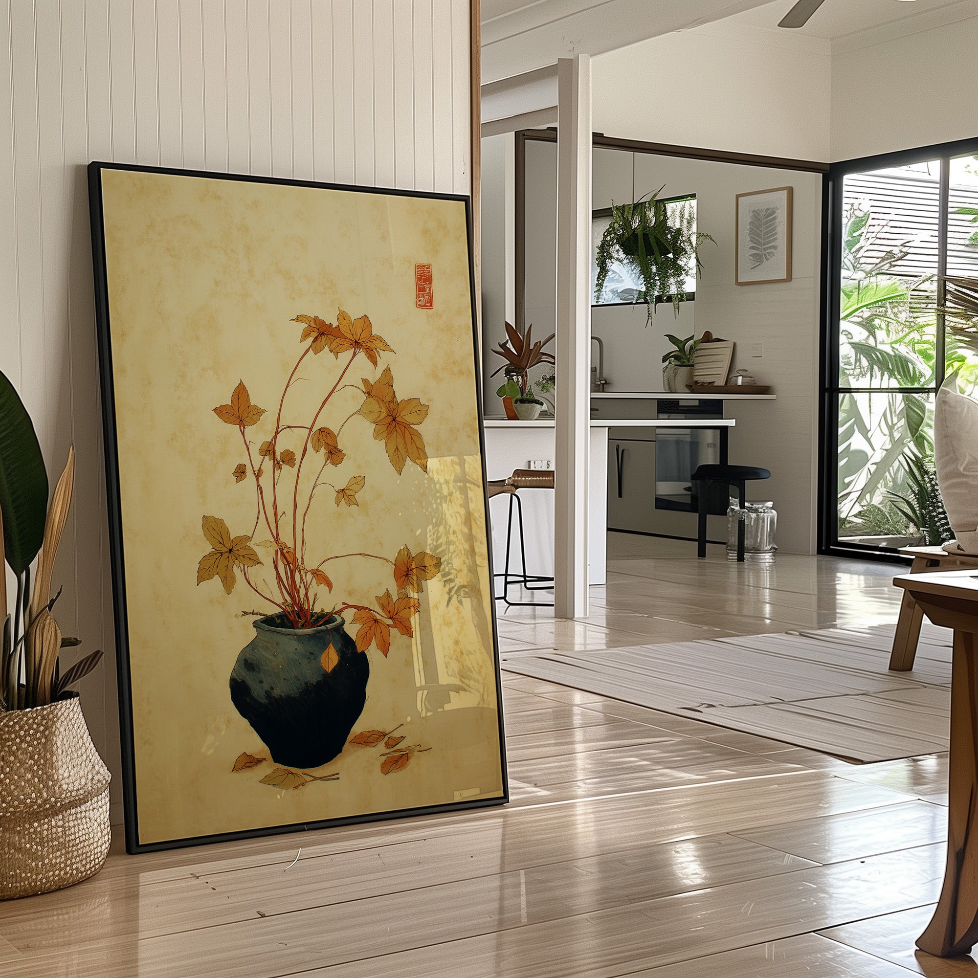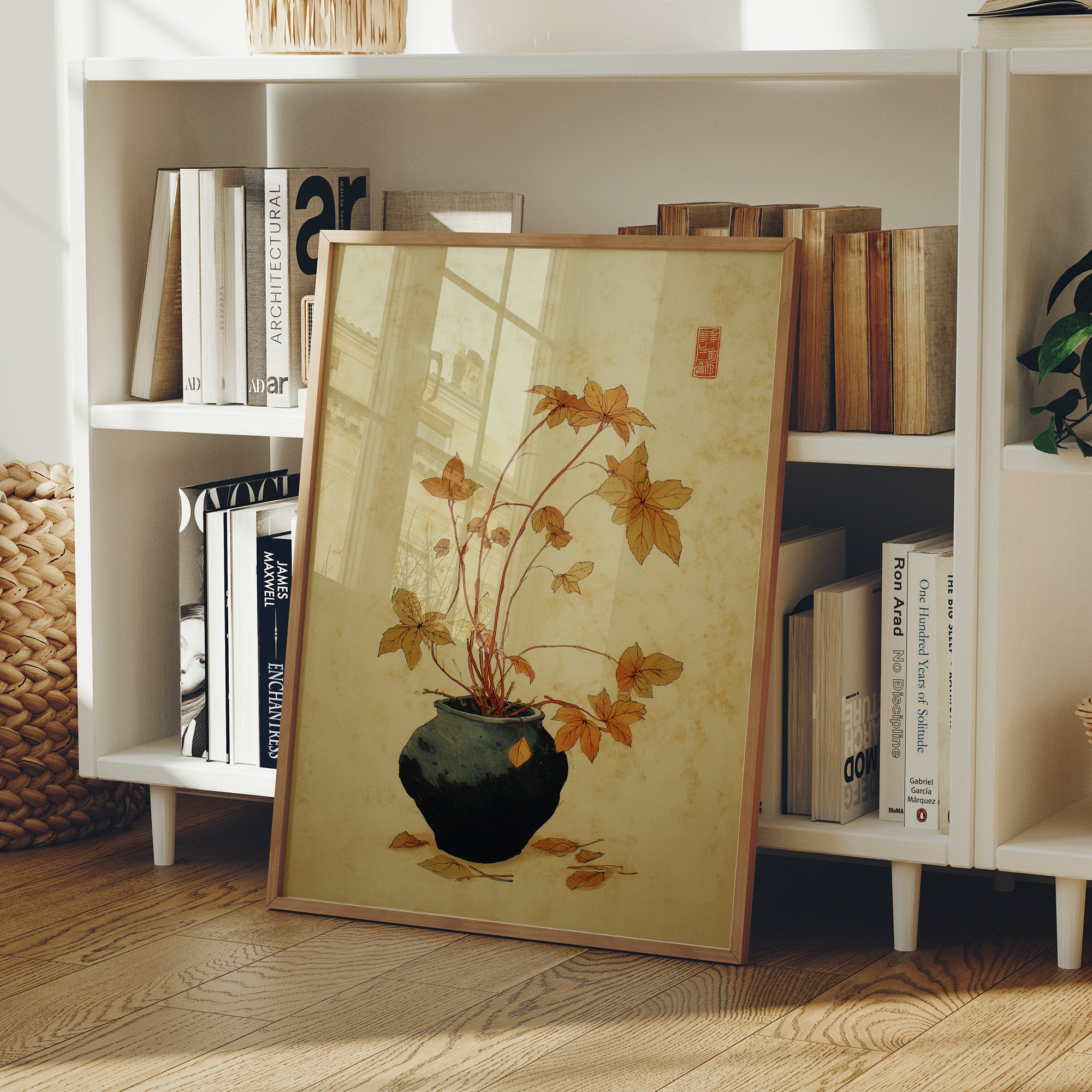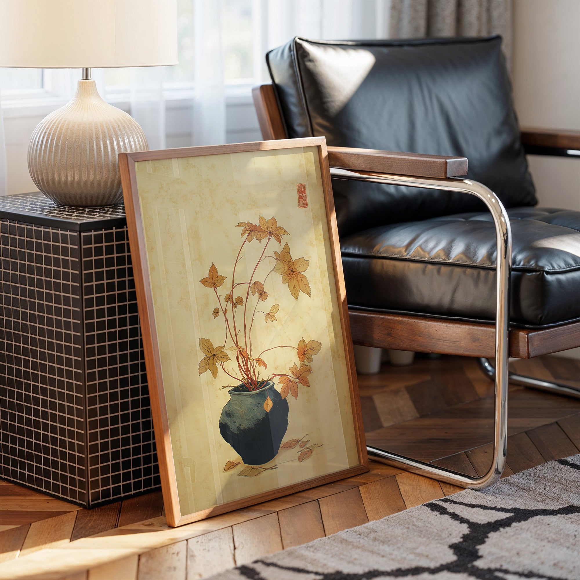 Golden autumn leaves rise gracefully from a deep blue ceramic vessel, their delicate forms captured in traditional Asian brushwork against aged parchment. The composition speaks of seasonal transition, with fallen leaves scattered at the base creating a story of nature's gentle progression. The interplay of amber and indigo tones against the weathered background evokes the timeless beauty of classical botanical studies. This piece would bring serene sophistication to a reading nook or meditation space, where its contemplative energy can be fully appreciated.