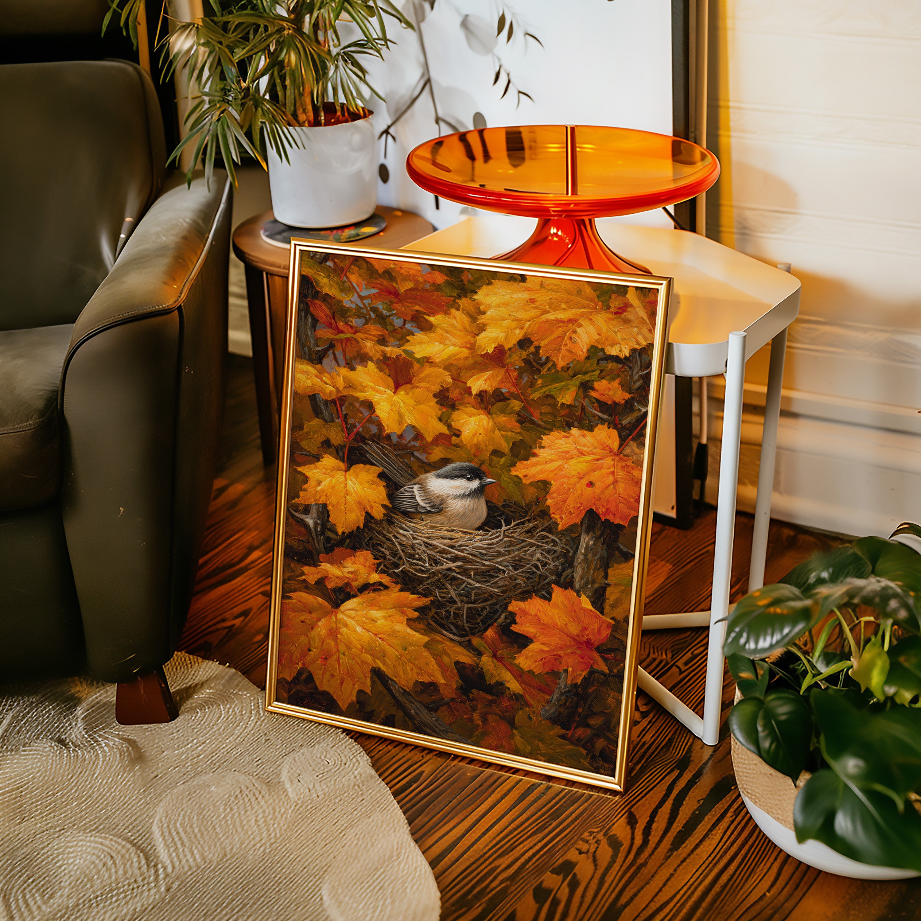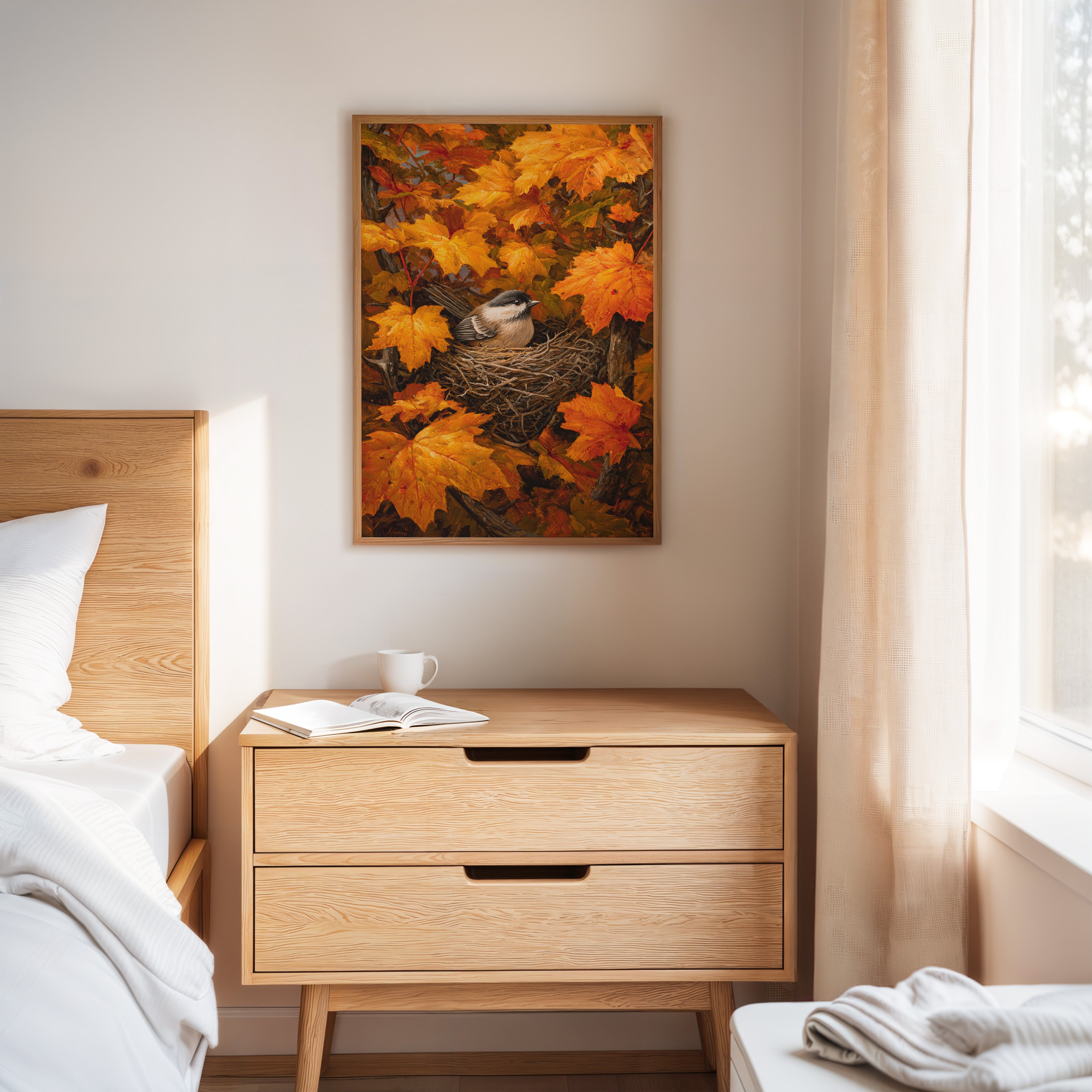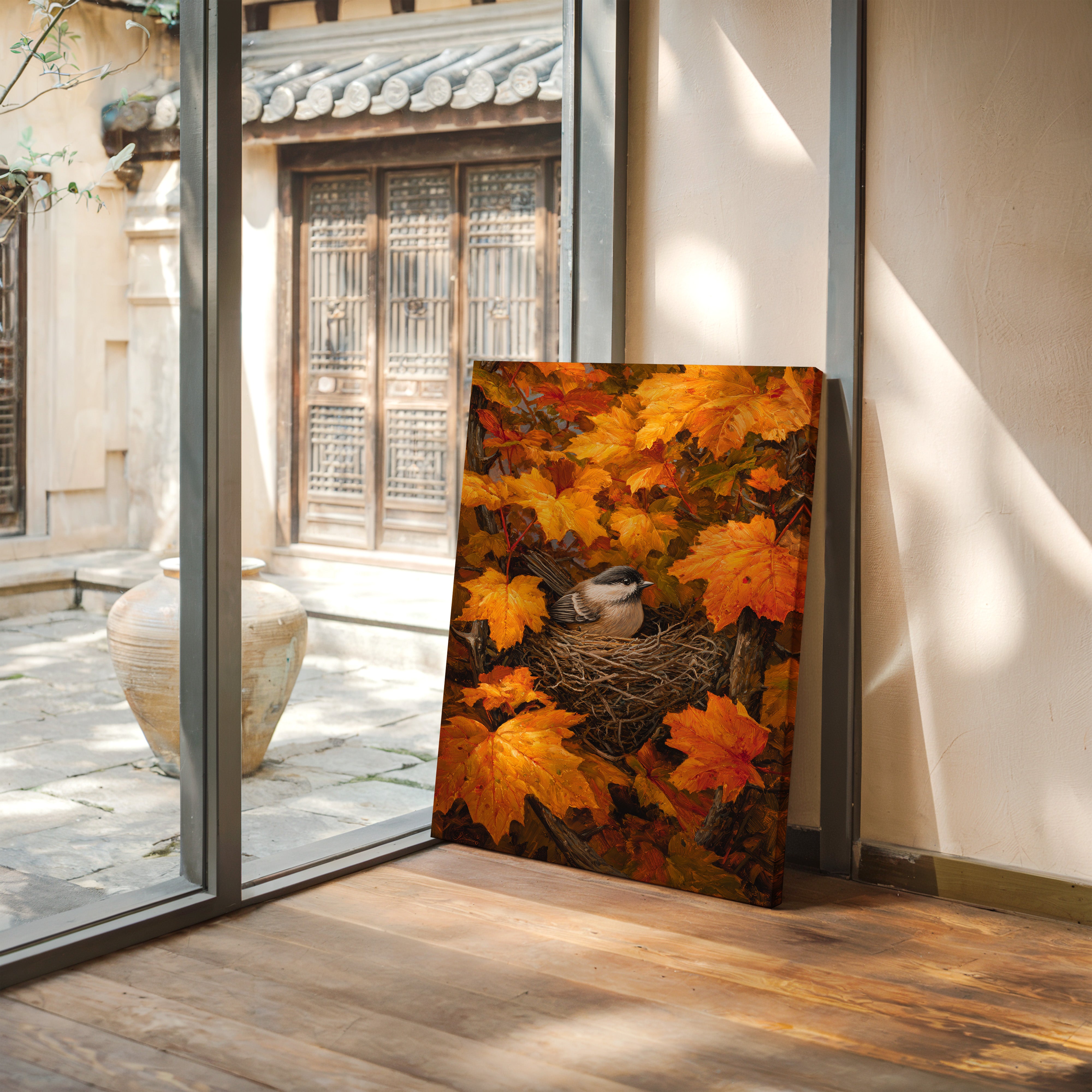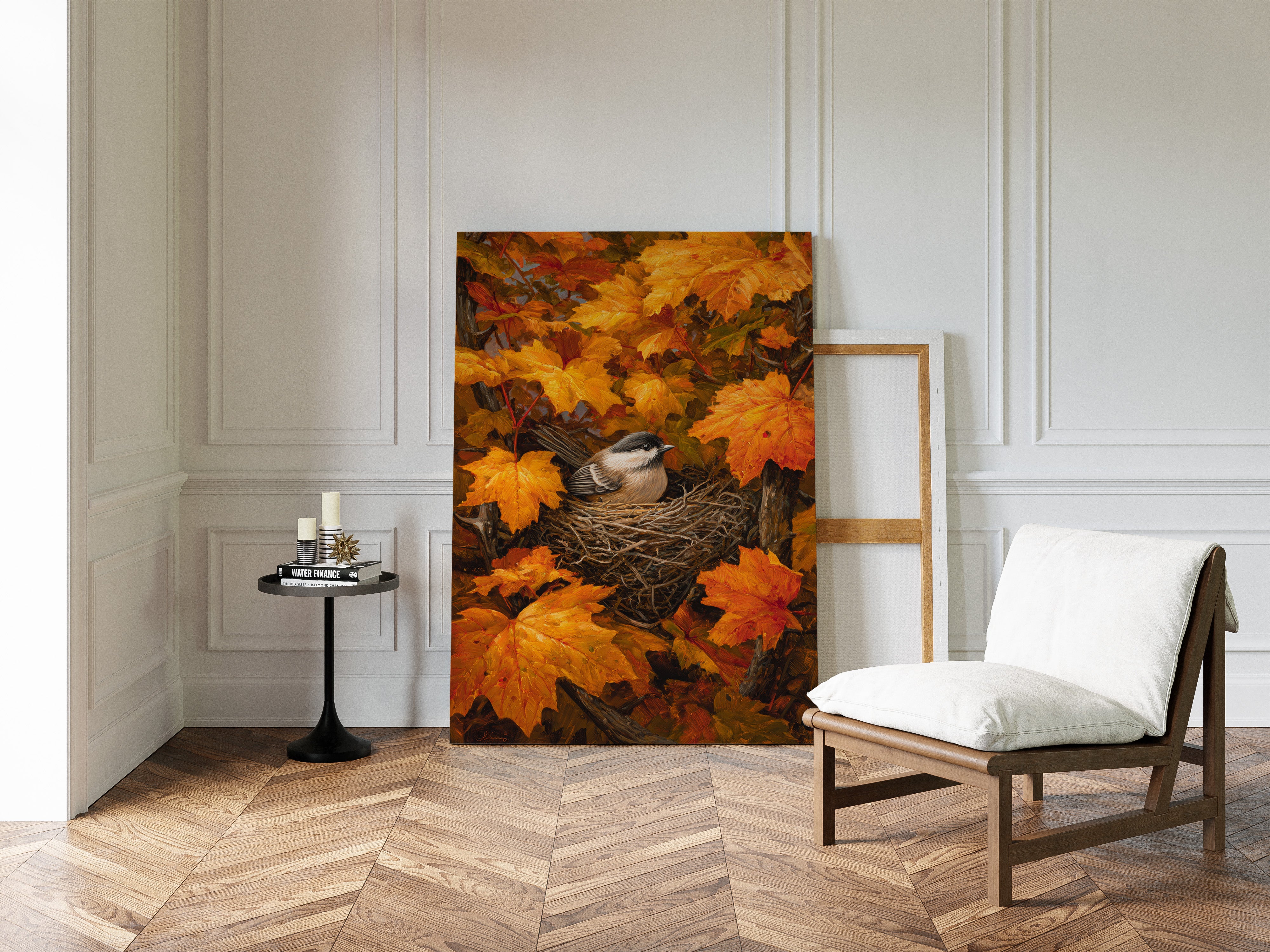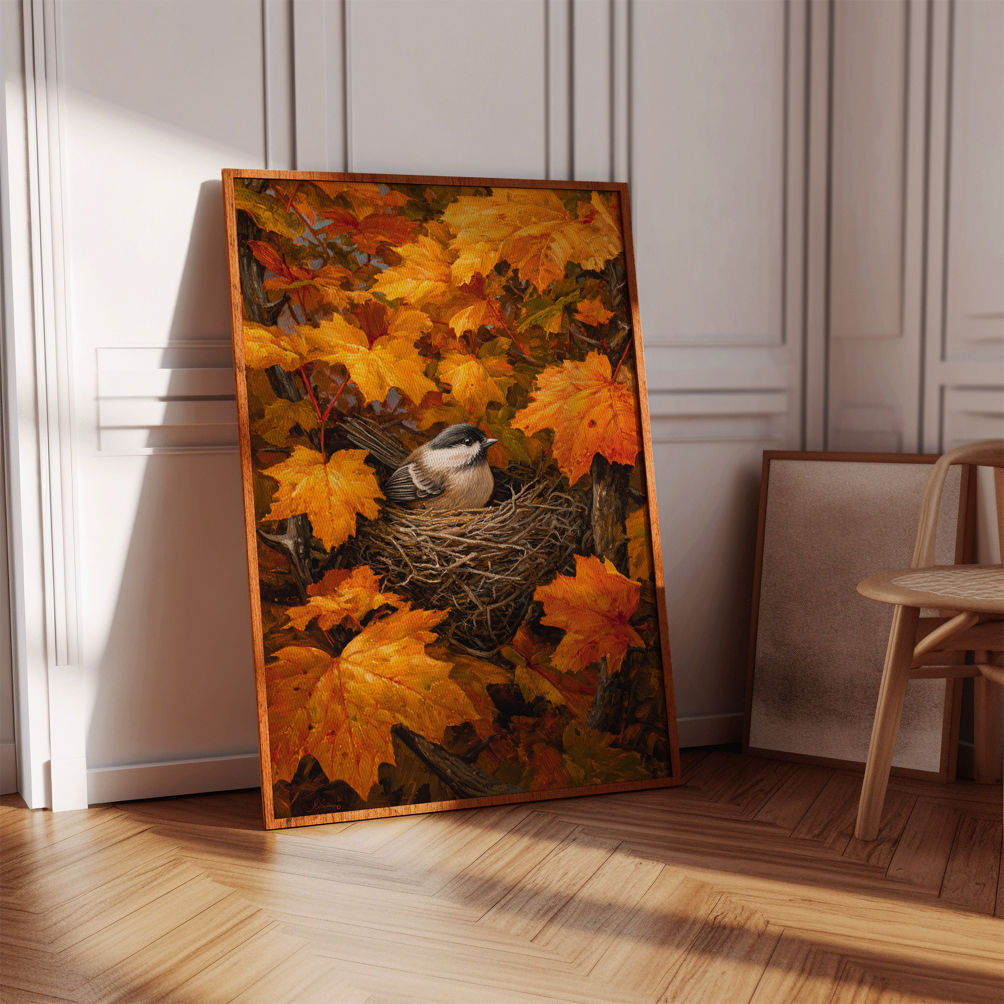Nestled within a fortress of brilliant autumn maple leaves, a small chickadee finds sanctuary in its carefully woven home. Golden sunlight catches each brushstroke of the leaves, creating a natural canopy of warm oranges and deep crimsons that frame the peaceful scene. The intricate detail of the bird's feathers contrasts beautifully with the rustic texture of its twisted twig nest, while the surrounding foliage burns with the intensity of fall's final display. This piece brings the cozy comfort of autumn indoors, perfect for creating a welcoming atmosphere in a reading nook or breakfast area where its warm tones can enhance natural light.