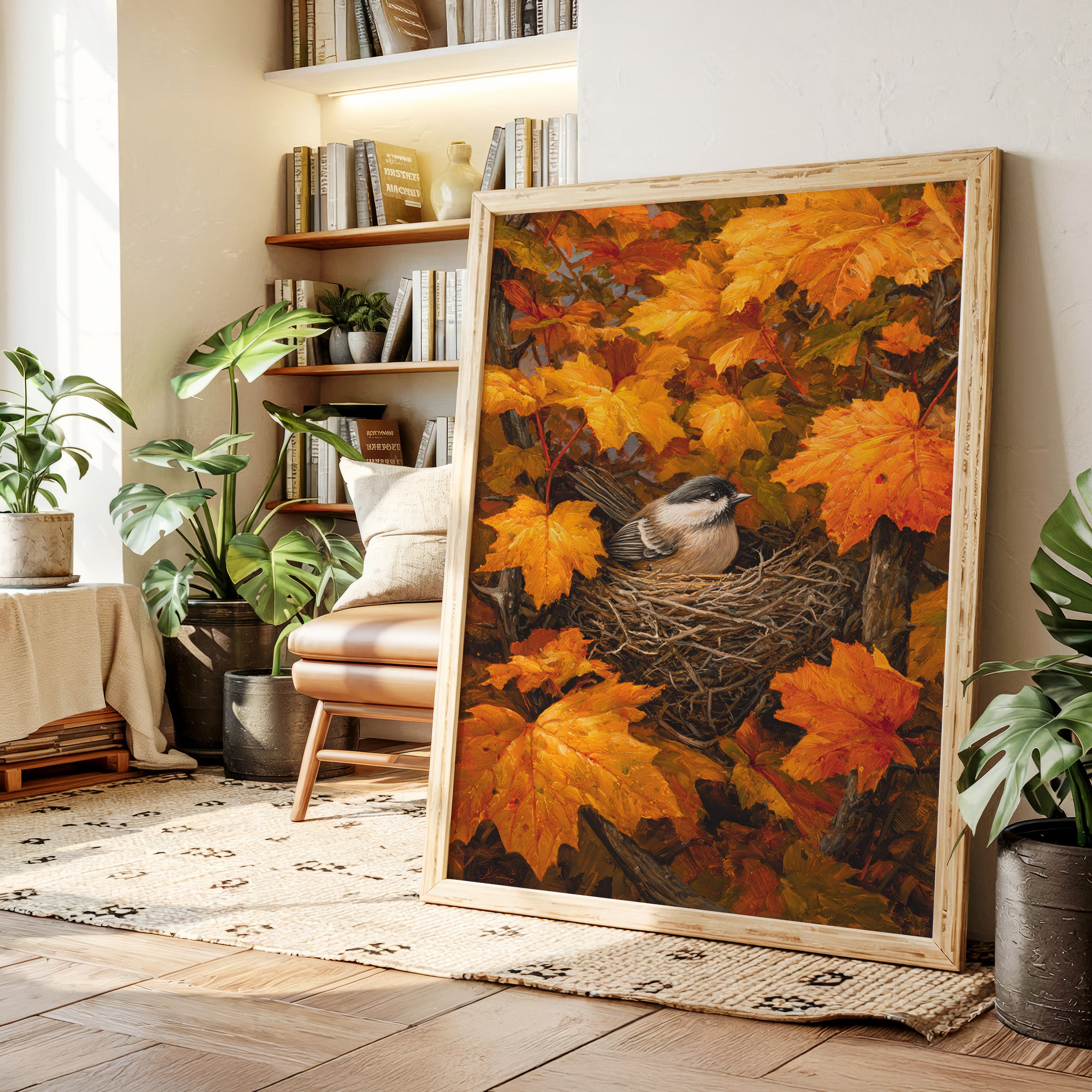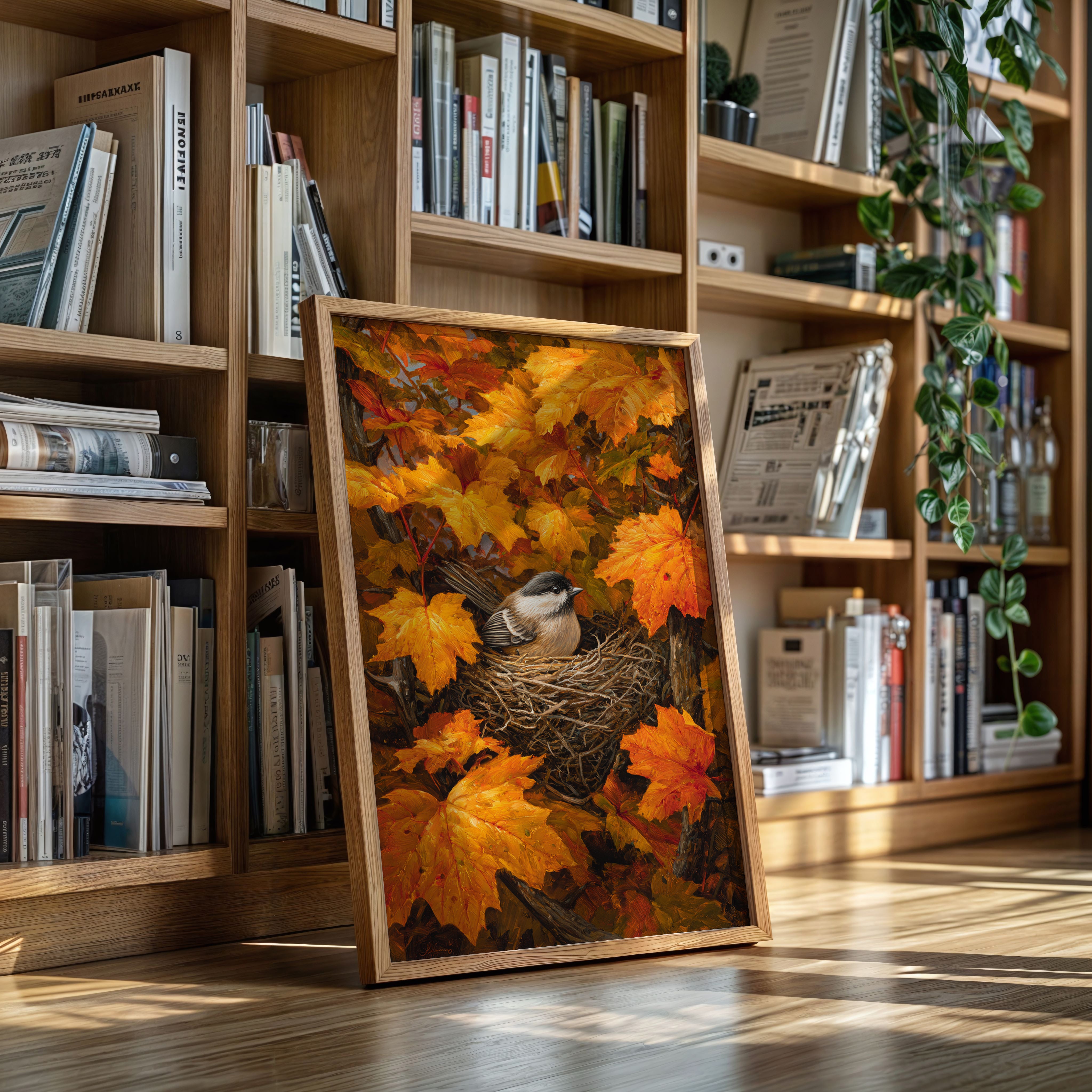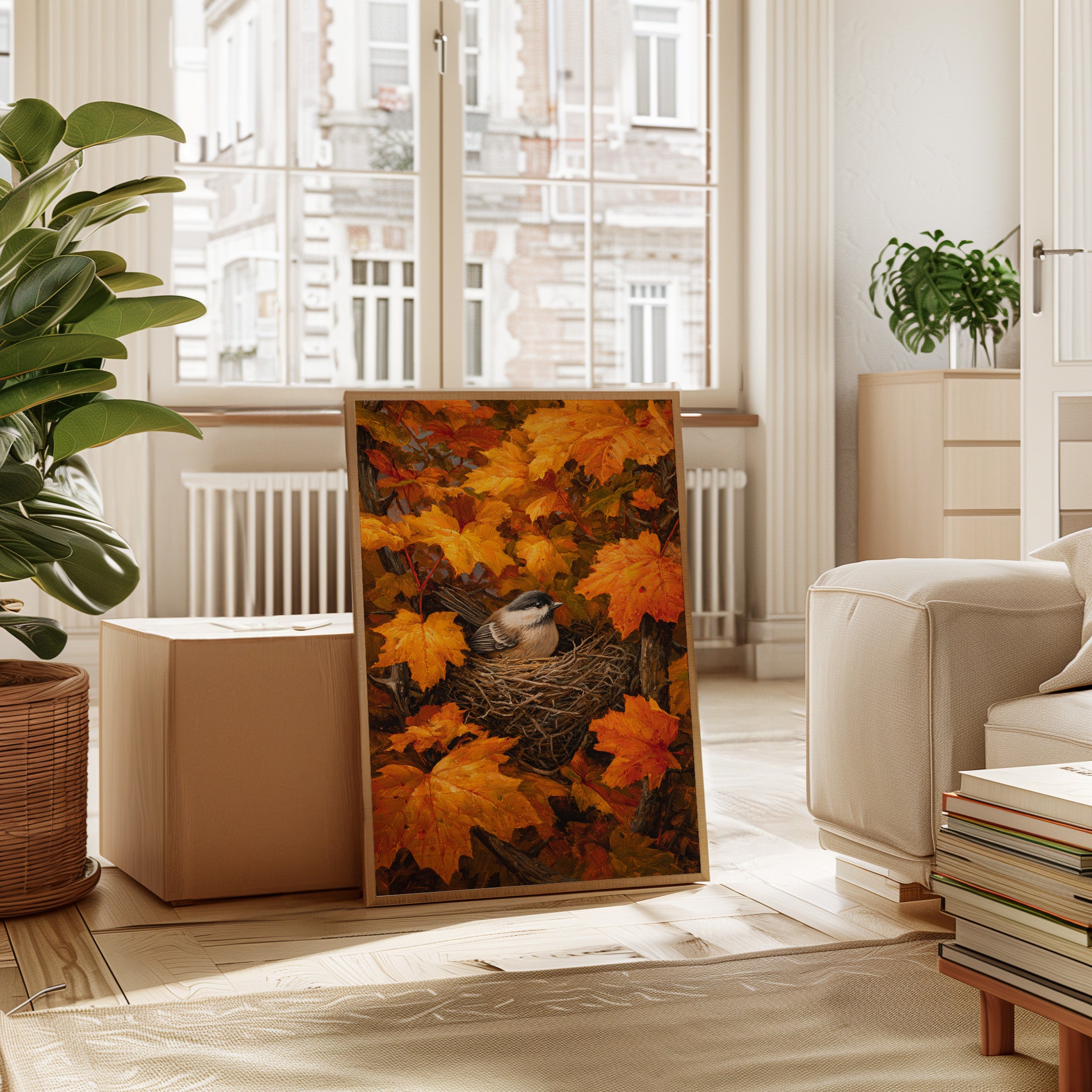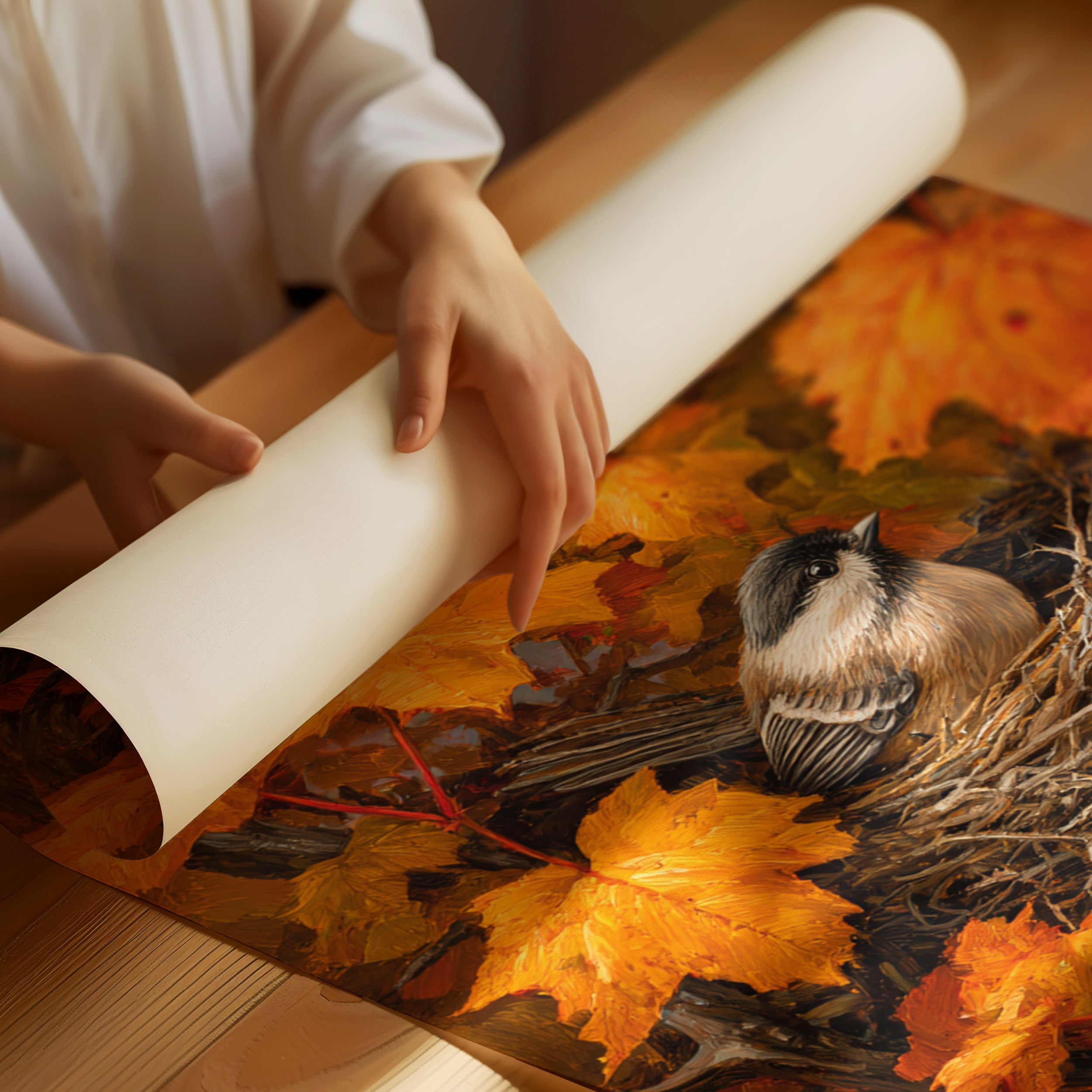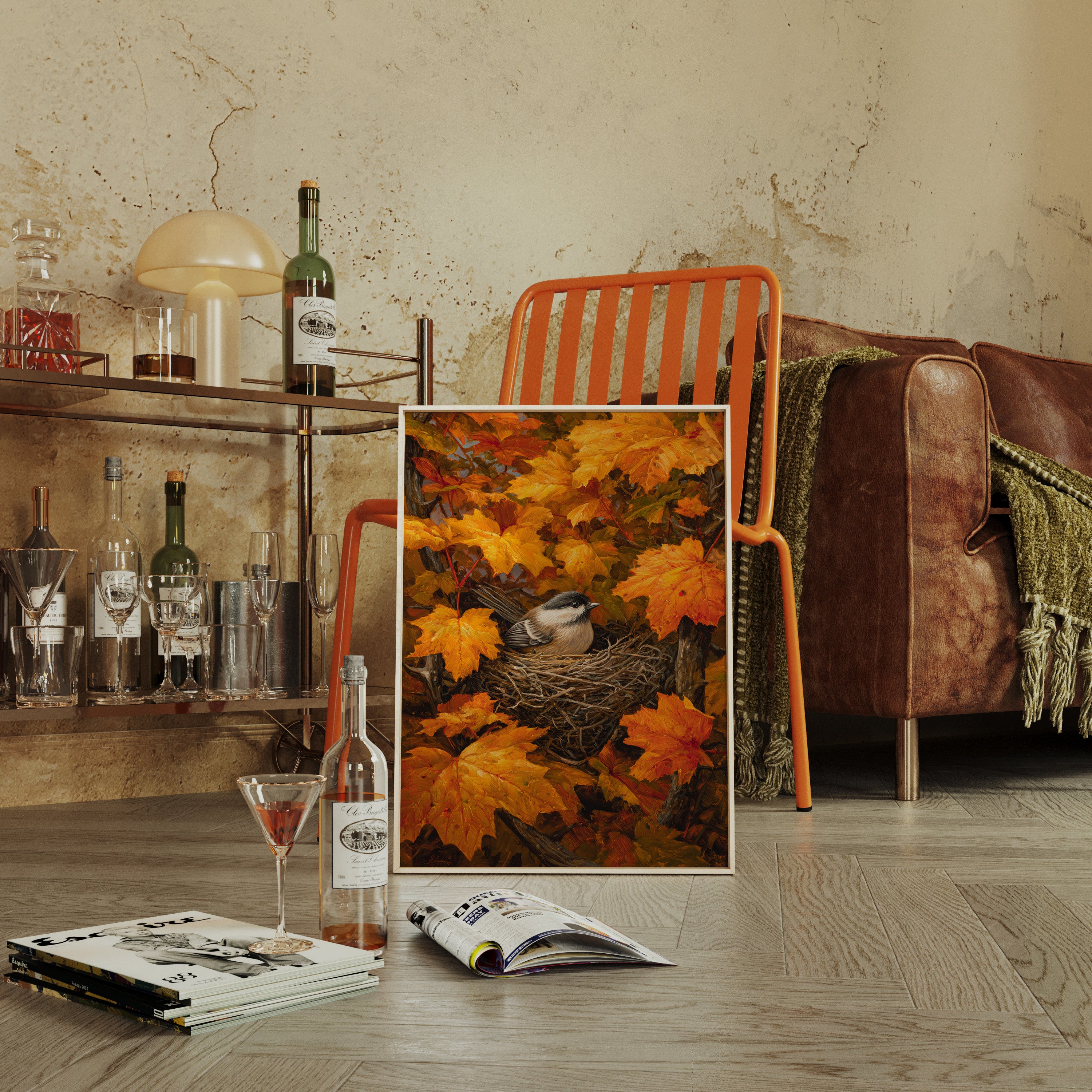 Nestled within a fortress of brilliant autumn maple leaves, a small chickadee finds sanctuary in its carefully woven home. Golden sunlight catches each brushstroke of the leaves, creating a natural canopy of warm oranges and deep crimsons that frame the peaceful scene. The intricate detail of the bird's feathers contrasts beautifully with the rustic texture of its twisted twig nest, while the surrounding foliage burns with the intensity of fall's final display. This piece brings the cozy comfort of autumn indoors, perfect for creating a welcoming atmosphere in a reading nook or breakfast area where its warm tones can enhance natural light.