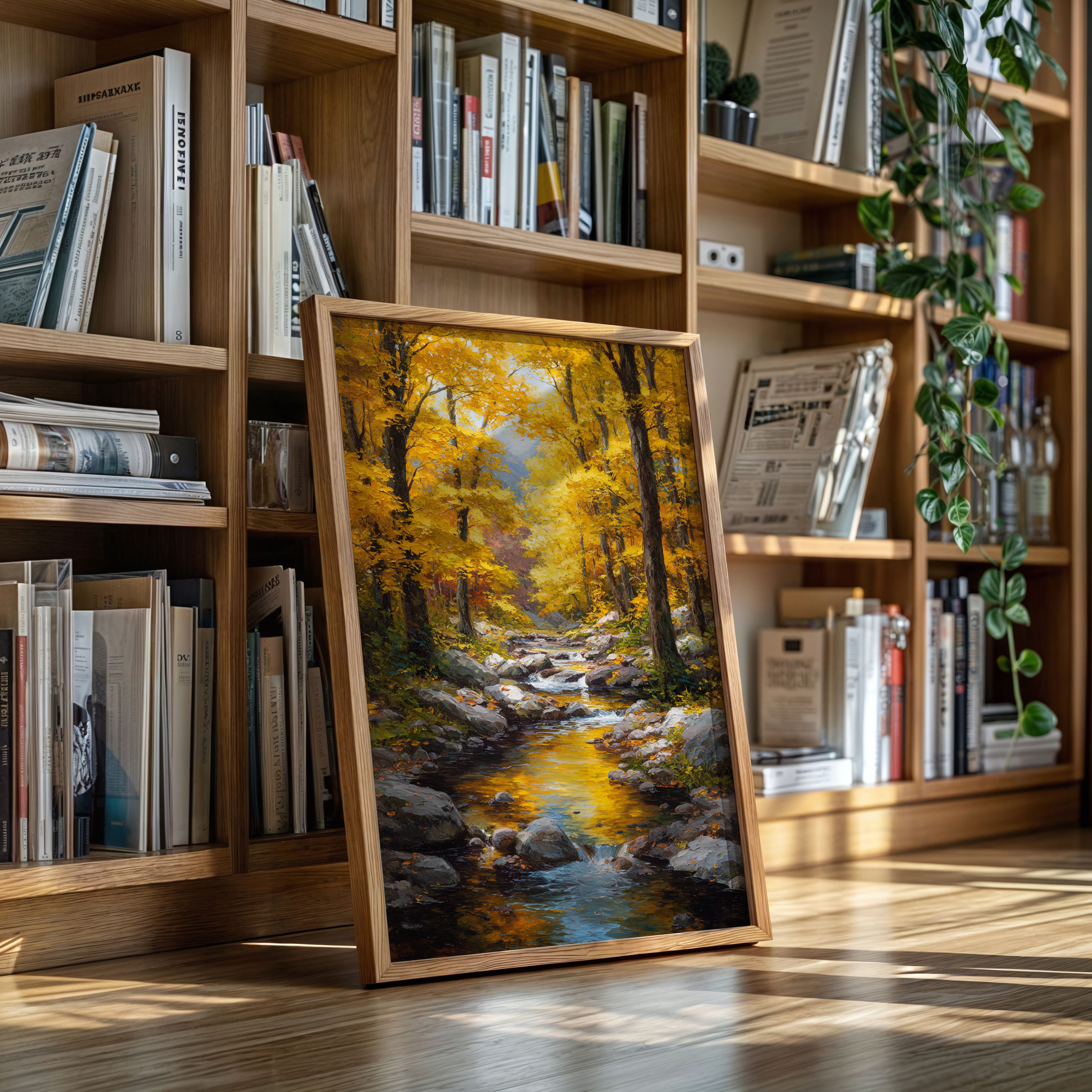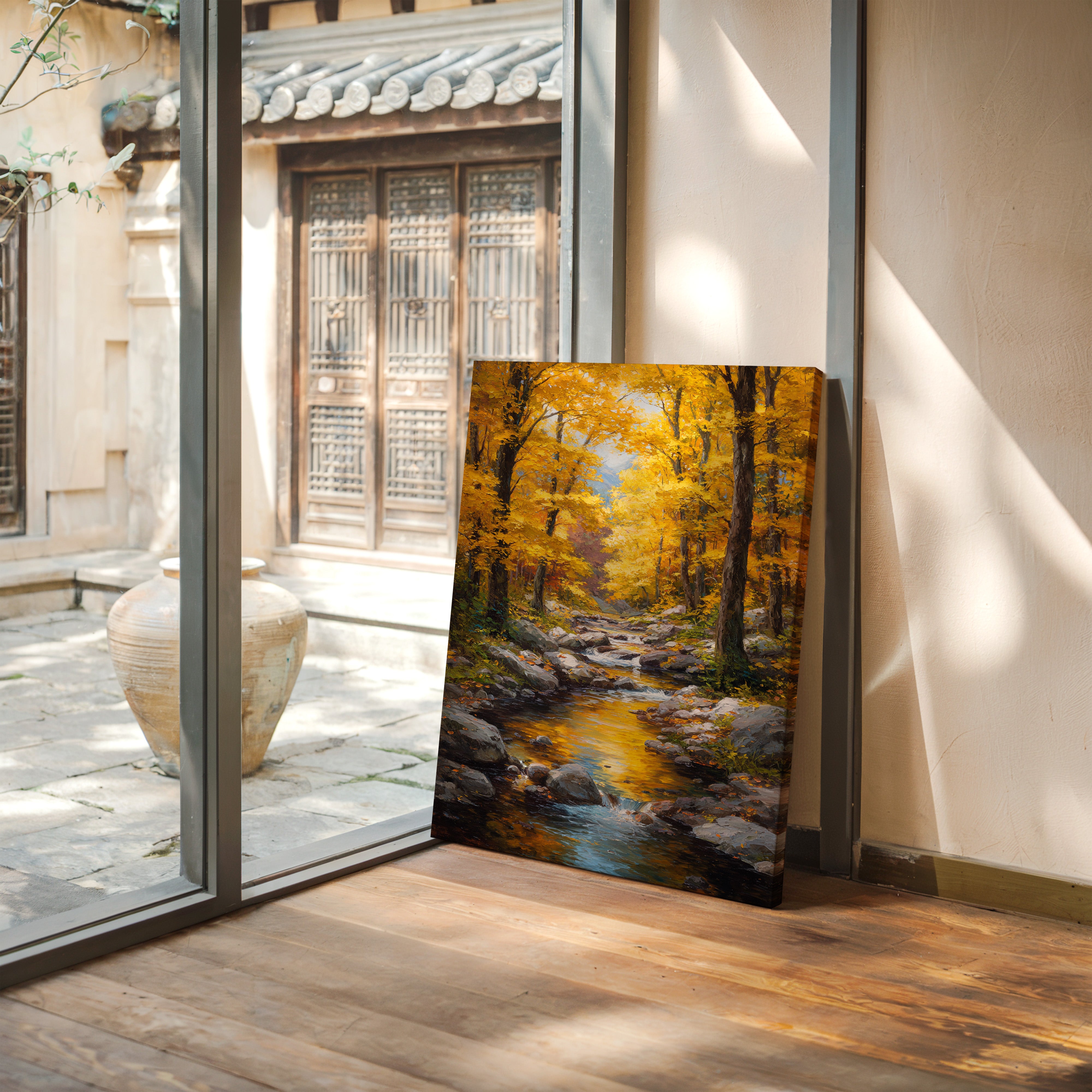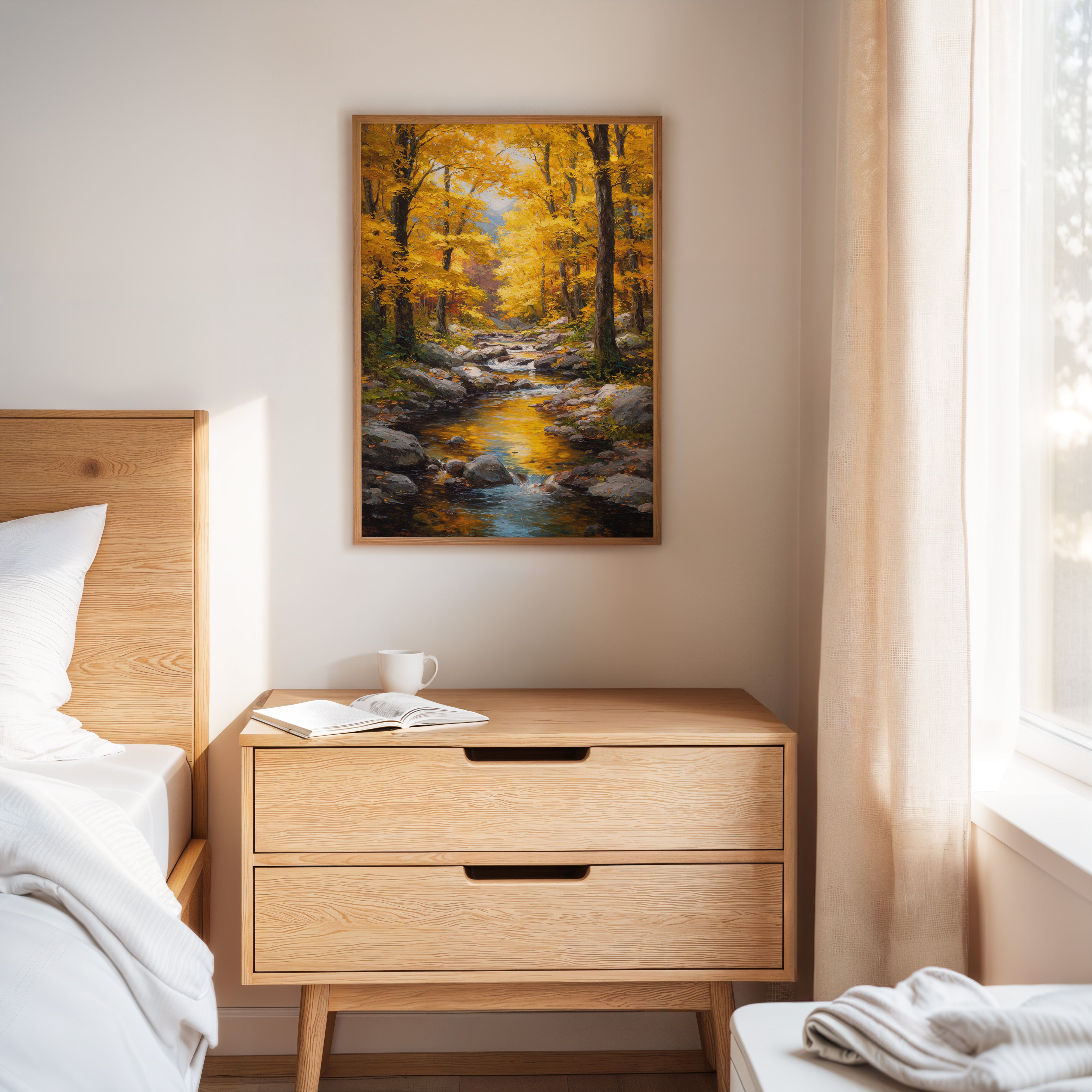 Golden autumn light filters through a canopy of maple trees, casting honeyed reflections across tumbling waters. The scene captures nature's perfect harmony - ancient rocks smoothed by time, crystal clear water dancing between them, all beneath a cathedral of blazing yellow foliage. Rich textures emerge through the interplay of rough stone, silky water, and delicate leaves, while subtle blue shadows add depth to the autumn palette. This tranquil scene would bring natural serenity to a living room or office space, offering a window into autumn's most magical moments.
