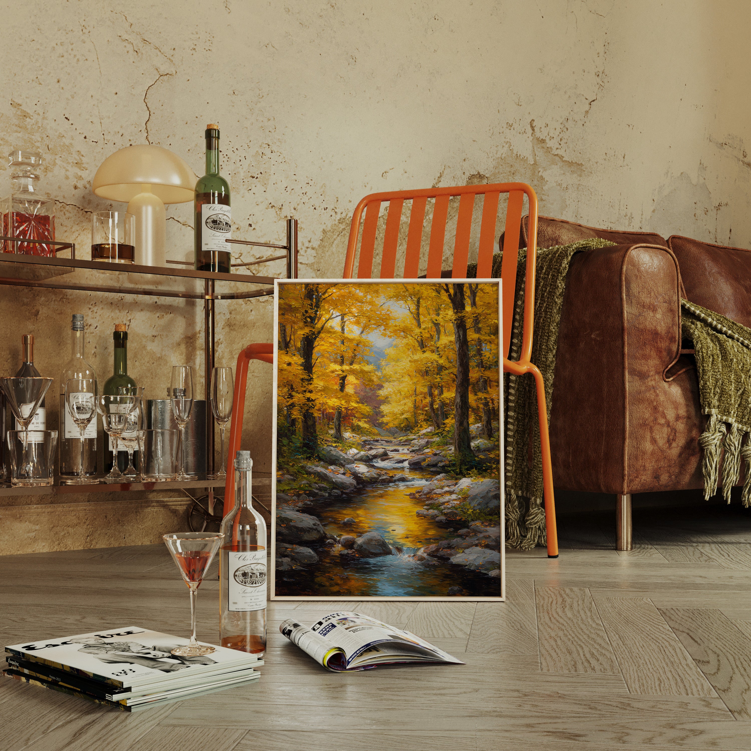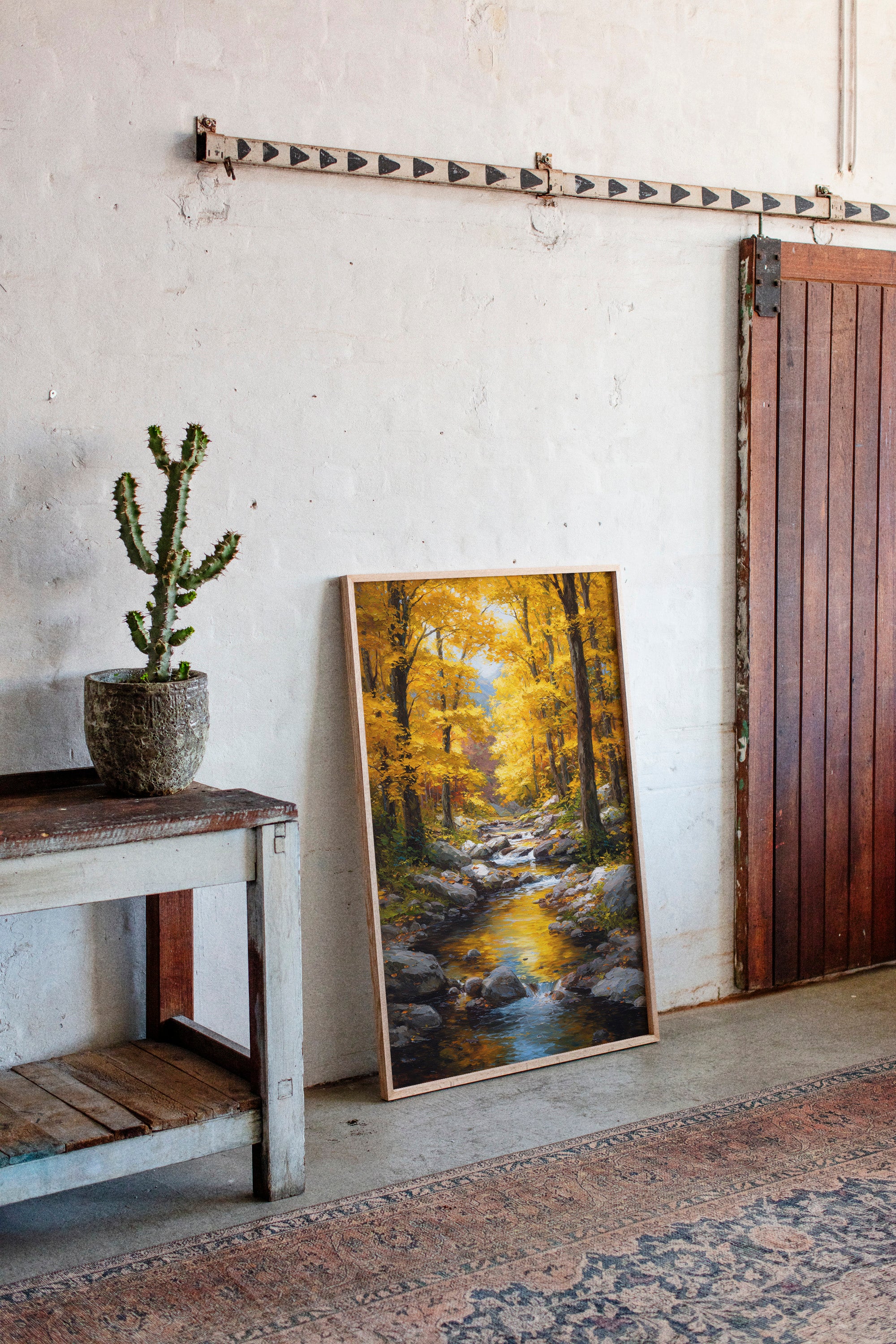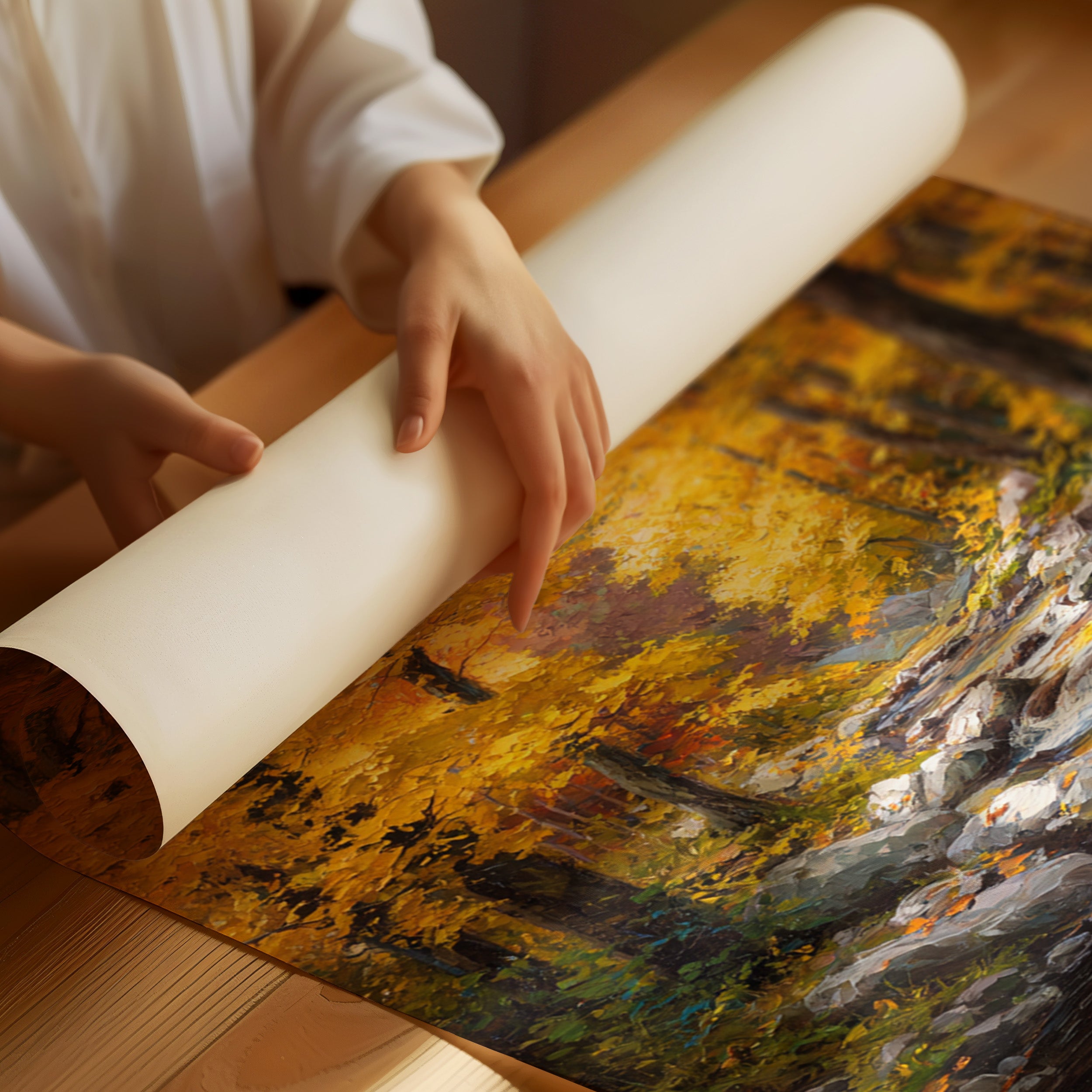 Golden autumn light filters through a canopy of maple trees, casting honeyed reflections across tumbling waters. The scene captures nature's perfect harmony - ancient rocks smoothed by time, crystal clear water dancing between them, all beneath a cathedral of blazing yellow foliage. Rich textures emerge through the interplay of rough stone, silky water, and delicate leaves, while subtle blue shadows add depth to the autumn palette. This tranquil scene would bring natural serenity to a living room or office space, offering a window into autumn's most magical moments.