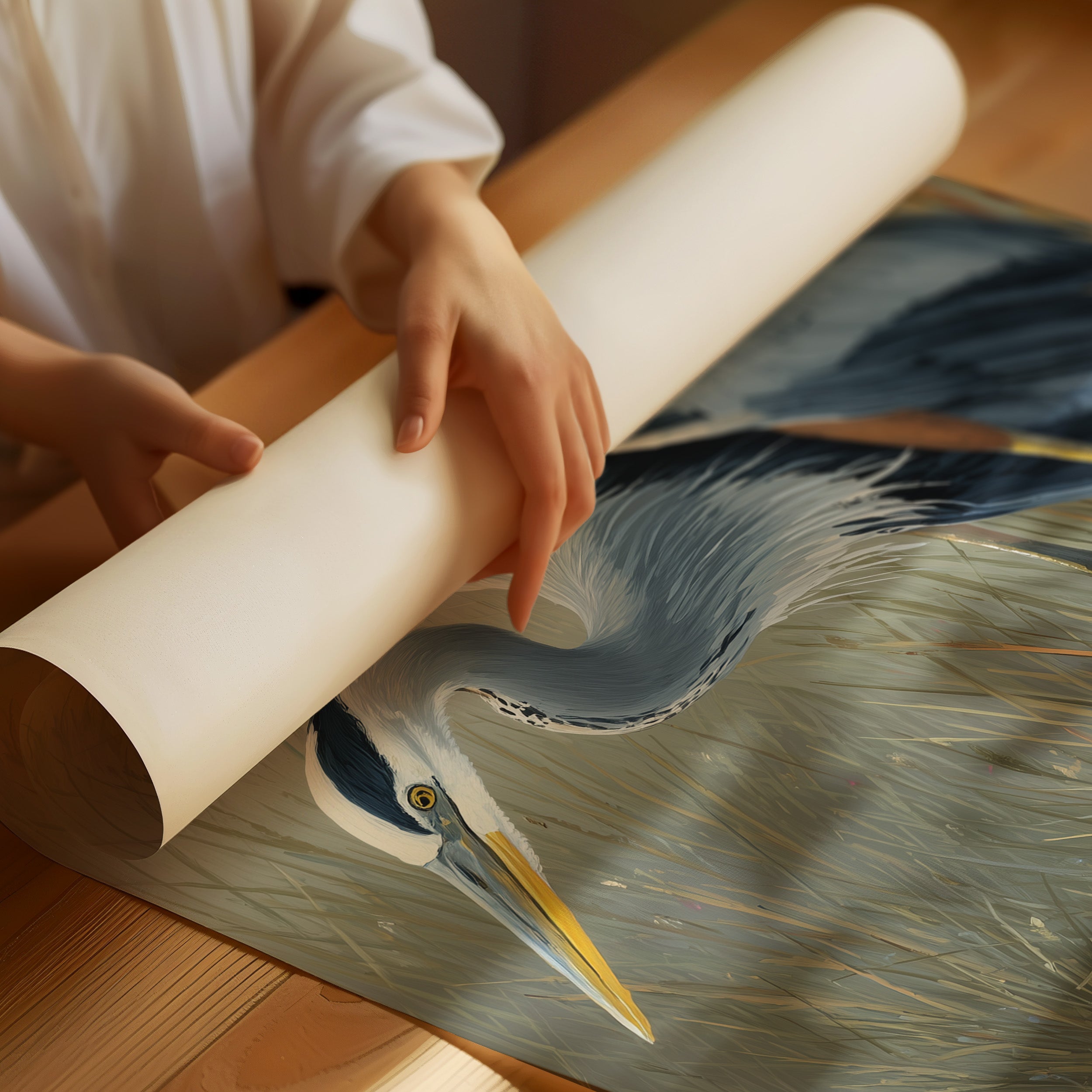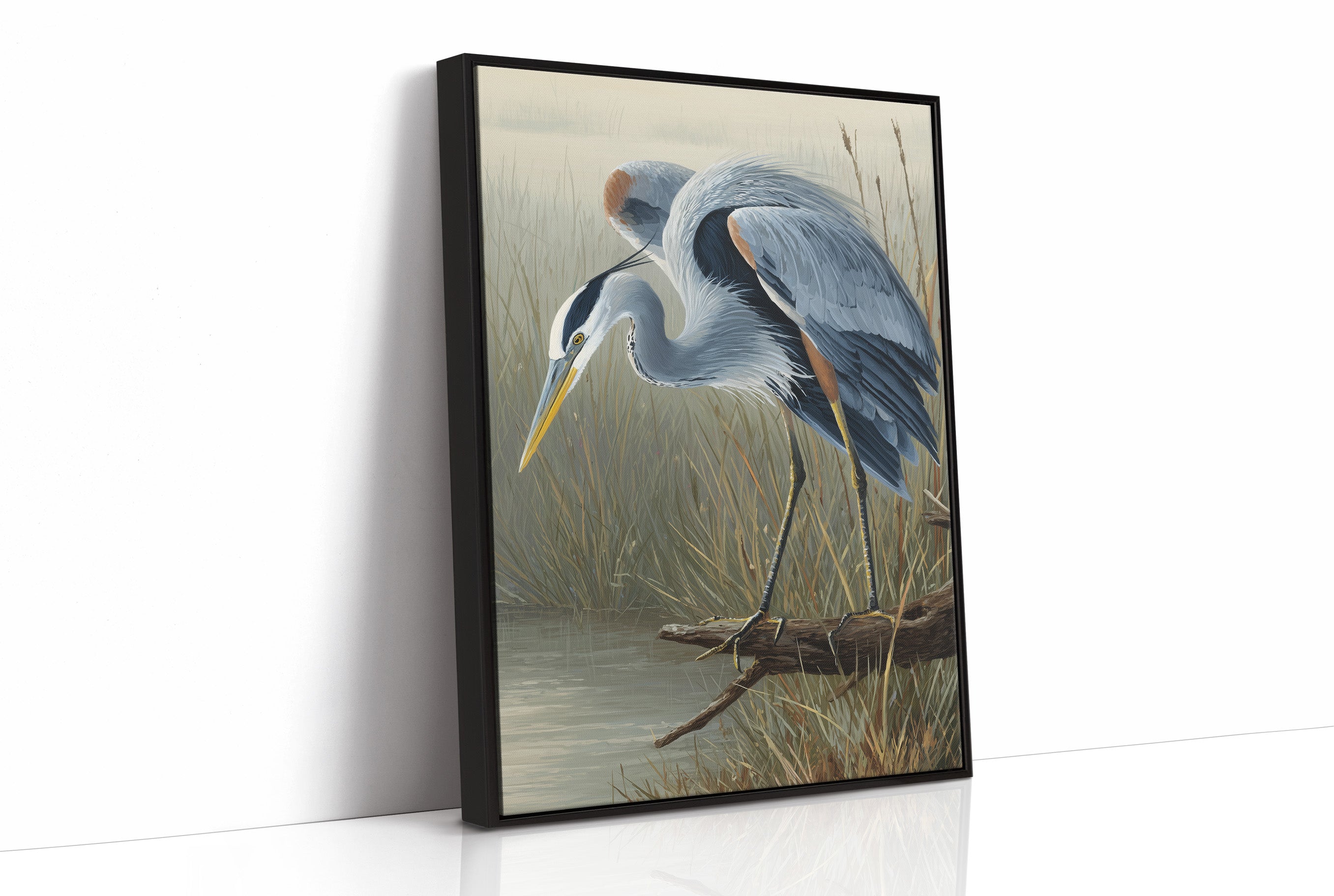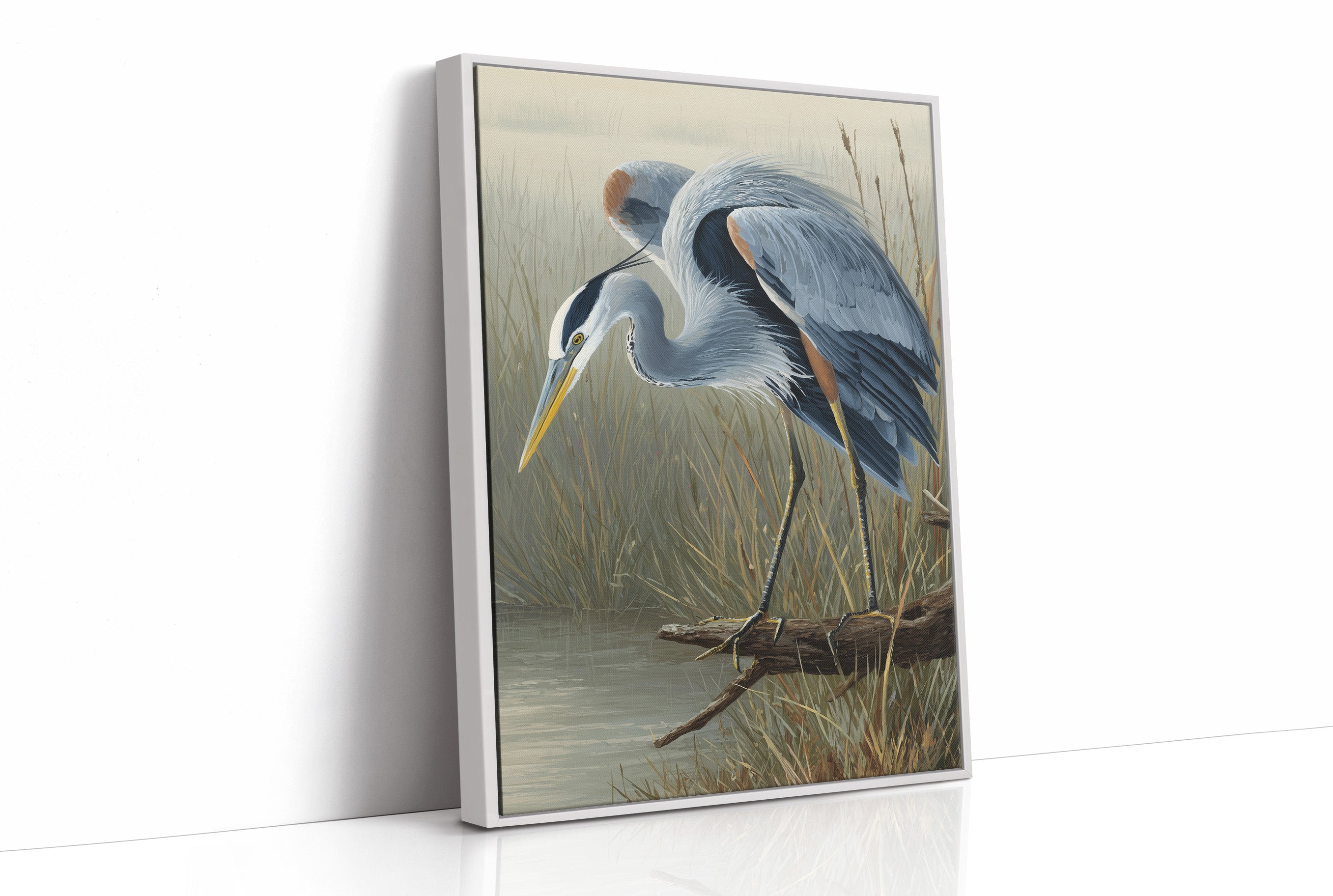 A beautifully rendered painting of a blue heron stands partially revealed from its wooden poised attentively at the edge of a marsh with its distinctive yellow beak angled downward in hunting posture. Soft blue-gray plumage contrasts against the muted tan and green backdrop of wetland reeds.