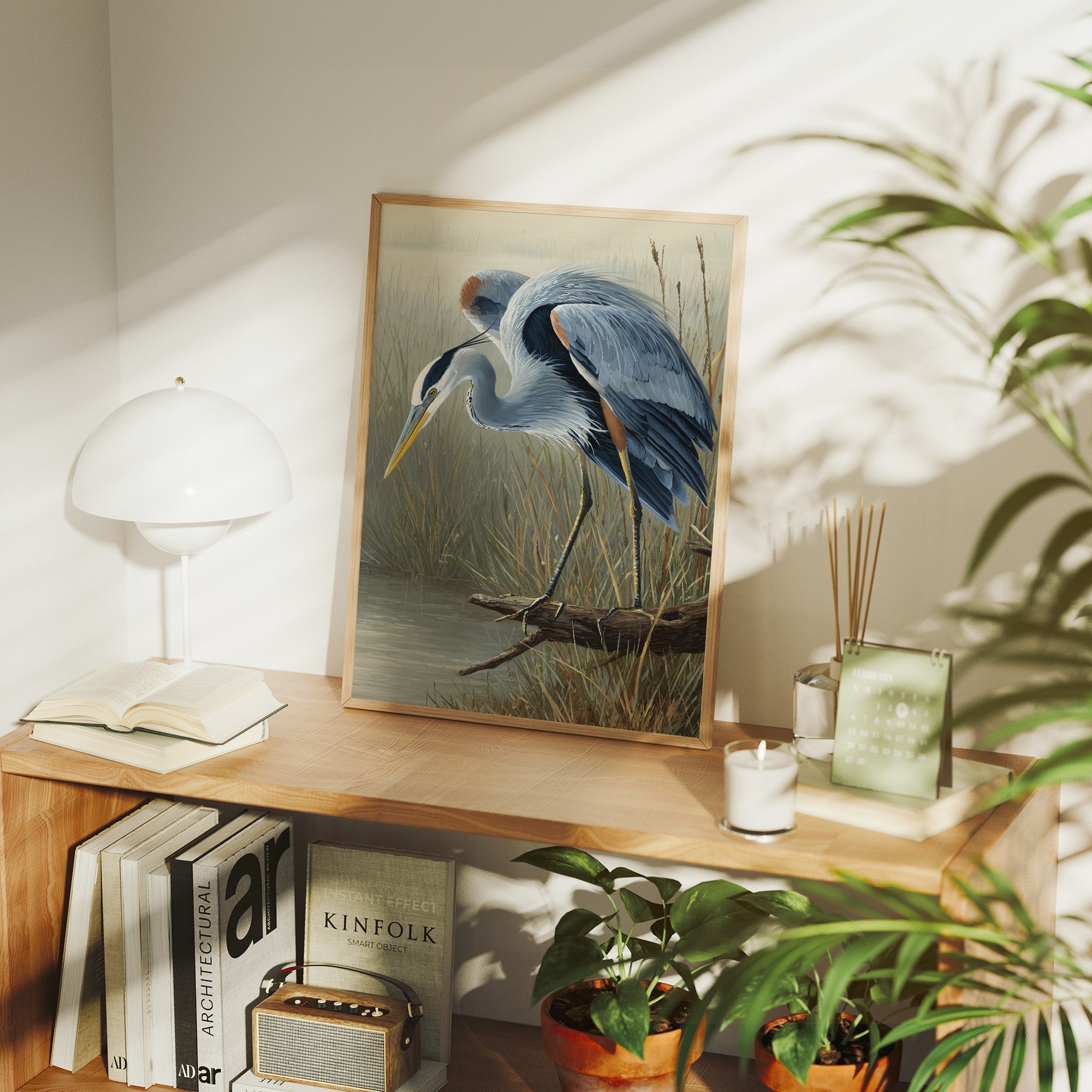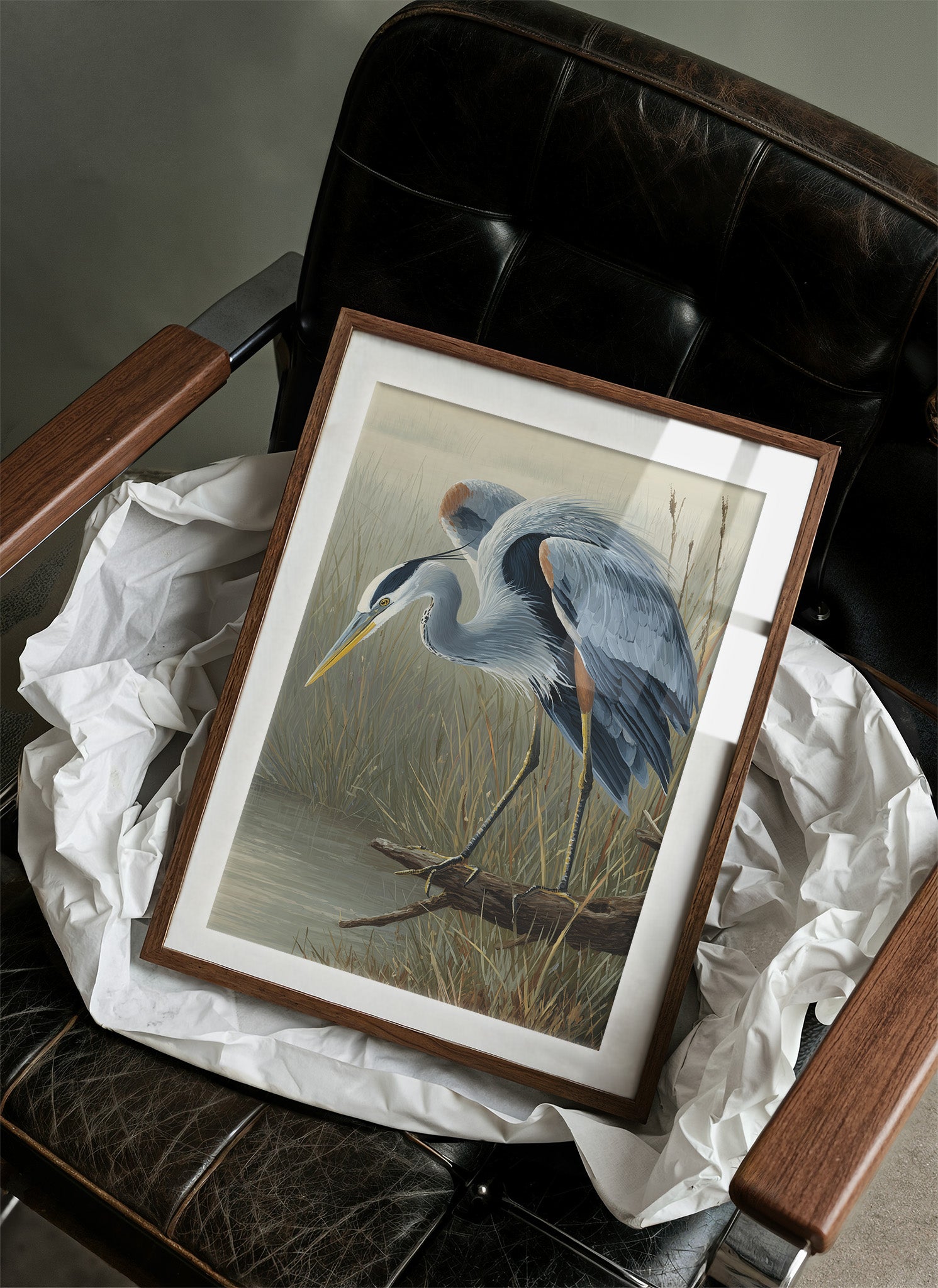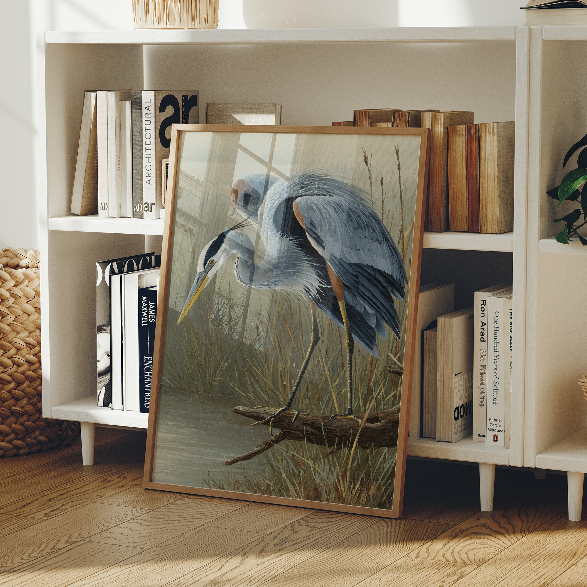 A beautifully rendered painting of a blue heron stands partially revealed from its wooden poised attentively at the edge of a marsh with its distinctive yellow beak angled downward in hunting posture. Soft blue-gray plumage contrasts against the muted tan and green backdrop of wetland reeds.