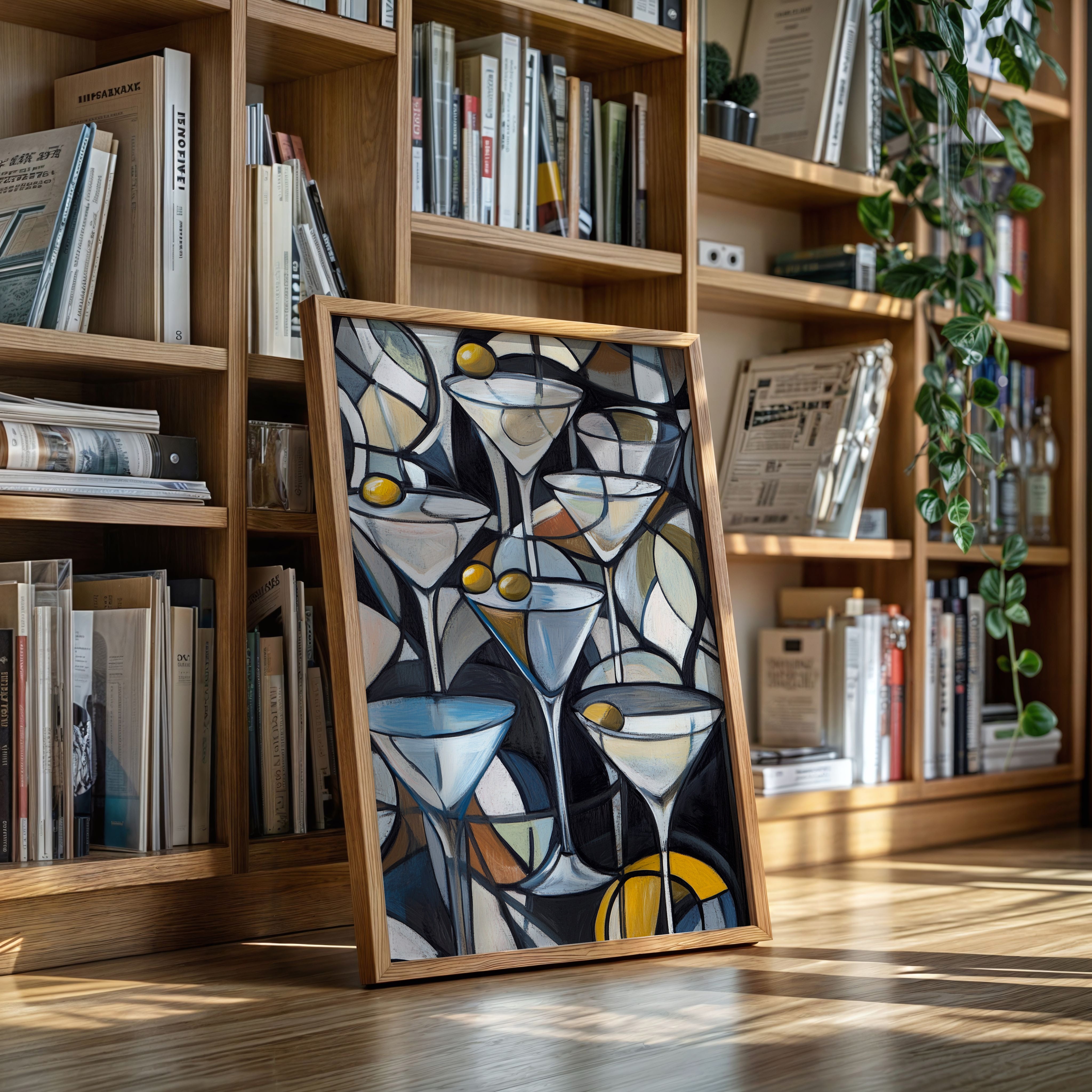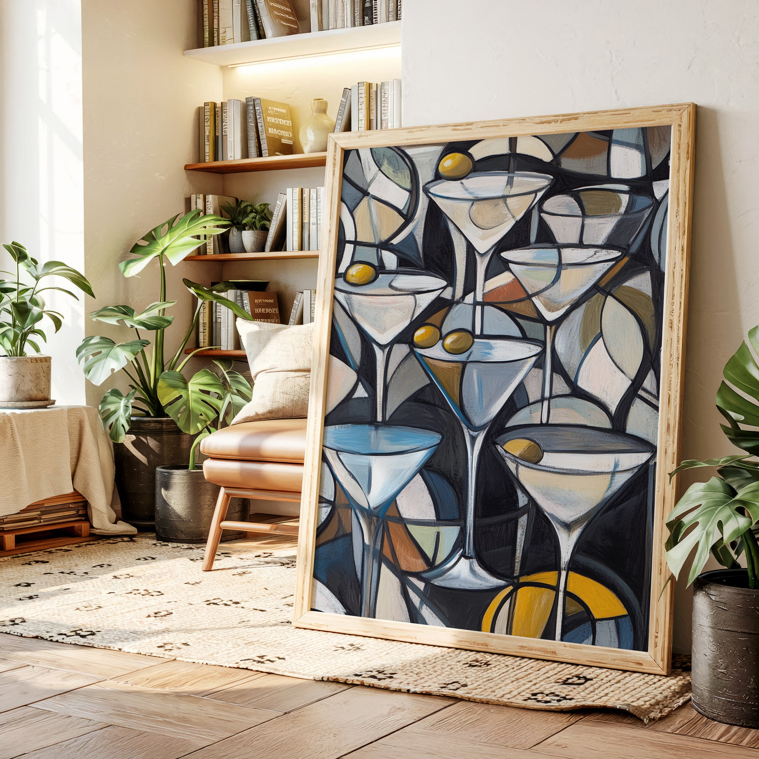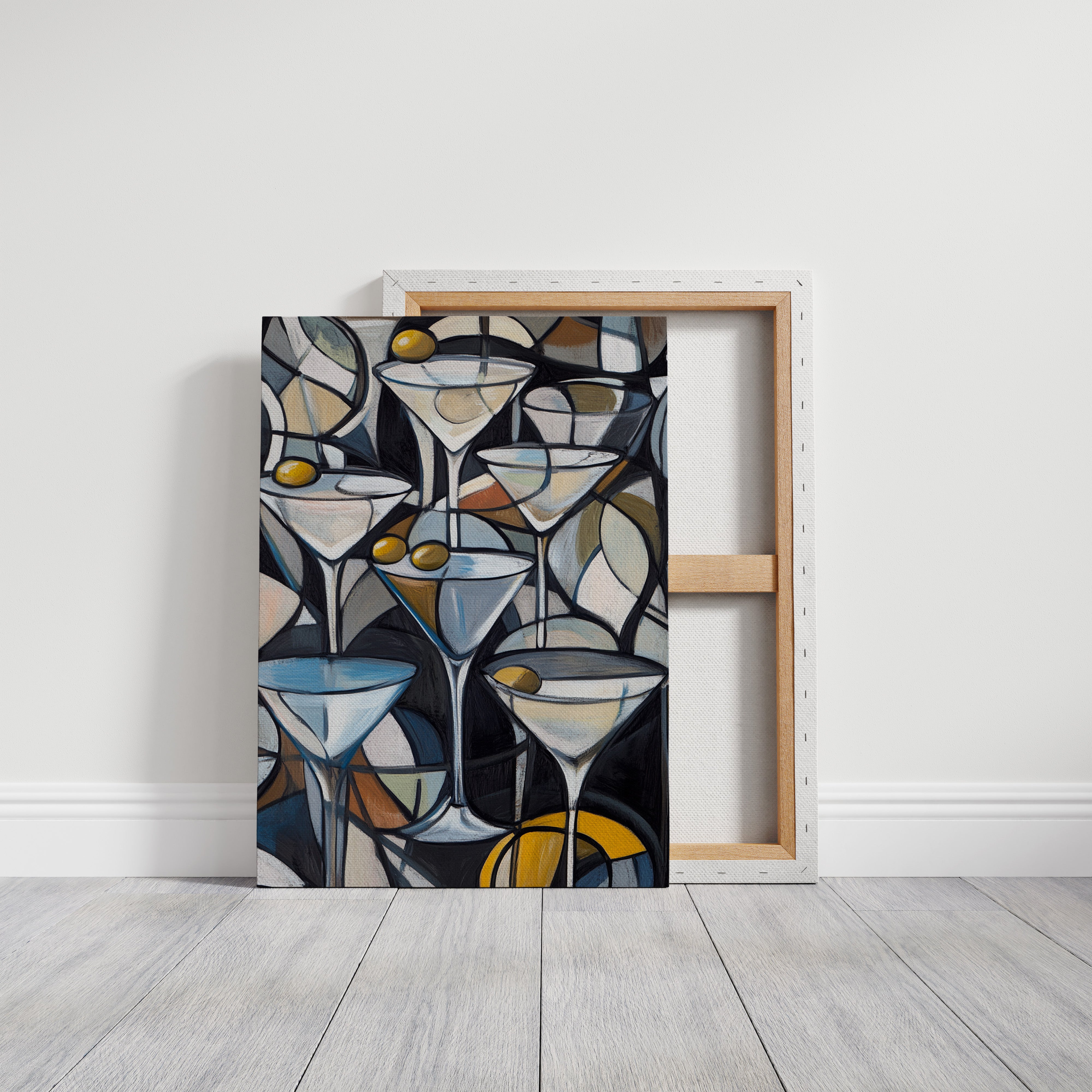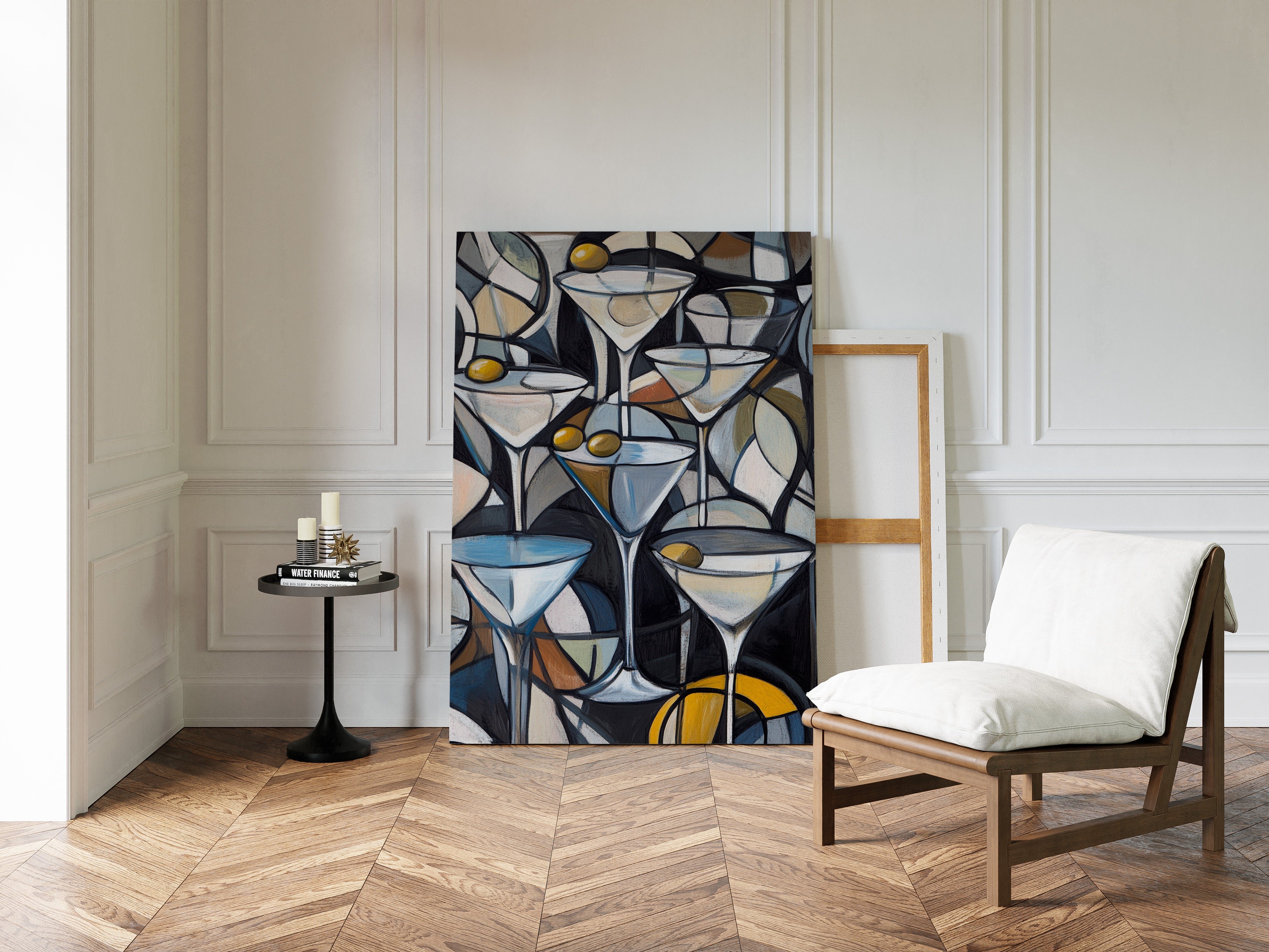 Crystal stems rise like urban towers against a midnight canvas, their contents catching fragments of light and shadow. The composition fractures and reassembles classic cocktail geometry through a modernist lens, with golden olives providing warm punctuation marks against cool steel blues and whites. Geometric planes intersect and overlap, creating a sophisticated rhythm that captures the elegance of cocktail culture through an abstract perspective. Perfect for a contemporary dining room, home bar, or upscale restaurant space where it adds both sophistication and artistic energy.