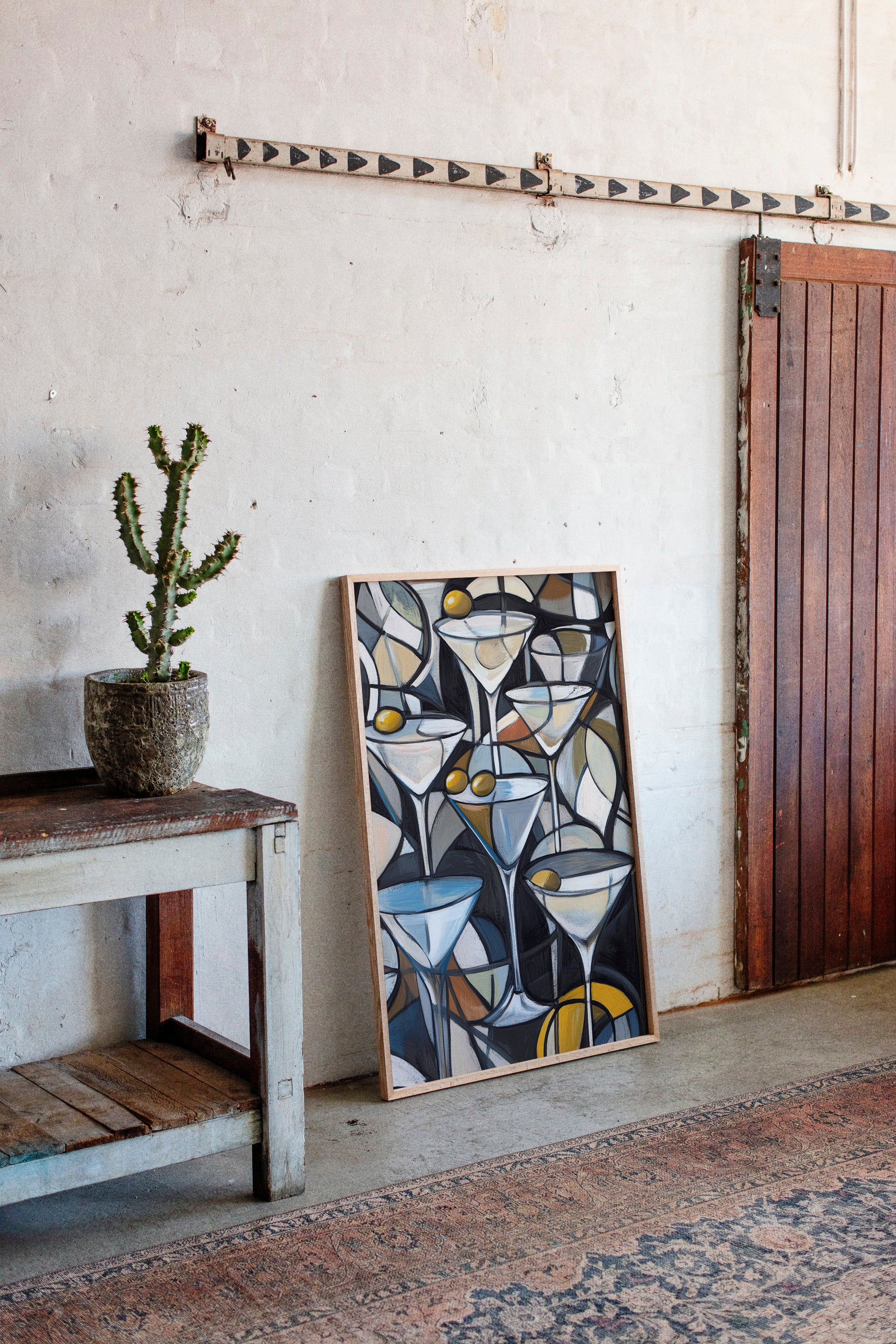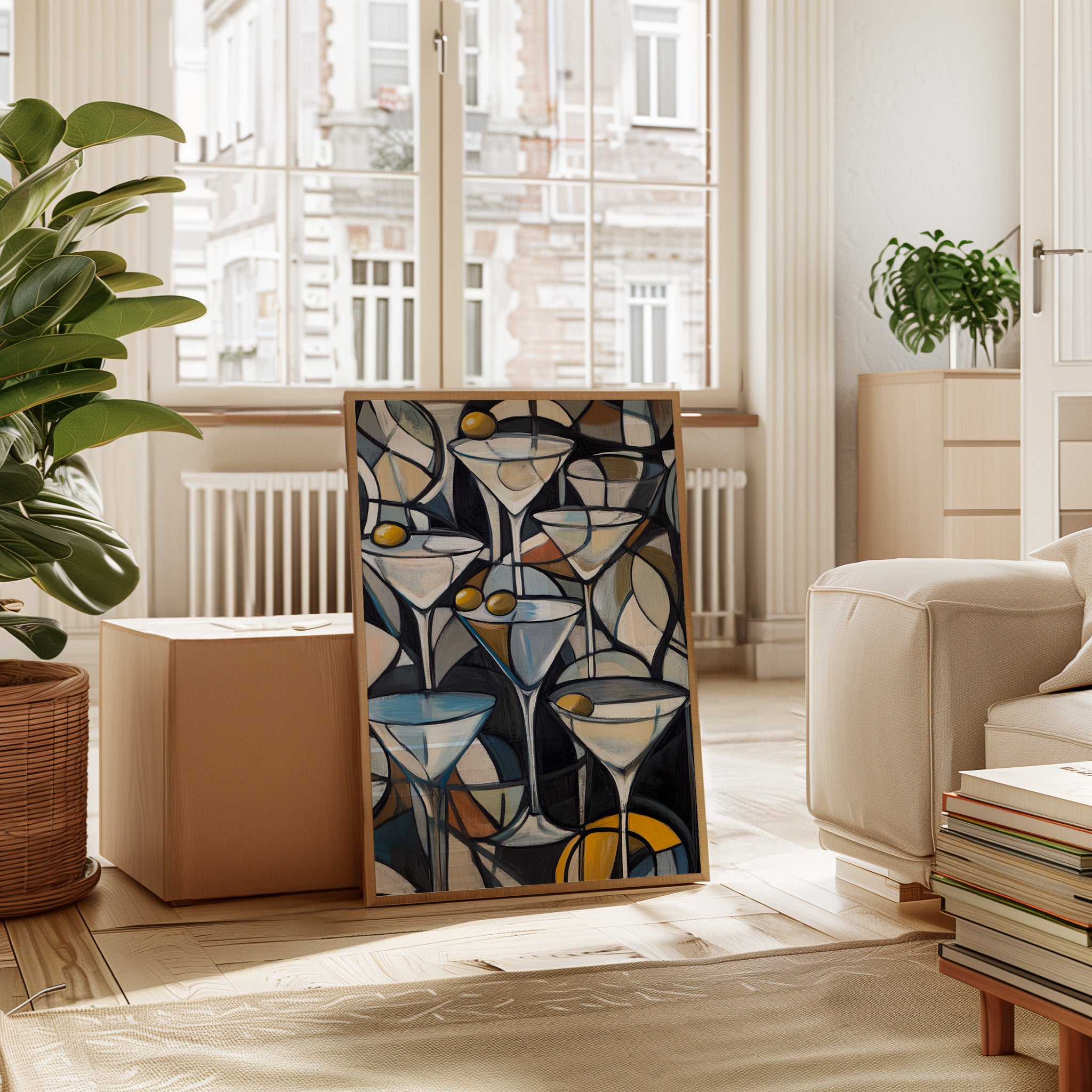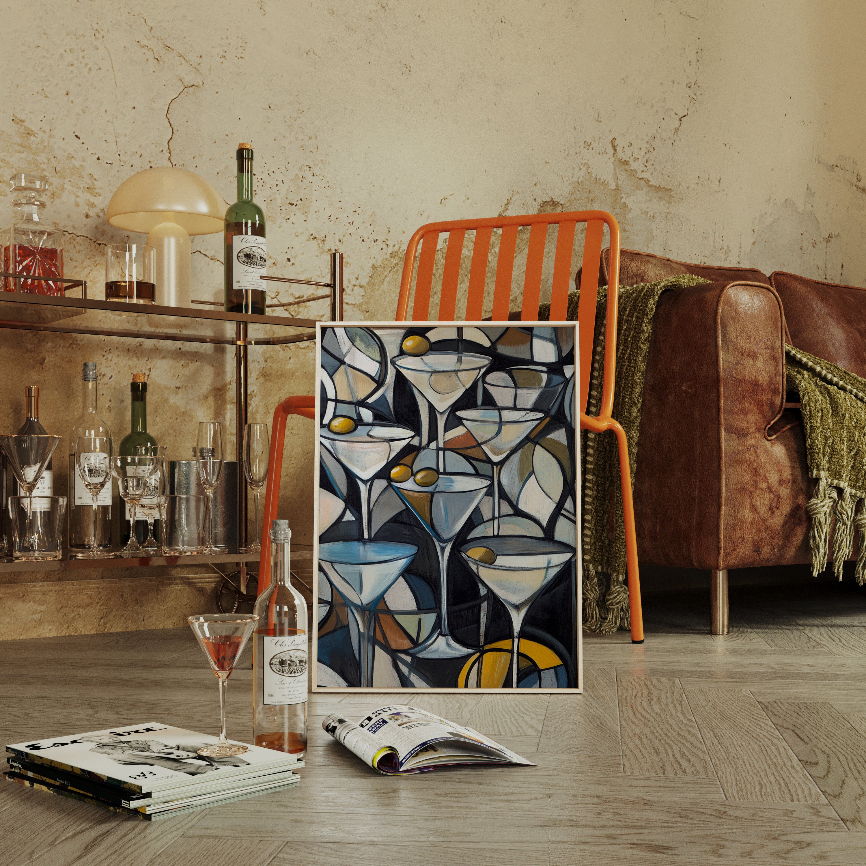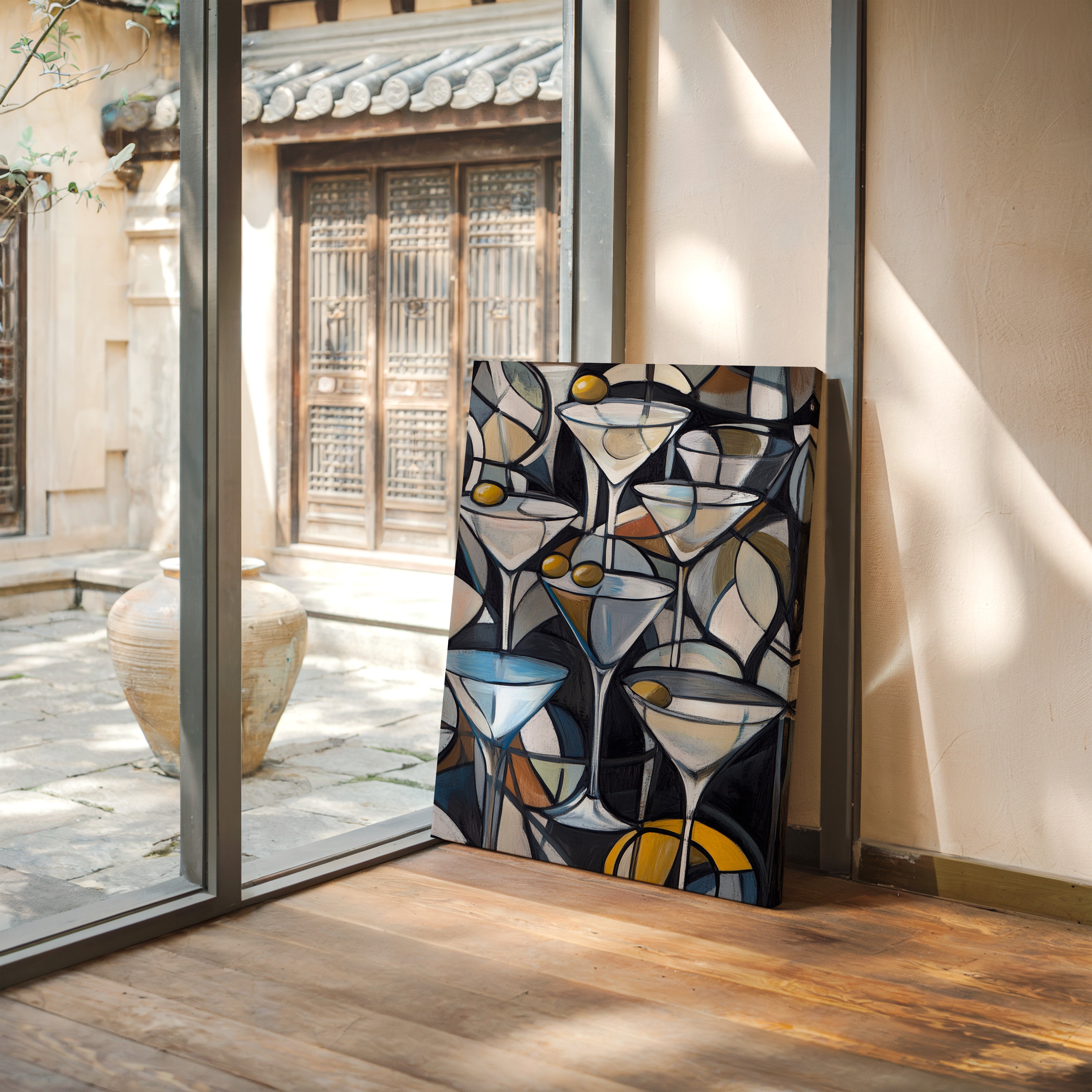 Crystal stems rise like urban towers against a midnight canvas, their contents catching fragments of light and shadow. The composition fractures and reassembles classic cocktail geometry through a modernist lens, with golden olives providing warm punctuation marks against cool steel blues and whites. Geometric planes intersect and overlap, creating a sophisticated rhythm that captures the elegance of cocktail culture through an abstract perspective. Perfect for a contemporary dining room, home bar, or upscale restaurant space where it adds both sophistication and artistic energy.