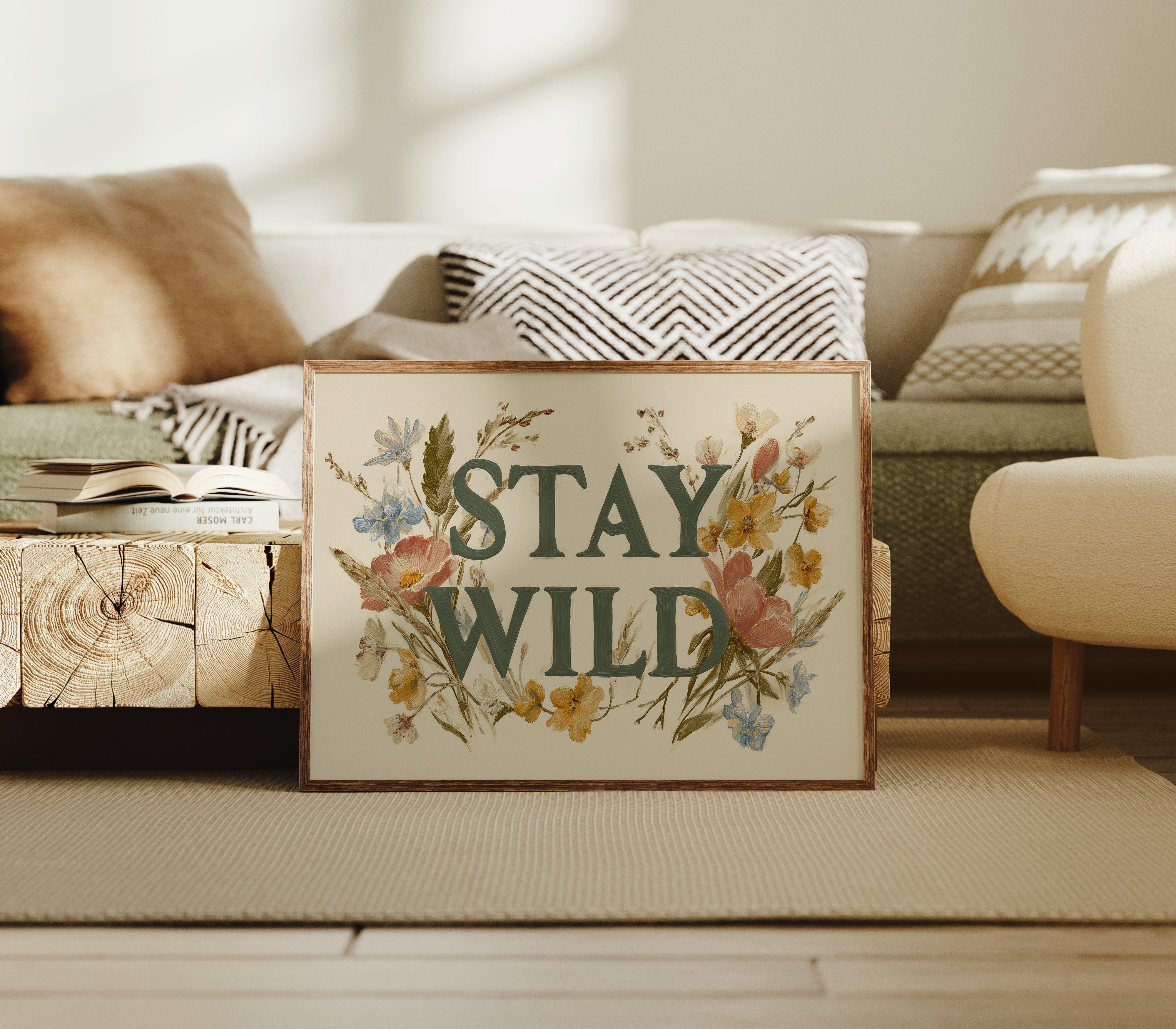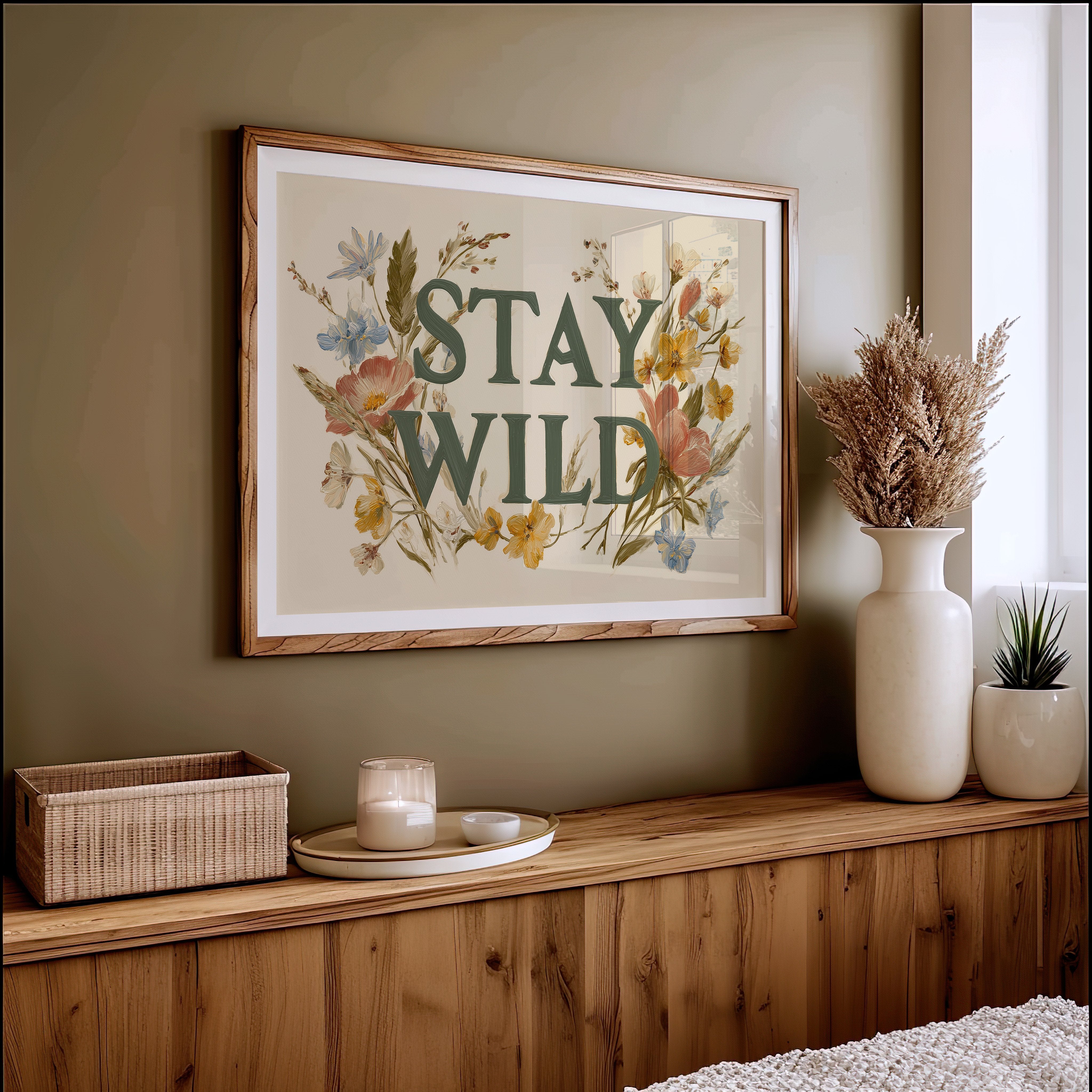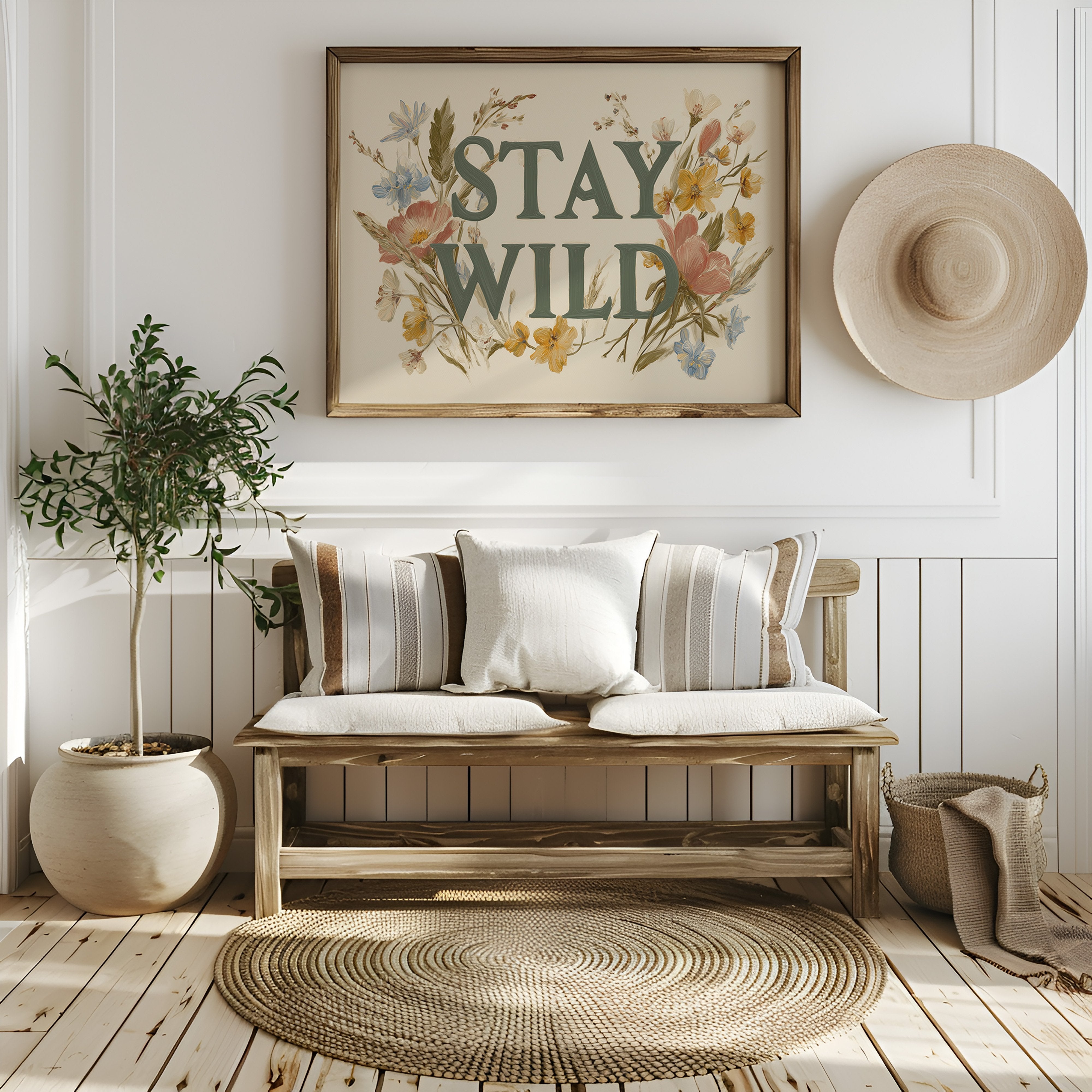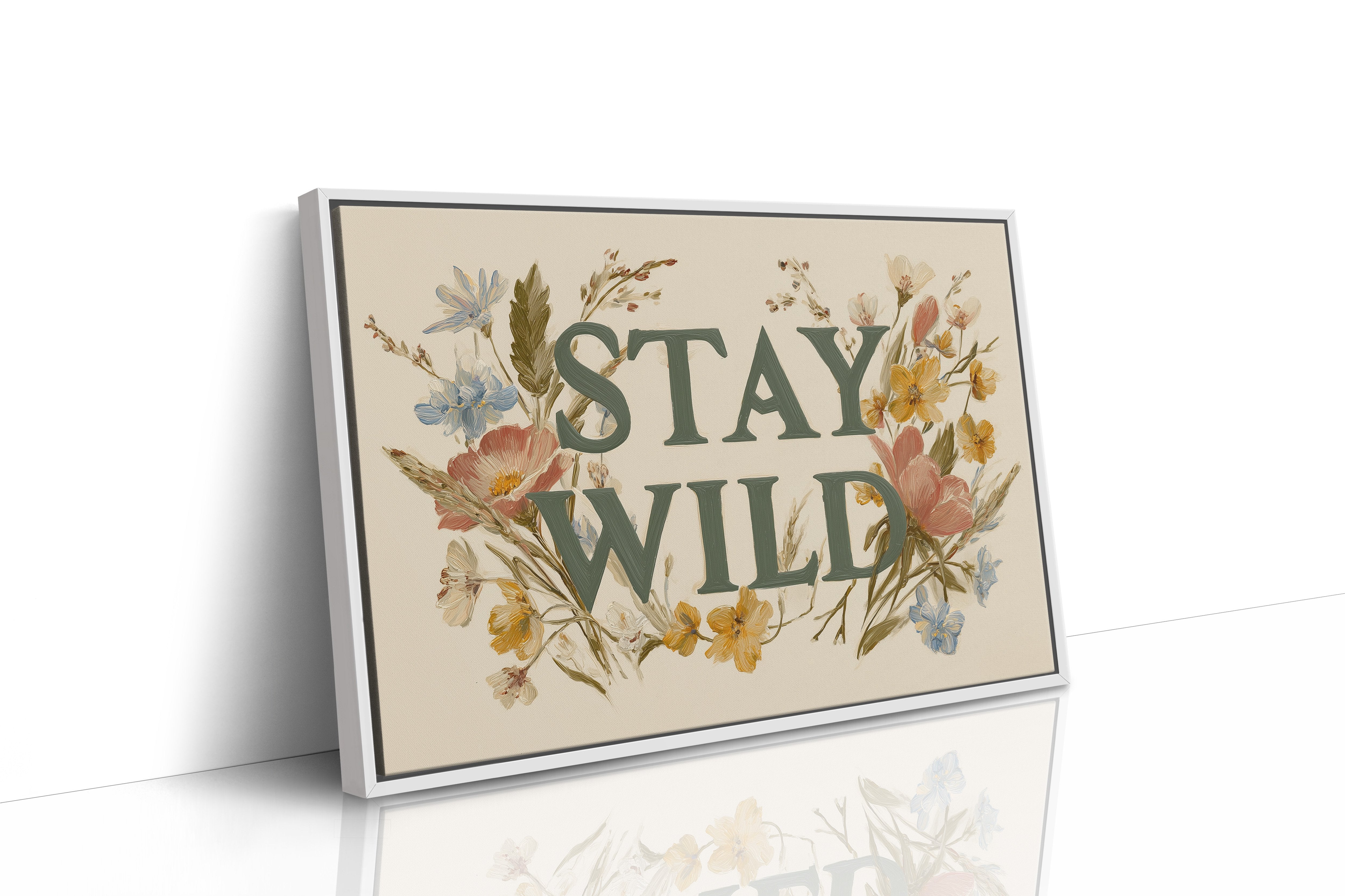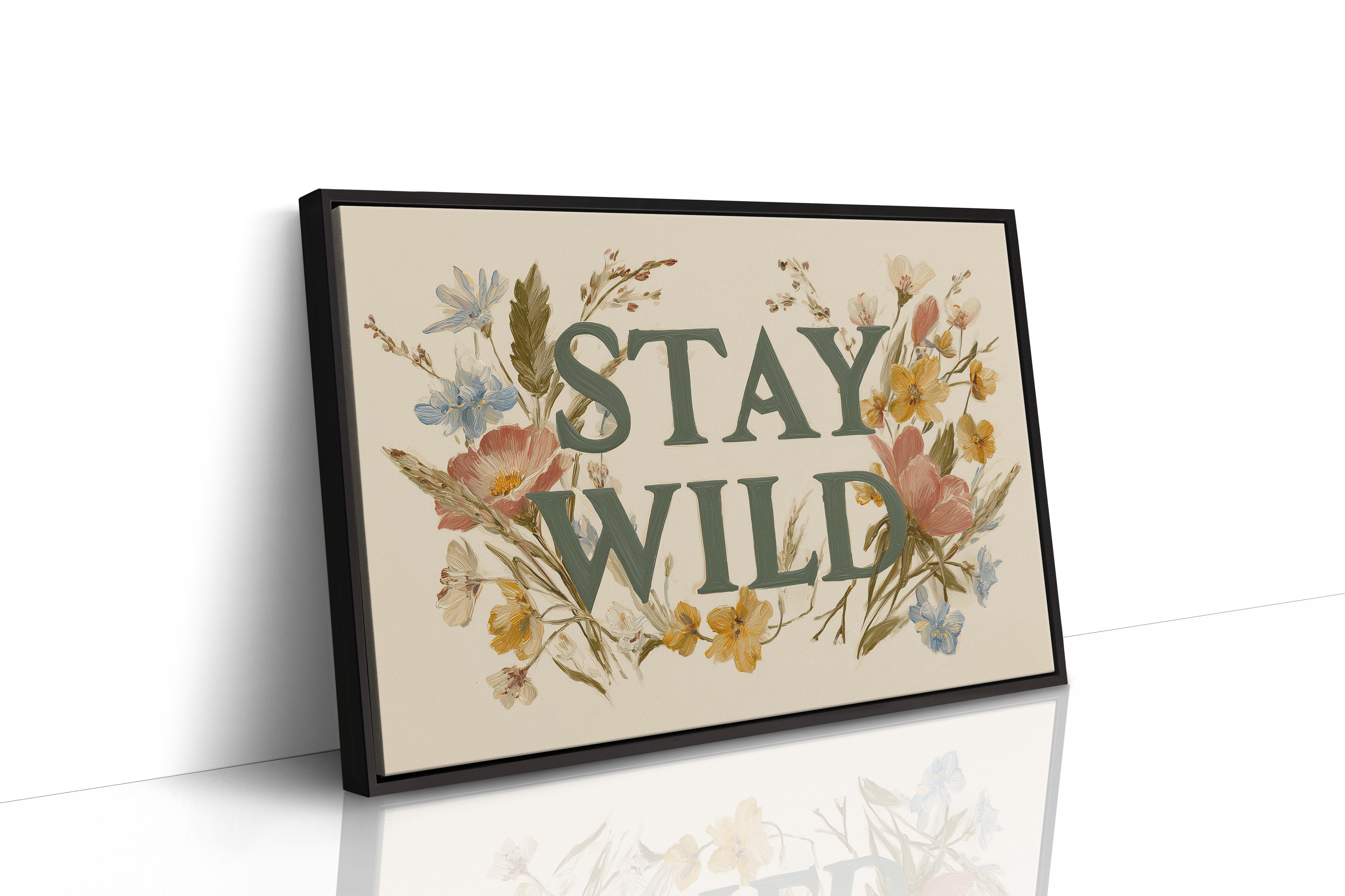 A gentle rebellion blooms across cream-colored canvas, where wildflowers frame bold emerald letters declaring ""STAY WILD."" Pink poppies, golden buttercups, and delicate blue forget-me-nots weave through the typography, creating a harmonious dance between nature and message. The vintage botanical illustration style brings warmth and authenticity, inviting you to honor your untamed spirit even in the most structured days. This statement piece creates an instant focal point in entryways, living rooms, or home offices where its encouraging reminder can inspire daily adventures, both large and small.