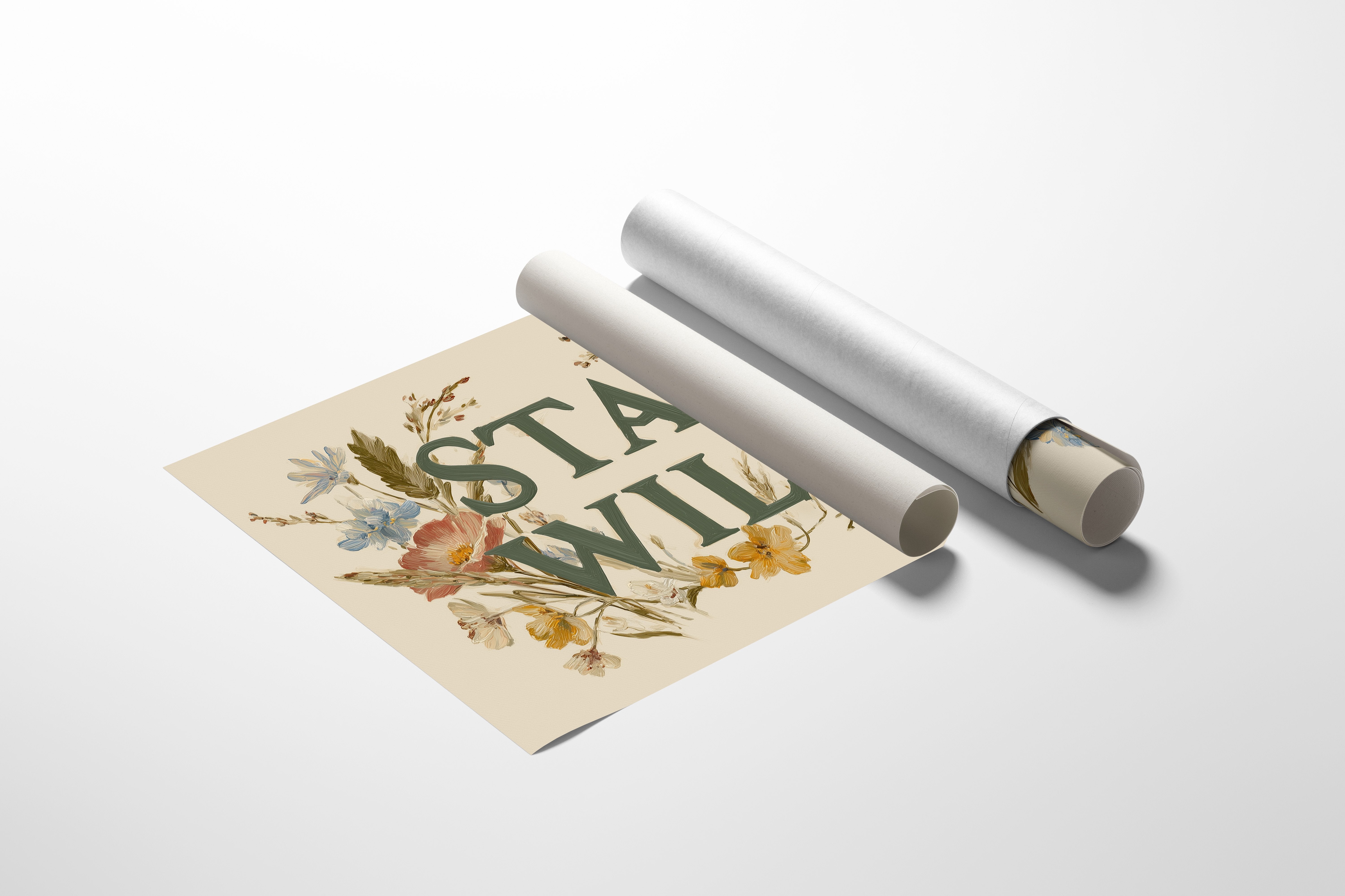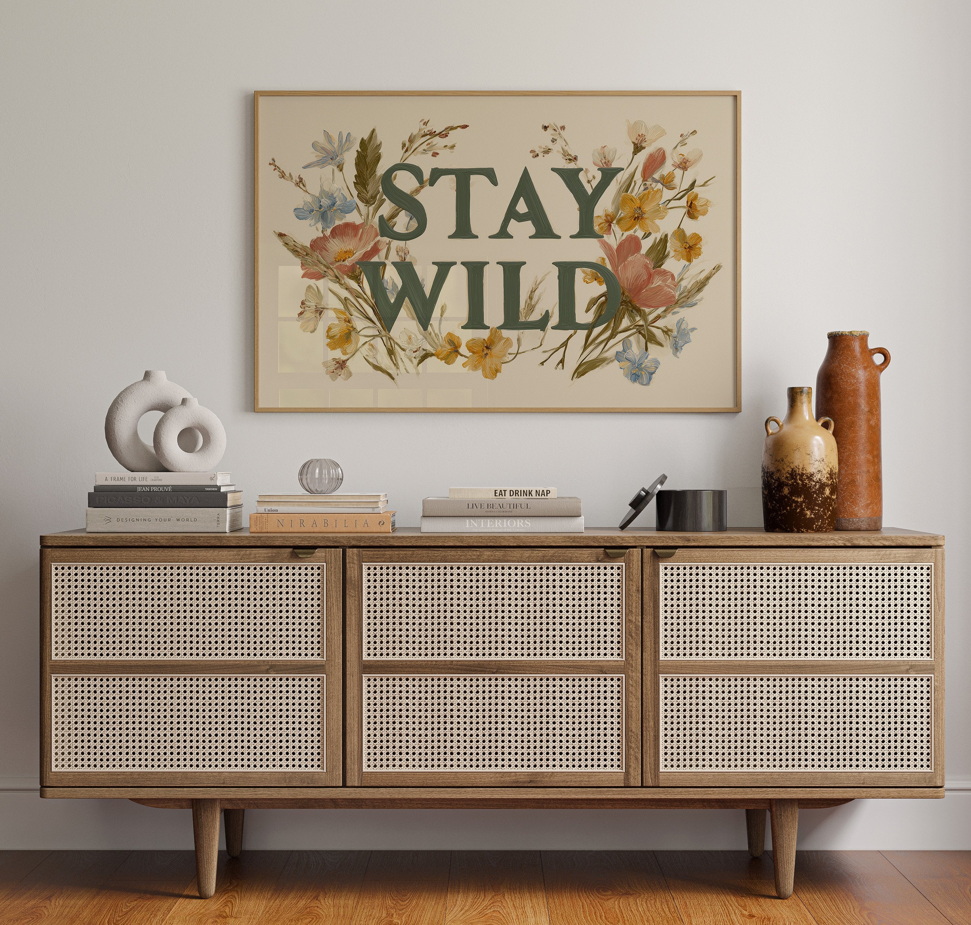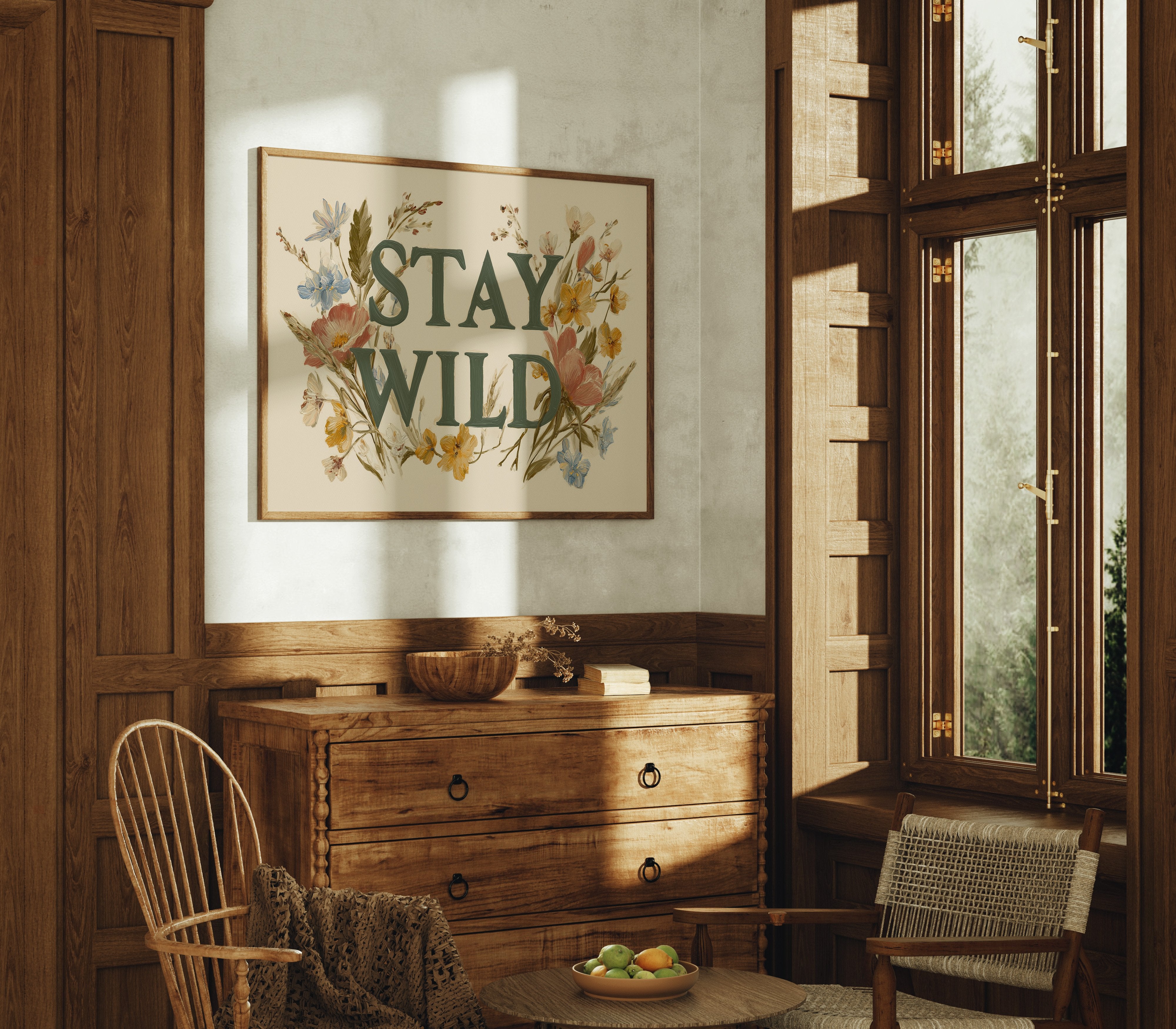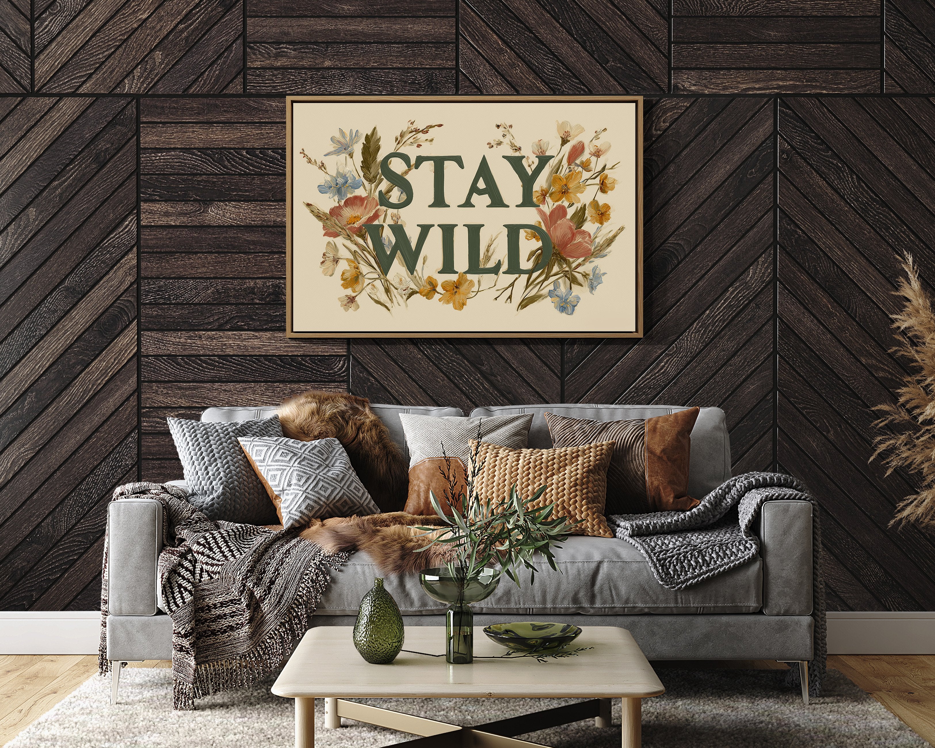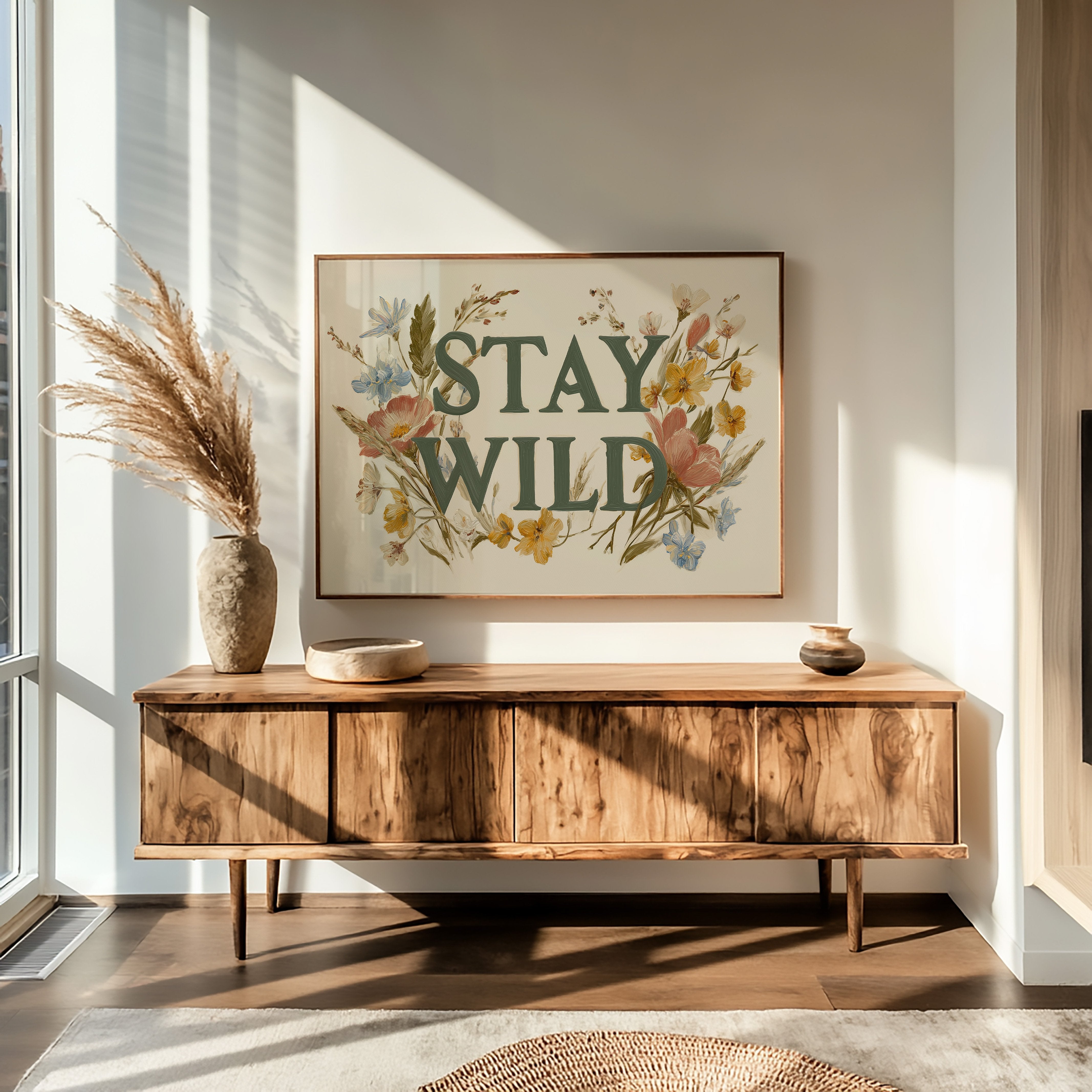 A gentle rebellion blooms across cream-colored canvas, where wildflowers frame bold emerald letters declaring ""STAY WILD."" Pink poppies, golden buttercups, and delicate blue forget-me-nots weave through the typography, creating a harmonious dance between nature and message. The vintage botanical illustration style brings warmth and authenticity, inviting you to honor your untamed spirit even in the most structured days. This statement piece creates an instant focal point in entryways, living rooms, or home offices where its encouraging reminder can inspire daily adventures, both large and small.