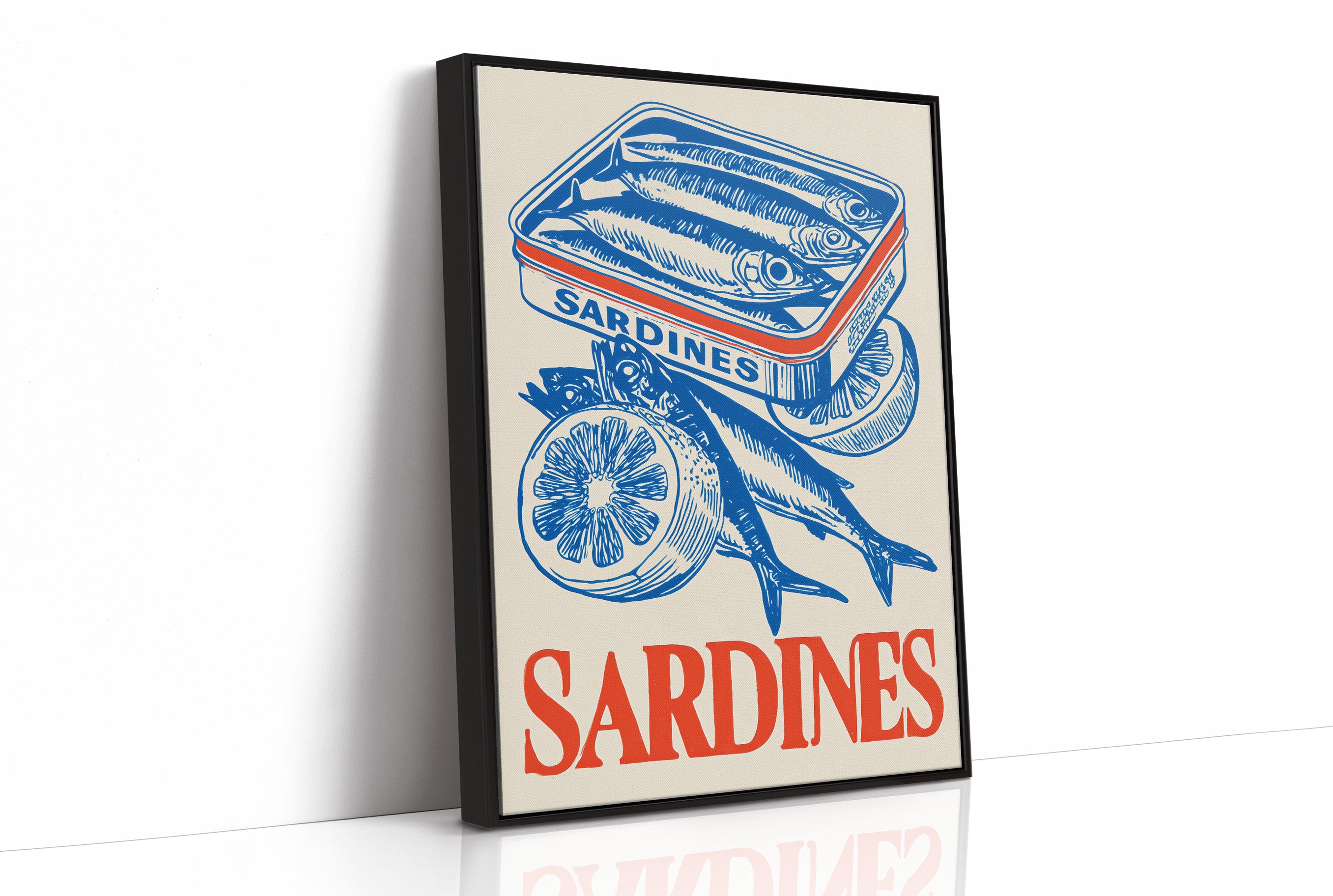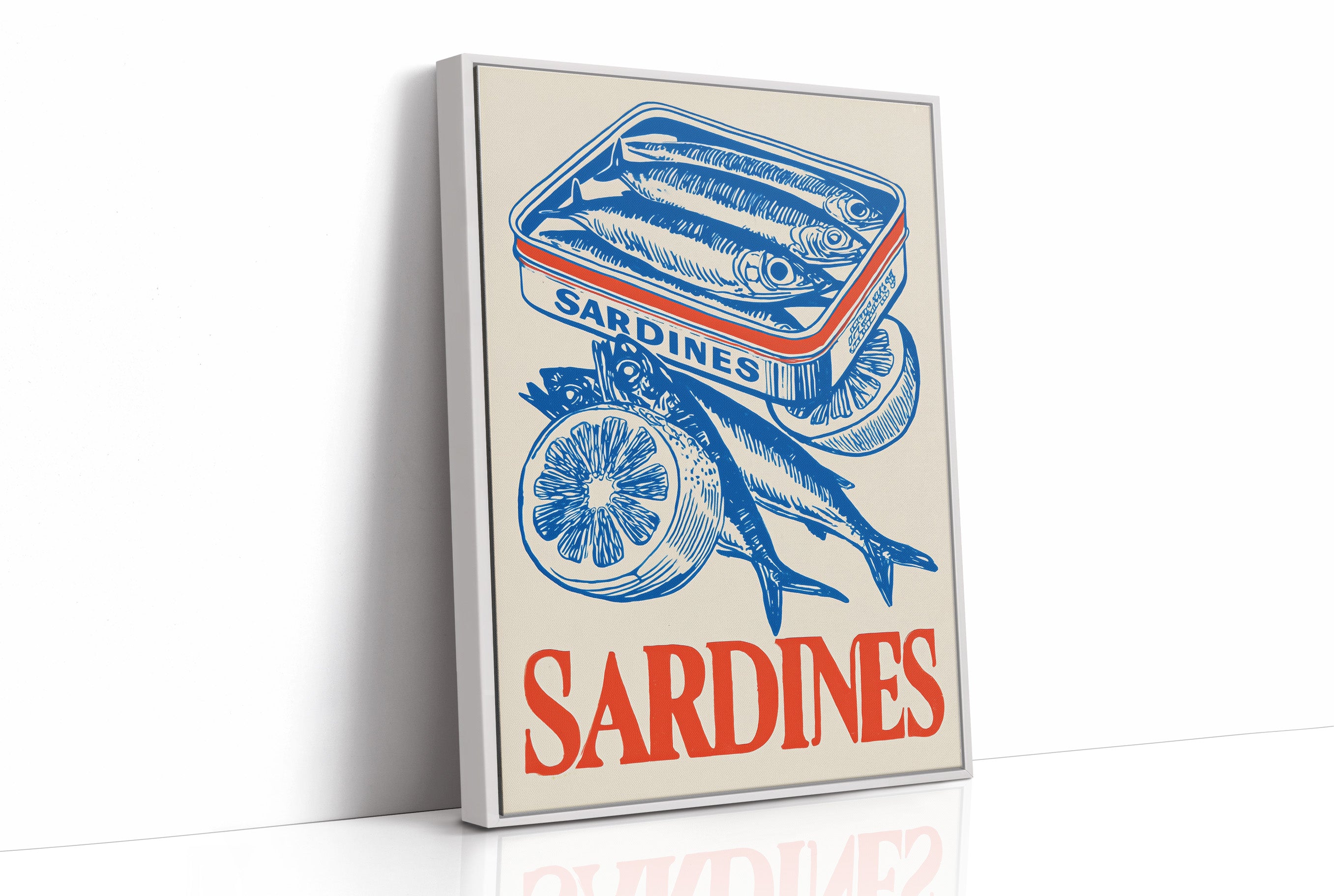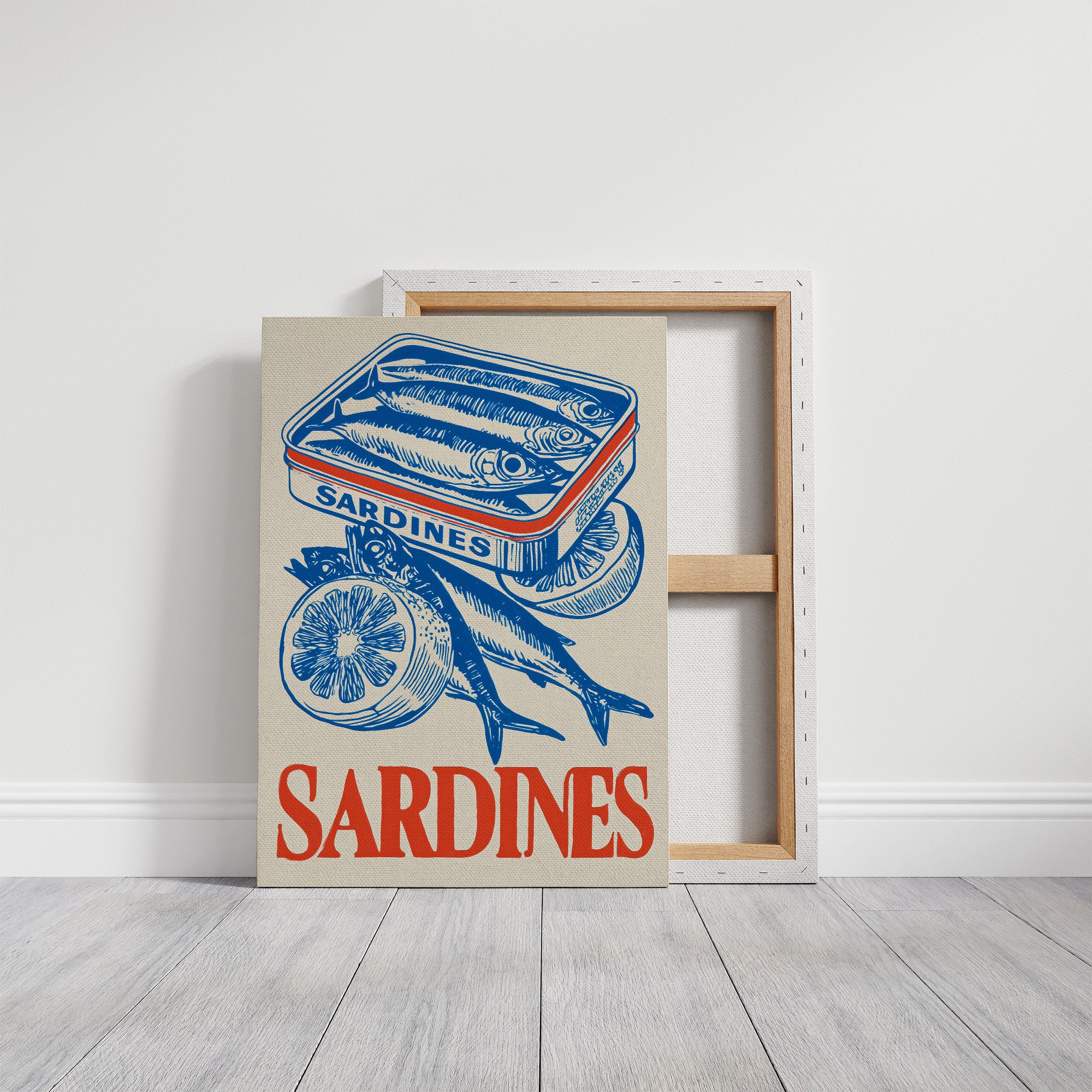 A striking contemporary canvas print featuring a vintage-inspired illustration of sardines in bold cobalt blue against a natural beige background. The composition showcases a tin of packed sardines alongside fresh fish and sliced lemons, creating a nostalgic yet modern culinary still life. The word "SARDINES" anchors the bottom in vibrant coral-red lettering, providing a perfect color contrast to the dominant blue illustration.